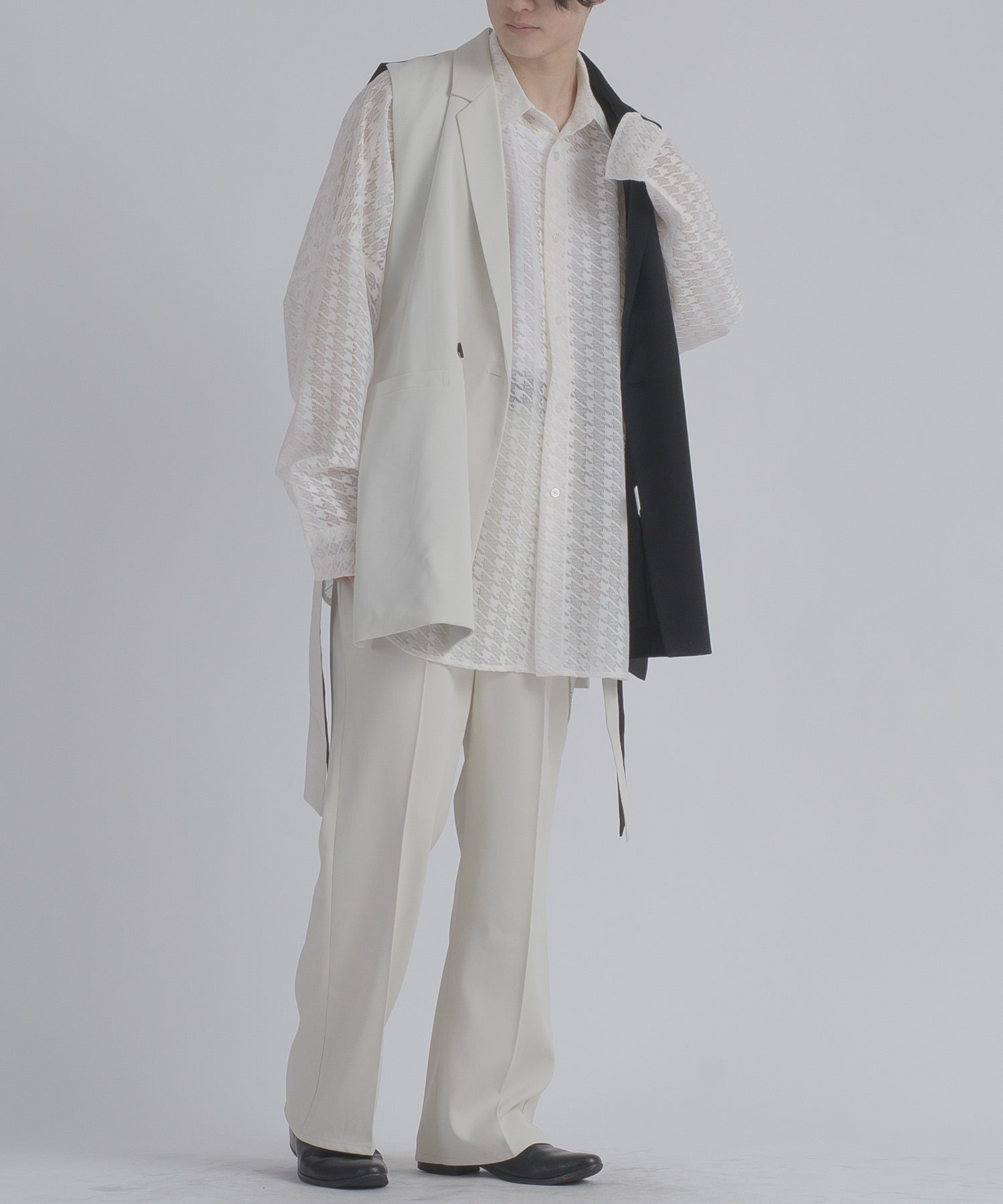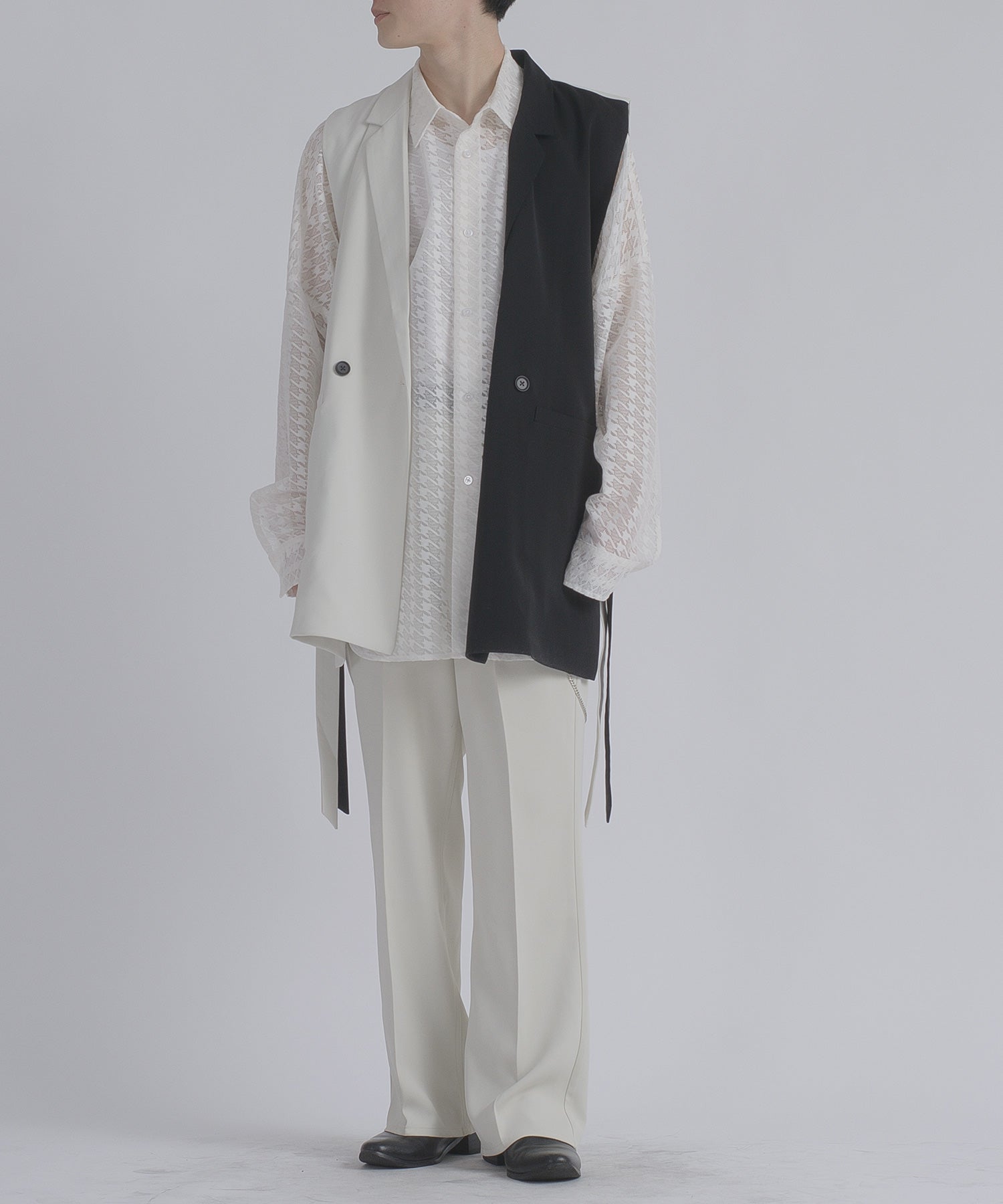 ジレとはフランス語で言うベストを意味するアイテムですが、こちらはテーラードジャケットの様なラペル(衿)を備えることで、よりアウター感を表現したジレです。