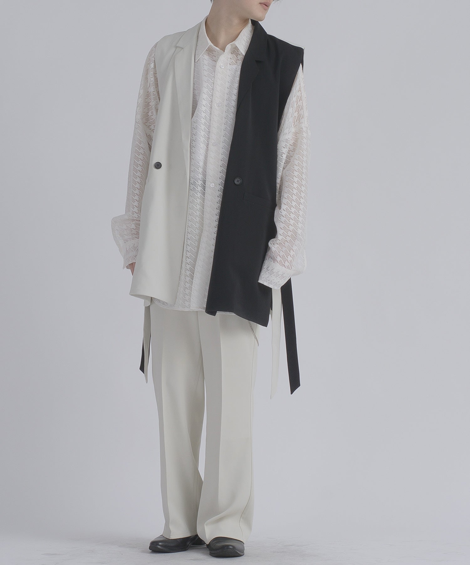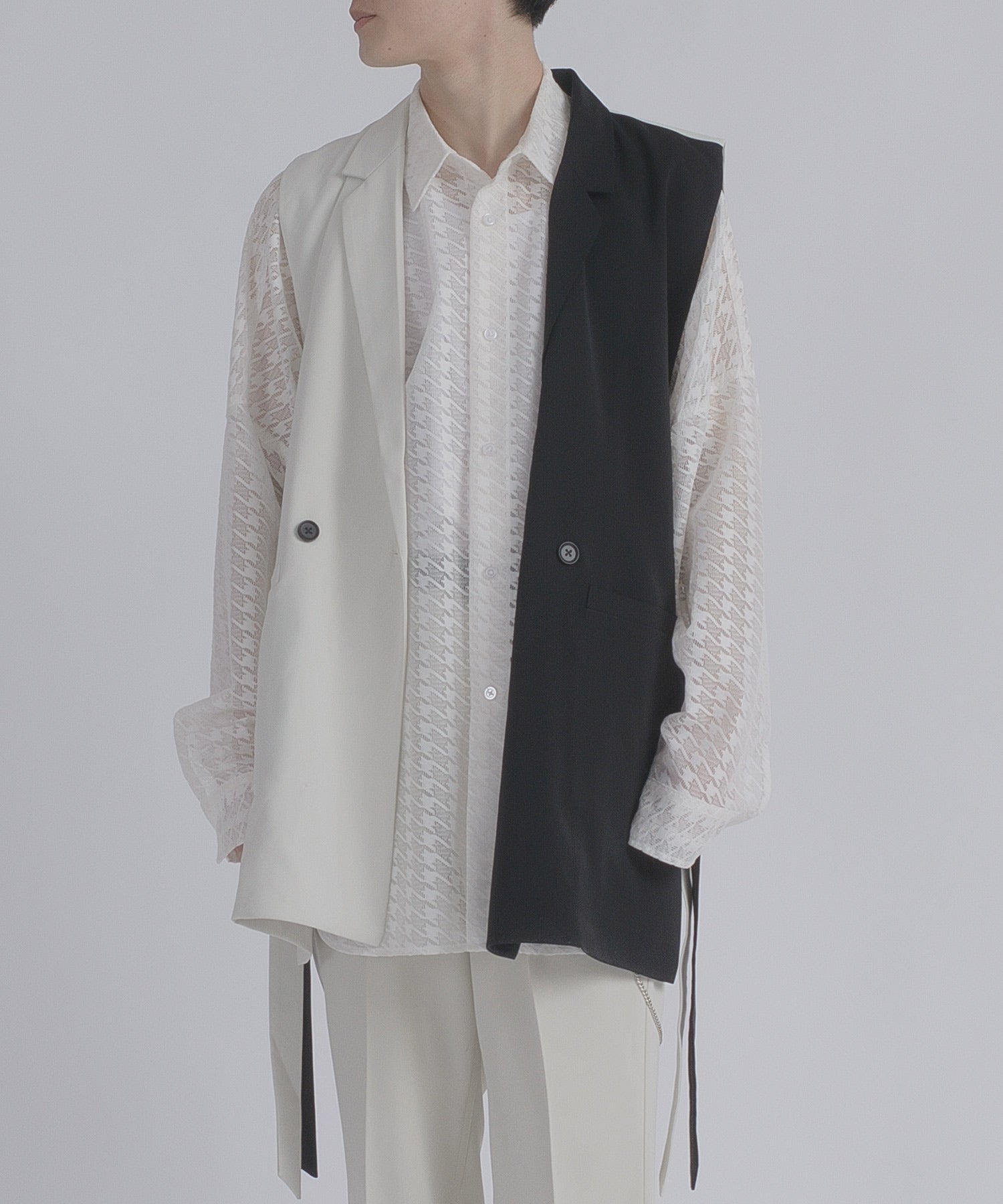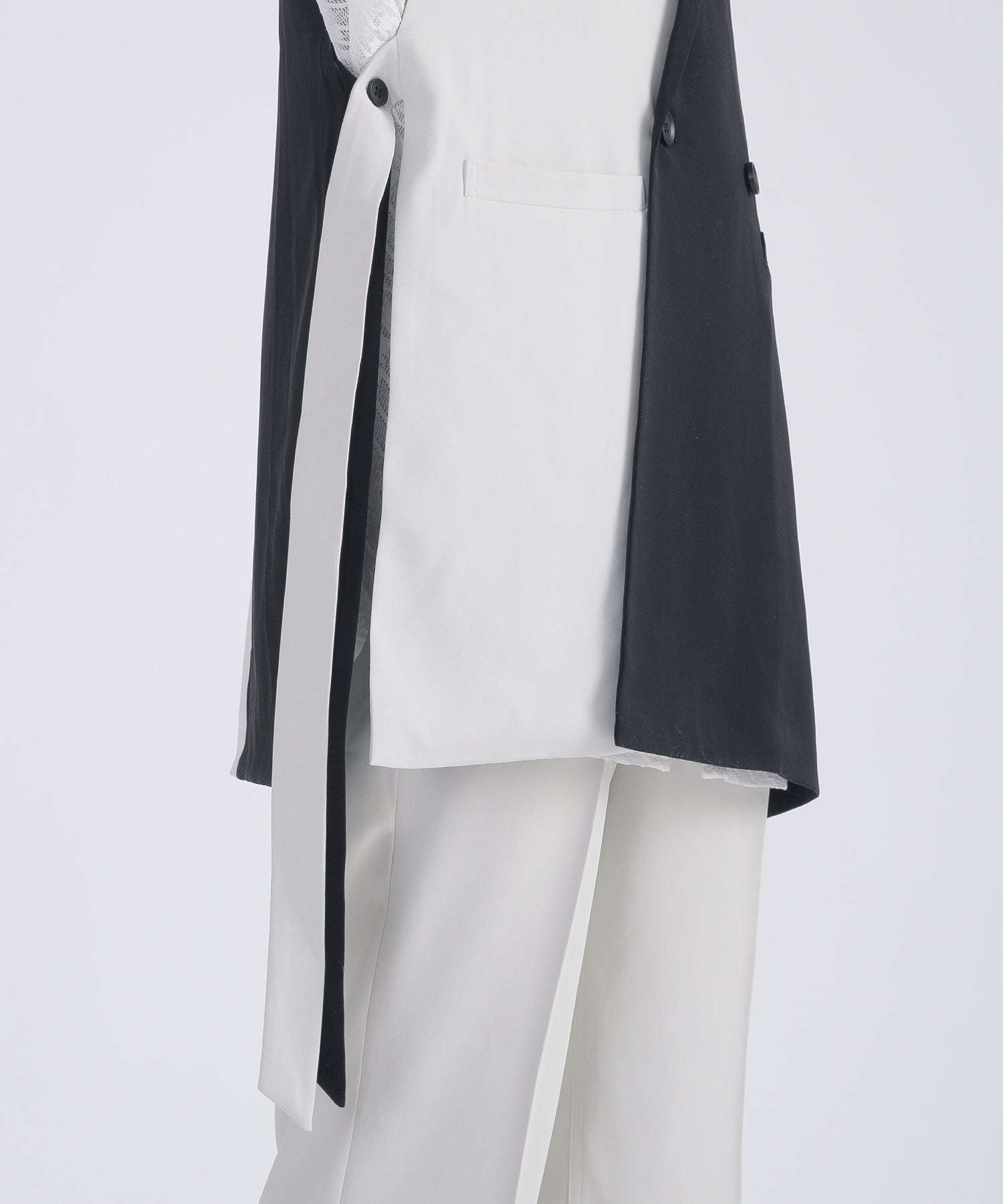 テーラード衿を備えたロング丈のジレです。