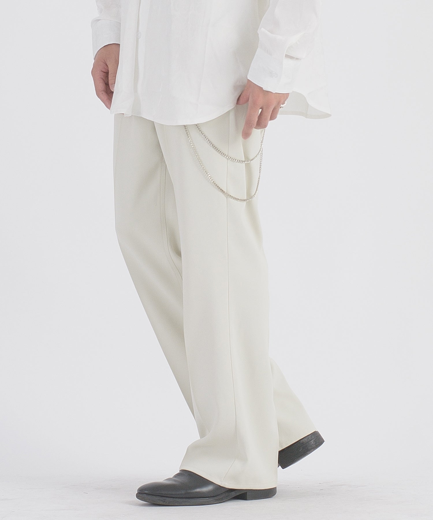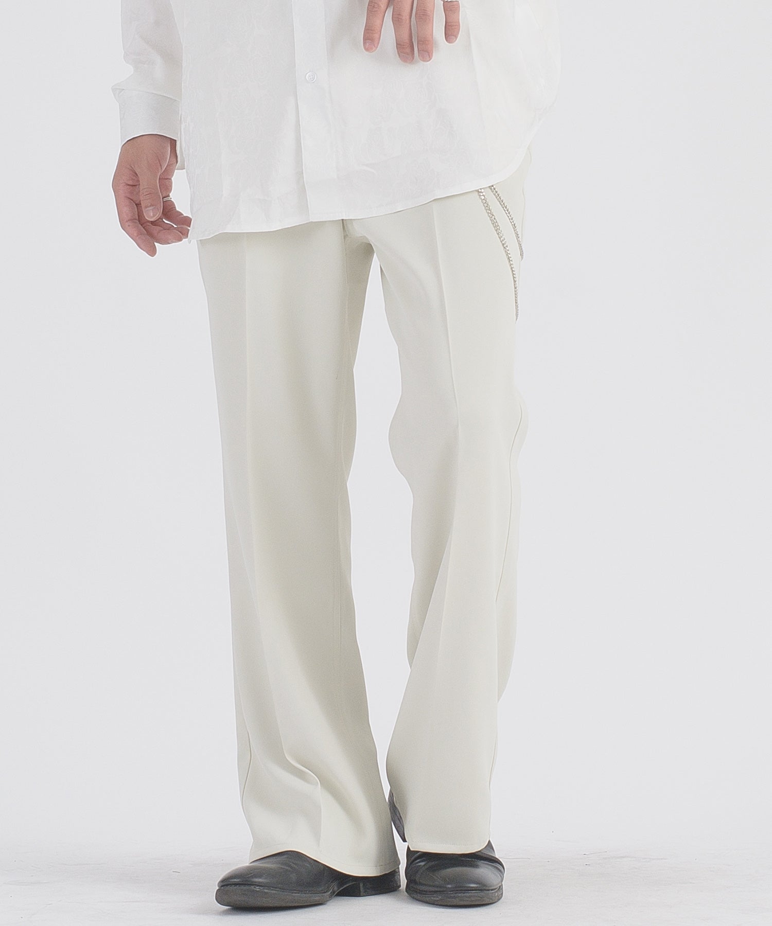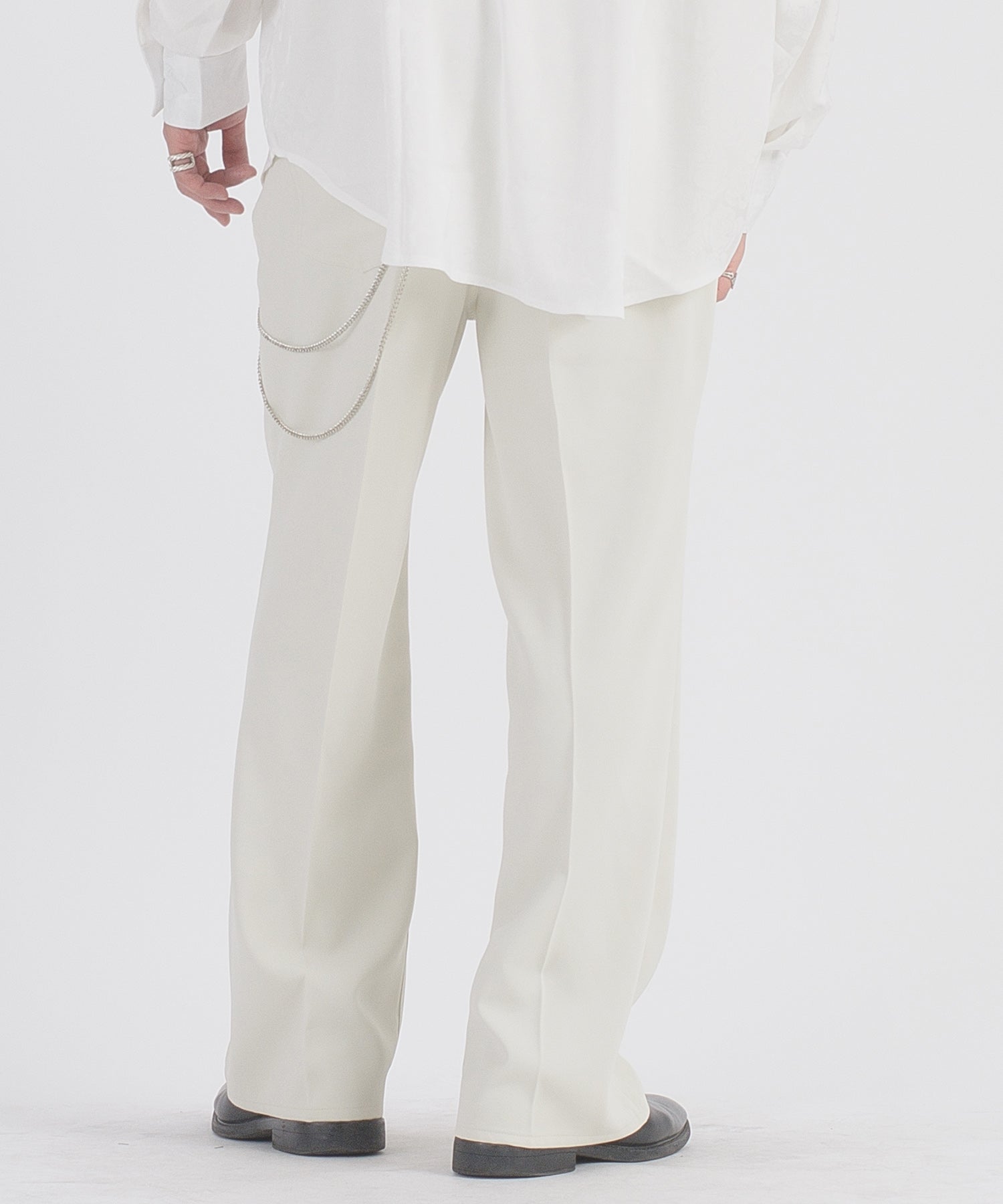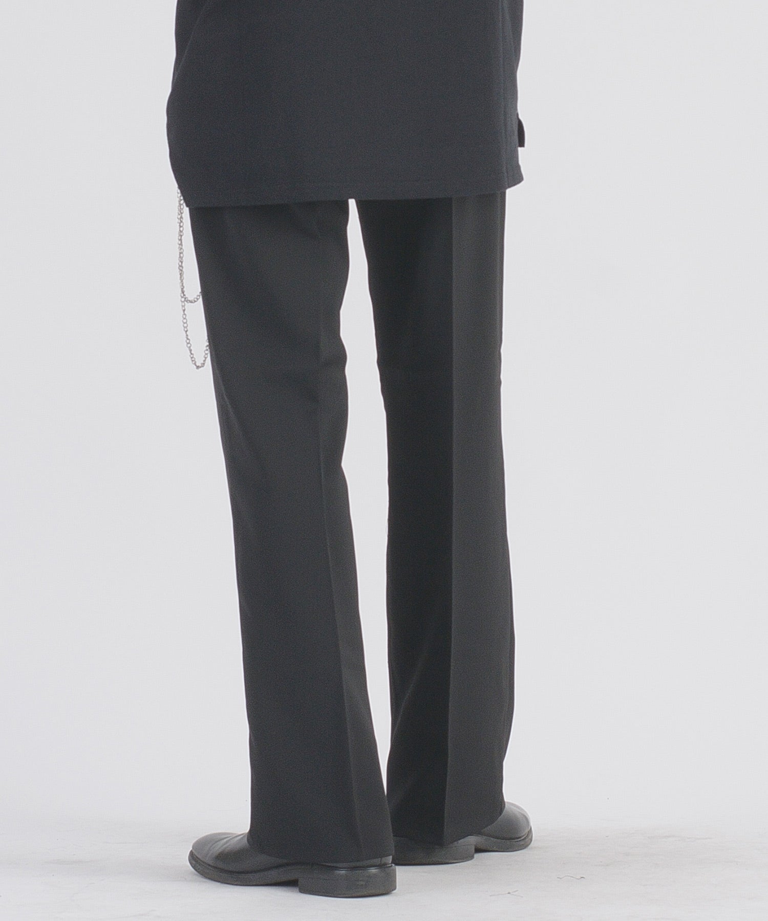 ポリエステル素材を使用し、センタープリーツをつけたスラックス仕様にすることでエレガントな雰囲気を表現できます。