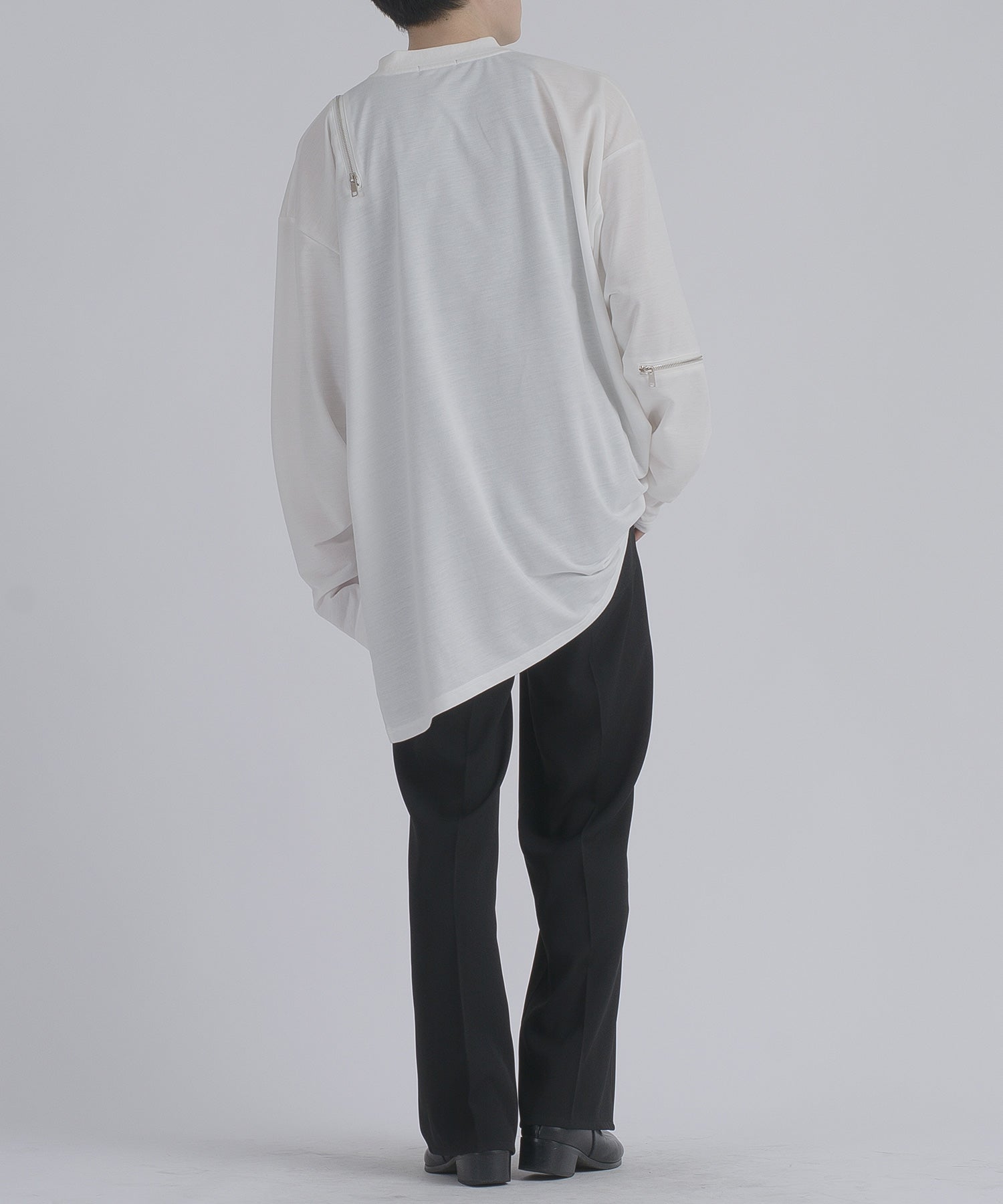 そして裾の長をも左右非対称であるのはデザイン性もさることながら、着用した時にオーバーサイズ故の裾の無駄なダブつきを抑えてくれます。