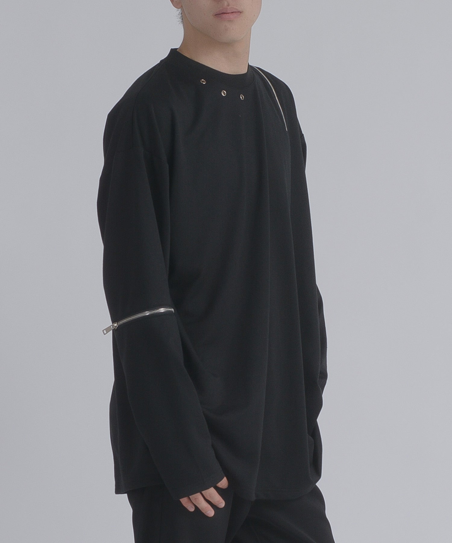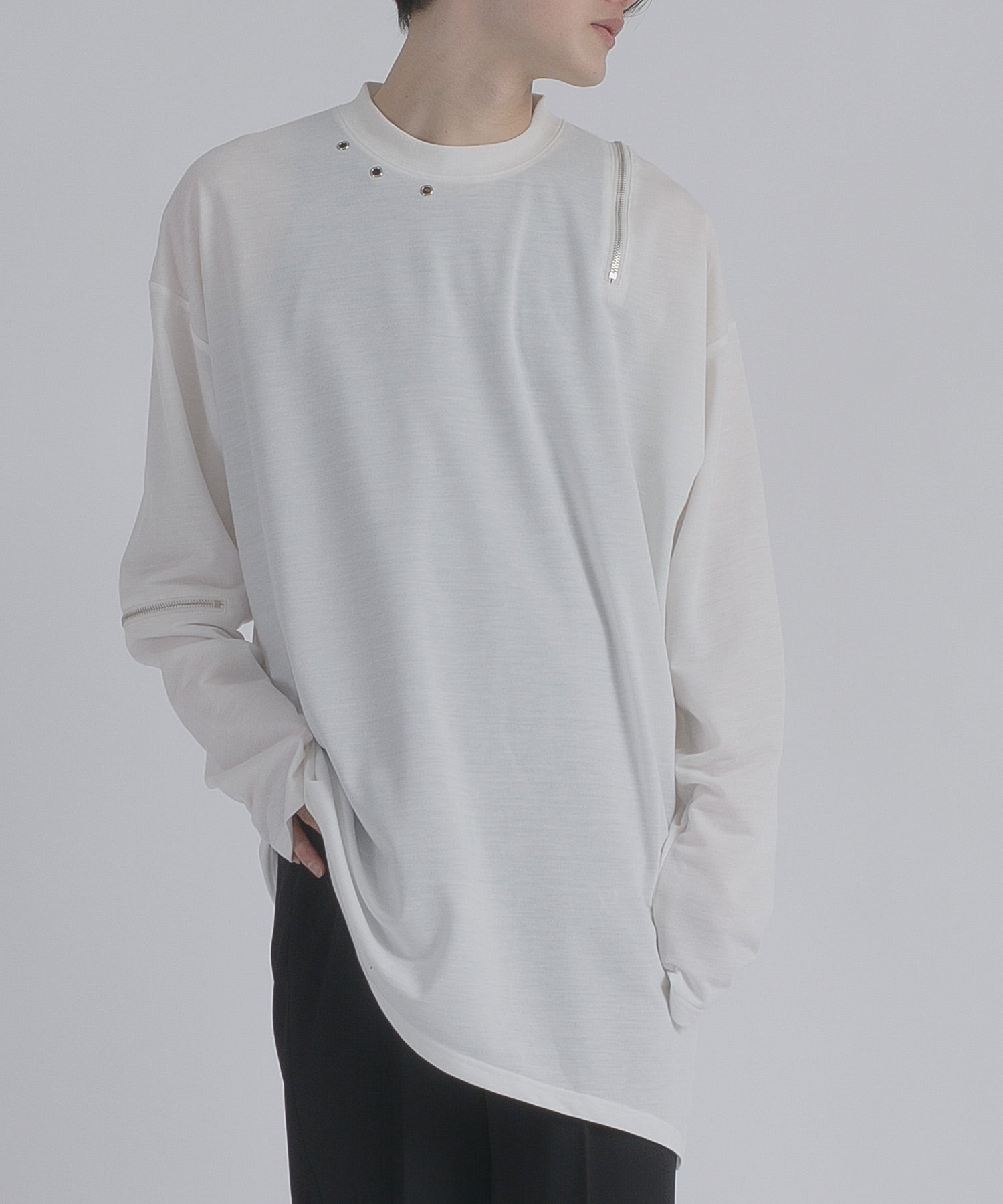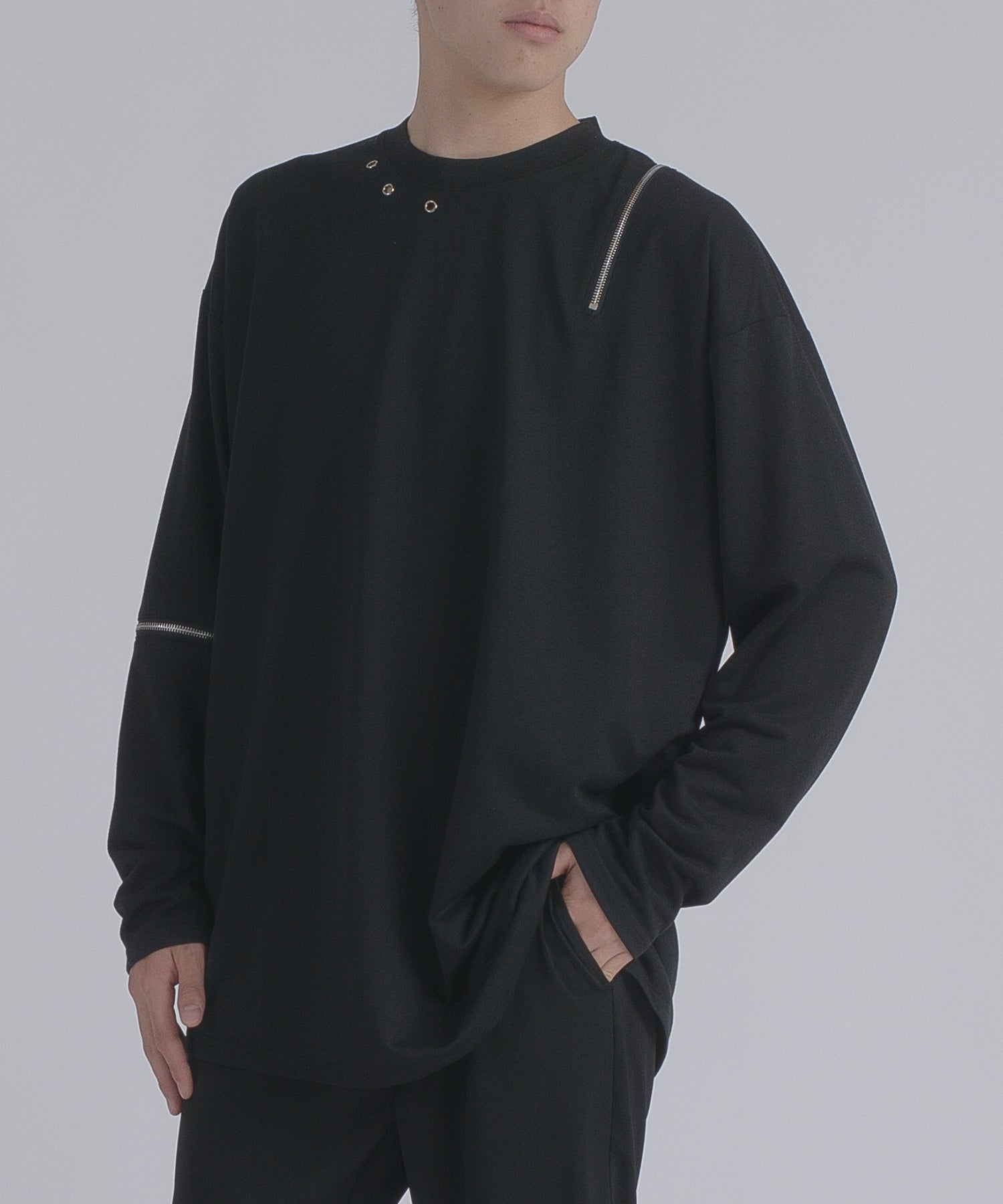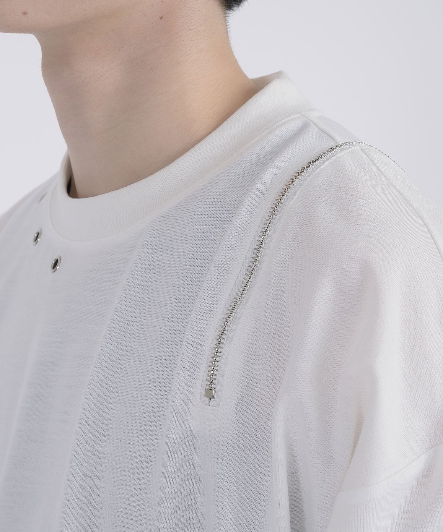 左肩と右袖に備えたZIPが印象的で、襟元に施した3つのアイレットが目を惹くデザインです。