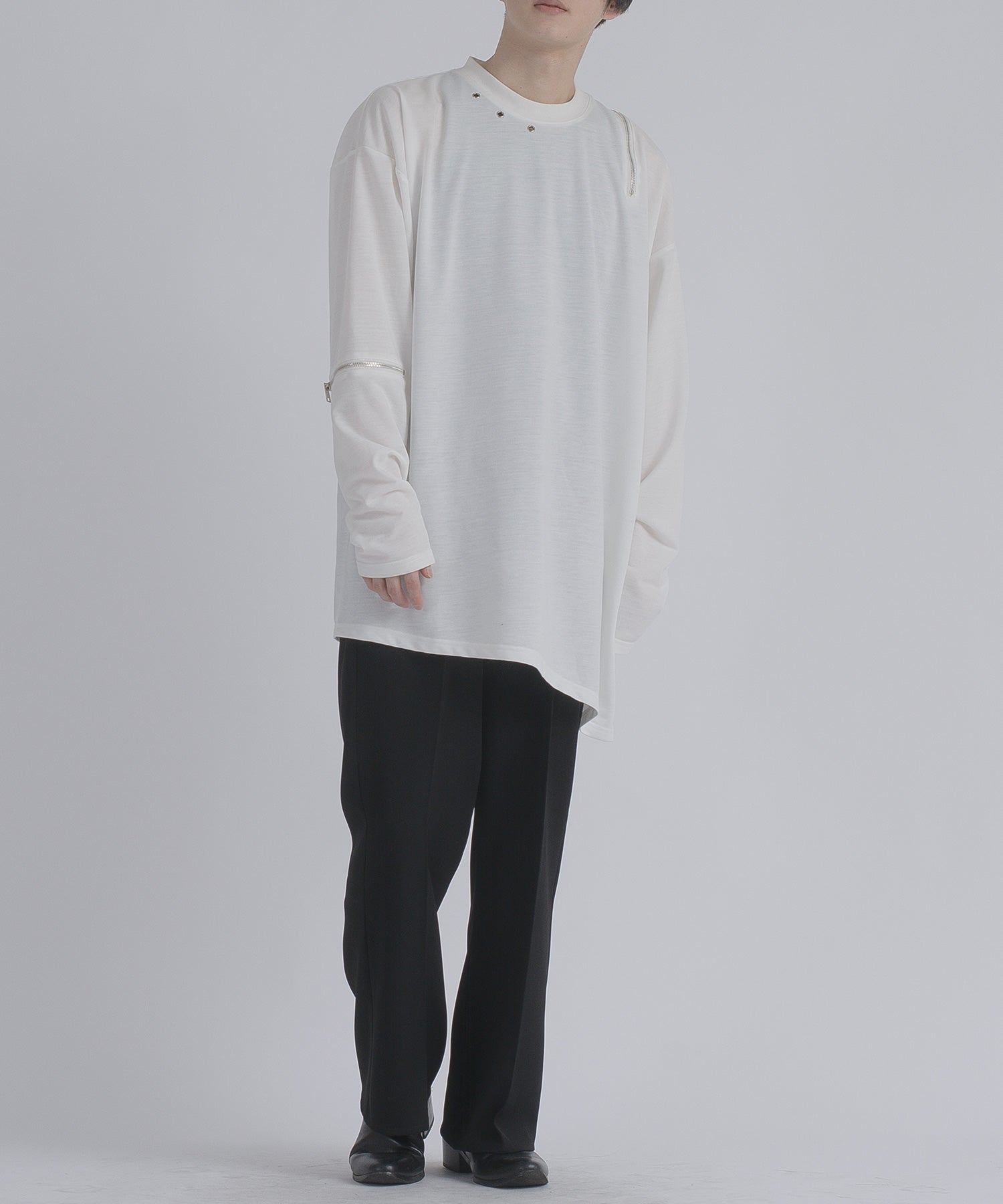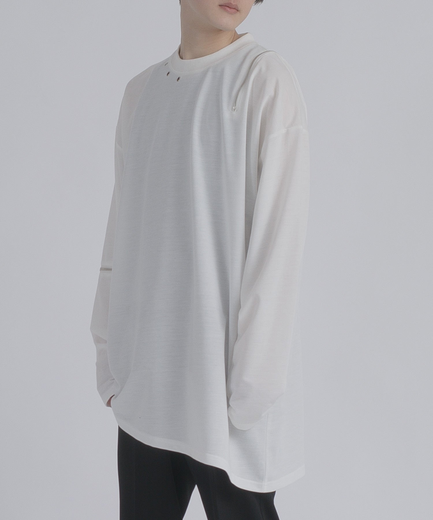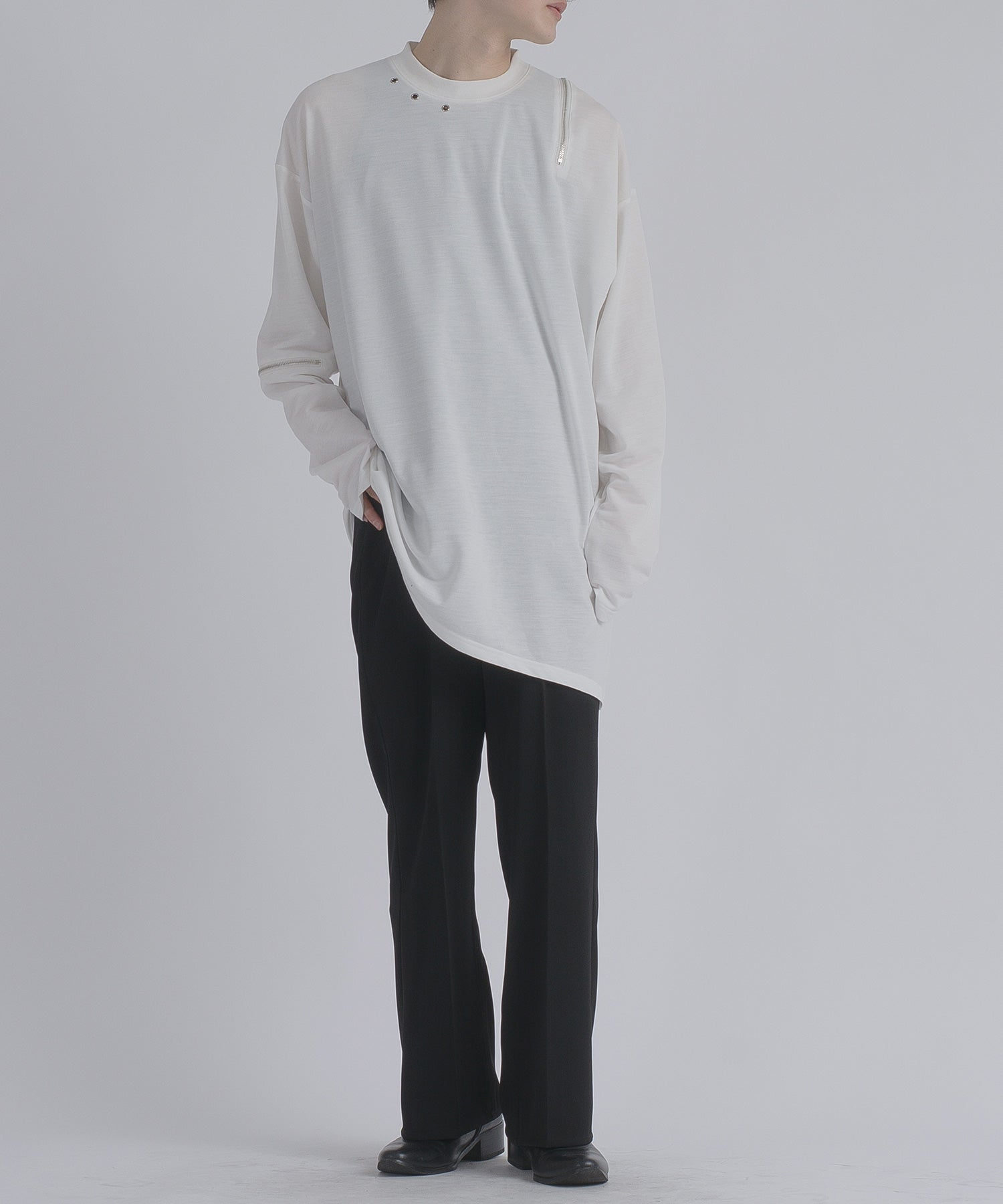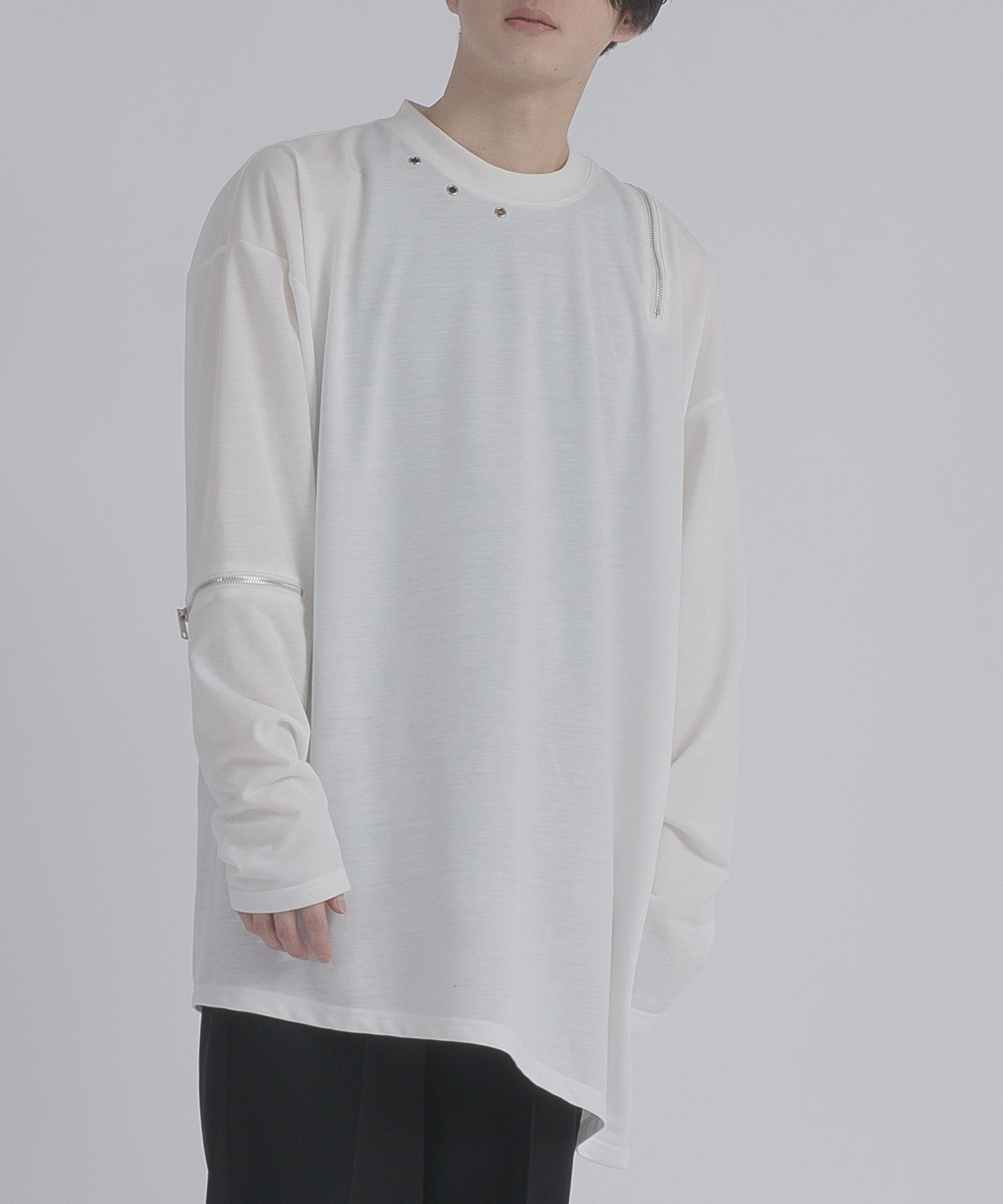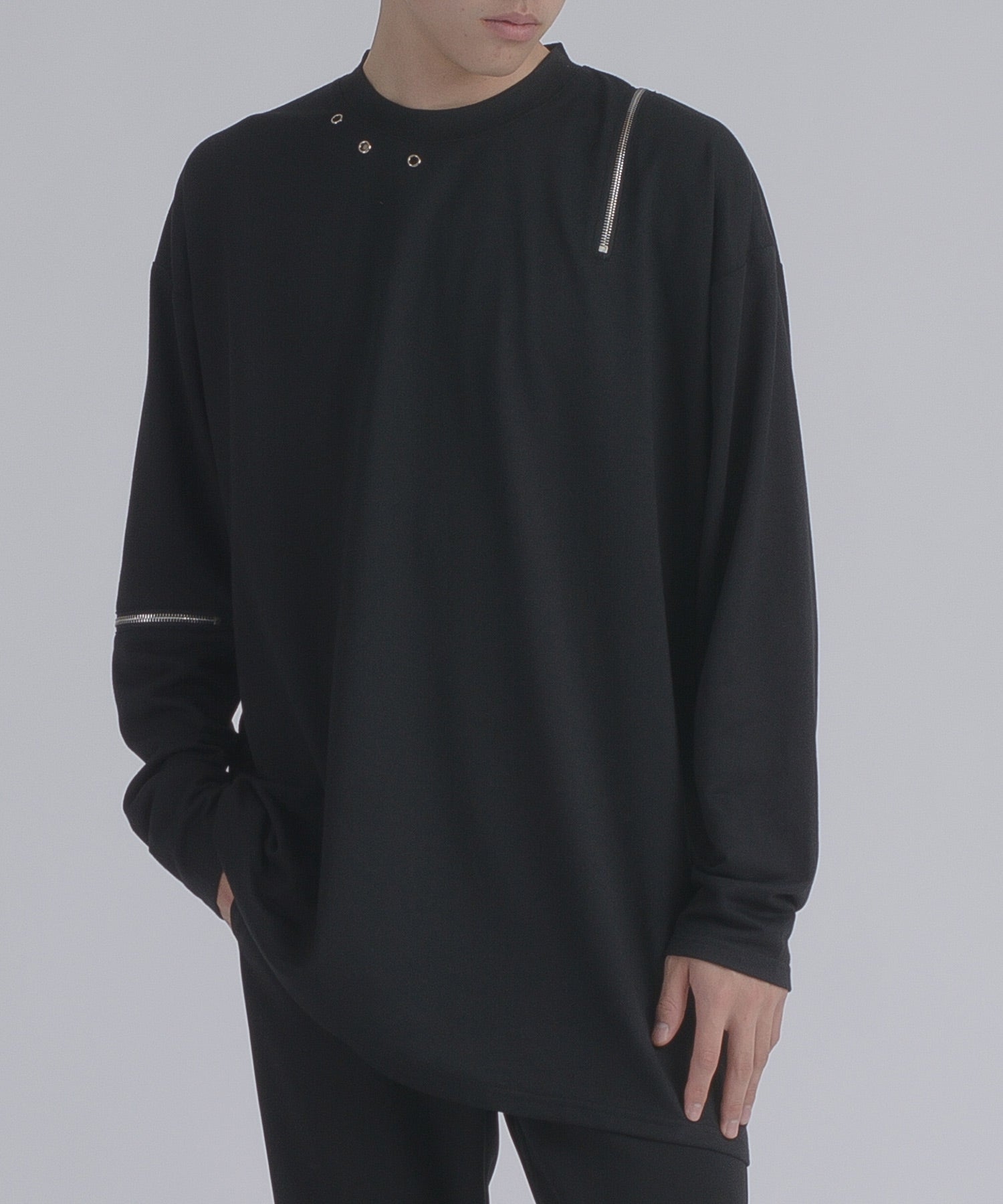 左肩と右袖に備えたZIPが印象的で、襟元に施した3つのアイレットが目を惹くデザインです。