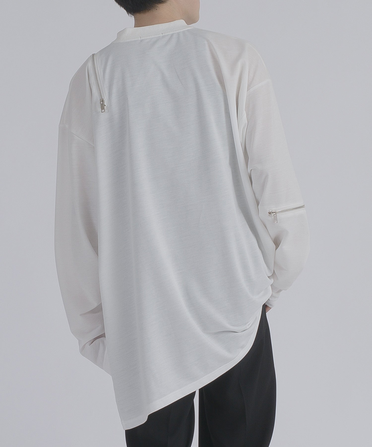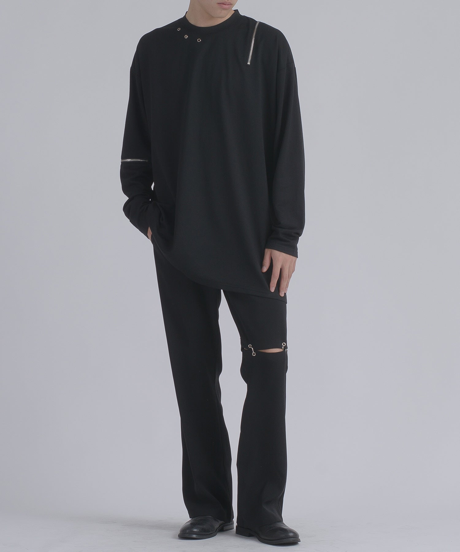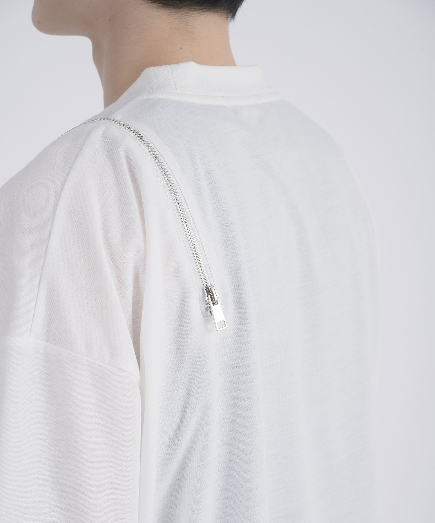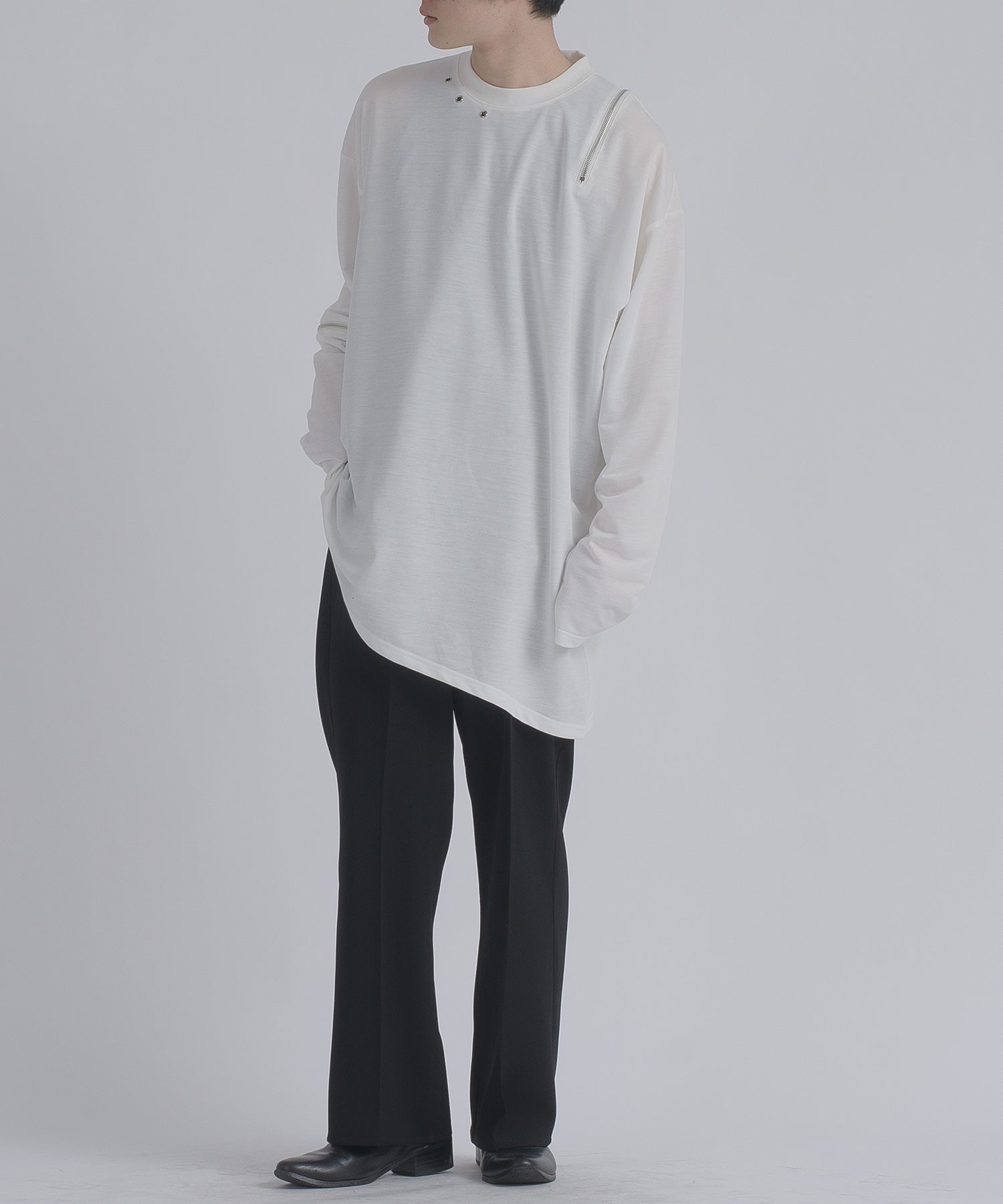 左肩と右袖に備えたZIPが印象的で、襟元に施した3つのアイレットが目を惹くデザインです。