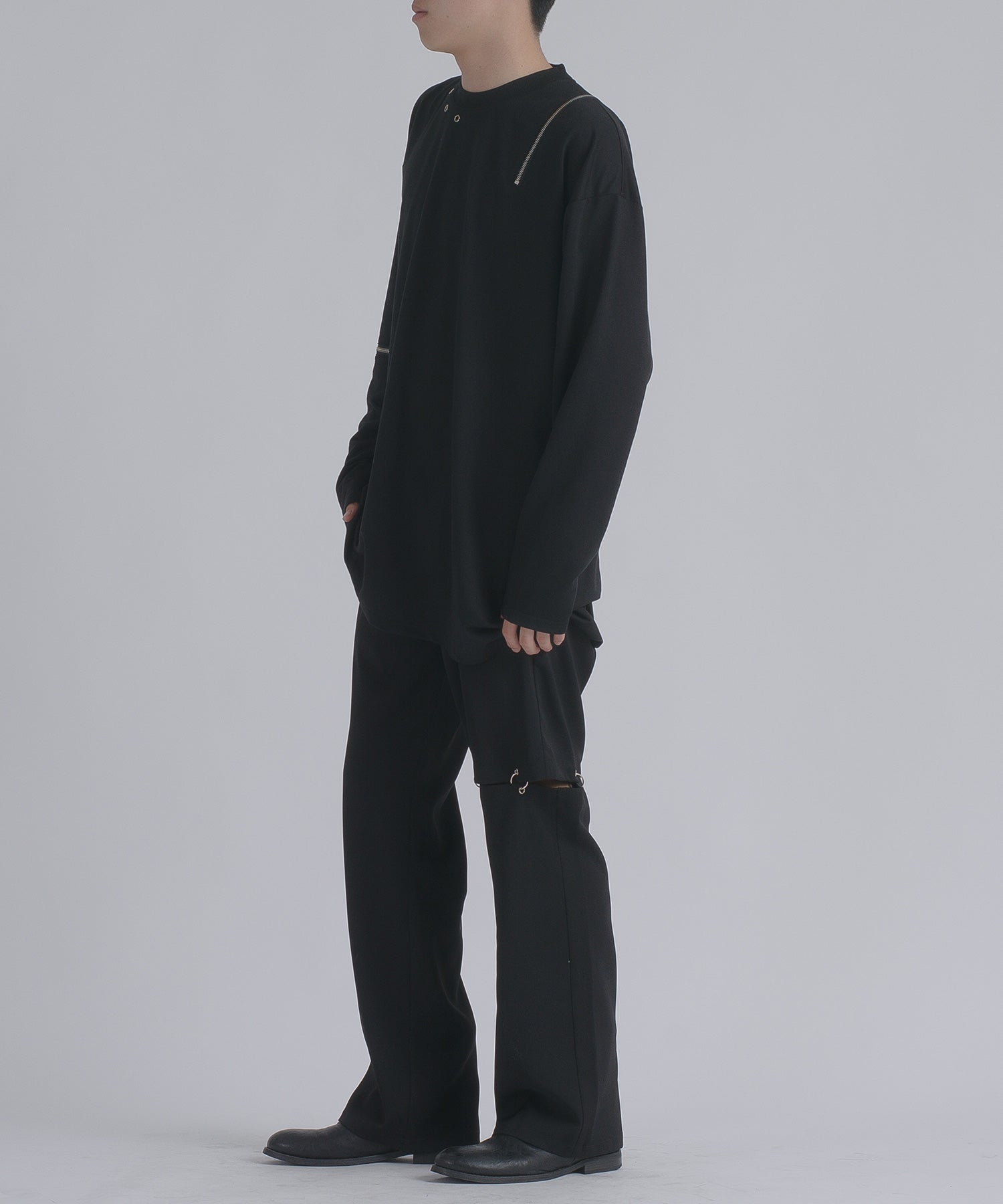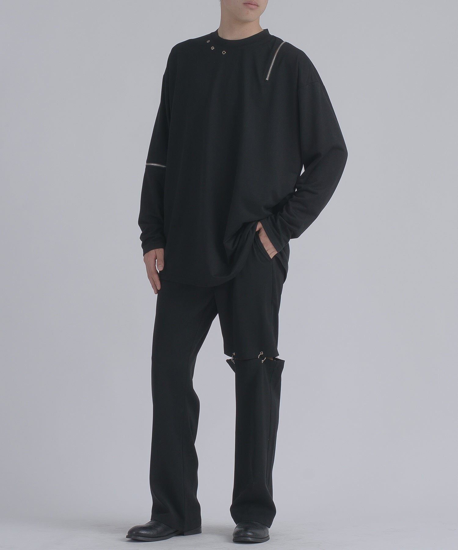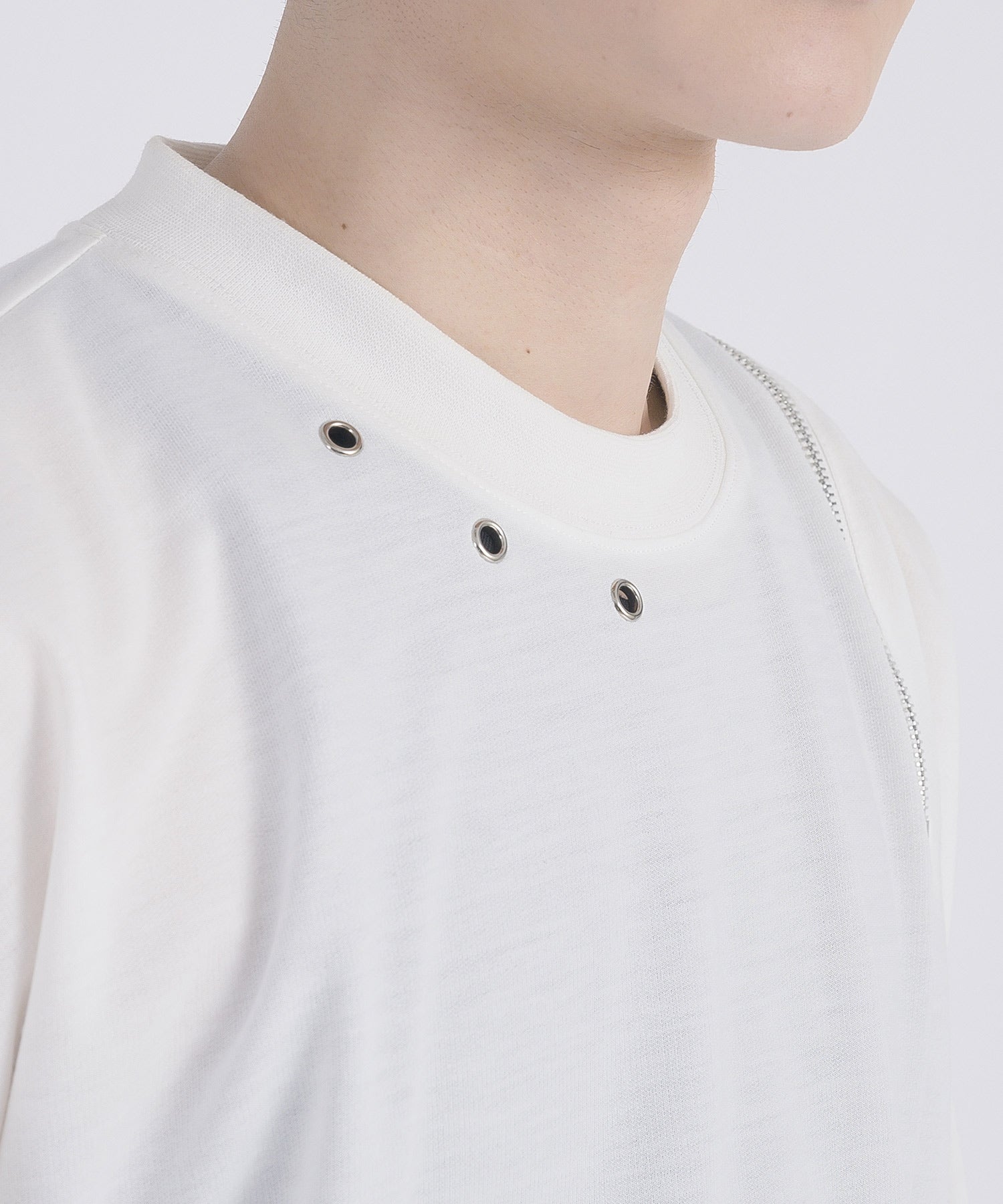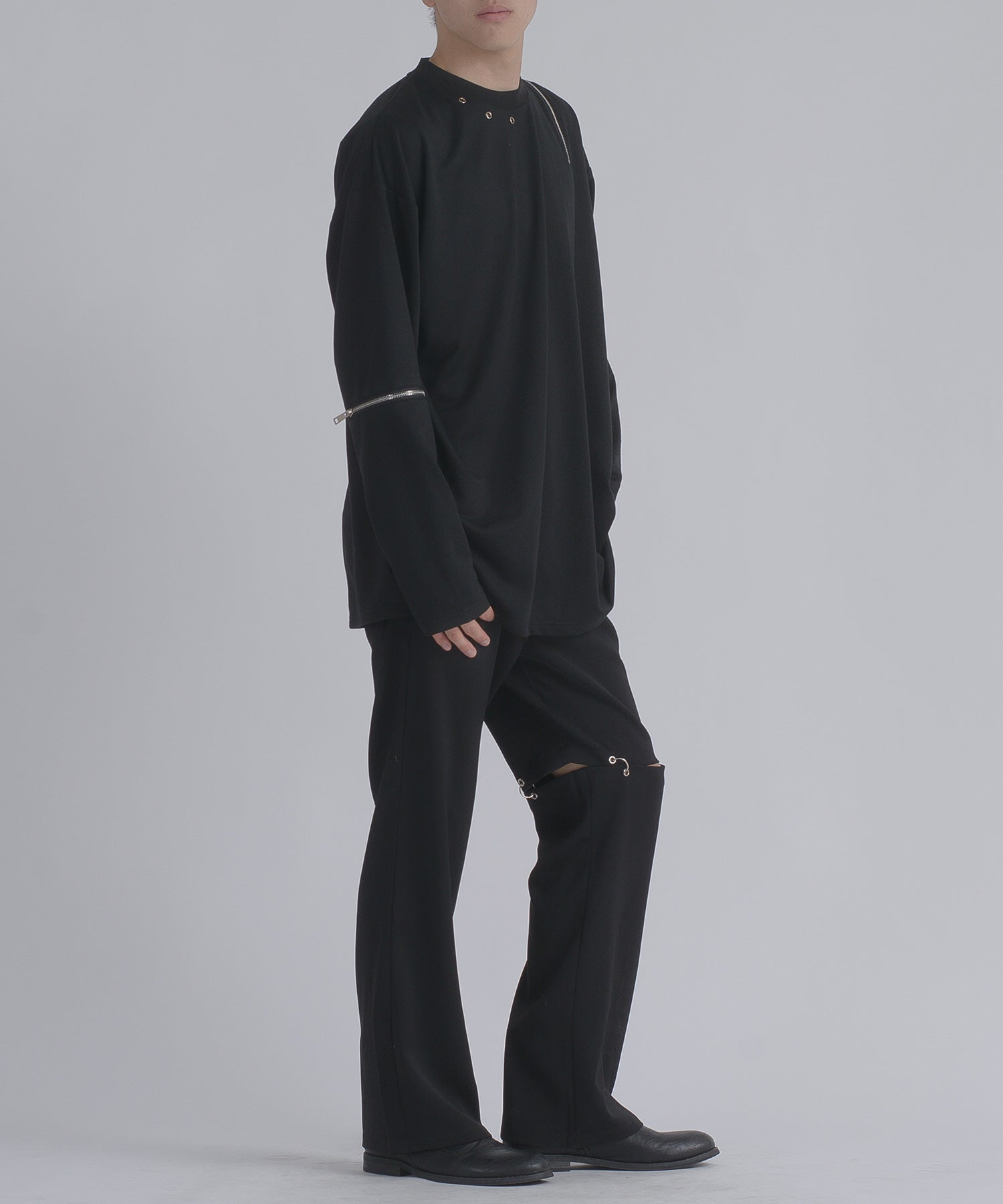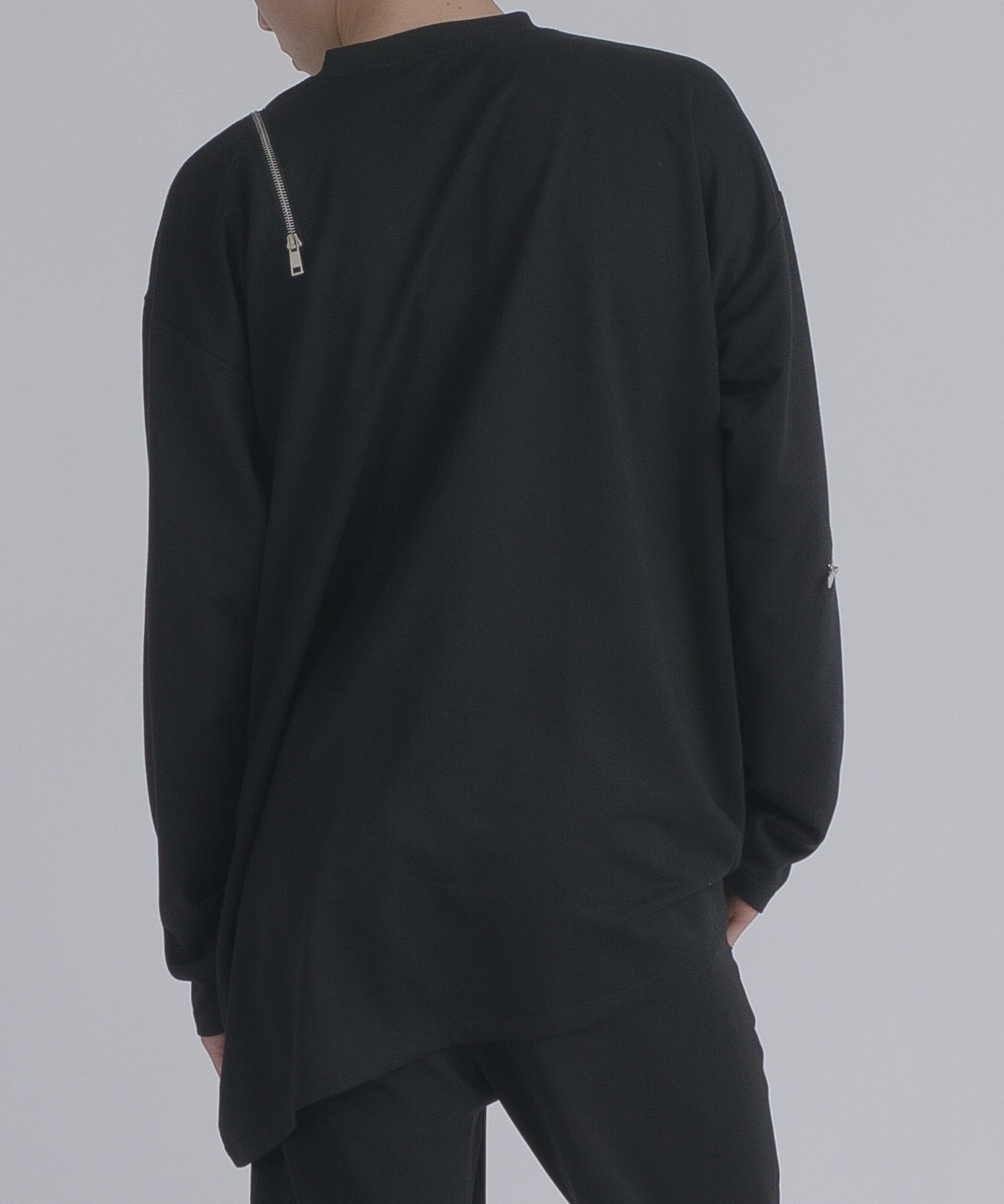 左肩と右袖に備えたZIPが印象的で、襟元に施した3つのアイレットが目を惹くデザインです。