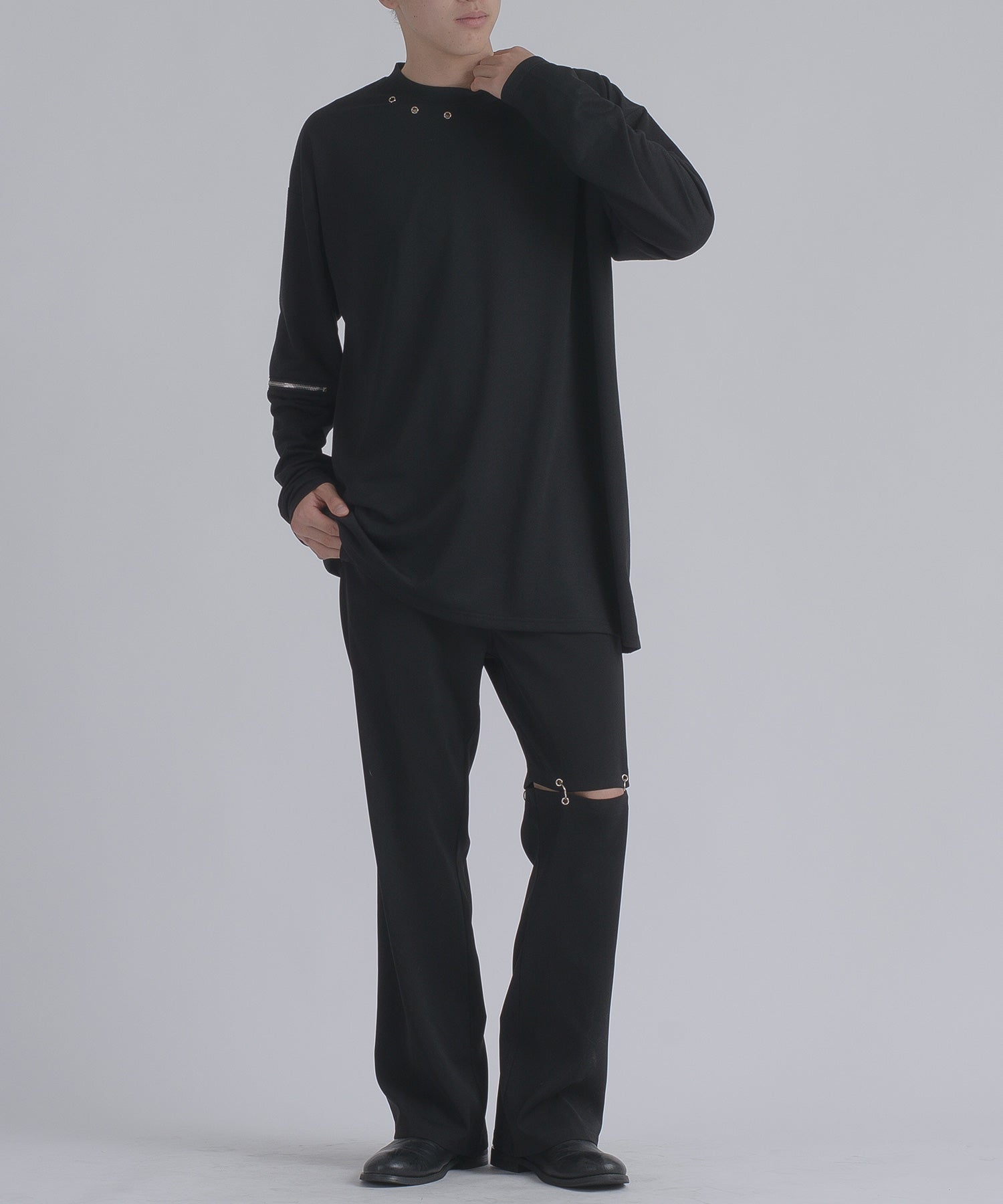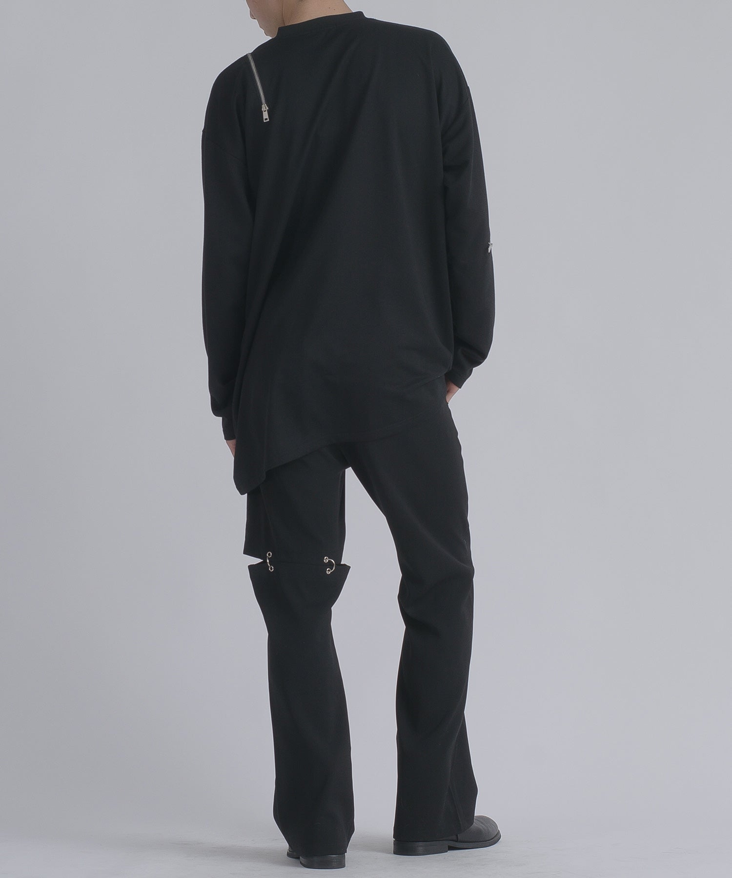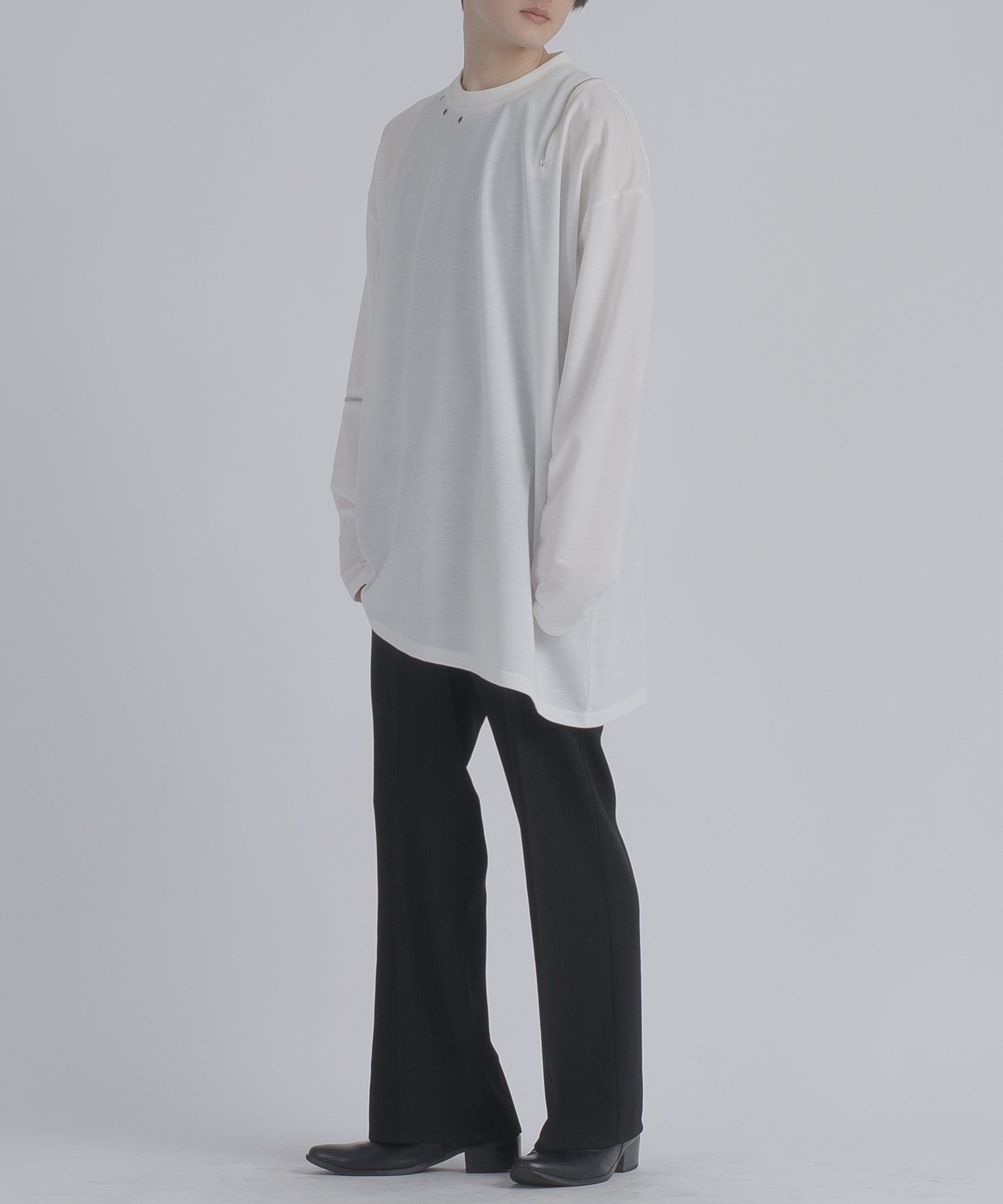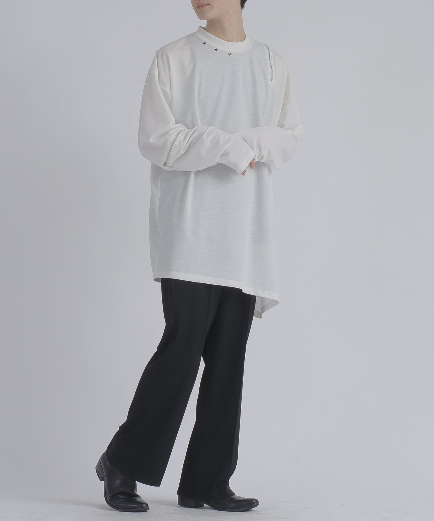 左肩と右袖に備えたZIPが印象的で、襟元に施した3つのアイレットが目を惹くデザインです。
