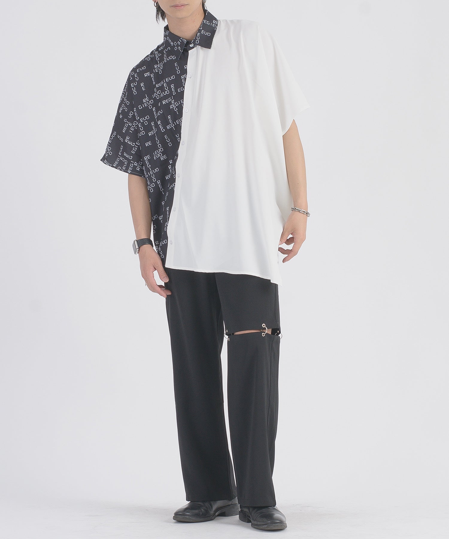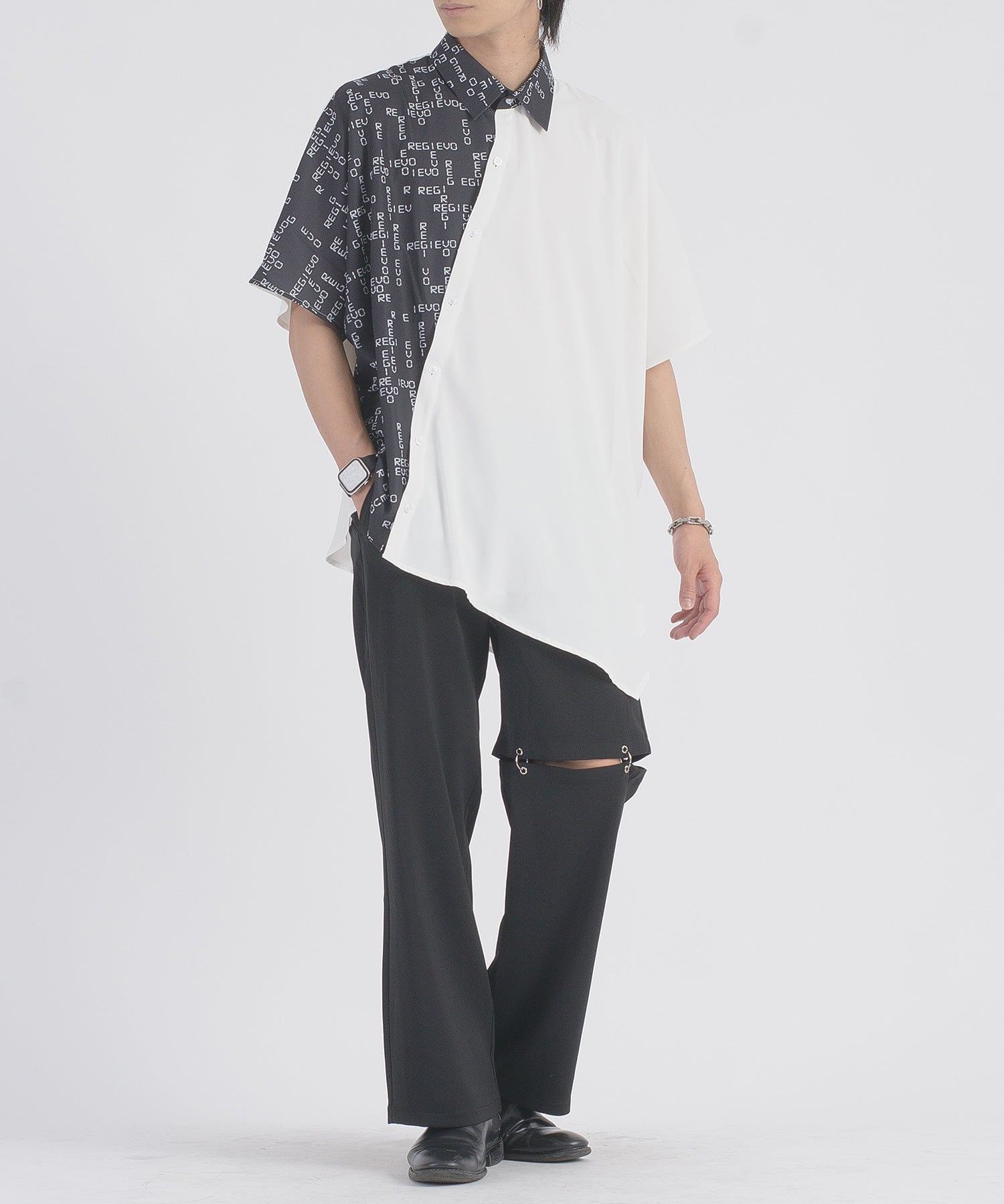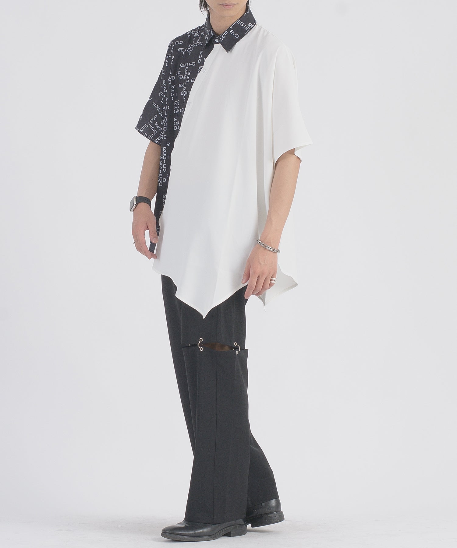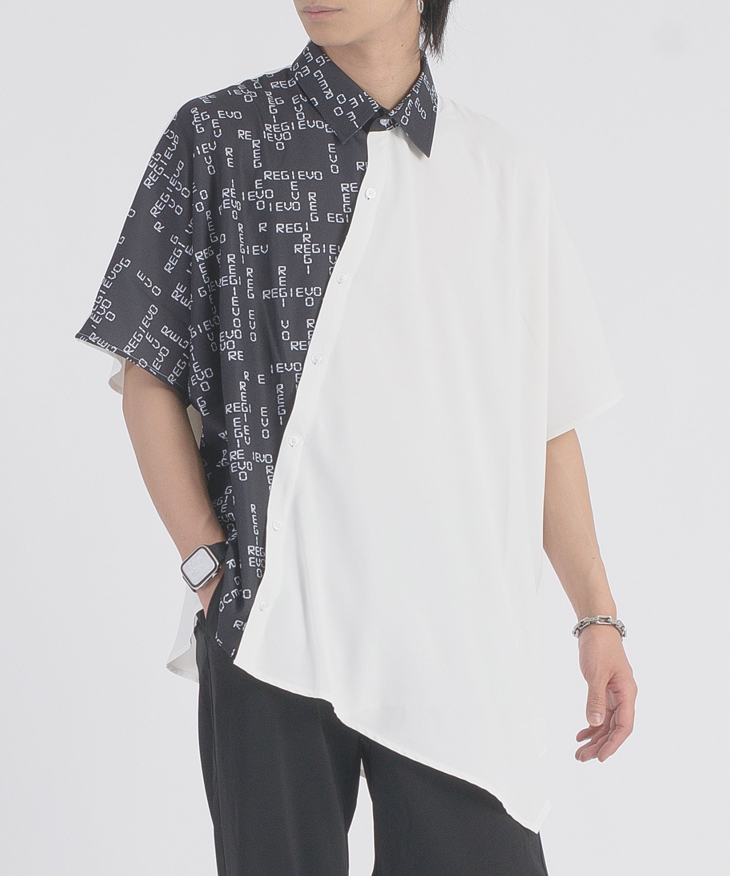 ボタンを斜めに配置したデザインもユニークで、左右の生地を柄と無地で切り替えたアシンメトリーなデザインです。