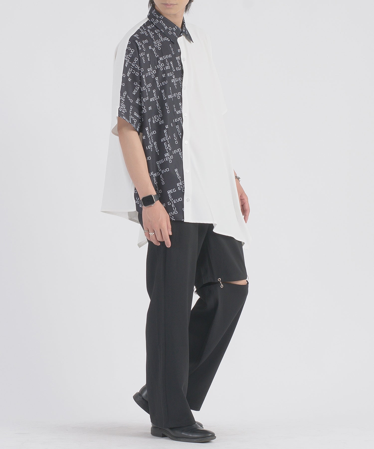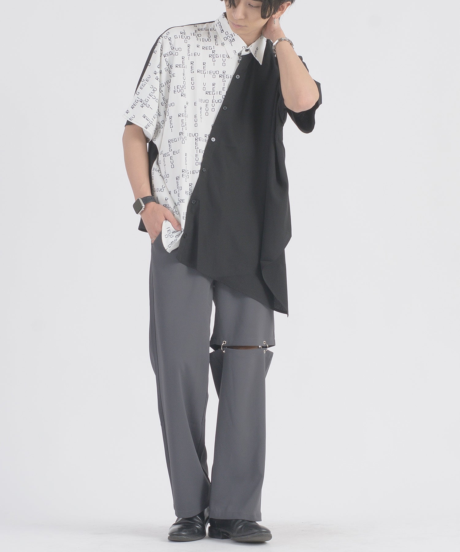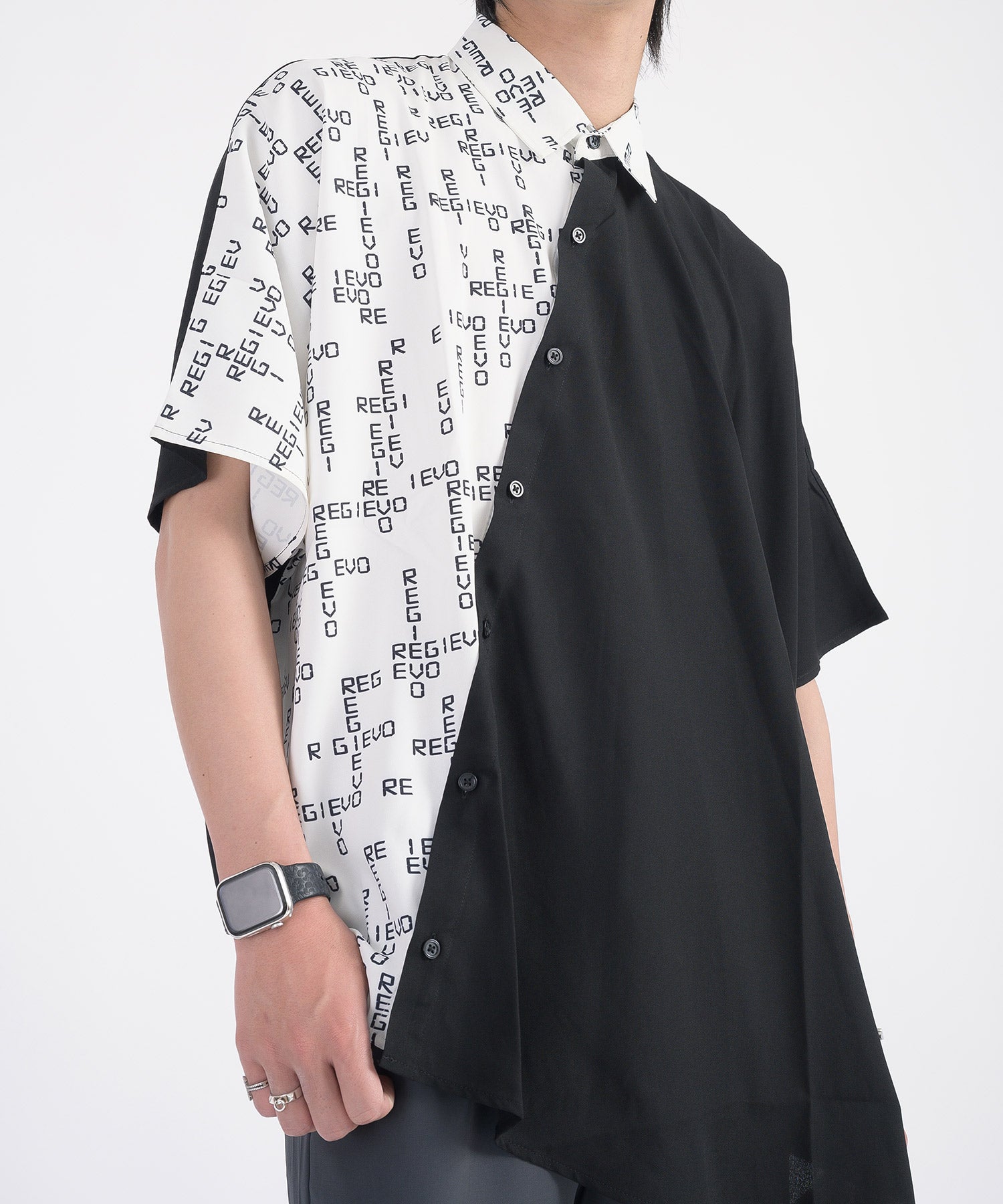 ボタンを斜めに配置したデザインもユニークで、左右の生地を柄と無地で切り替えたアシンメトリーなデザインです。