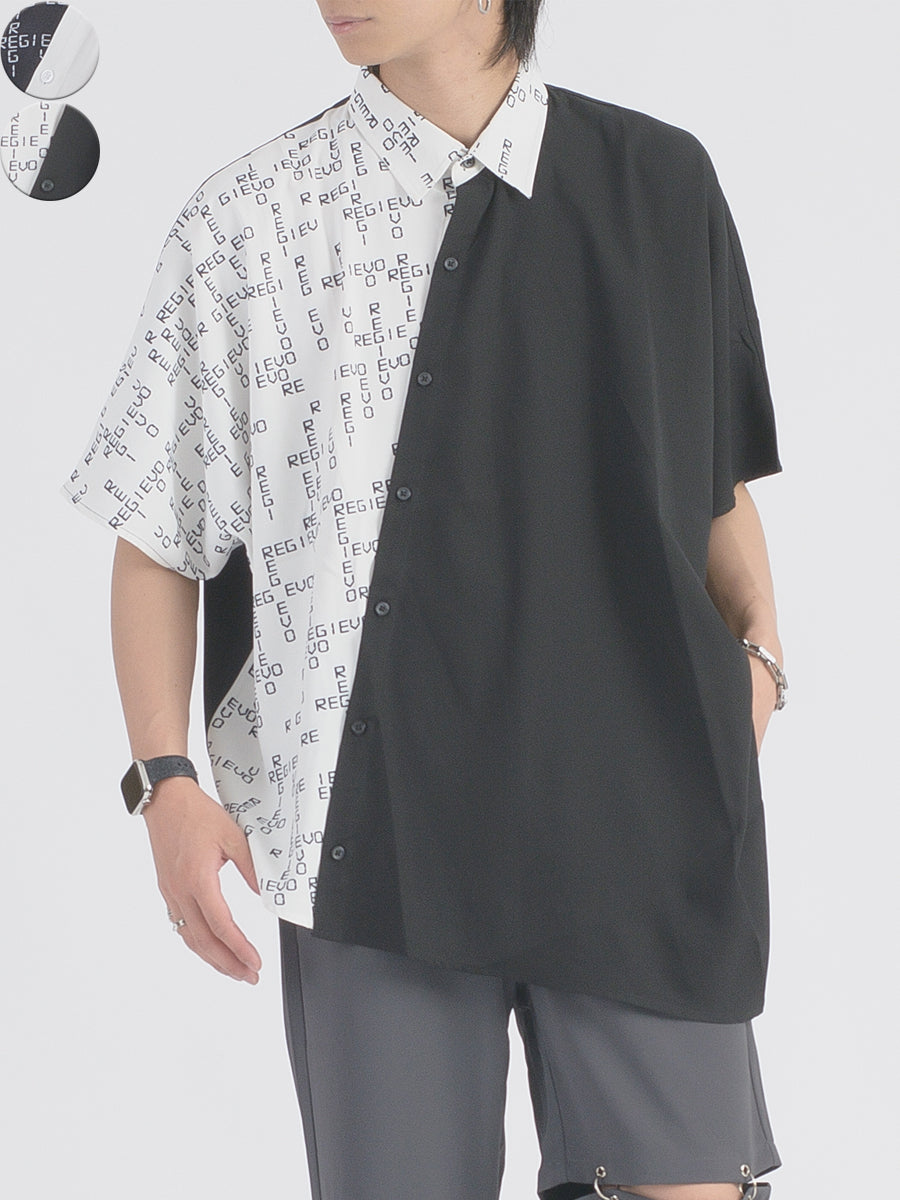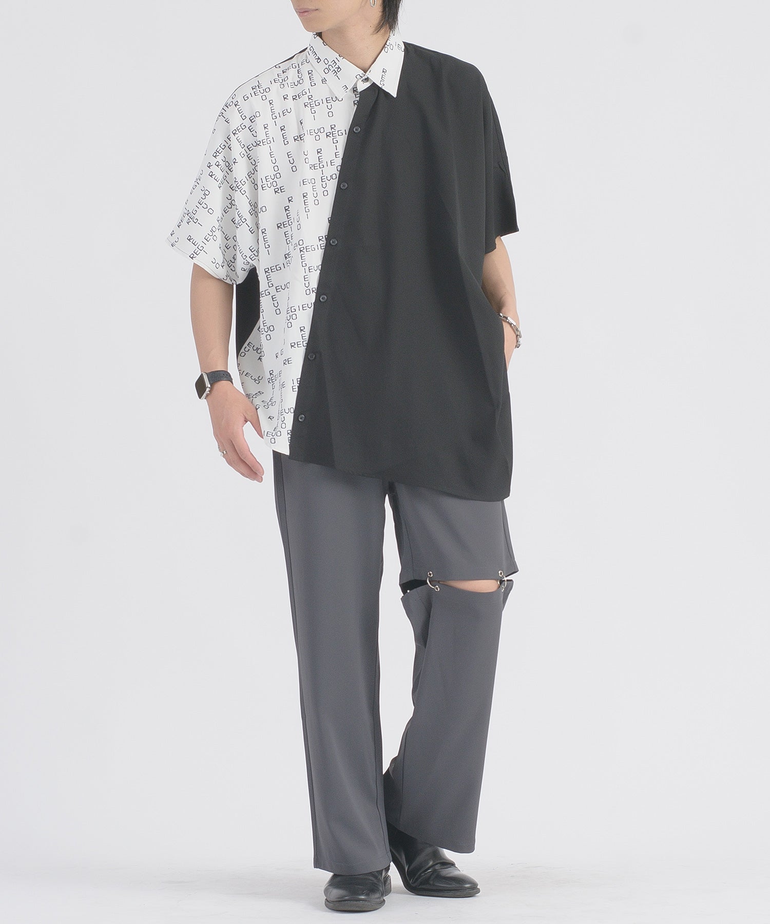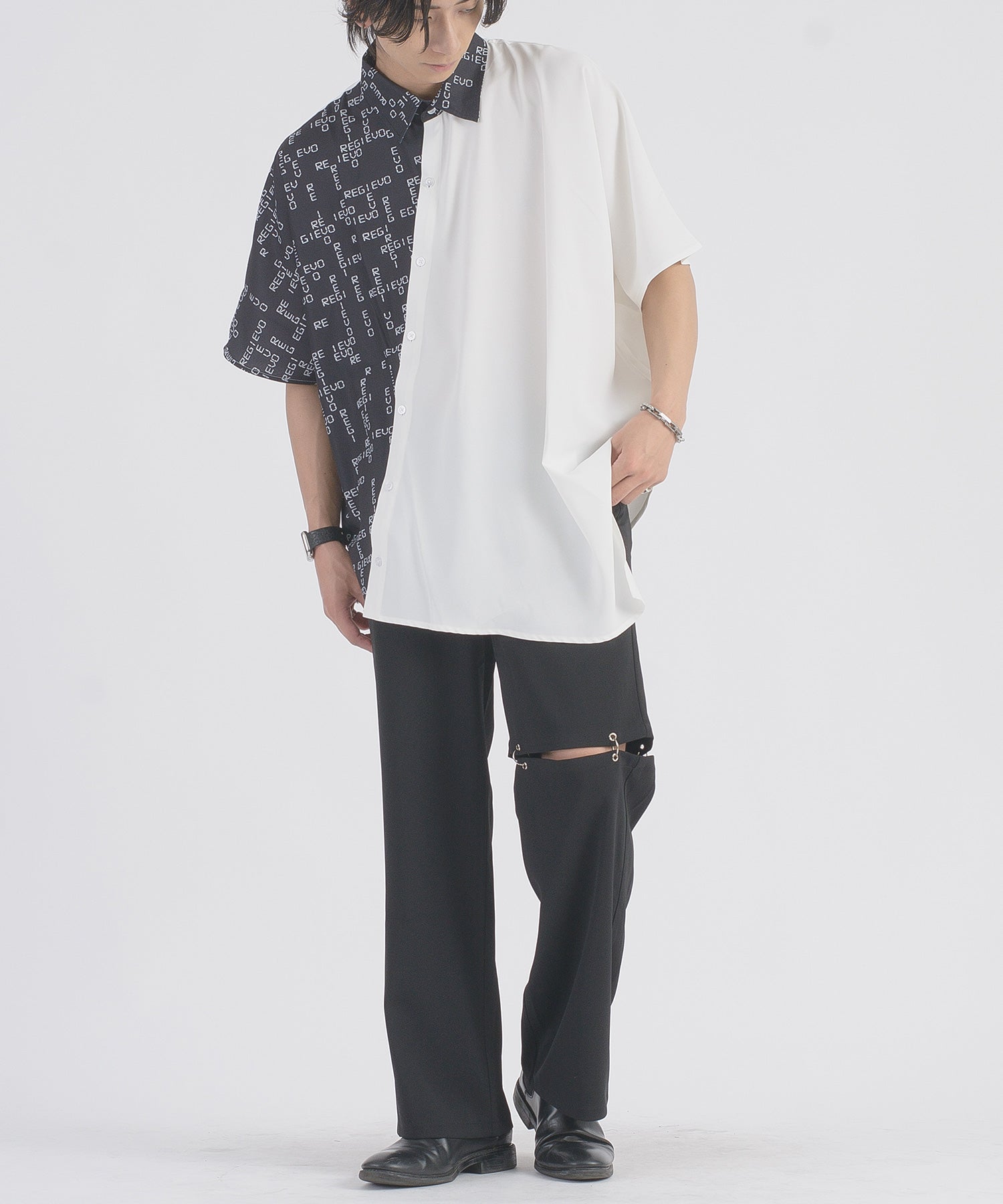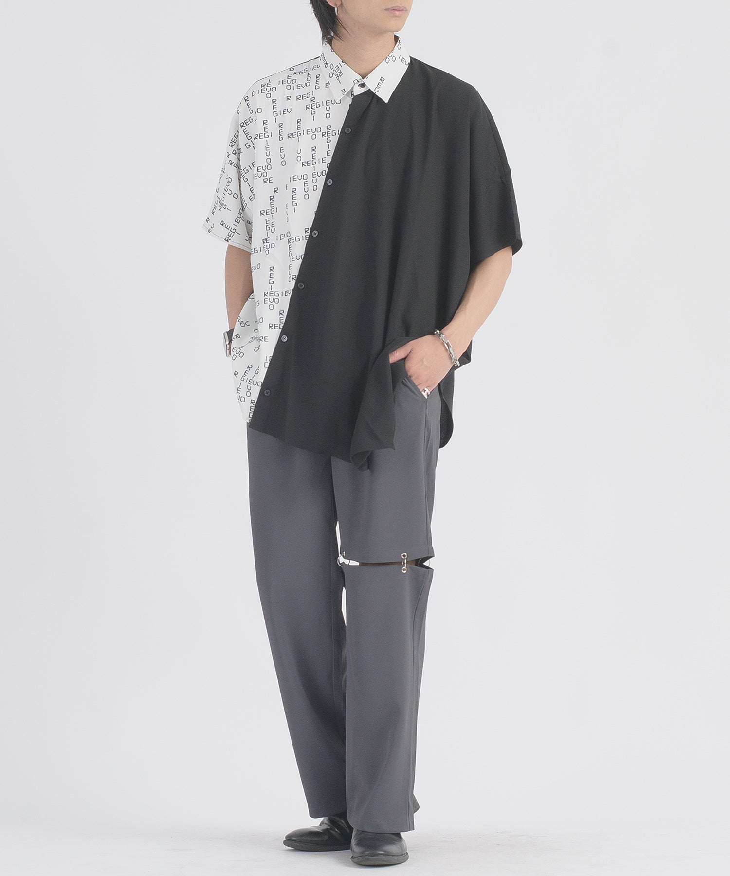 ボタンを斜めに配置したデザインもユニークで、左右の生地を柄と無地で切り替えたアシンメトリーなデザインです。