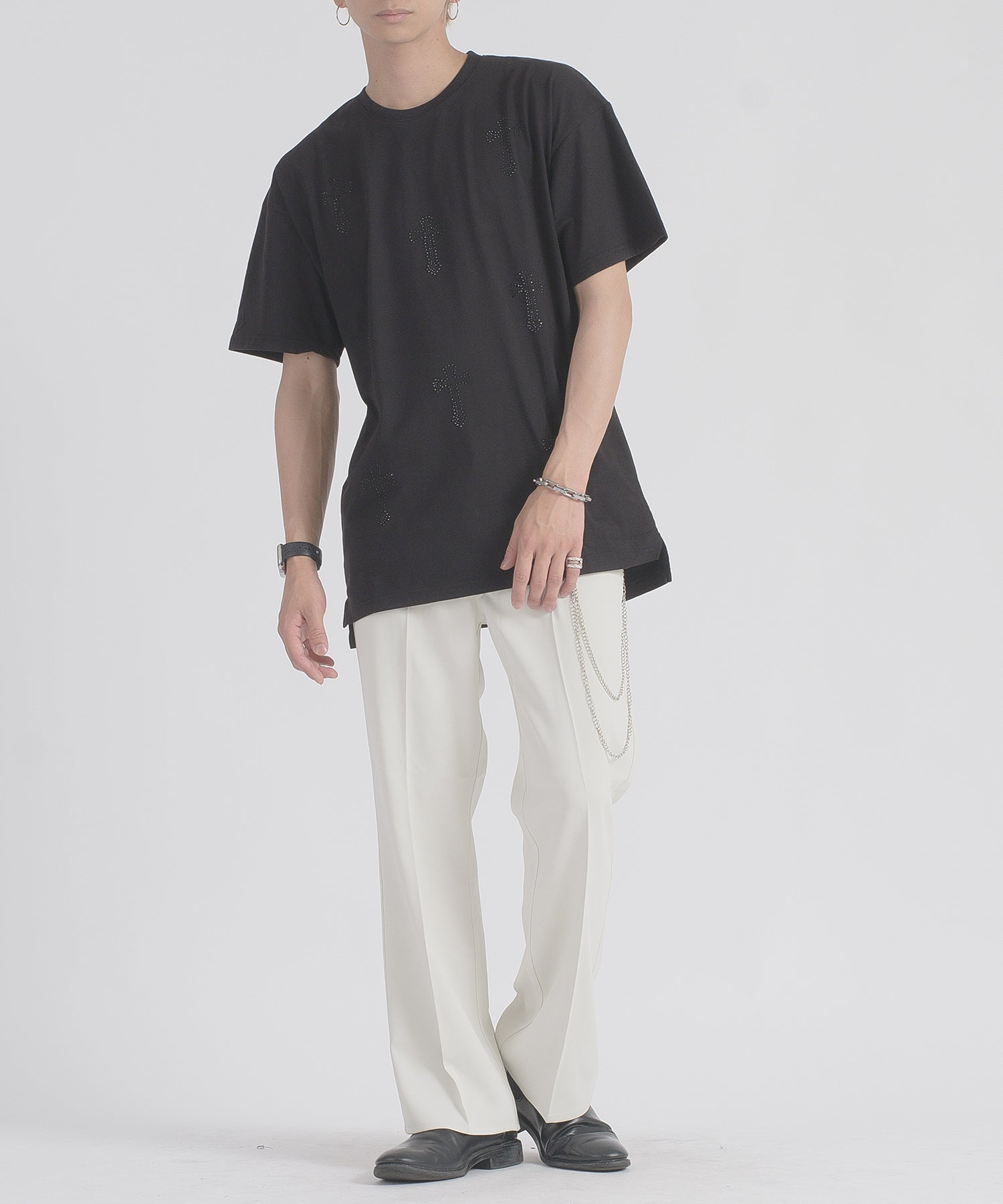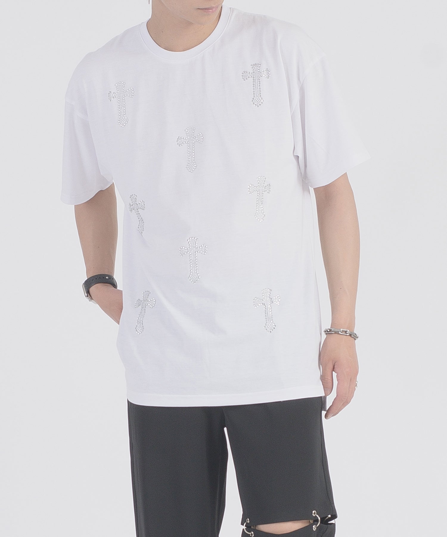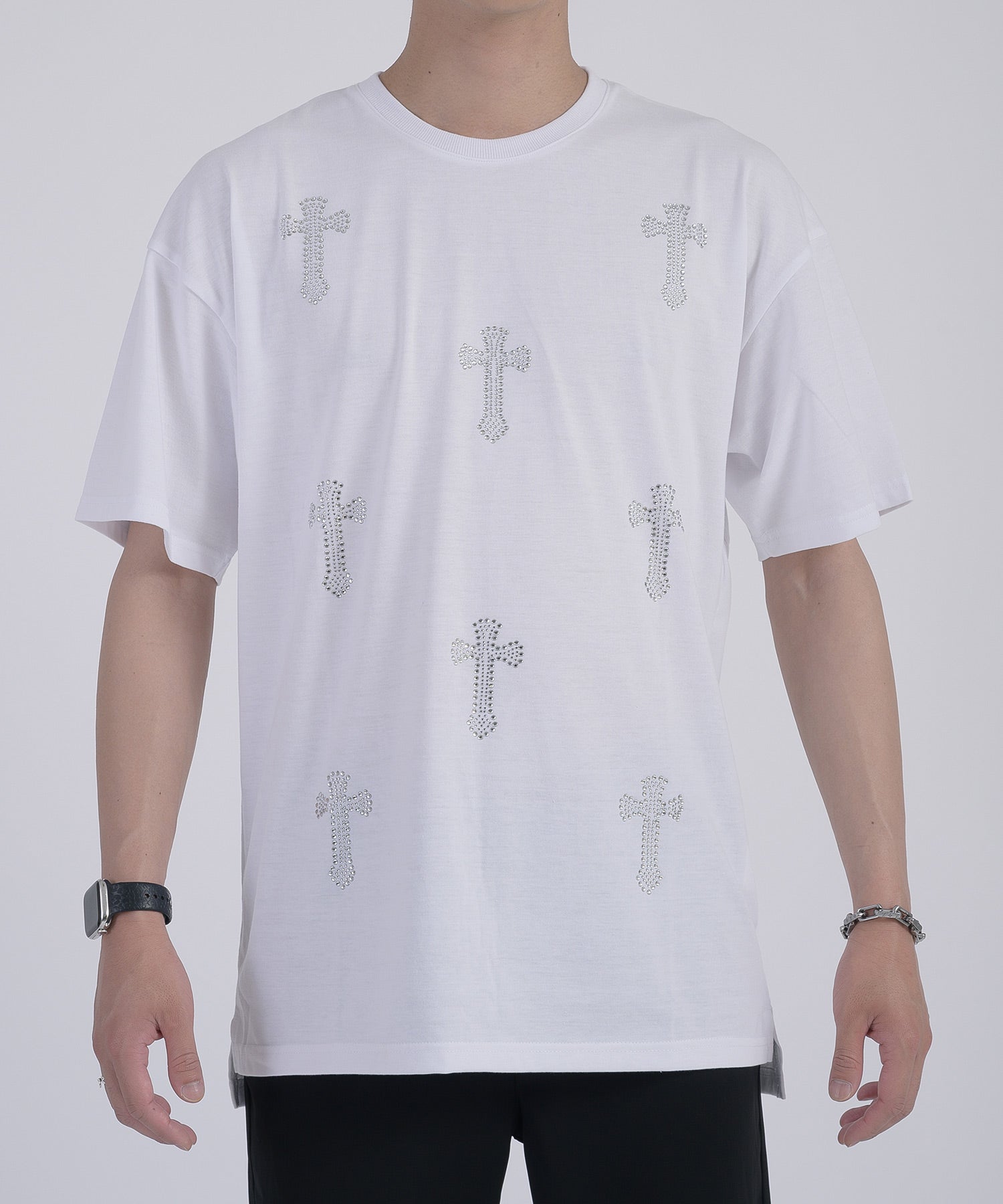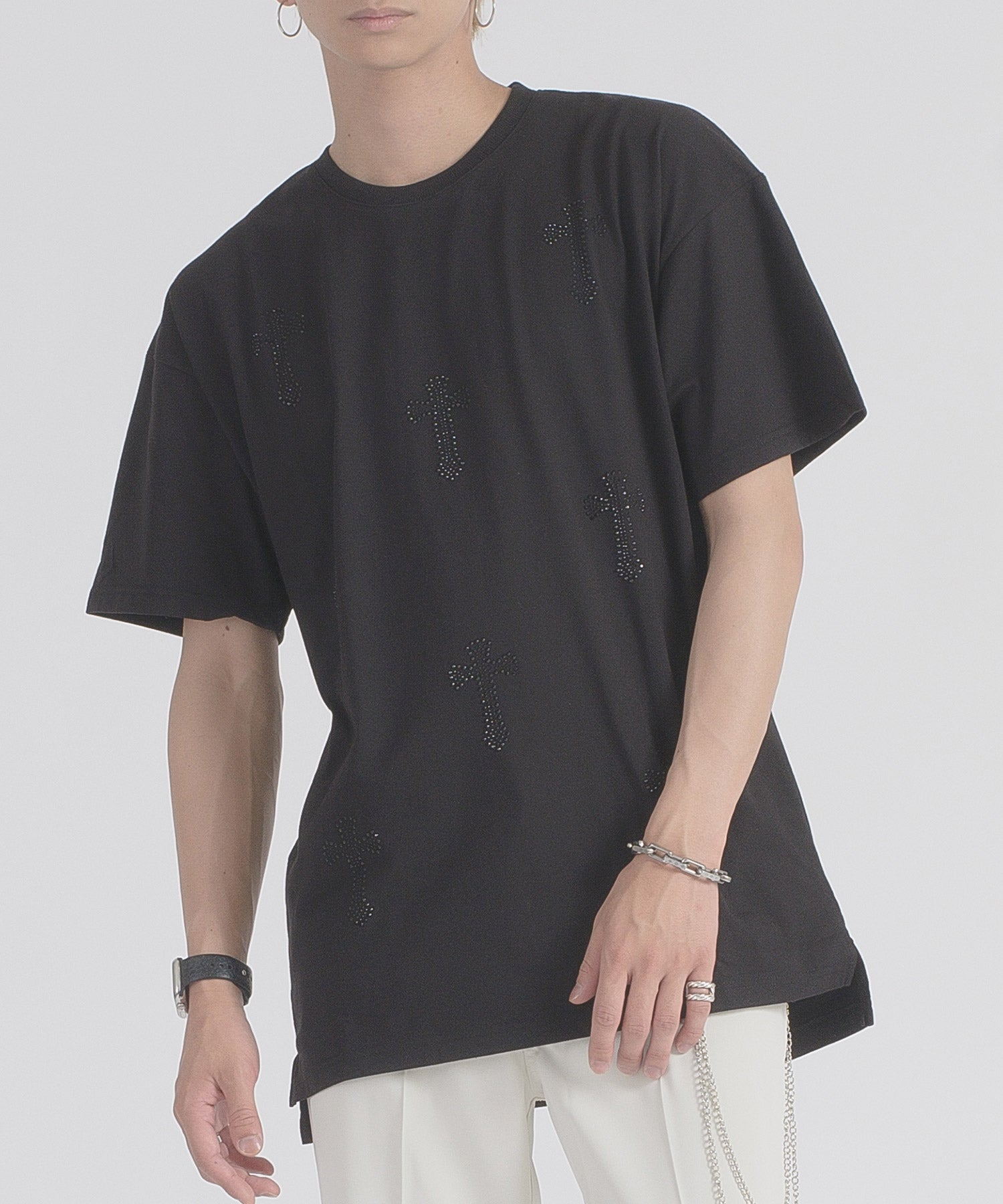 フロントに十字架のラインストーンプリントが散りばめられたTシャツです。