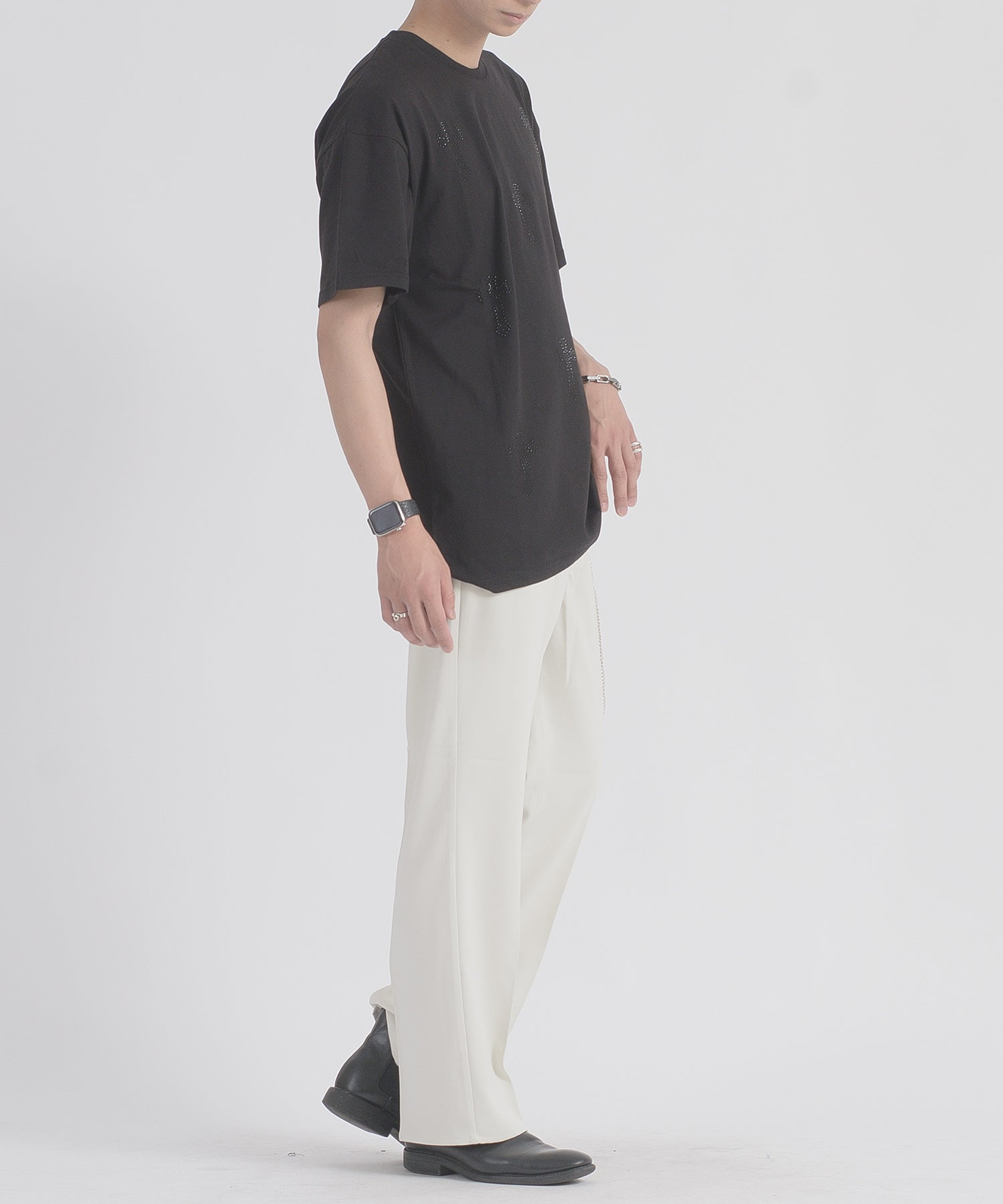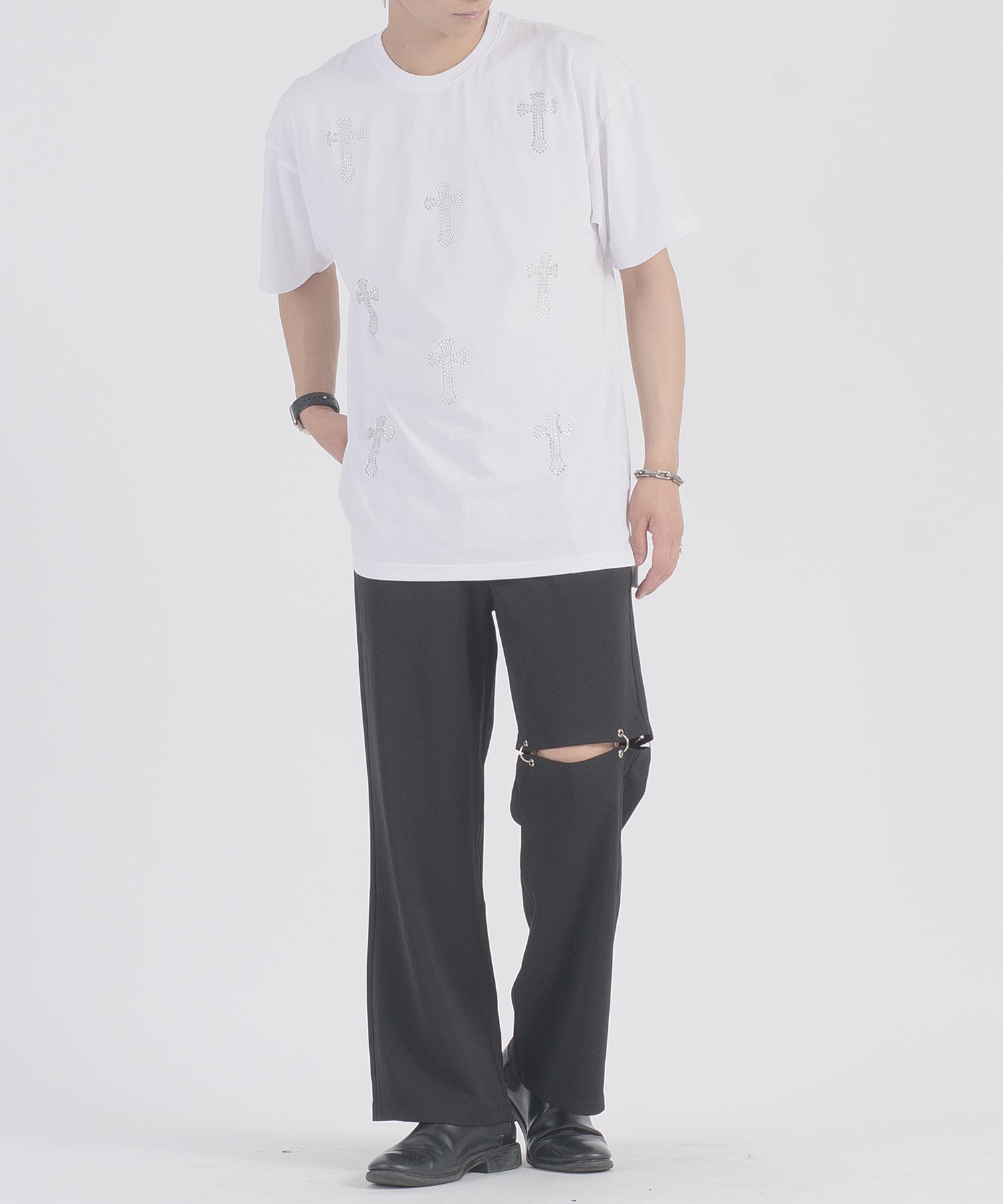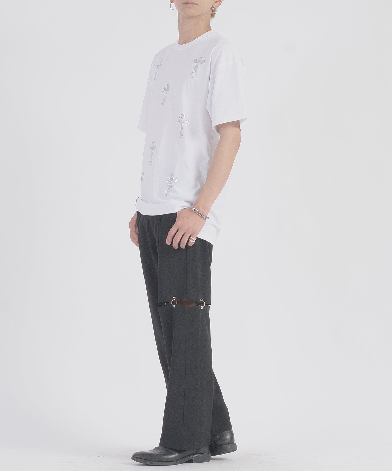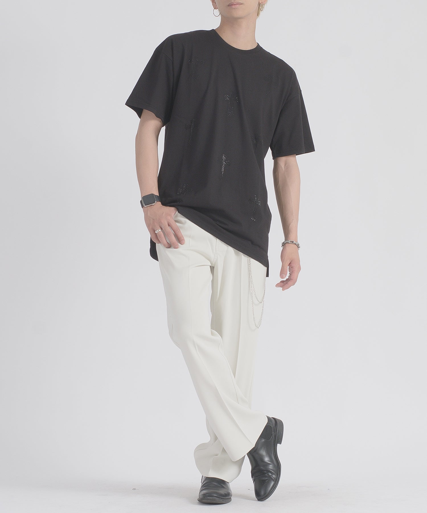 フロントに十字架のラインストーンプリントが散りばめられたTシャツです。