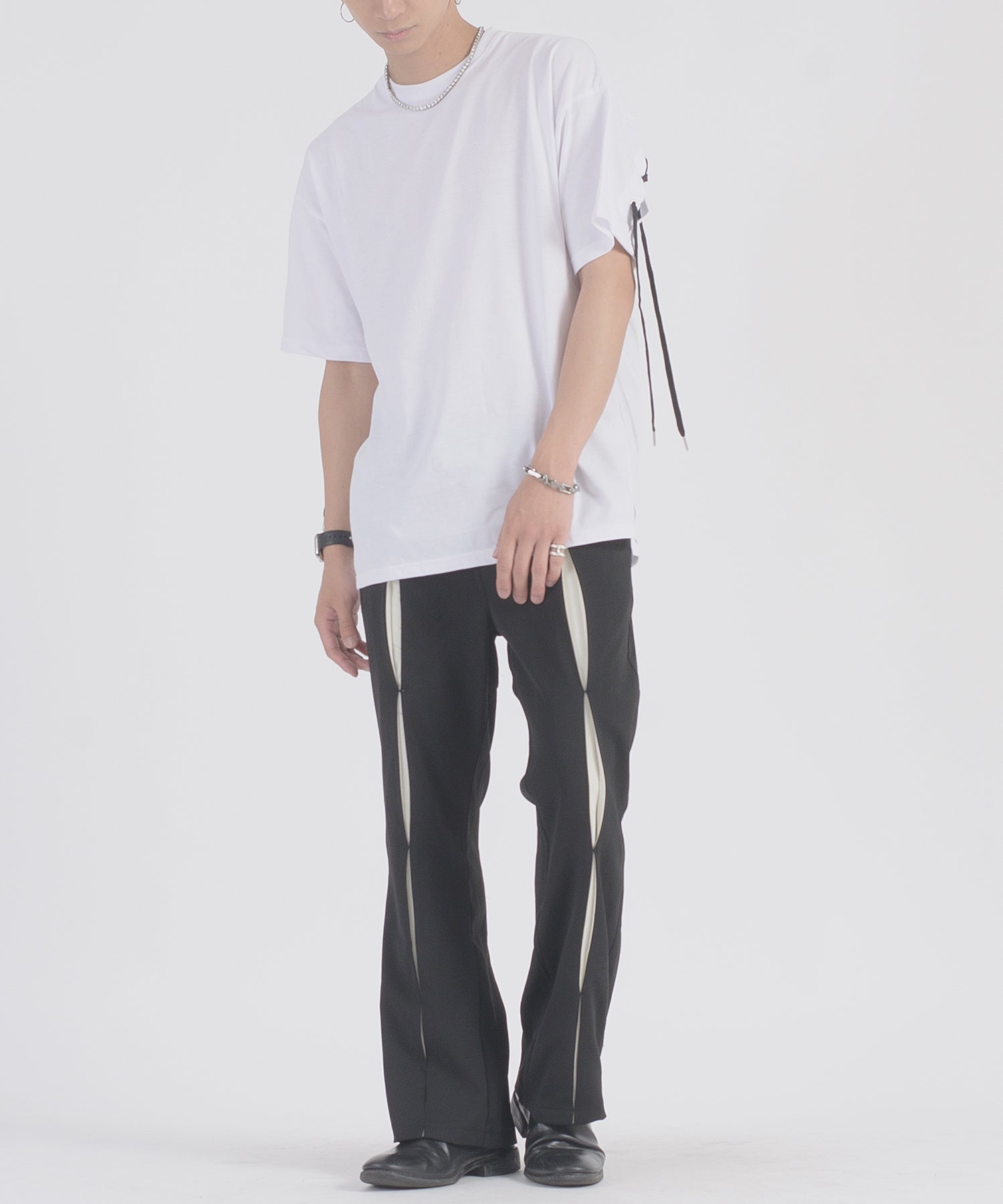 ドレープ感のあるスラックスと合わせると今風のトレンドスタイルを演出できます。