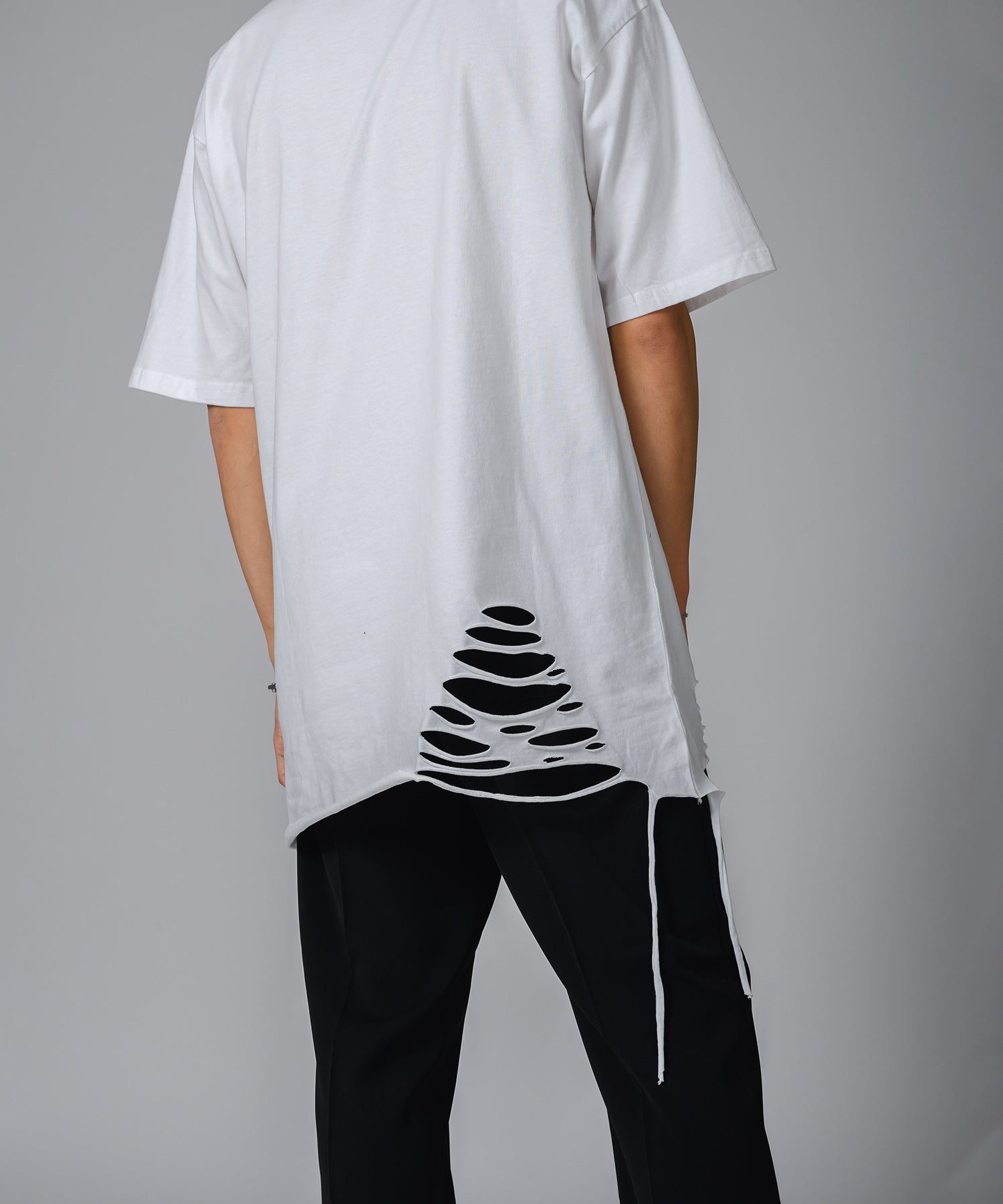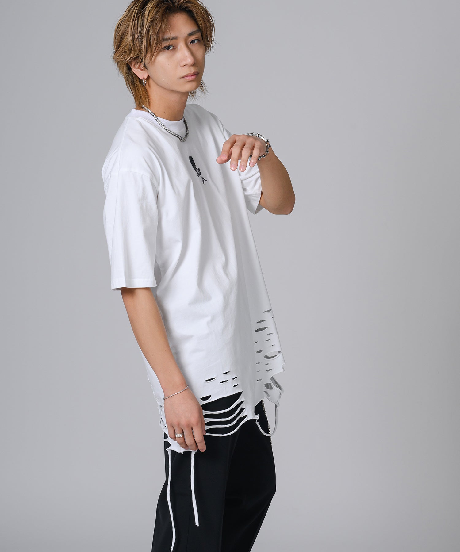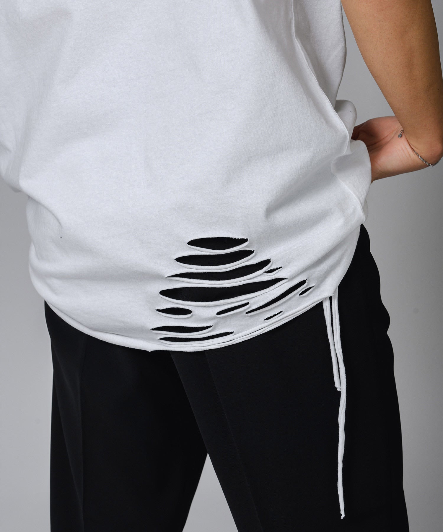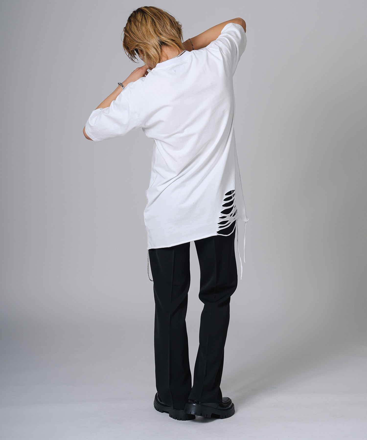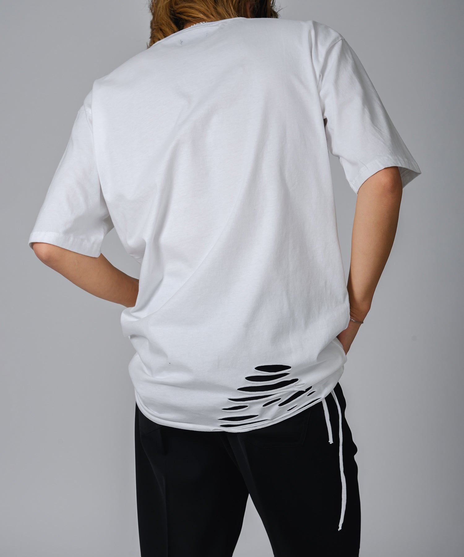 裾にダメージ加工したグランジスタイルのTシャツです。