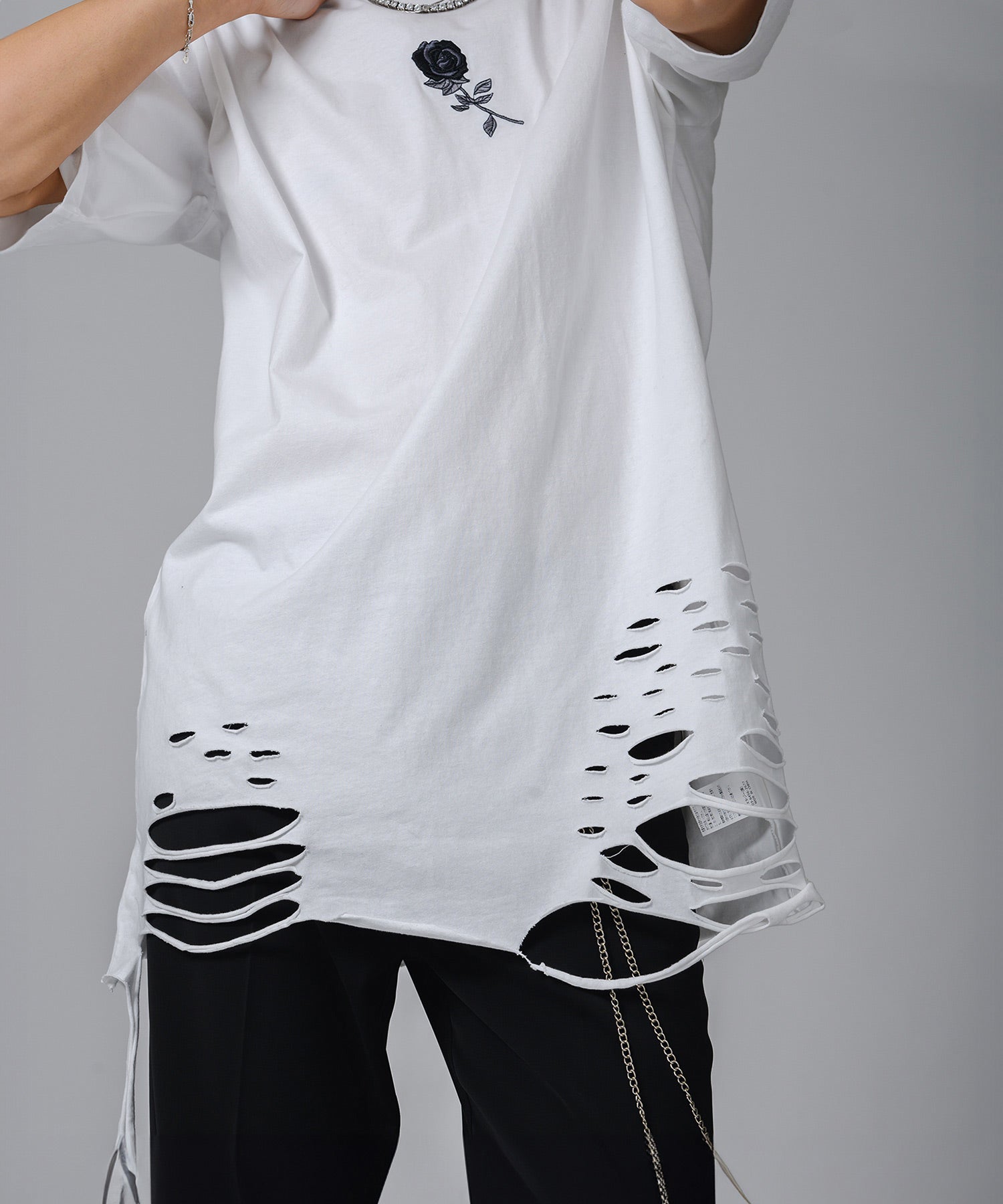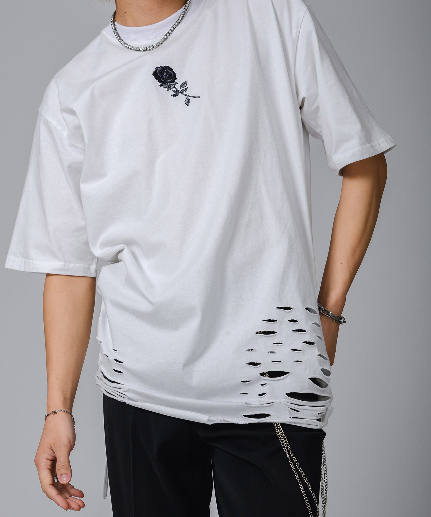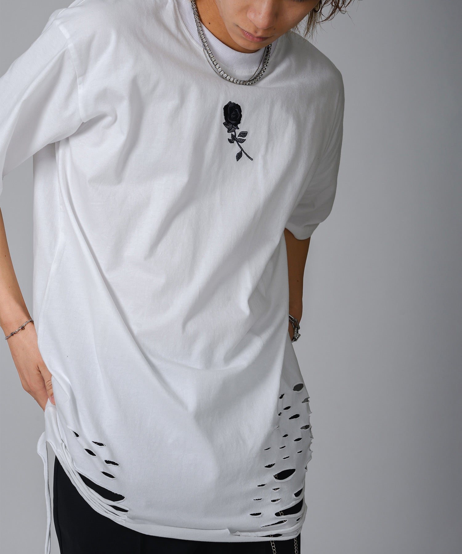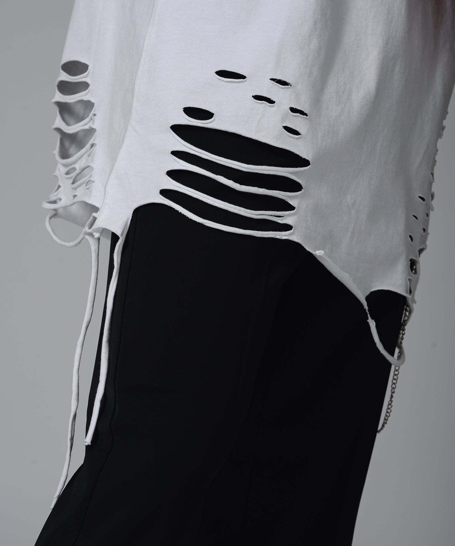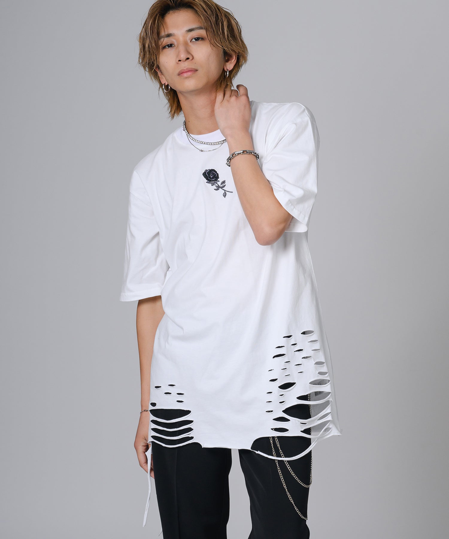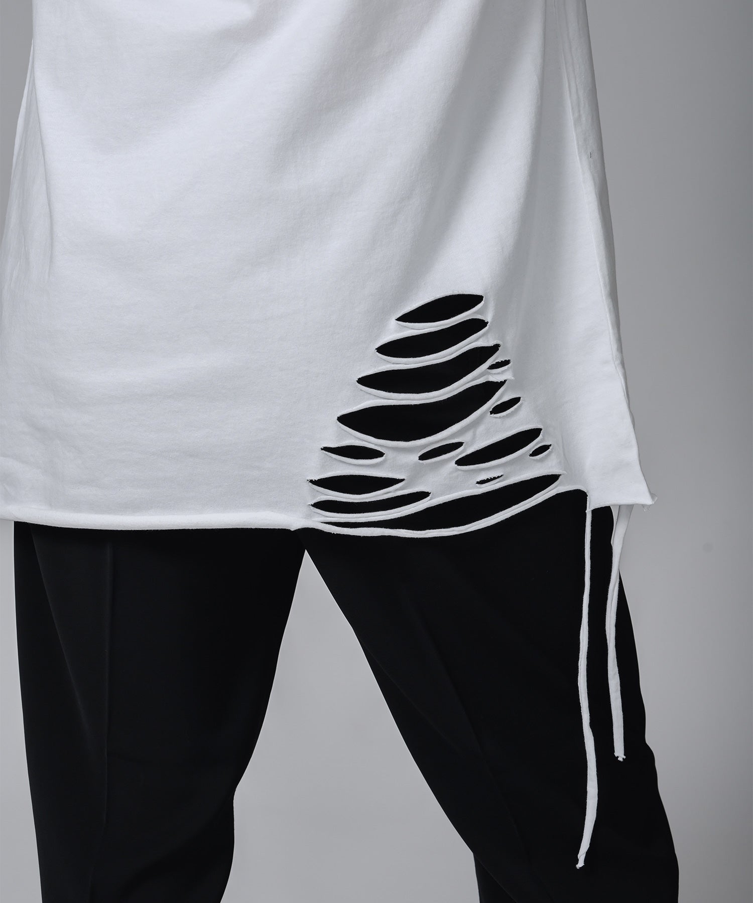 裾にダメージ加工したグランジスタイルのTシャツです。