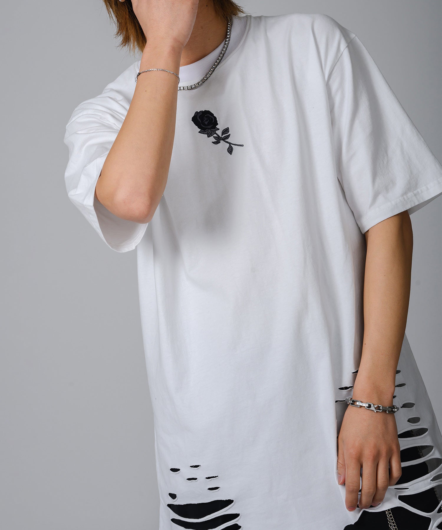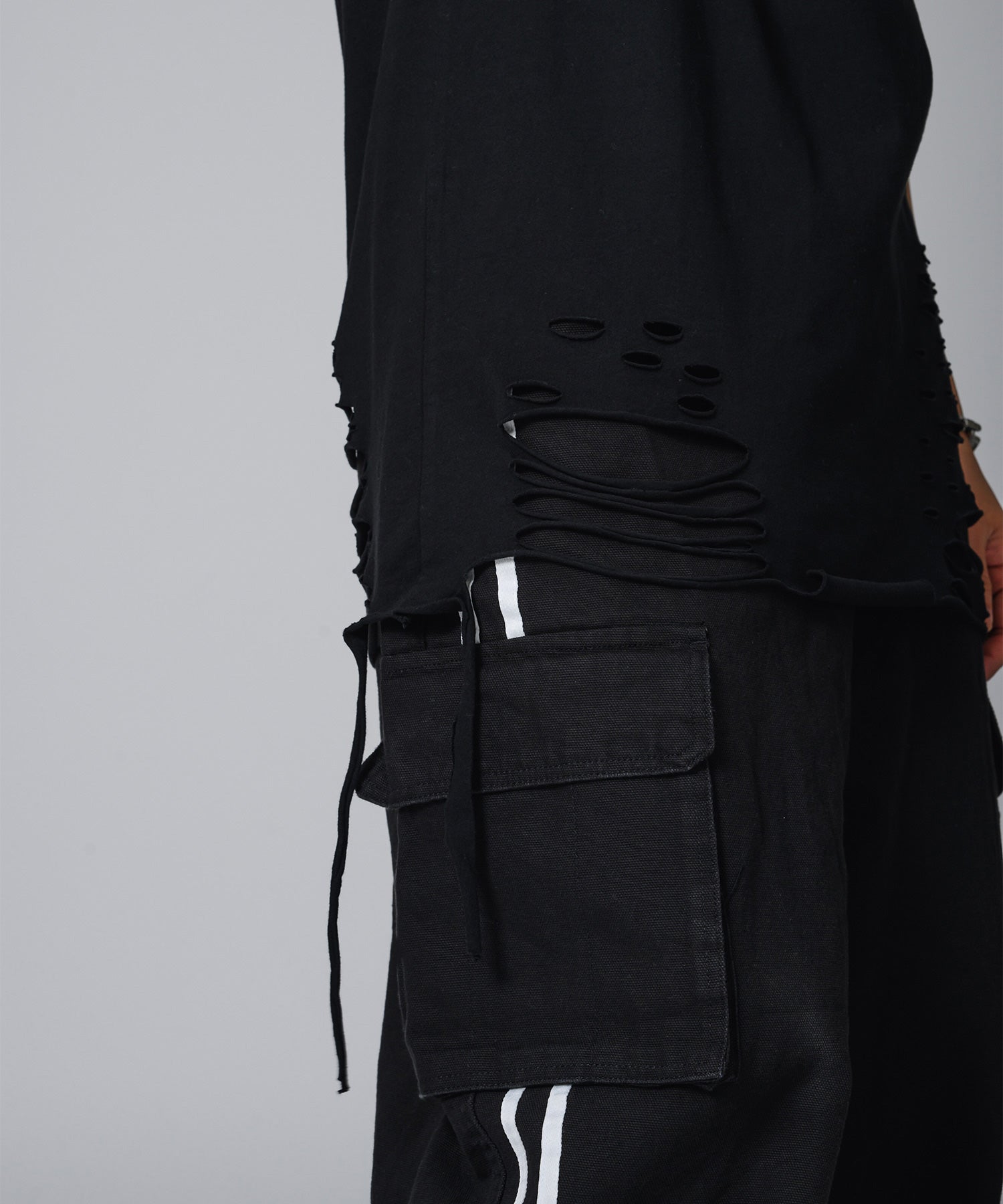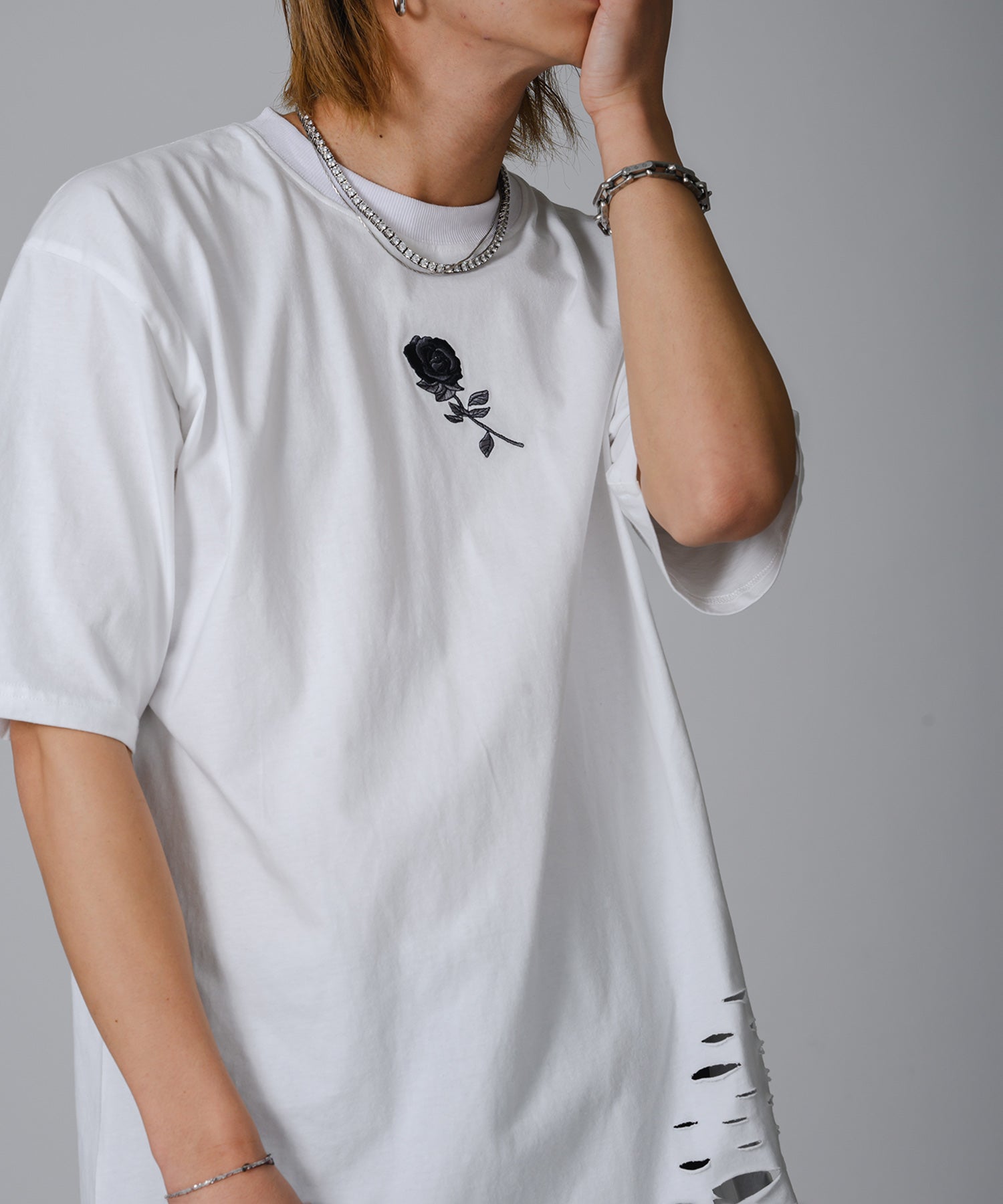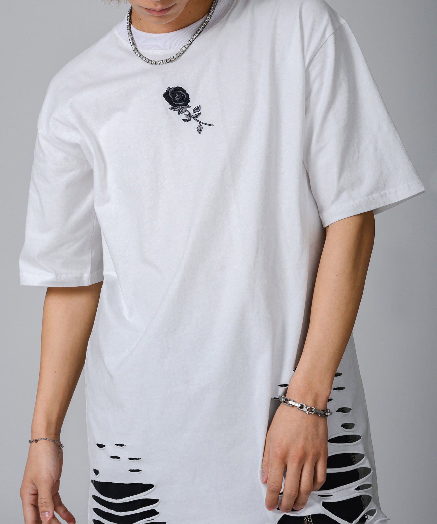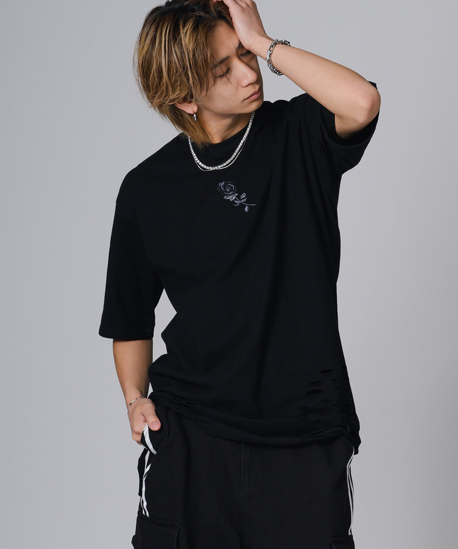 裾にダメージ加工したグランジスタイルのTシャツです。