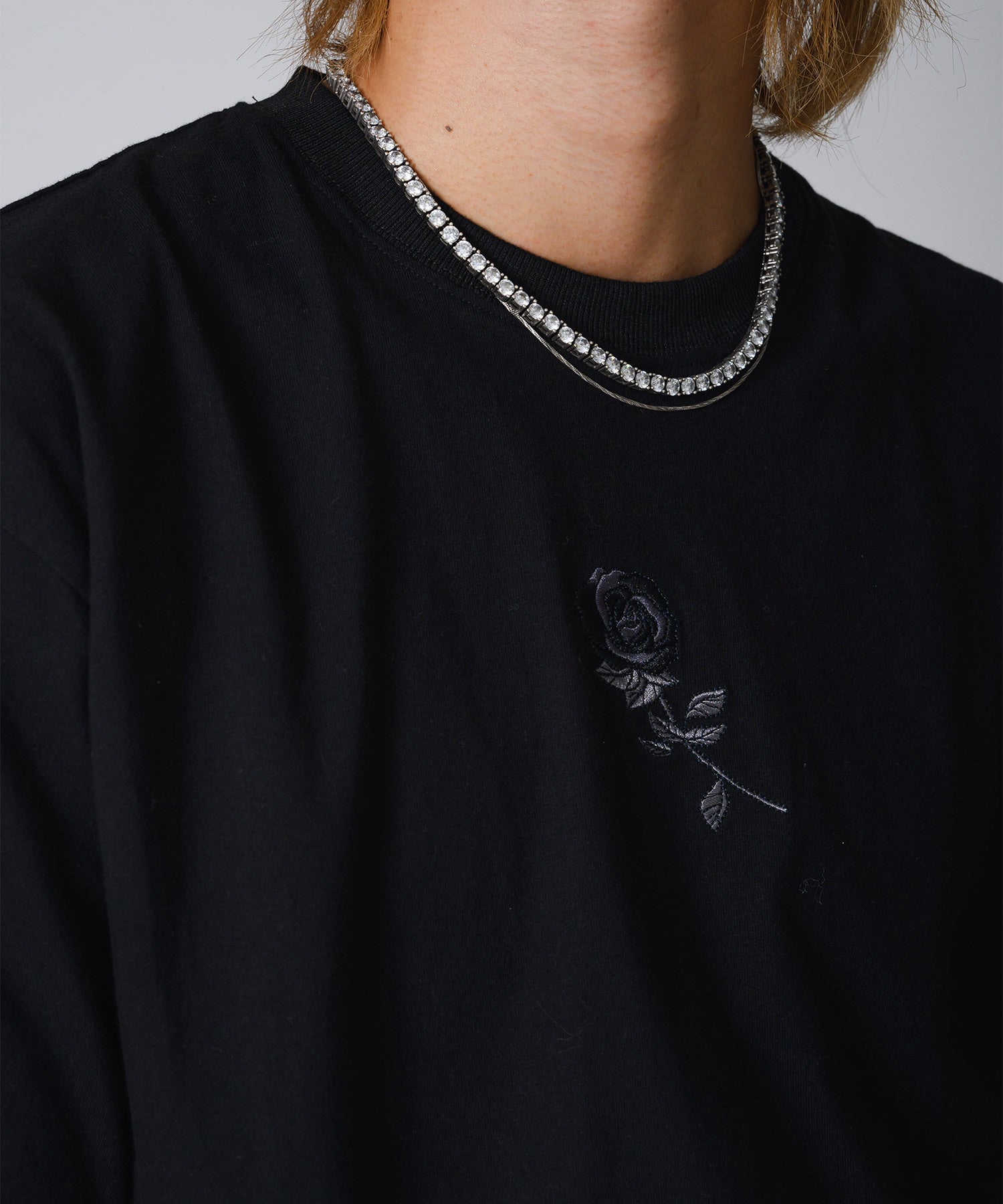 胸には薔薇のワンポイント刺繍が、インナーとしてきた時のアクセントになります。