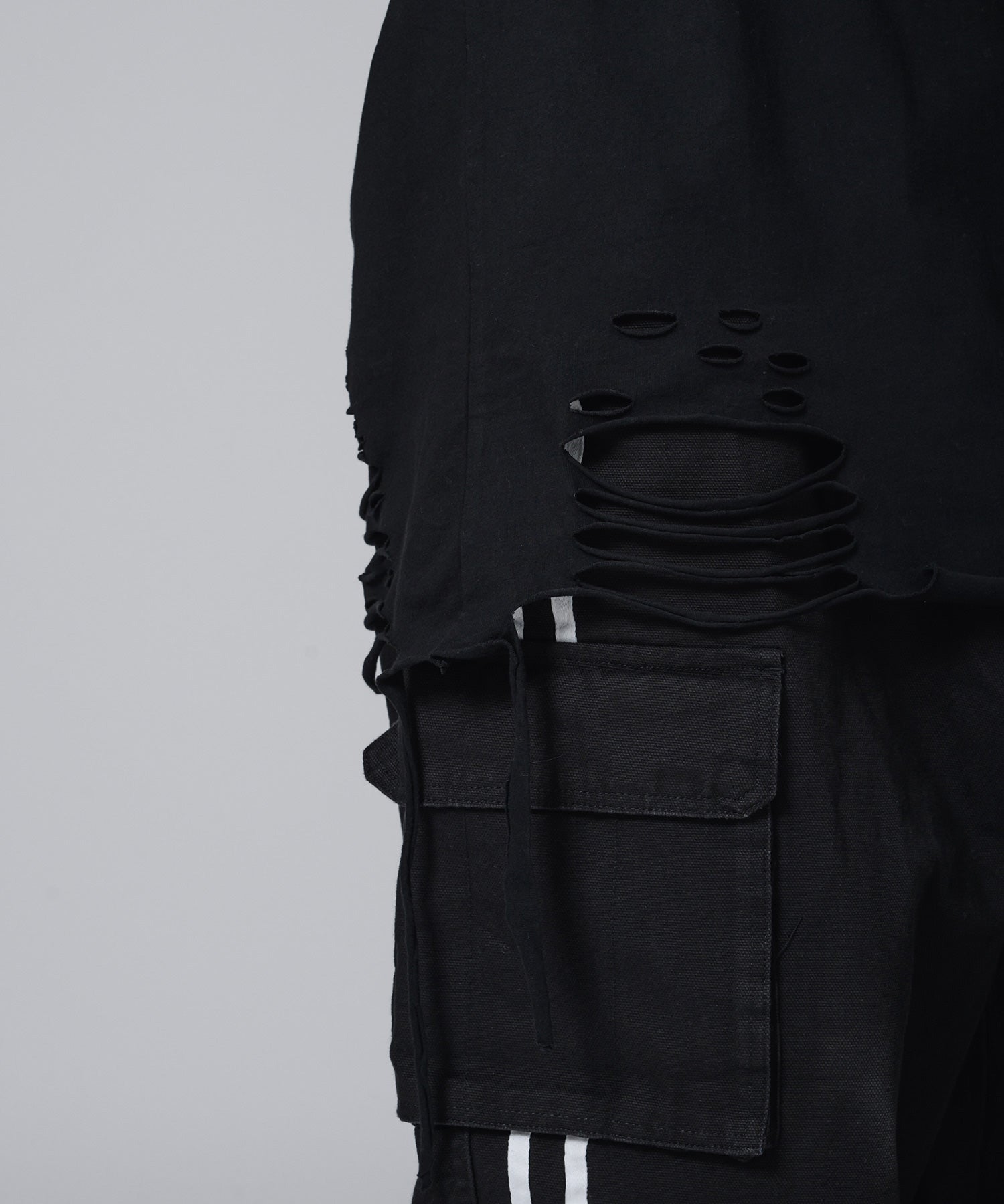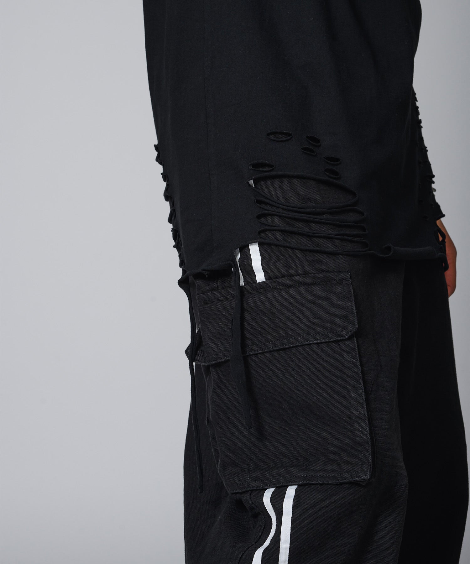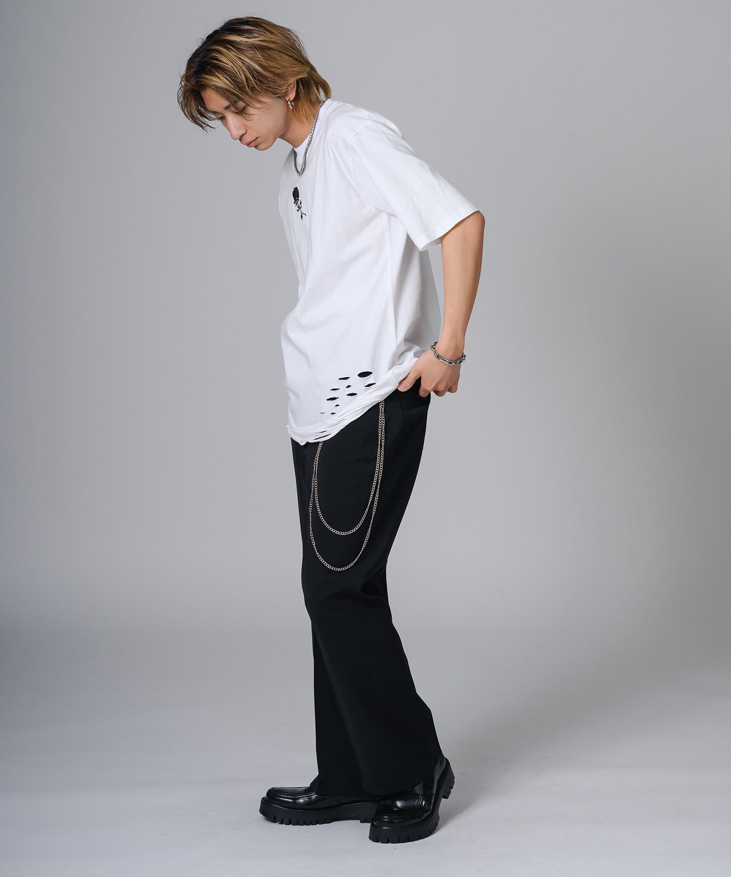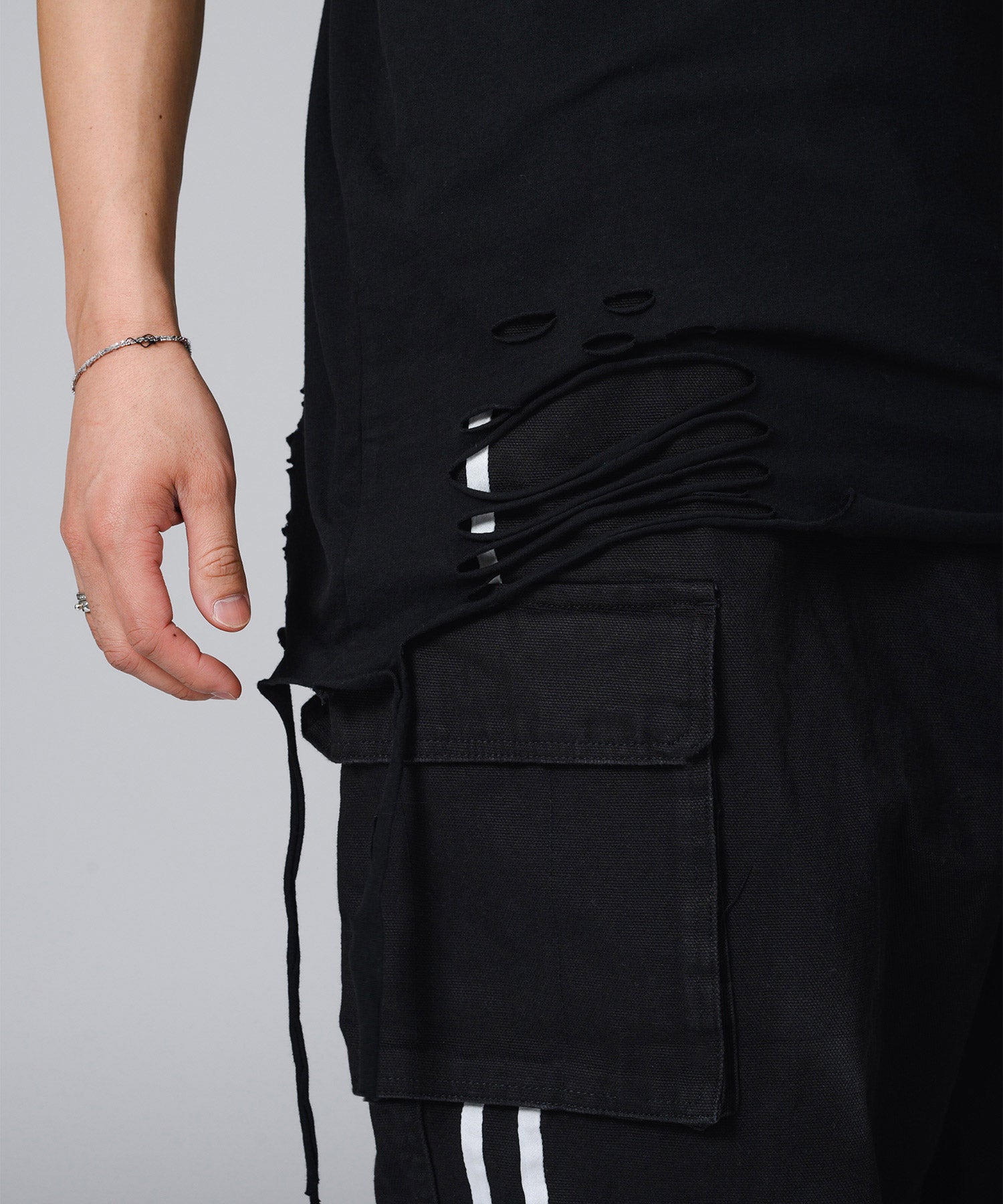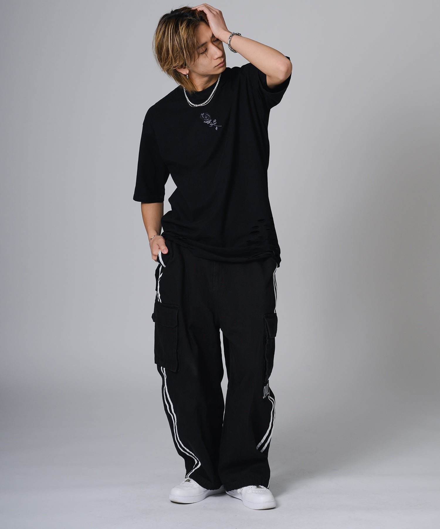 裾のダメージ感がTシャツの存在感だけでなくグランジスタイルのムードを高めてくれるデザイン。