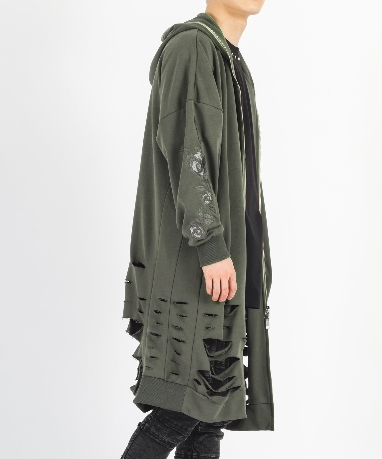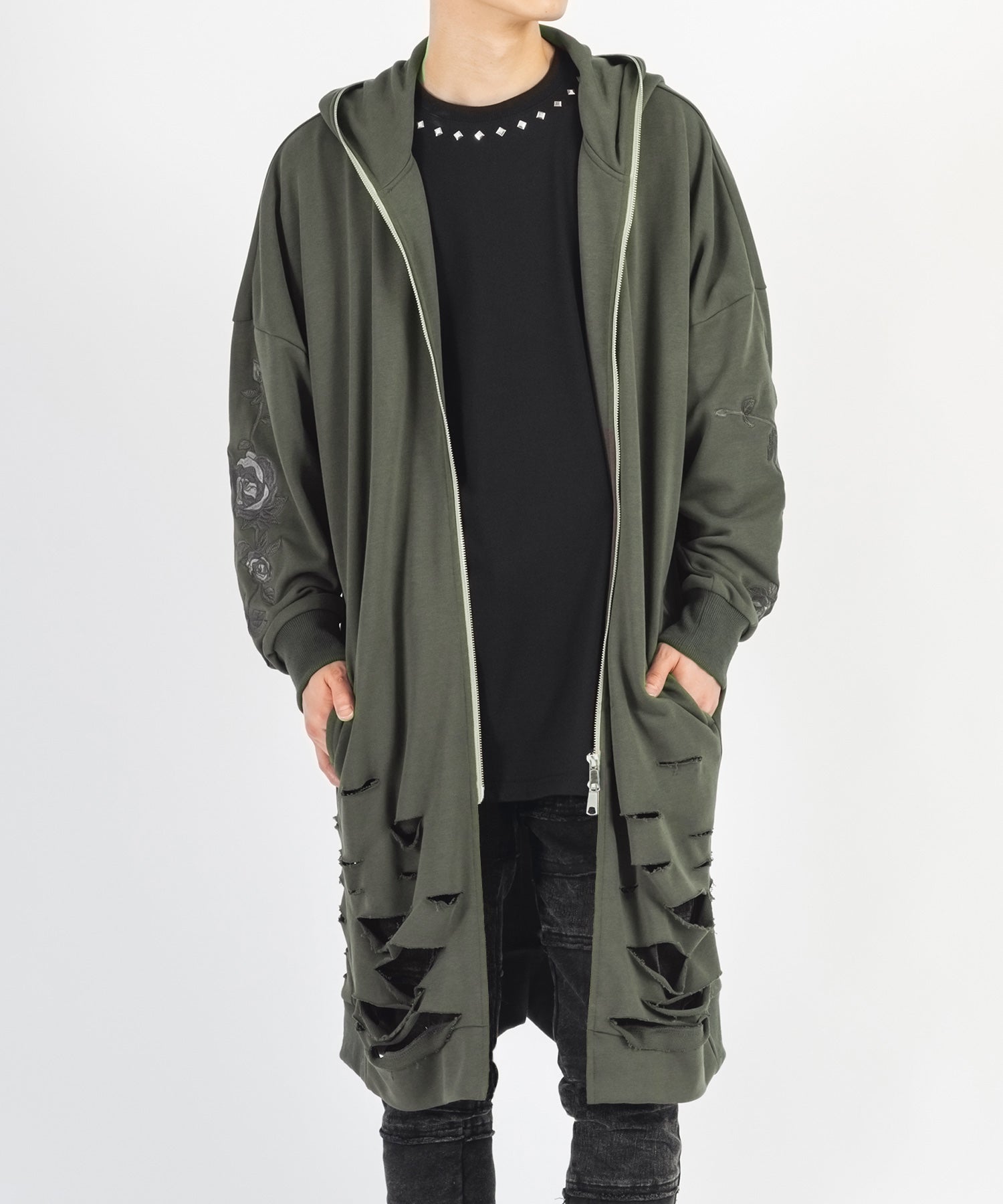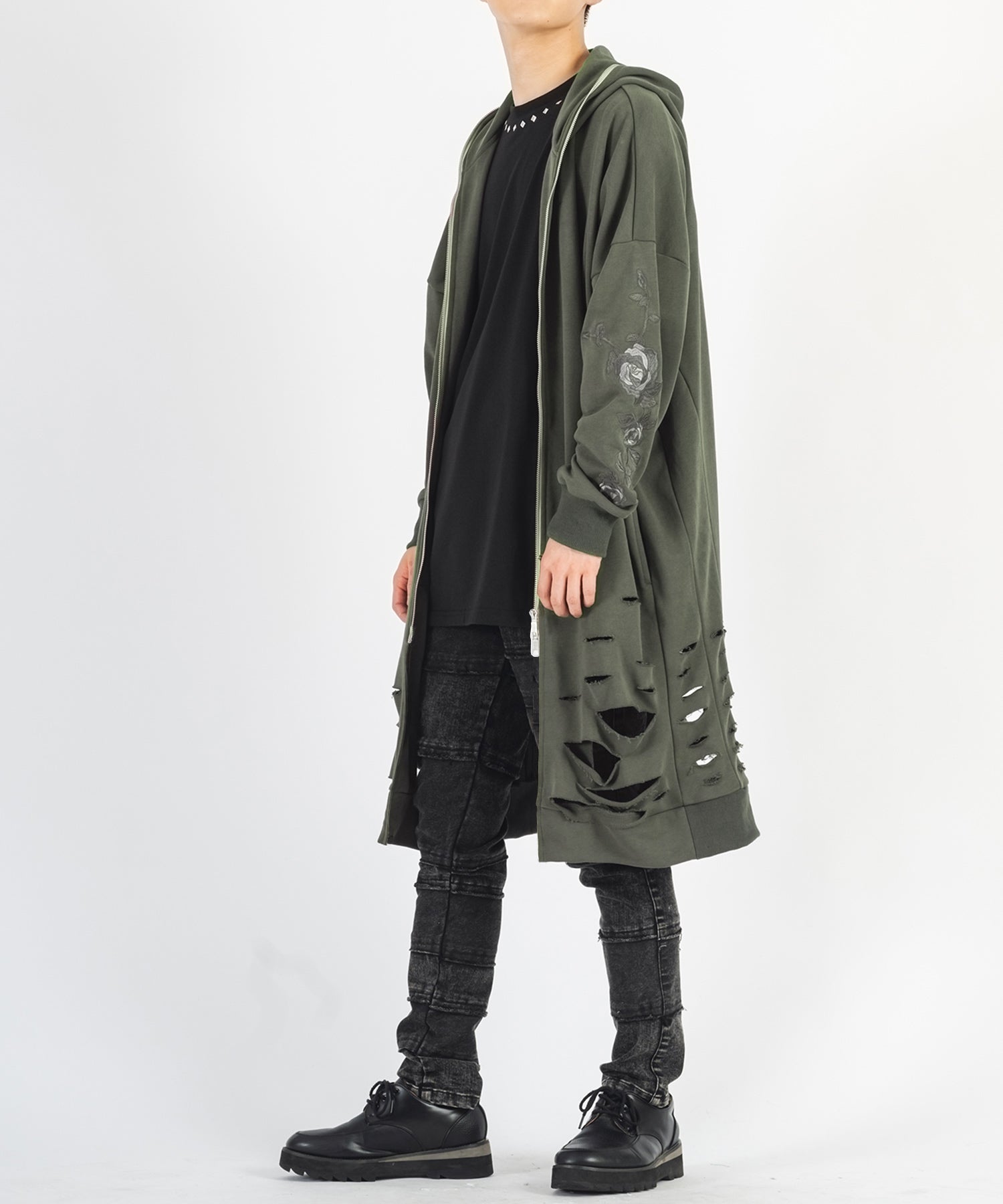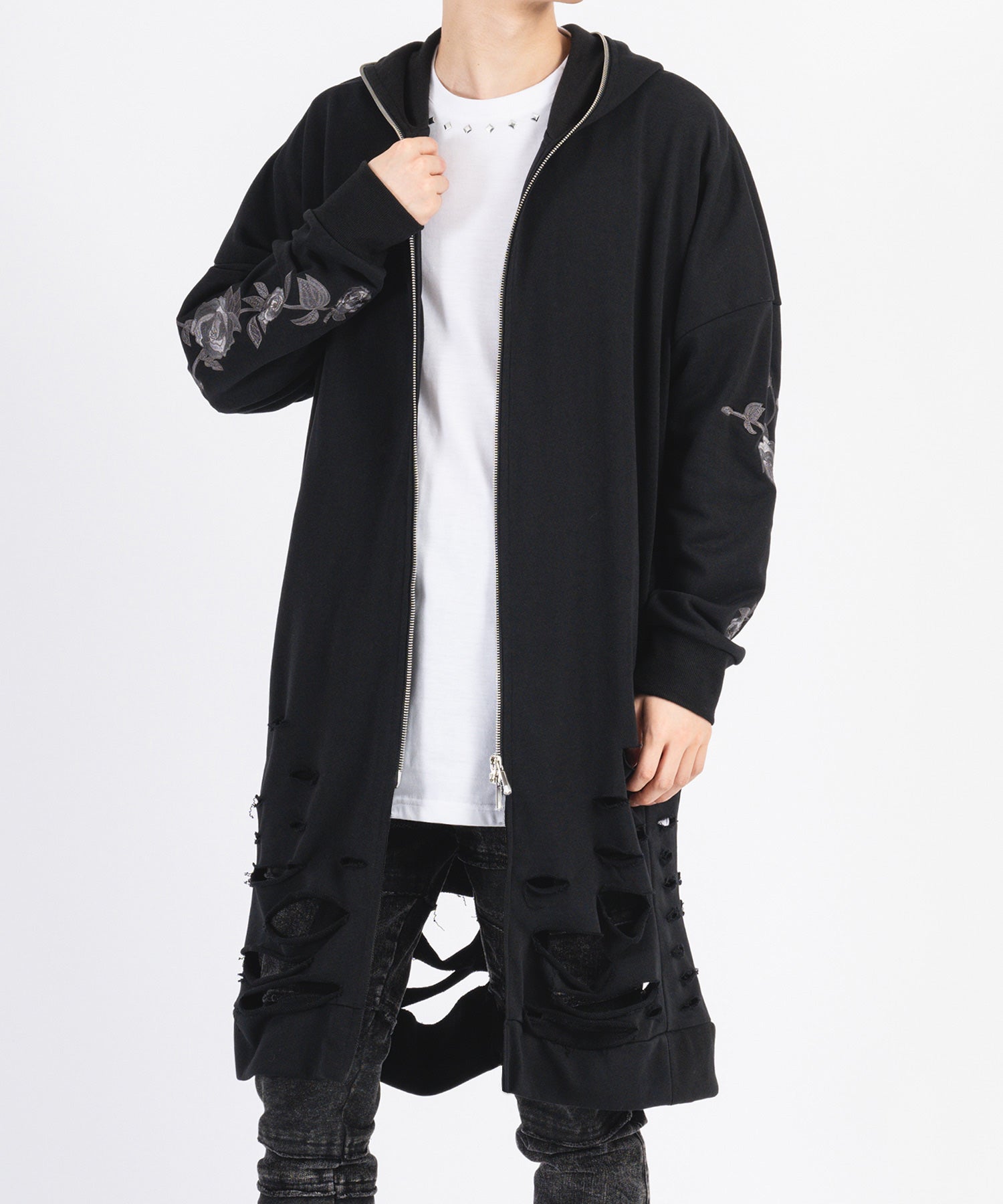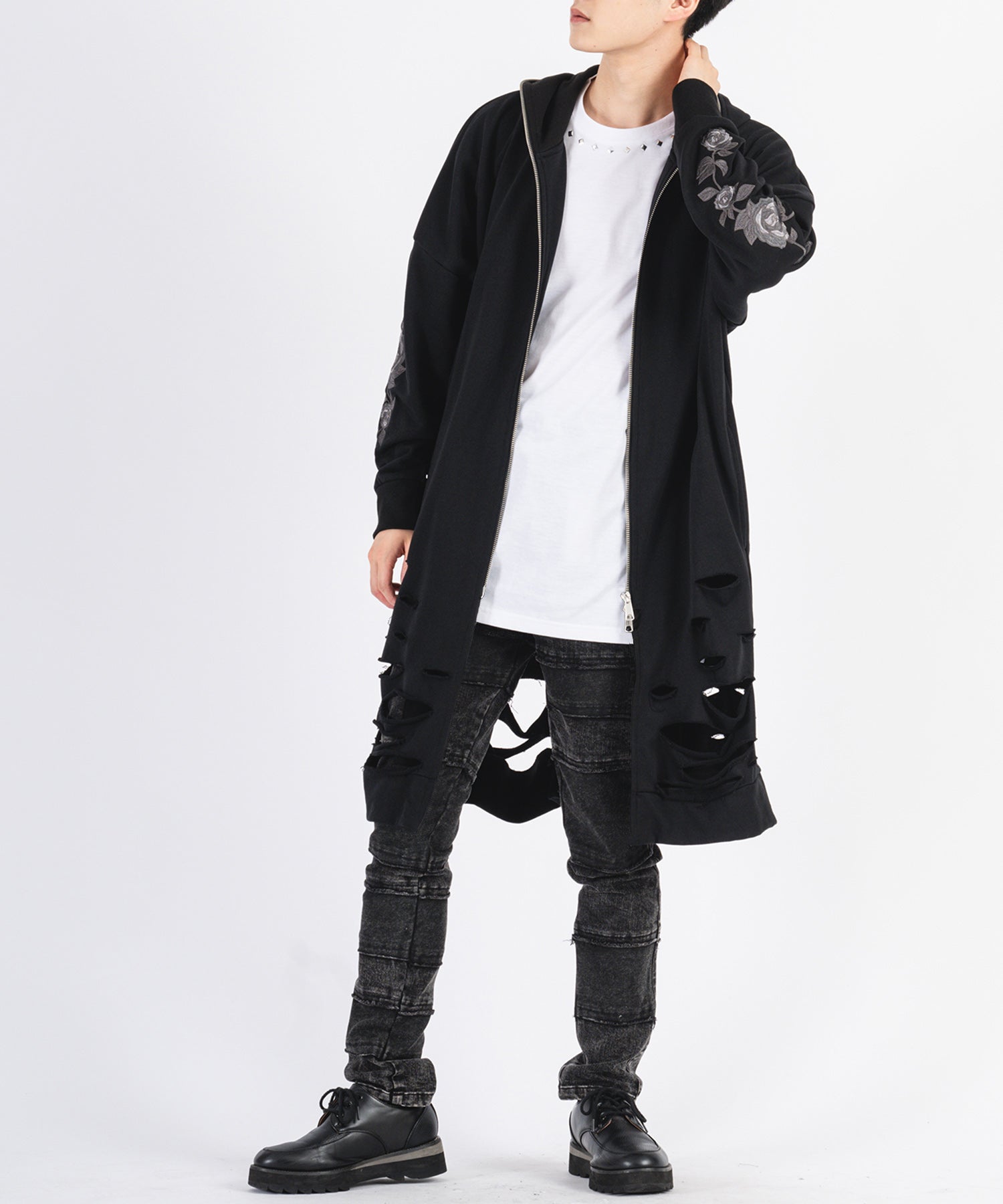 裾部分は敢えて施したダメージ感が男らしさも演出し、袖の薔薇の刺繍がアクセントになっています。