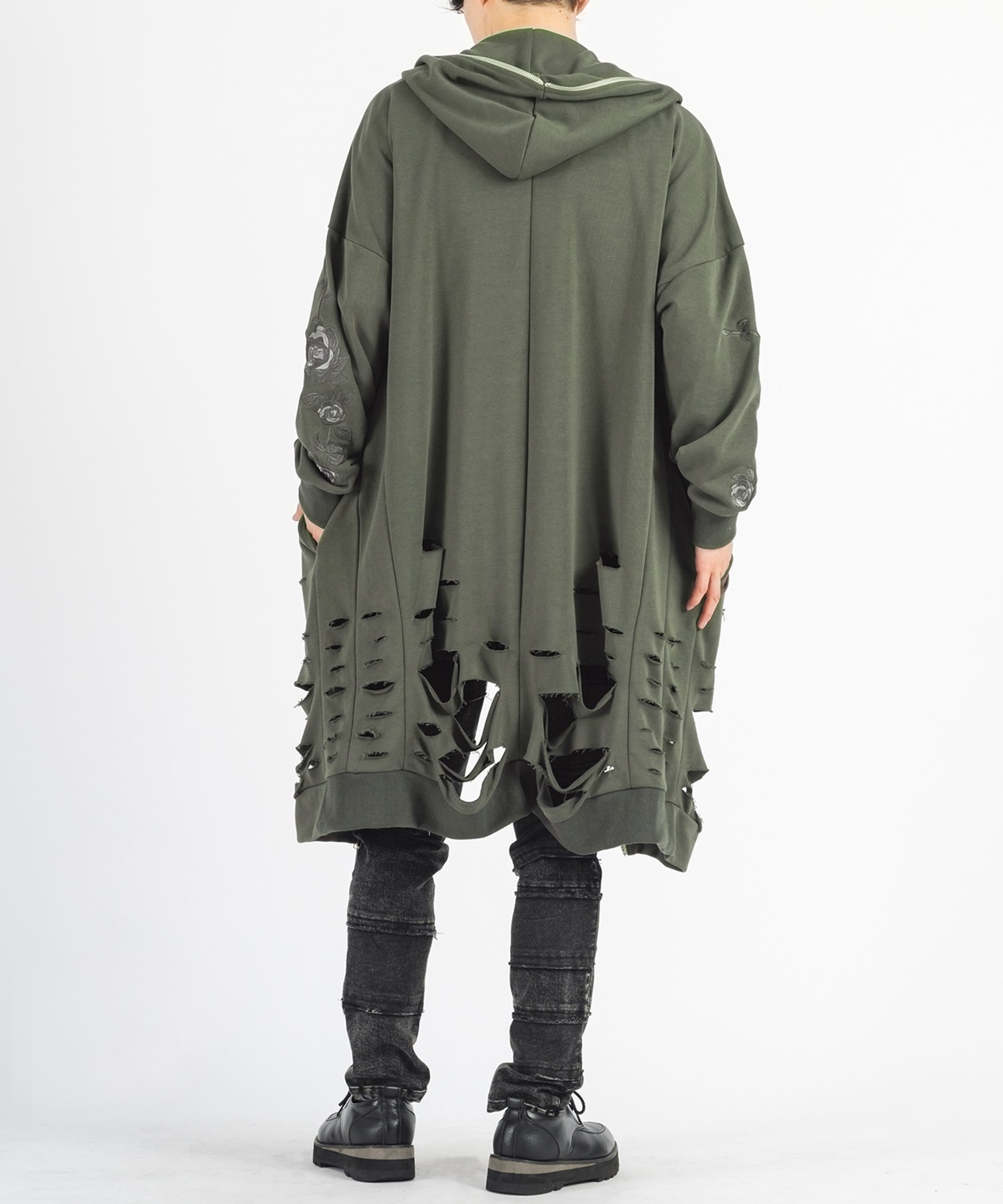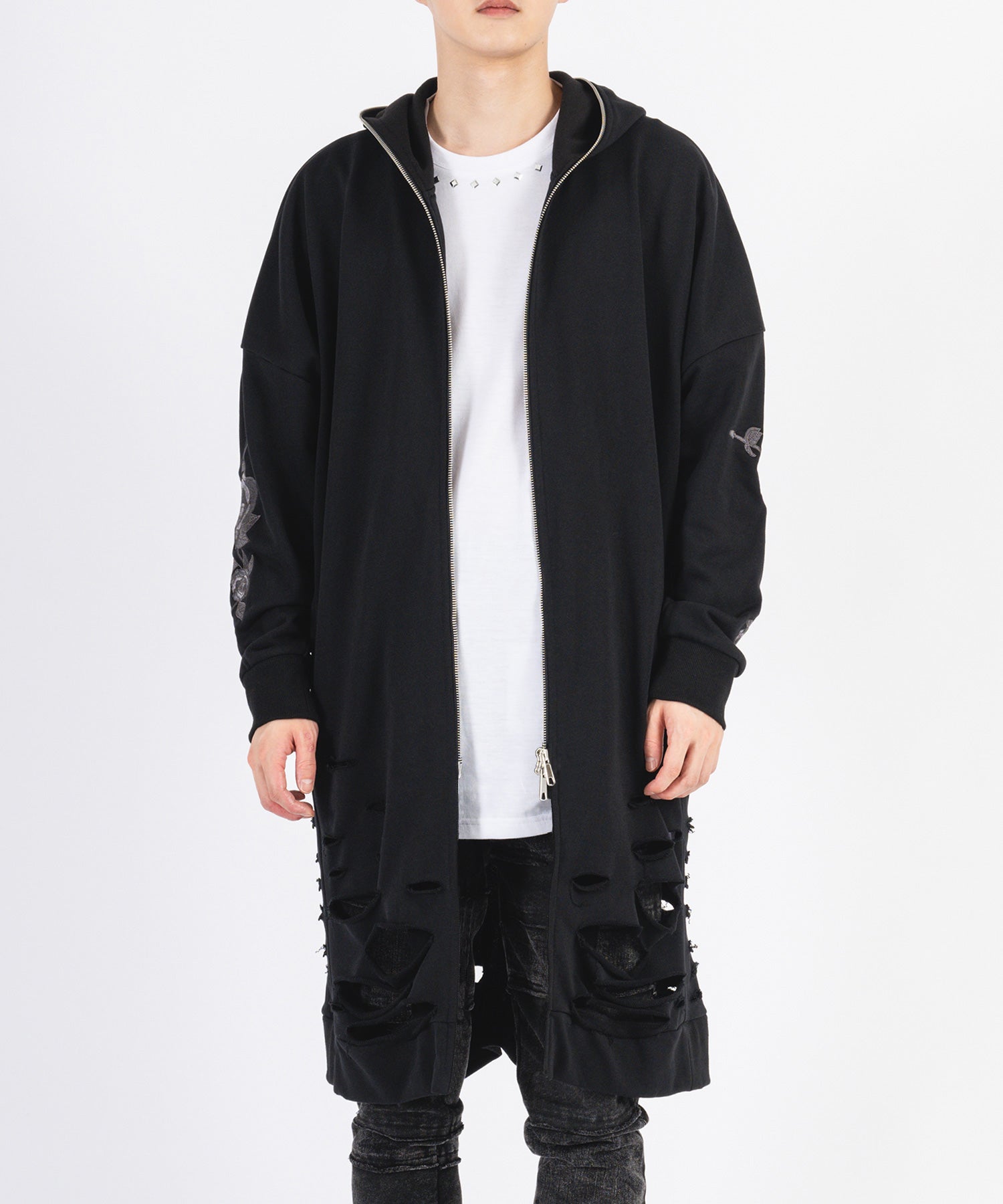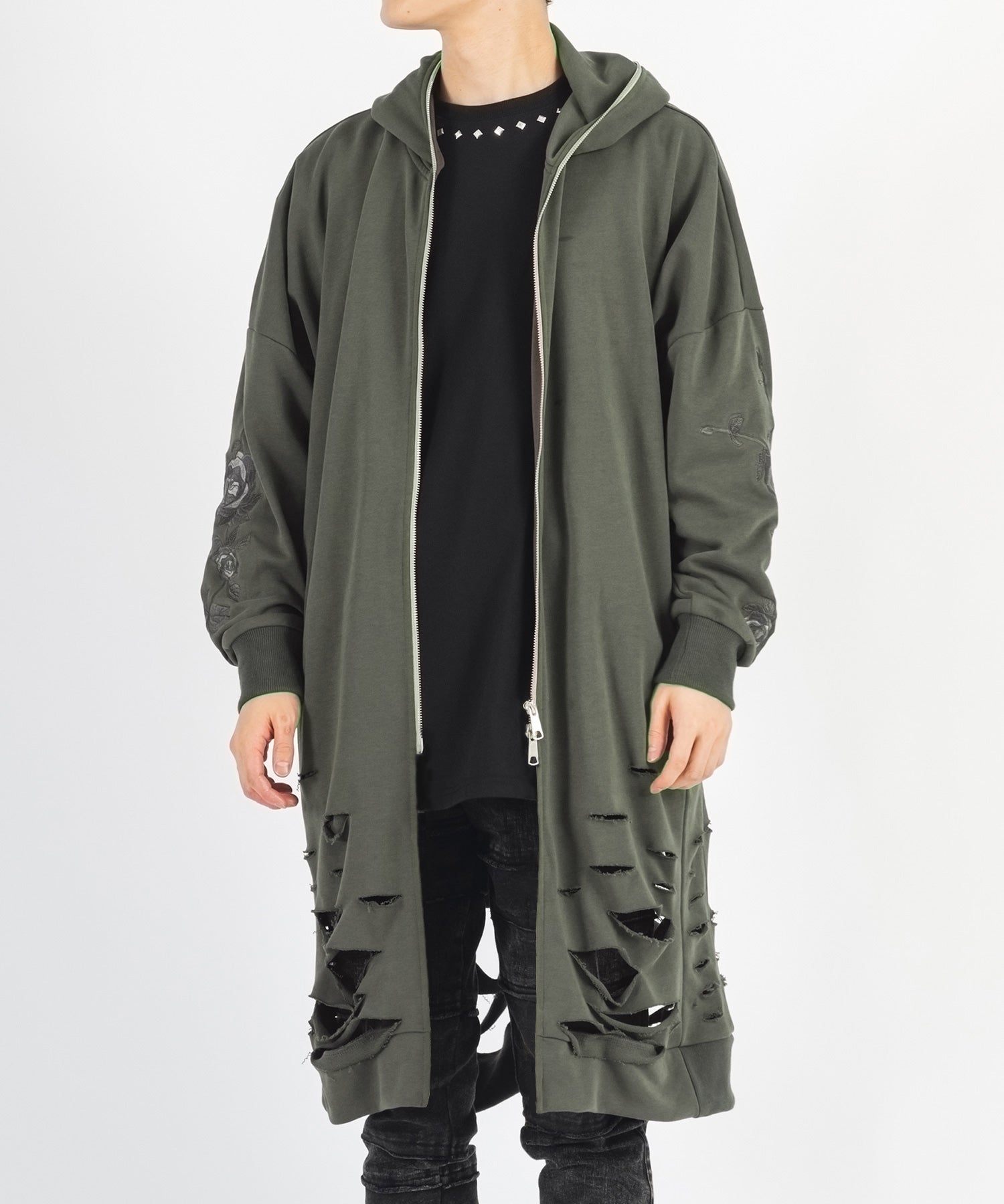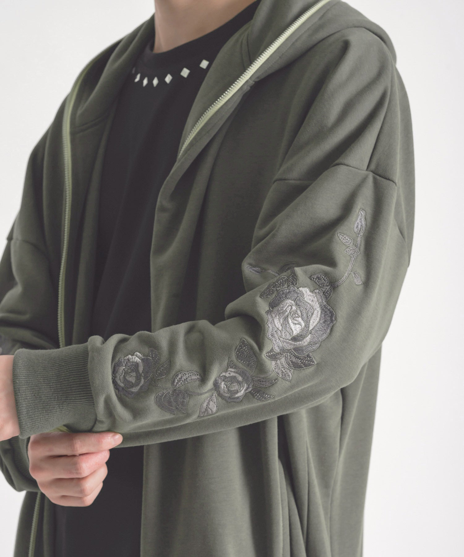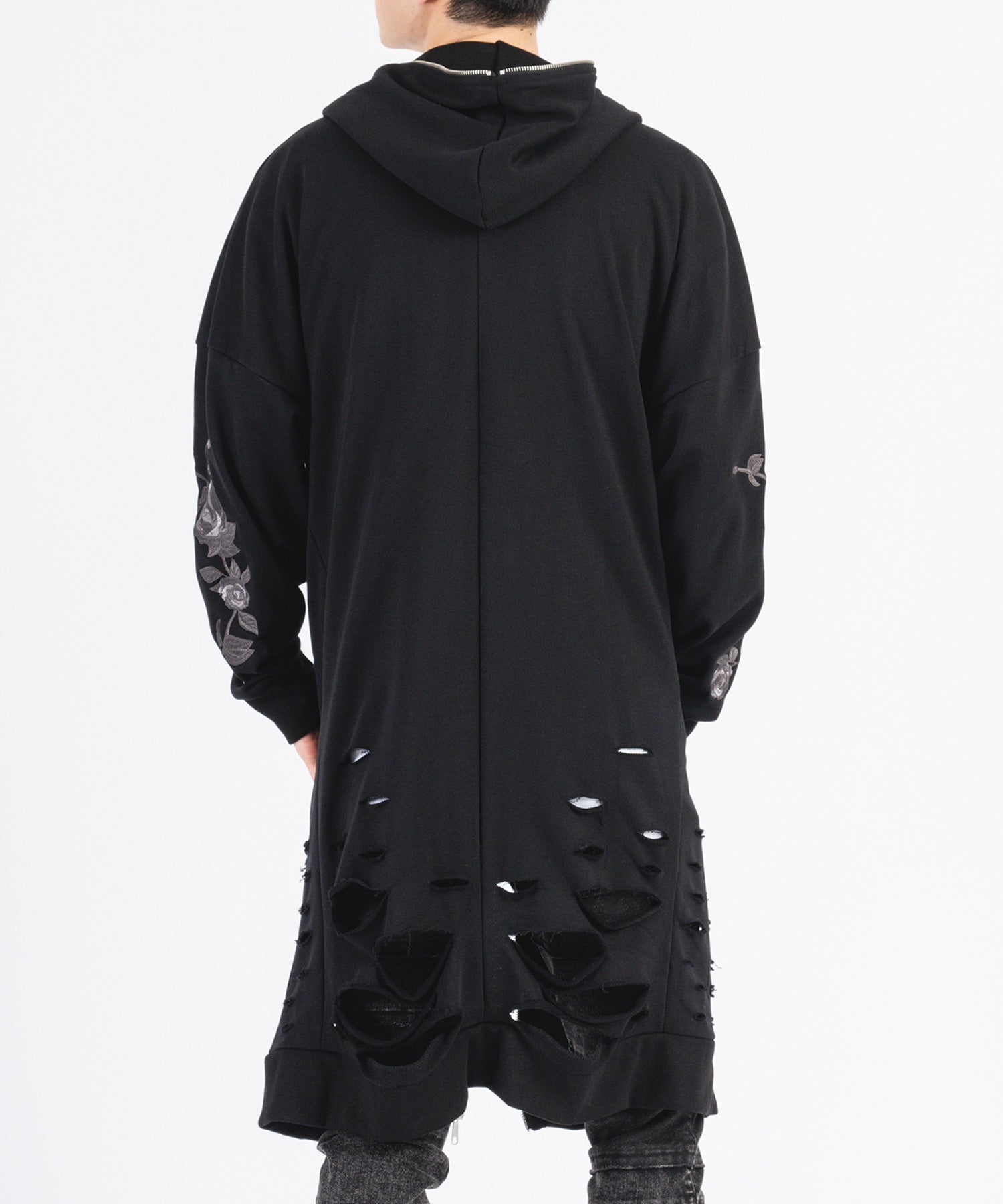 裾部分は敢えて施したダメージ感が男らしさも演出し、袖の薔薇の刺繍がアクセントになっています。