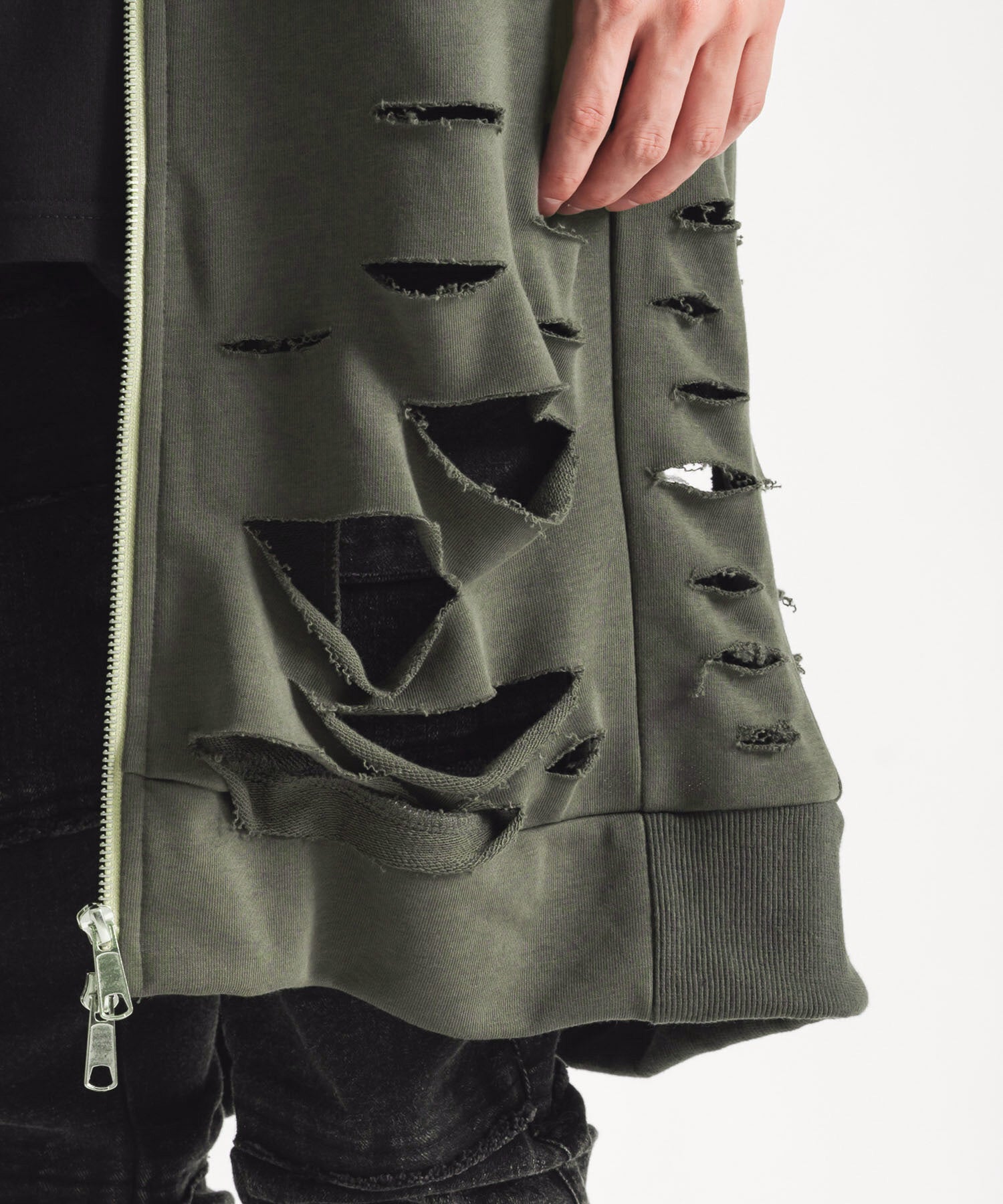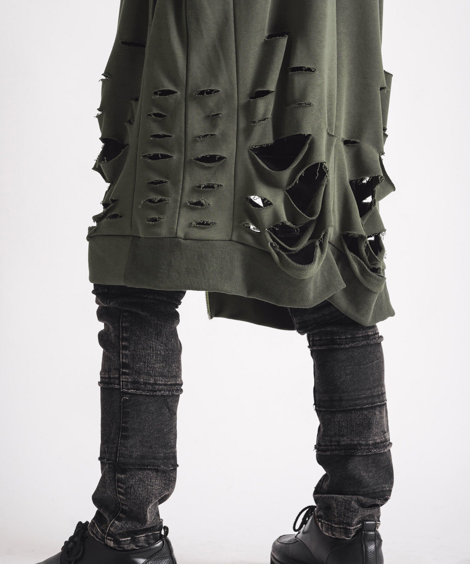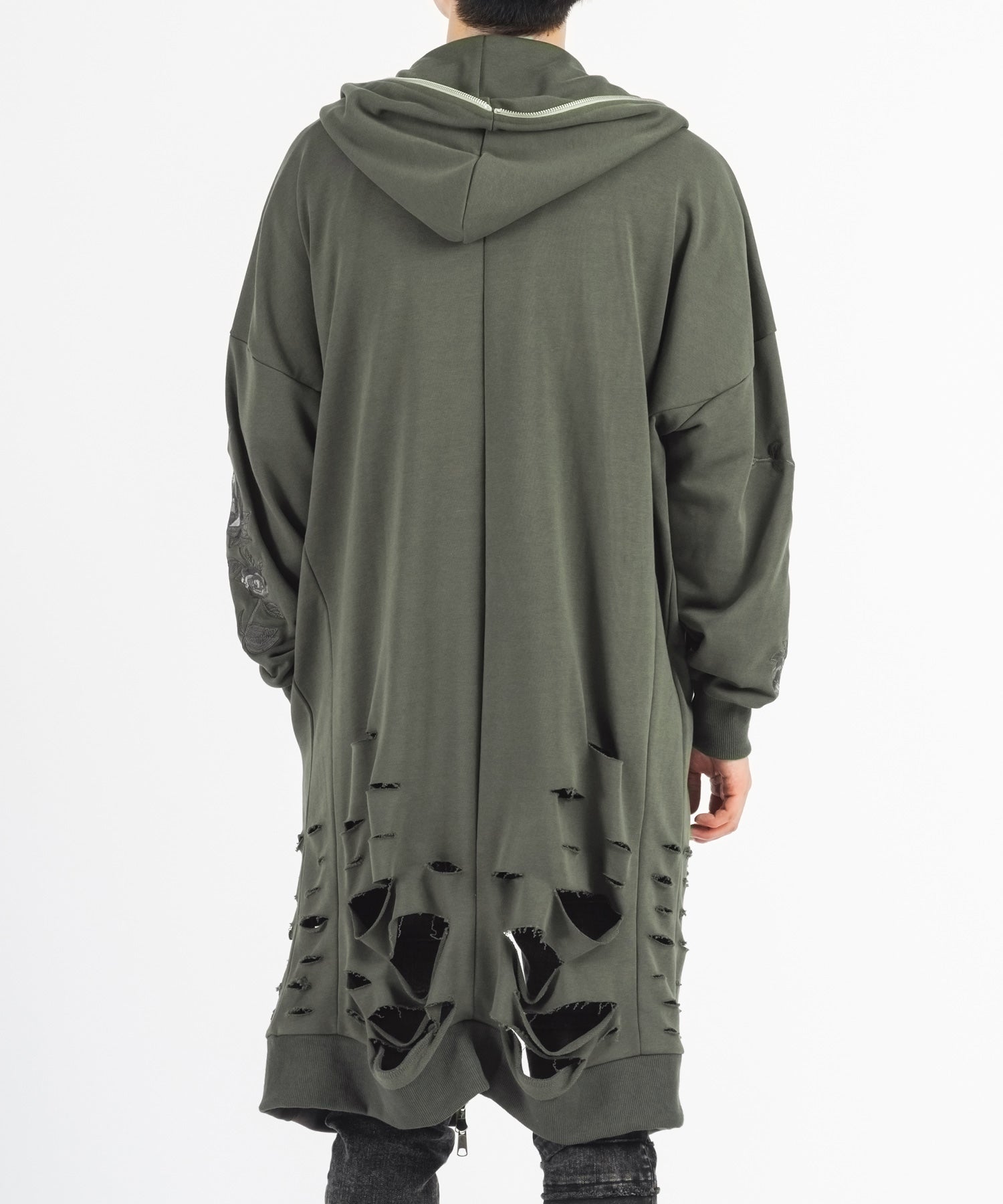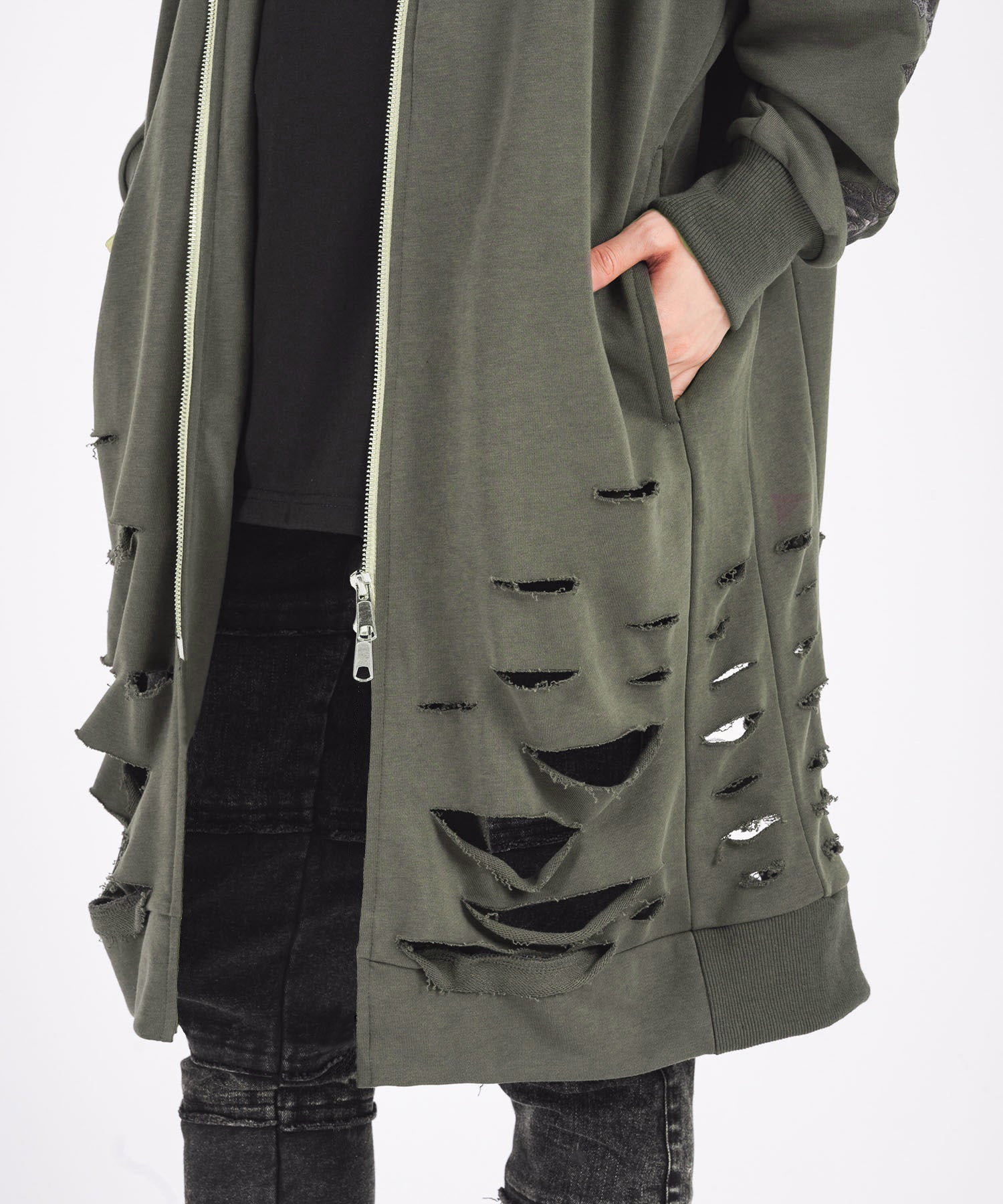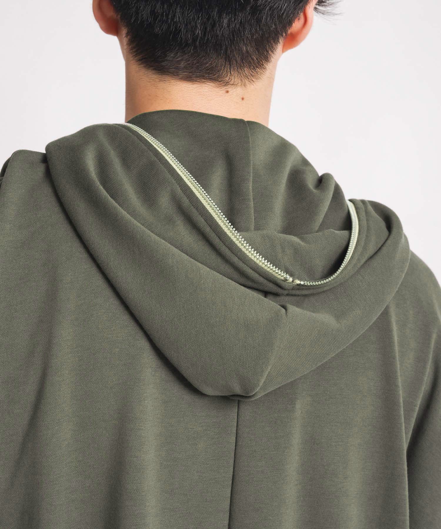 コートの様にアウターとして羽織れる丈長のジップパーカーです。