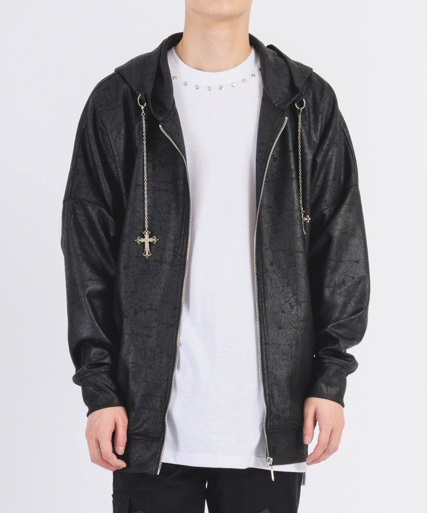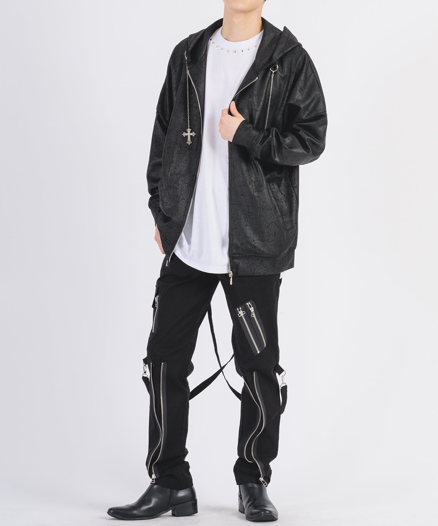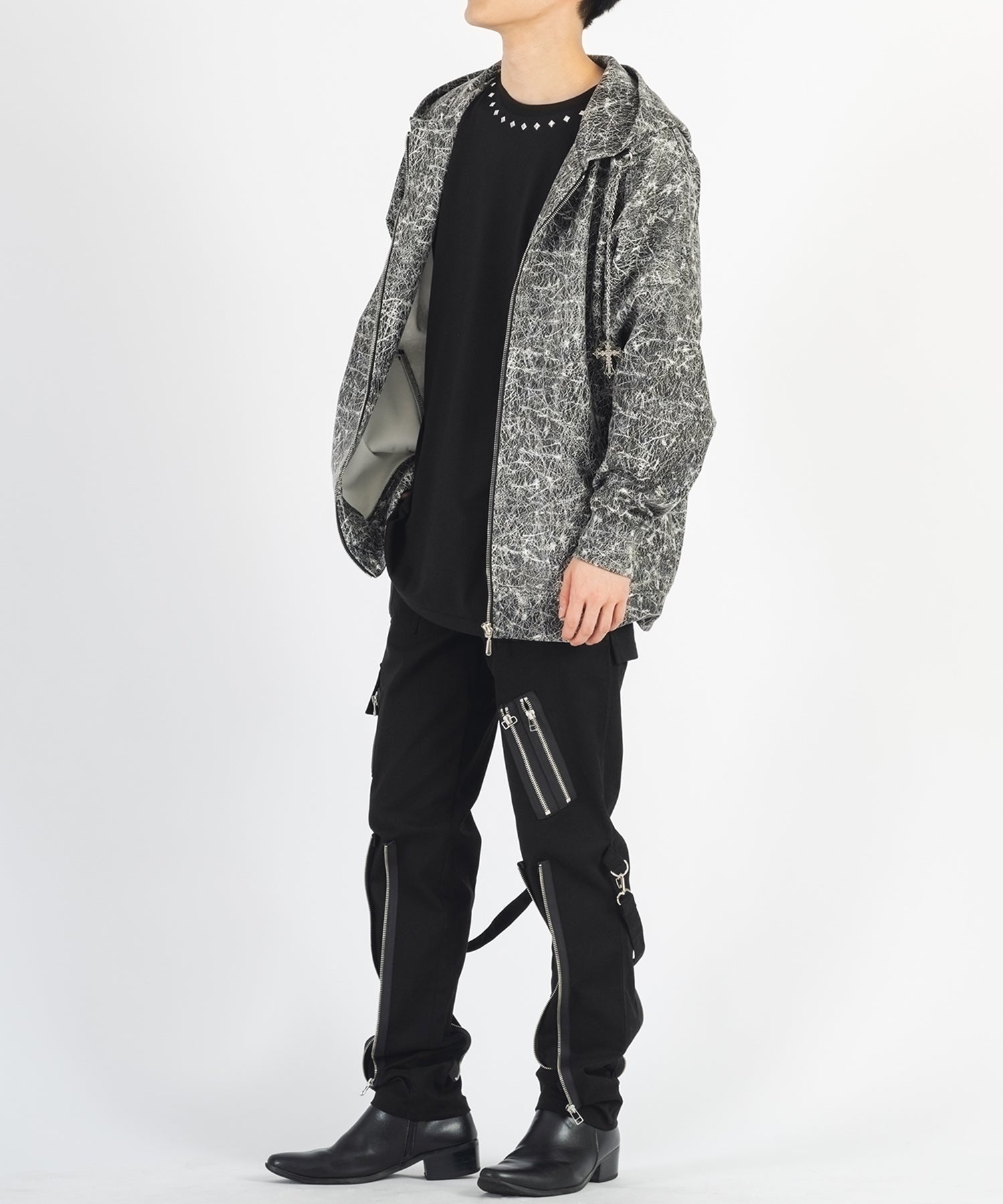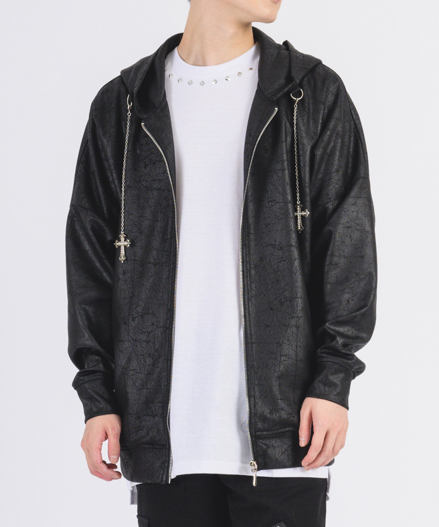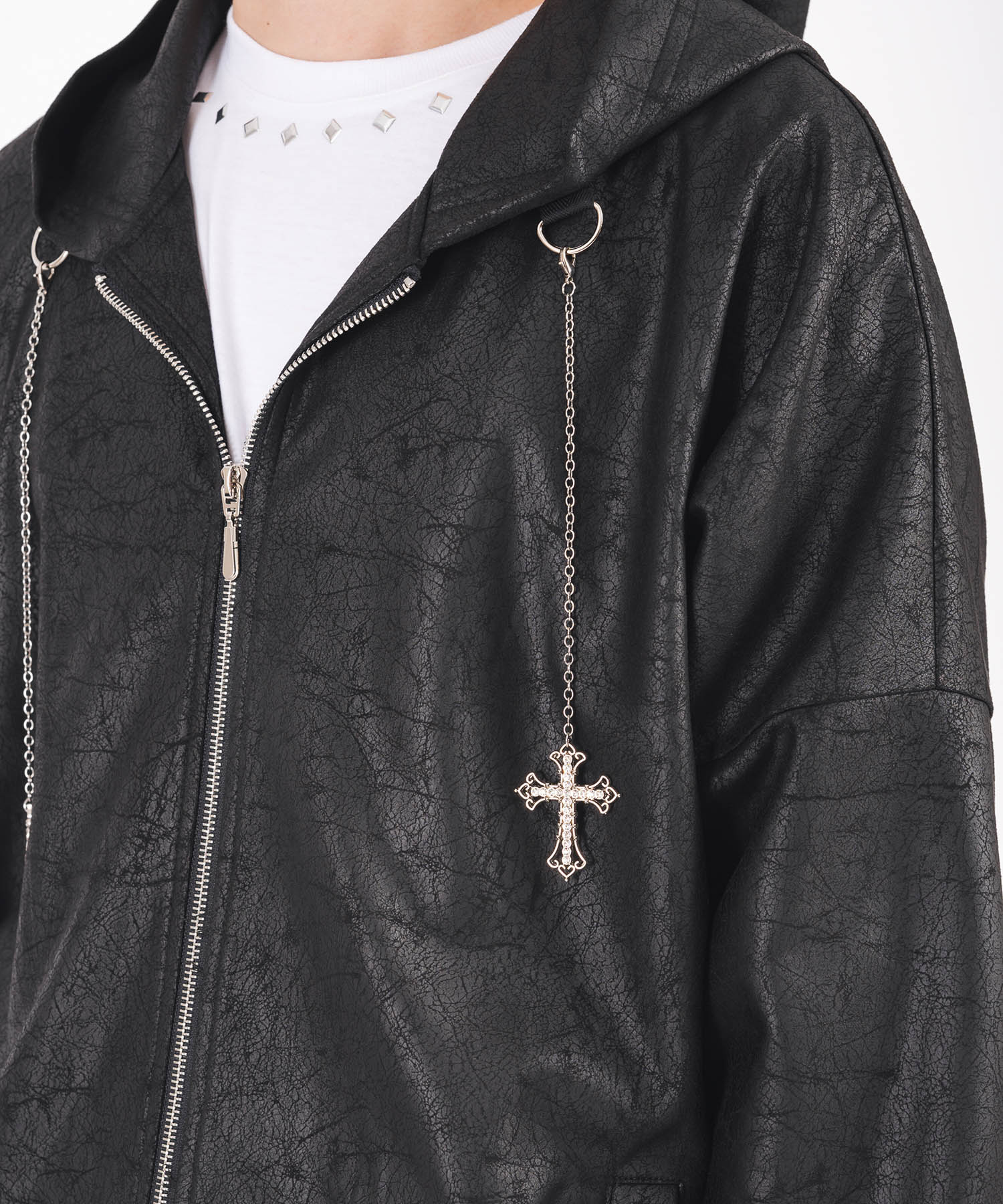 表面のプリントが印象的で、ドローコードに代えてクロスが付属したチェーンが胸元を印象的に飾ります。