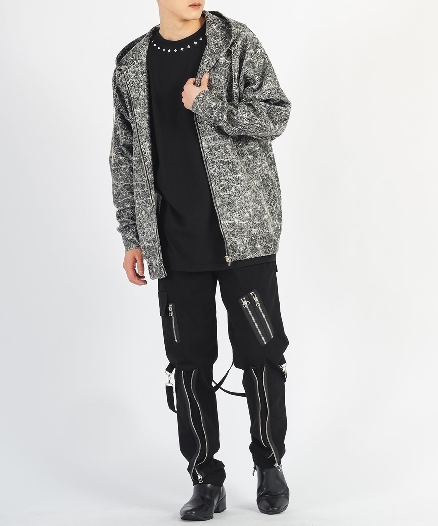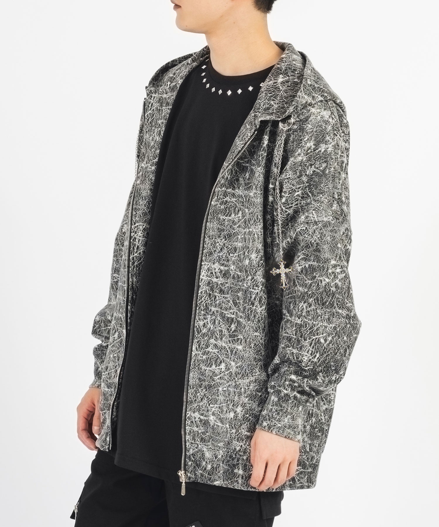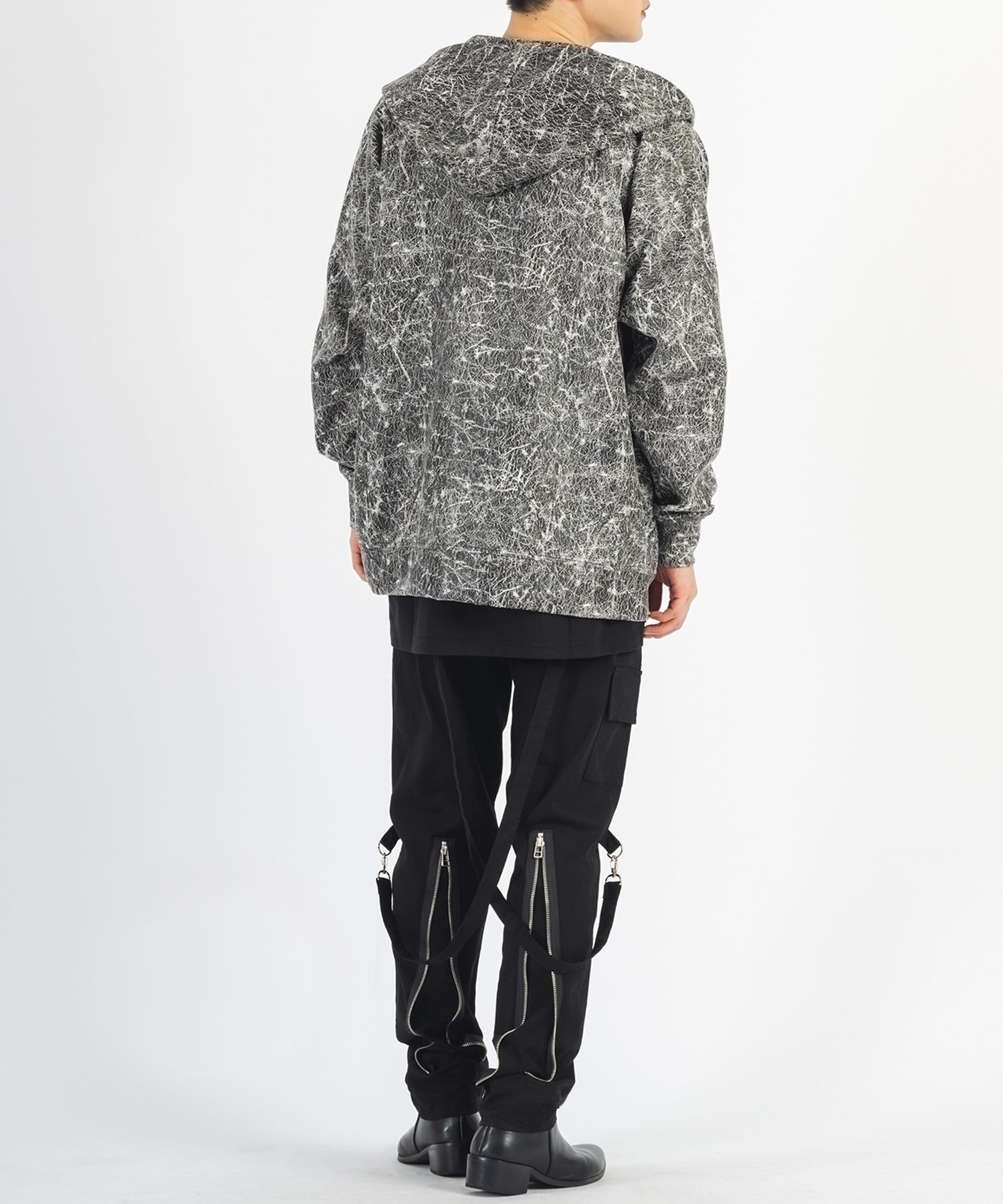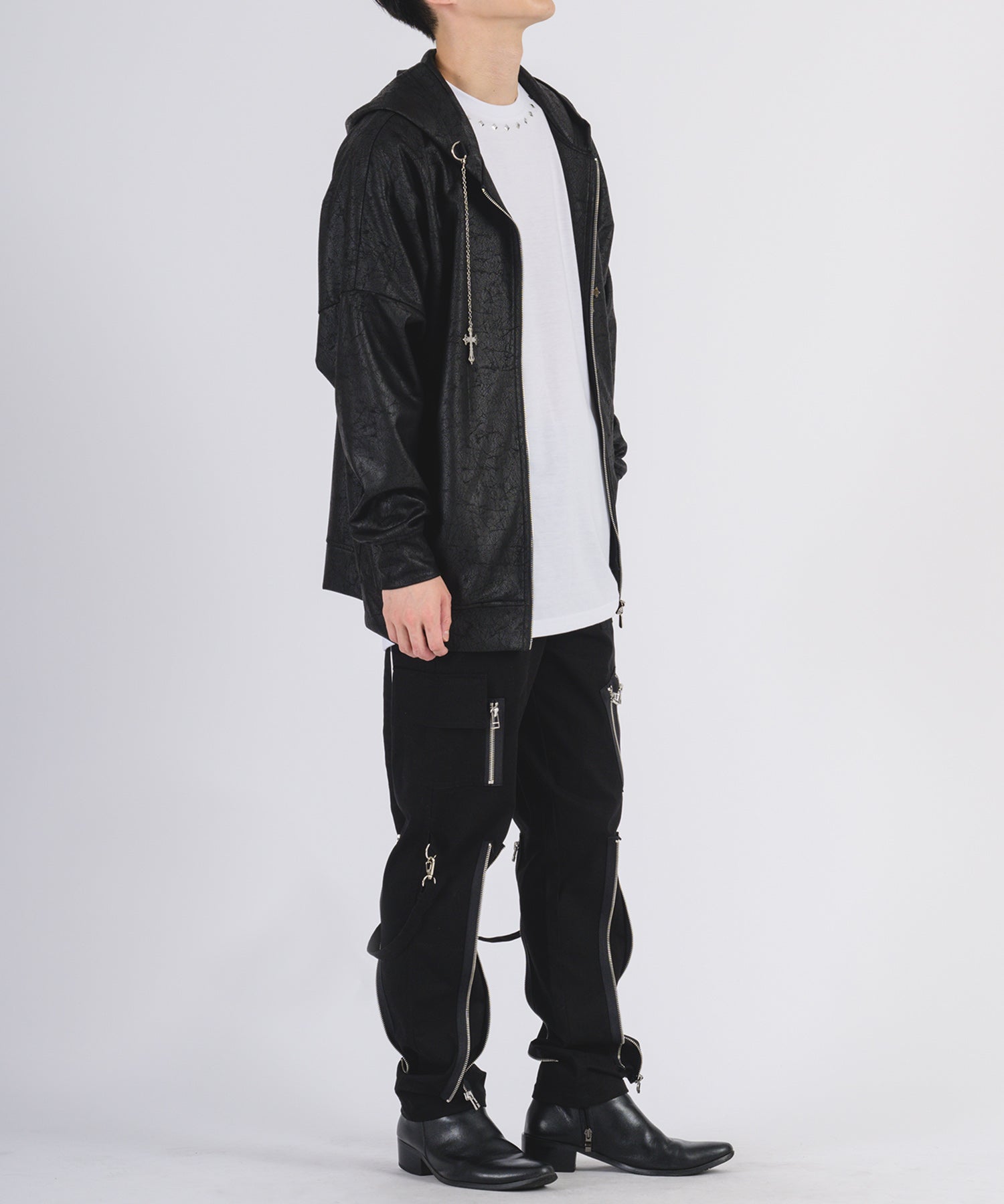 表面のプリントが印象的で、ドローコードに代えてクロスが付属したチェーンが胸元を印象的に飾ります。