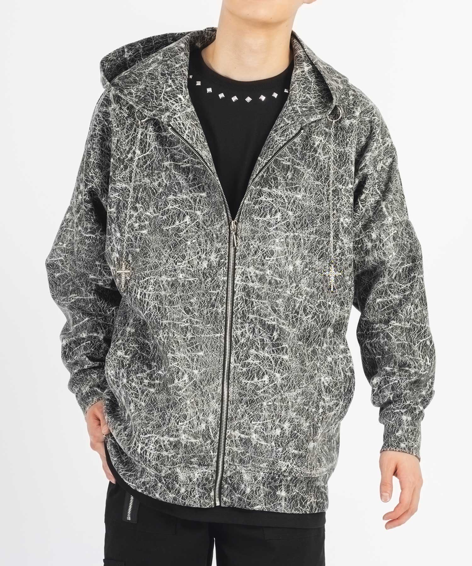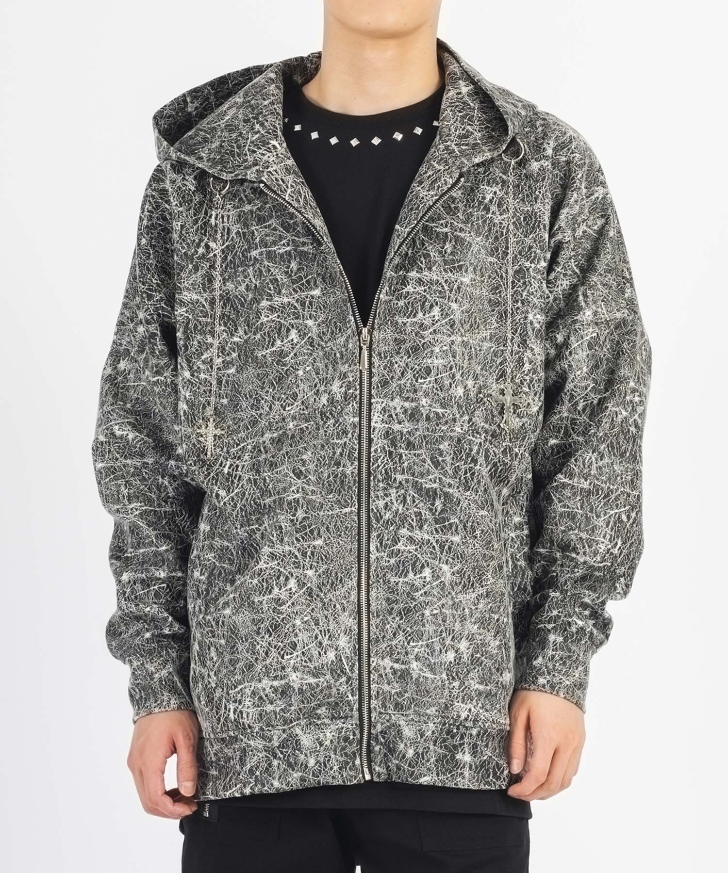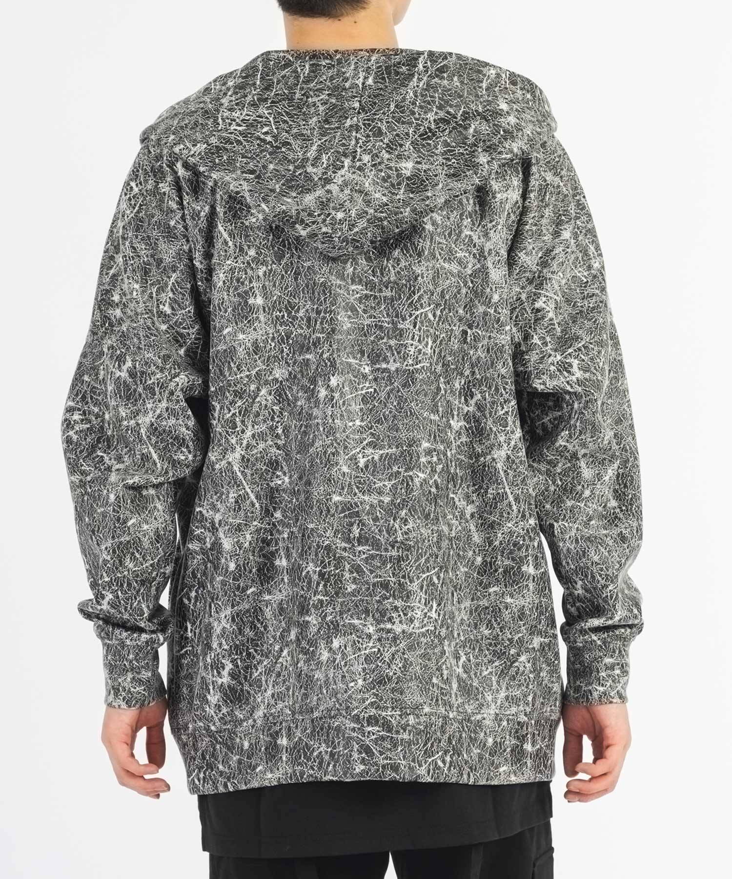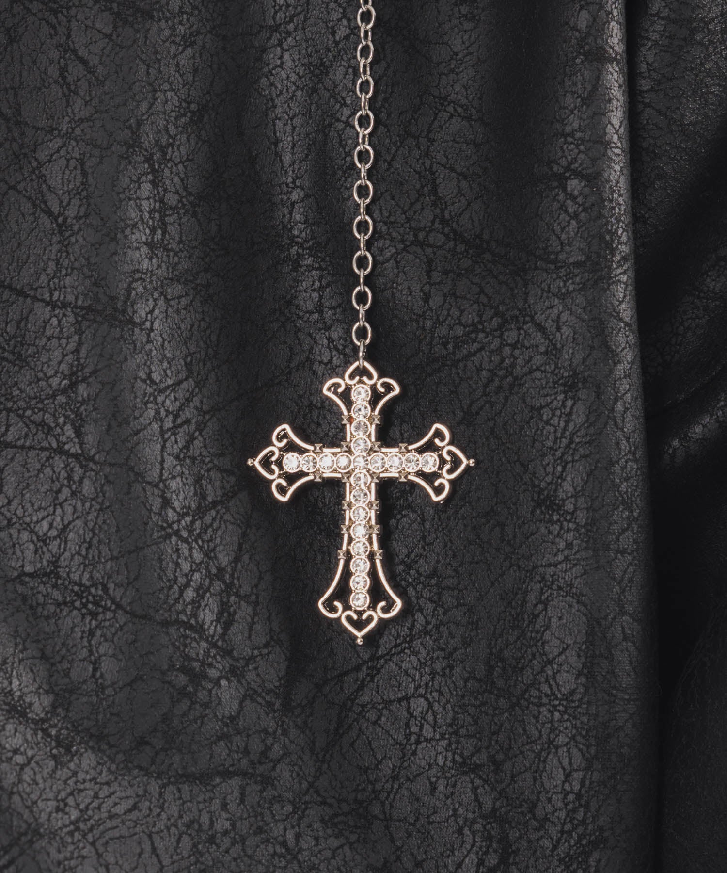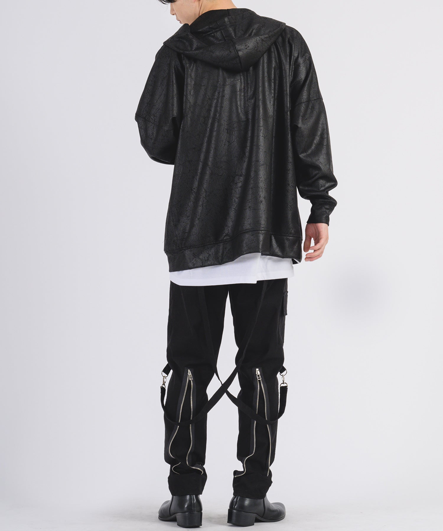 表面のプリントが印象的で、ドローコードに代えてクロスが付属したチェーンが胸元を印象的に飾ります。