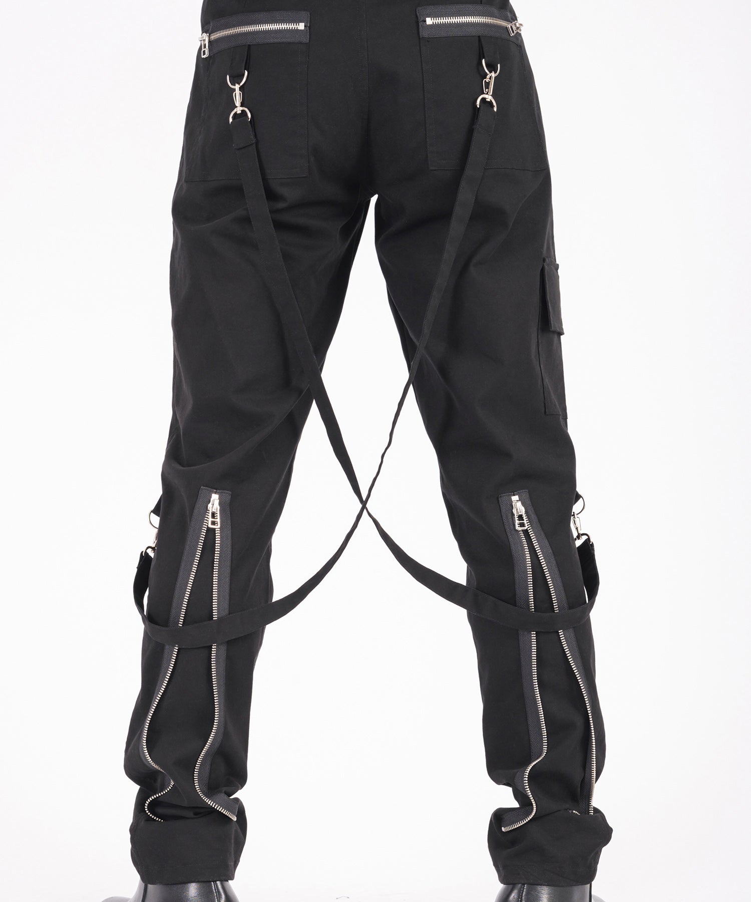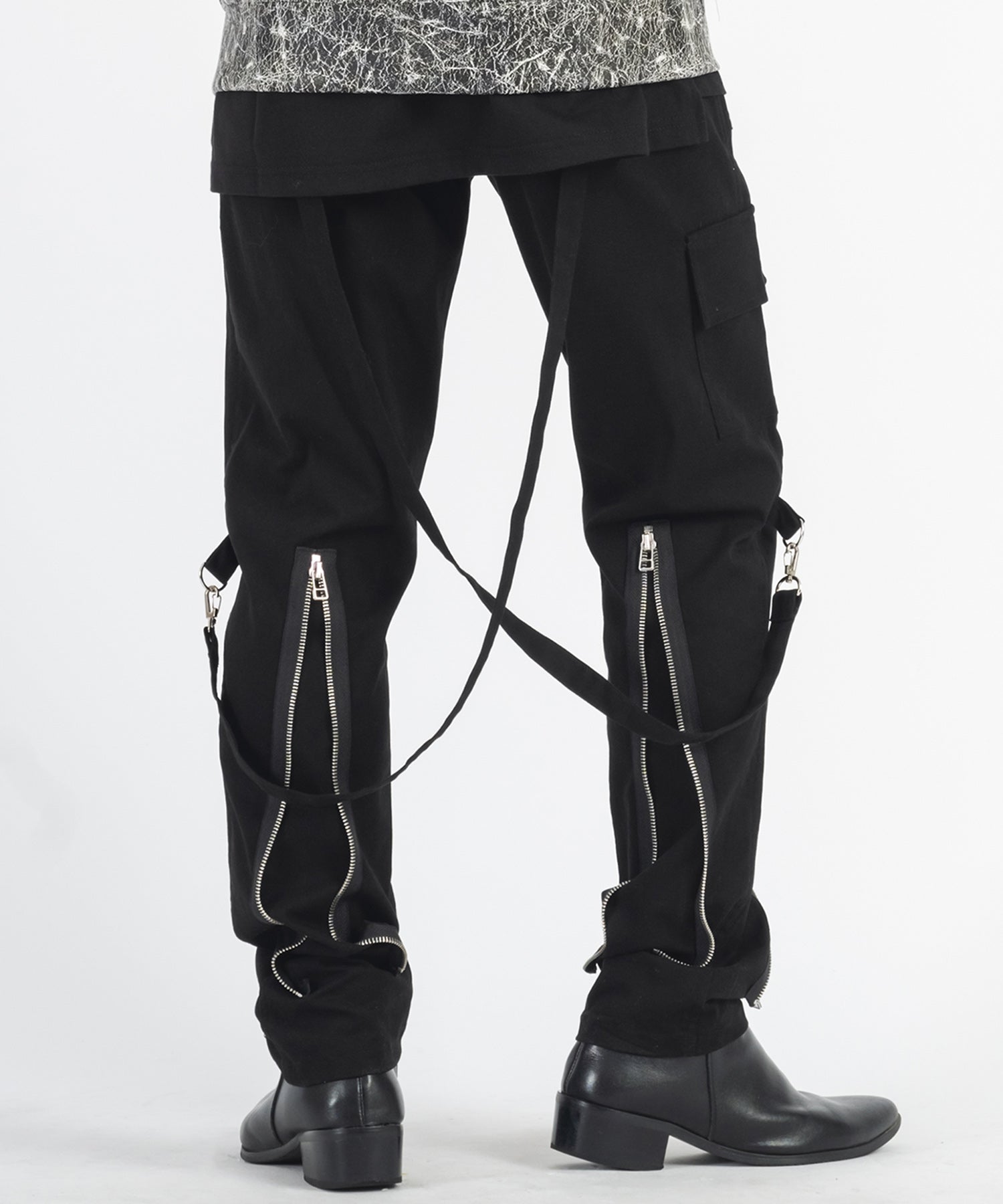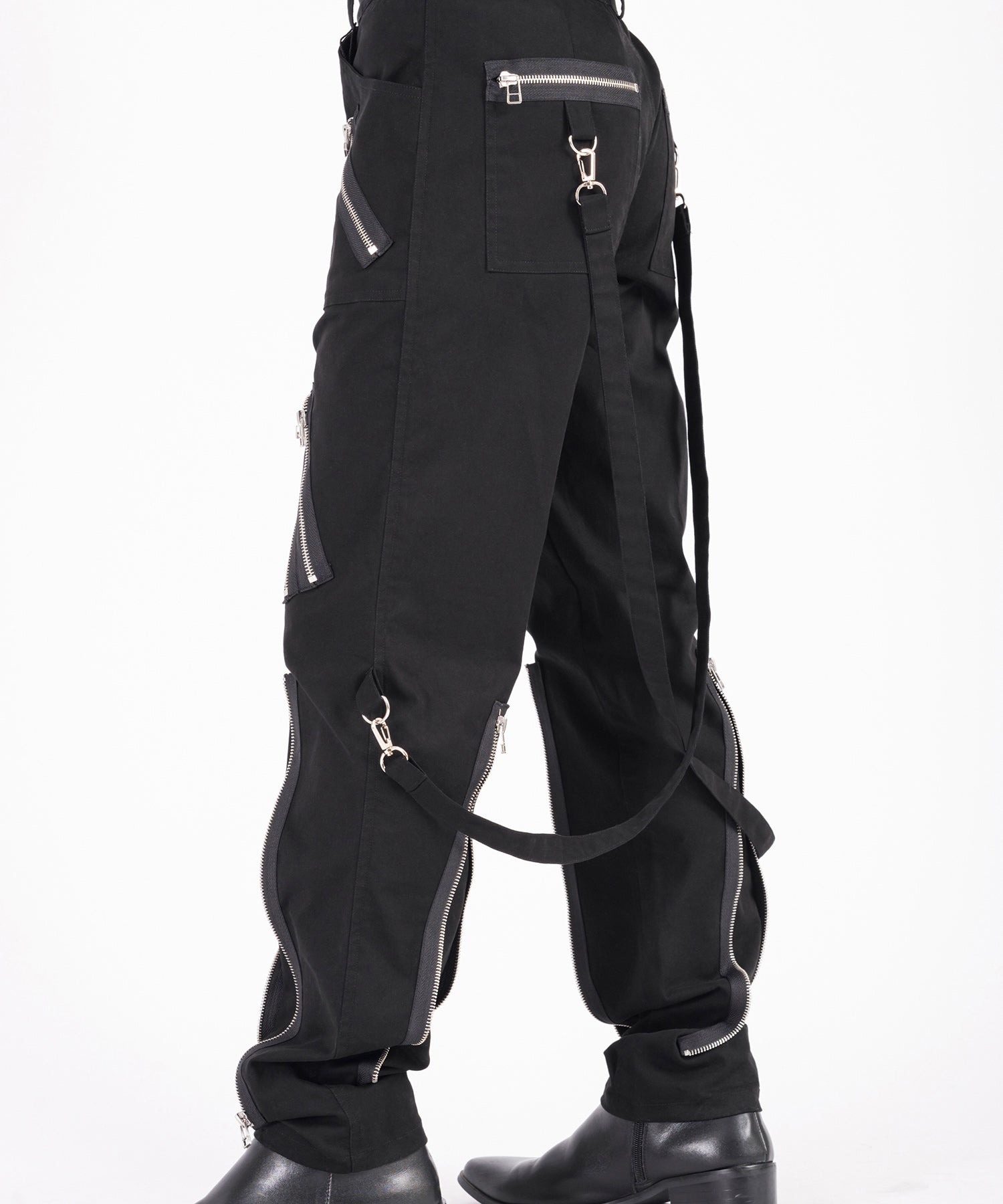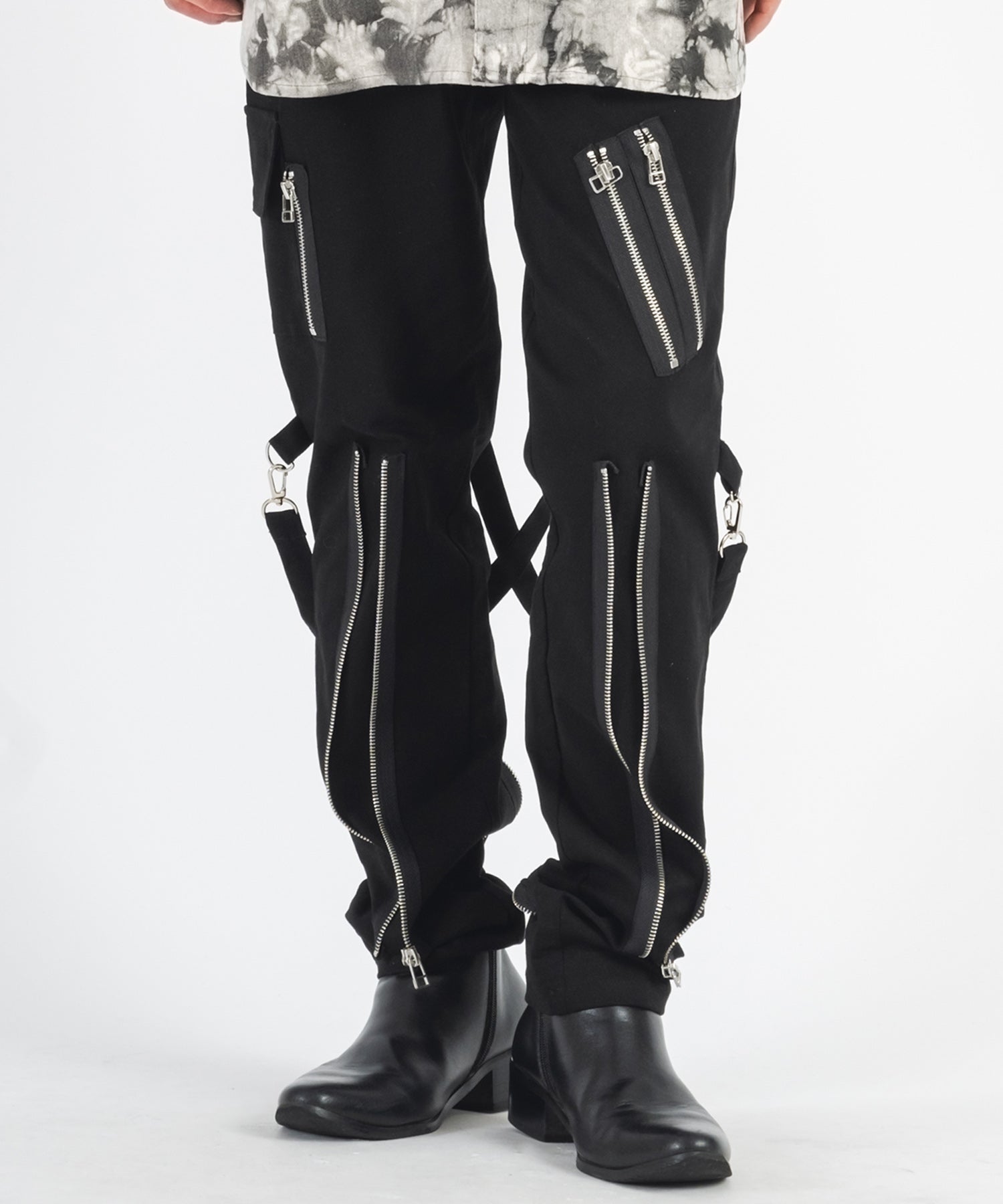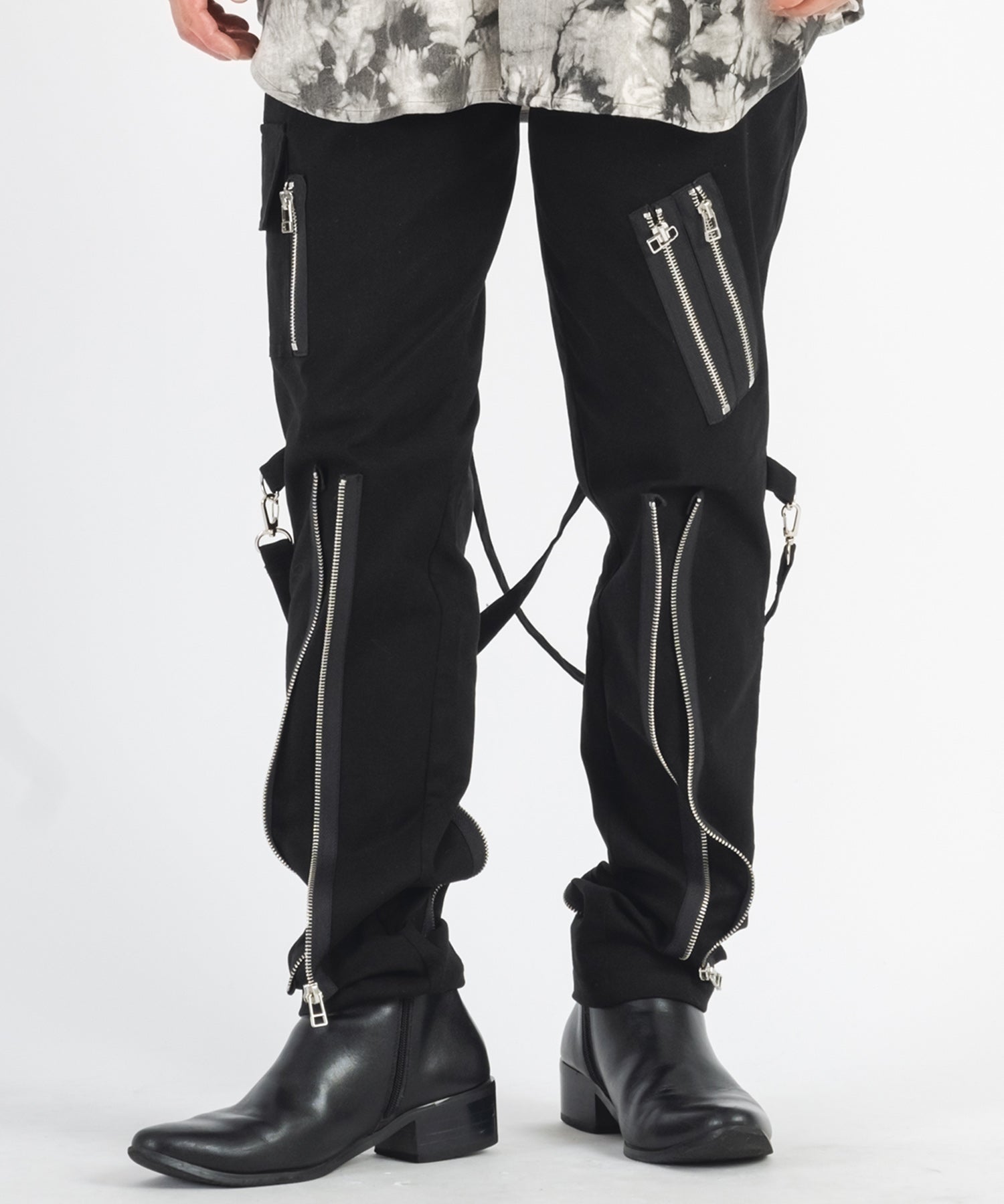 バックに垂れ下がる長いベルトやマルチに配置されたファスナーがボンテージを象徴するデザインです。