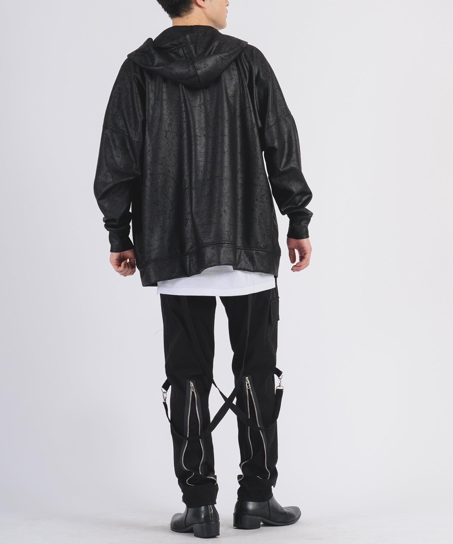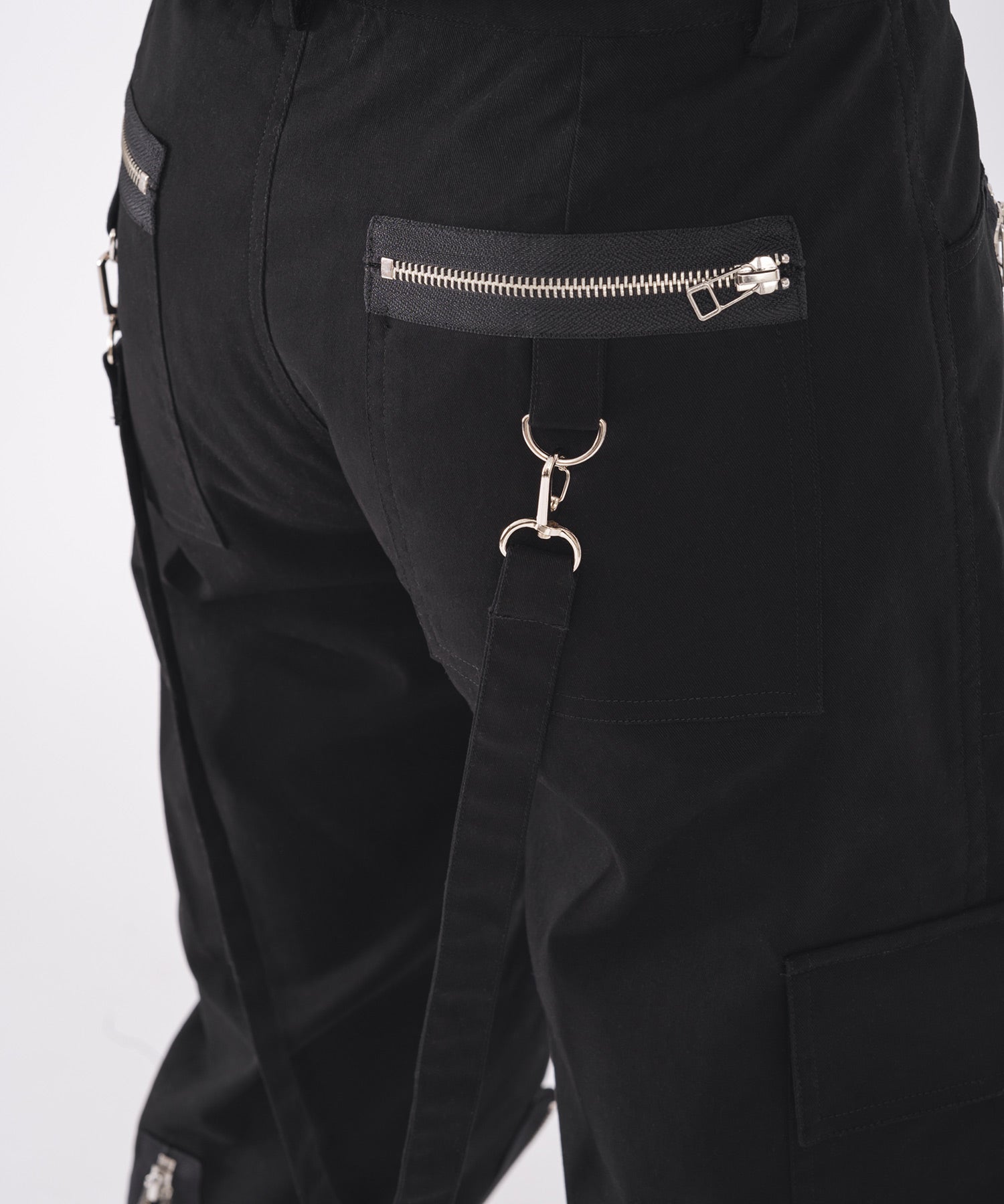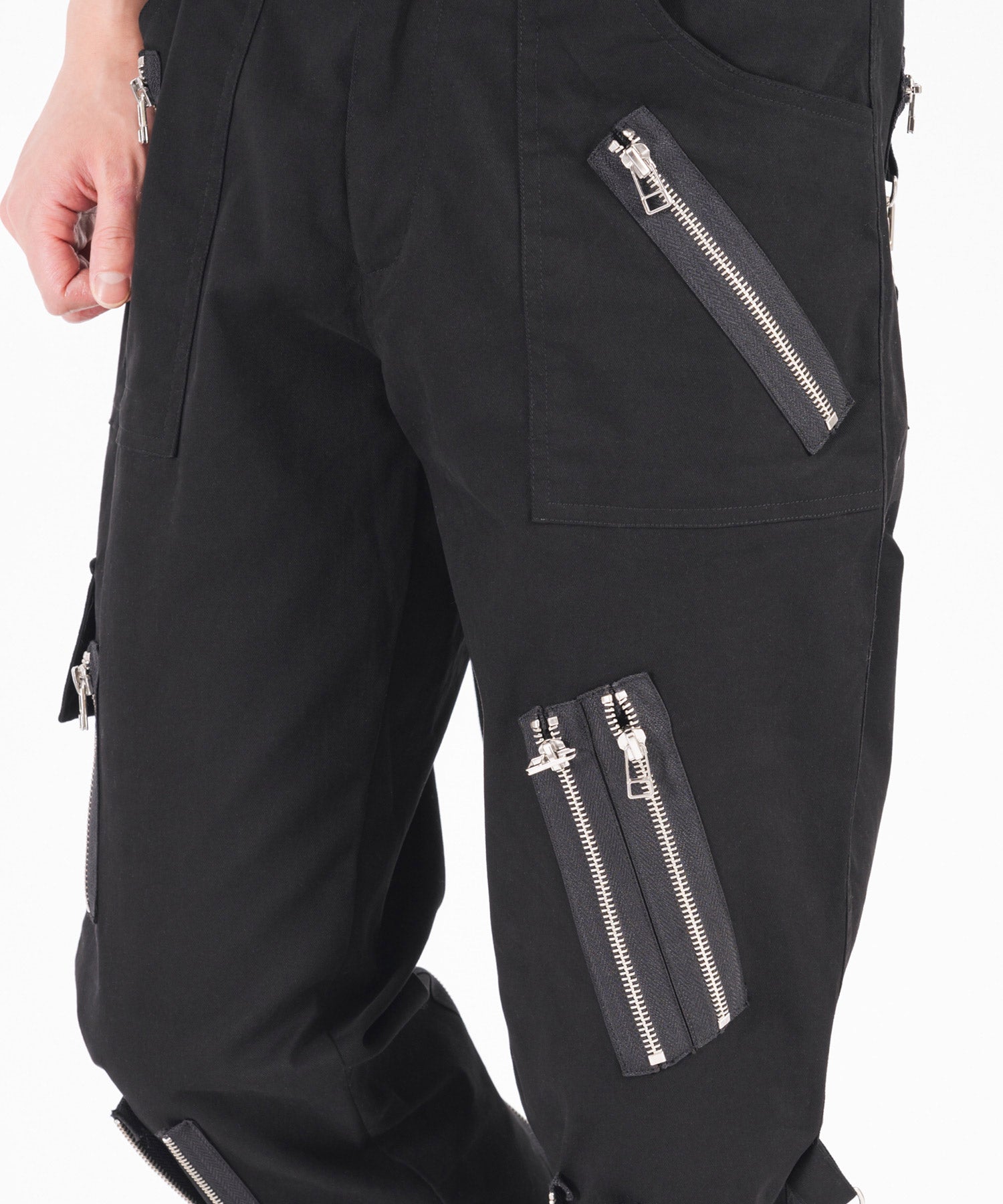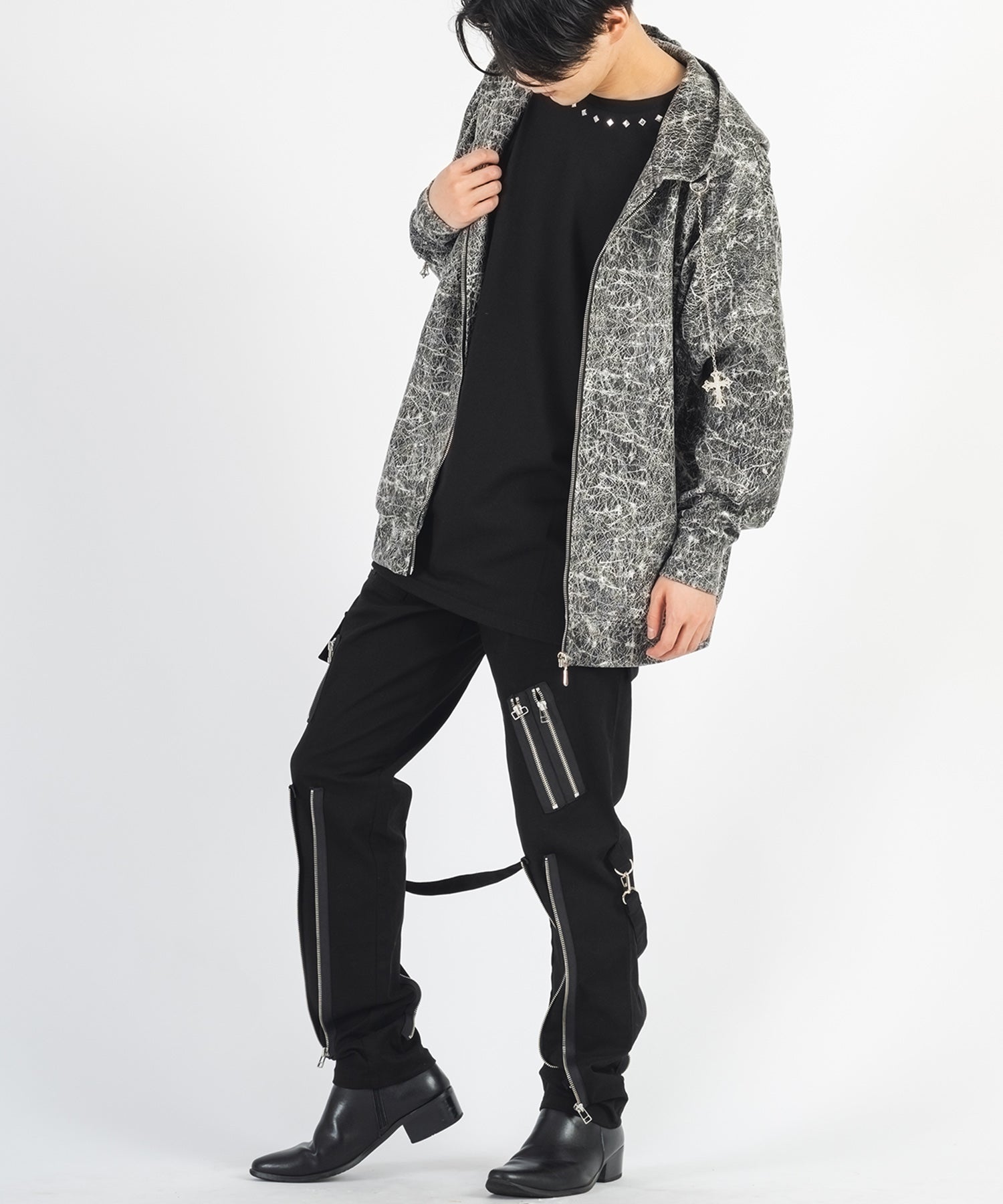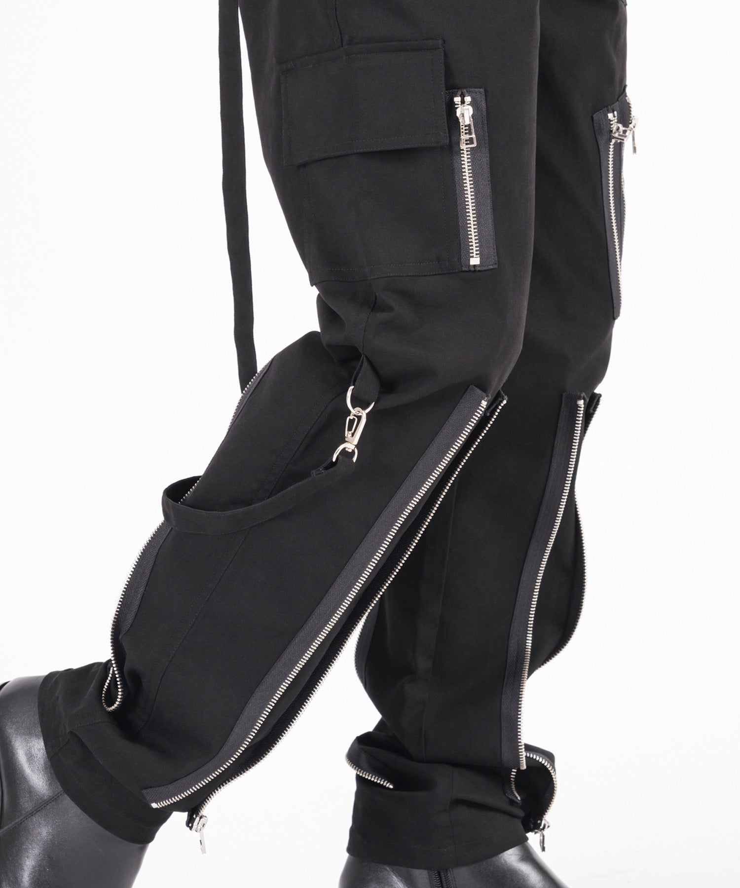 バックに垂れ下がる長いベルトやマルチに配置されたファスナーがボンテージを象徴するデザインです。