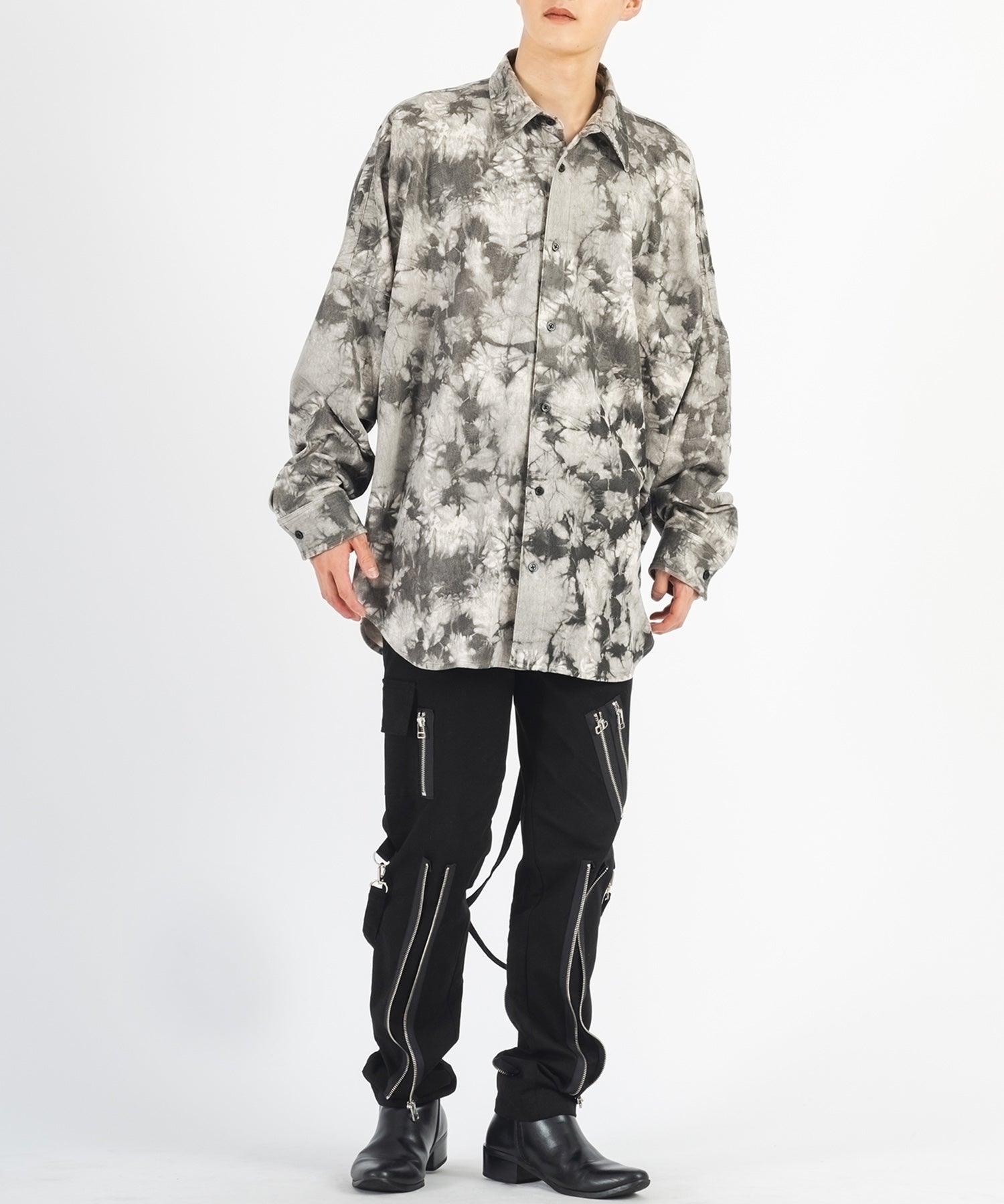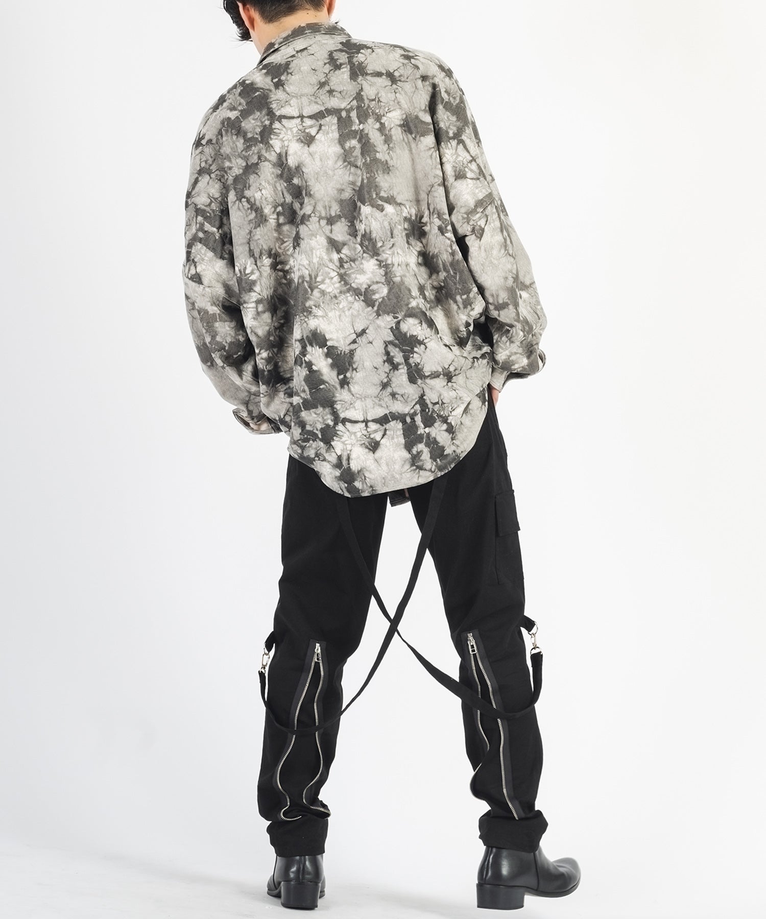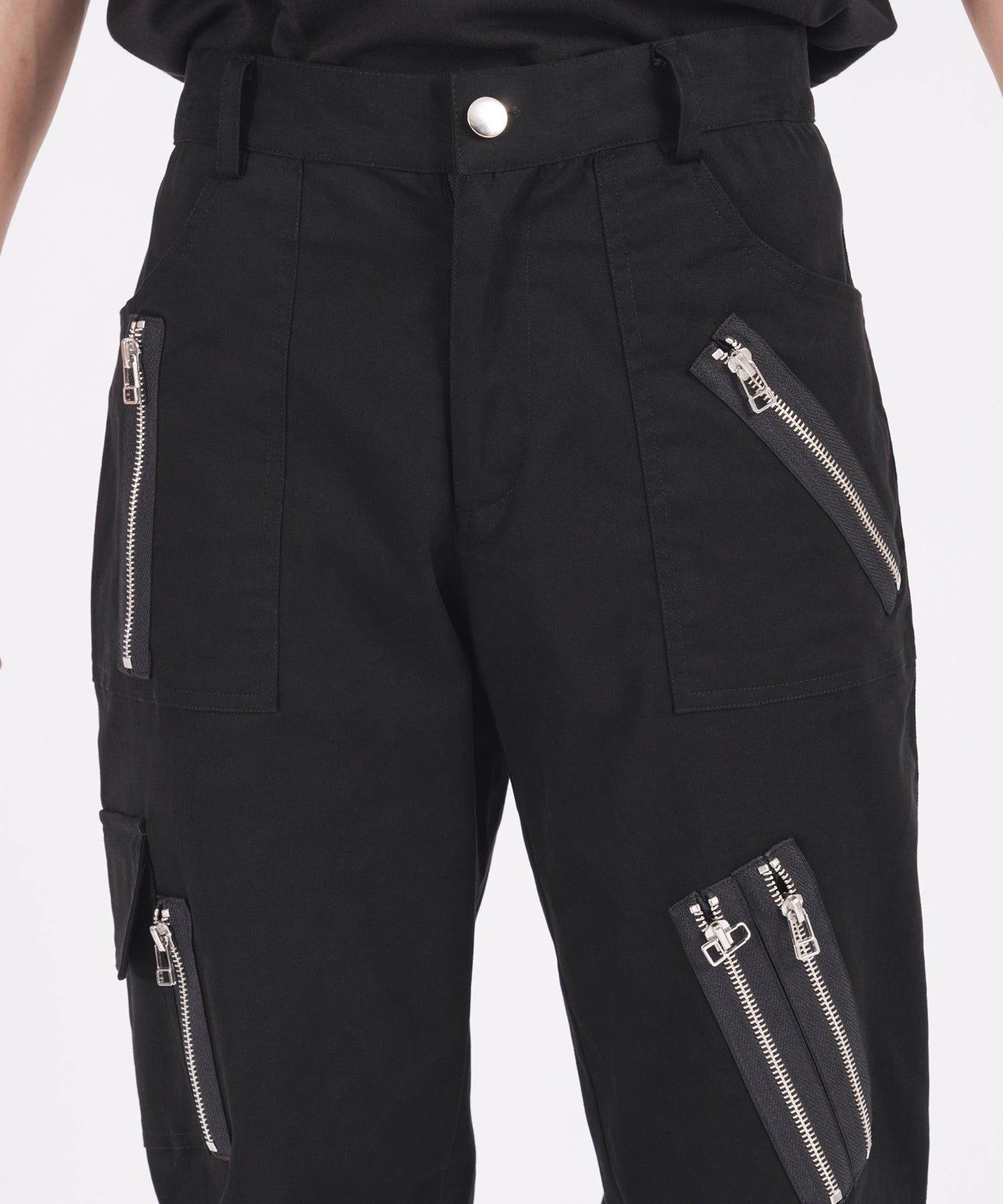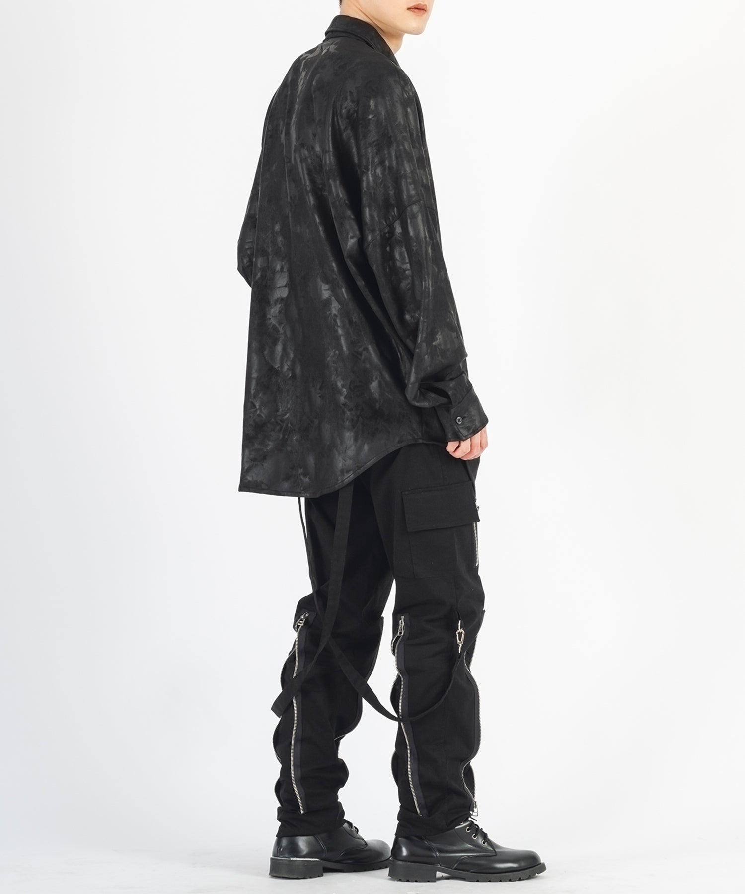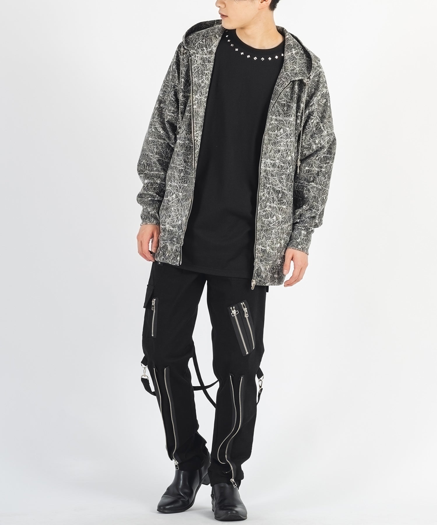 バックに垂れ下がる長いベルトやマルチに配置されたファスナーがボンテージを象徴するデザインです。