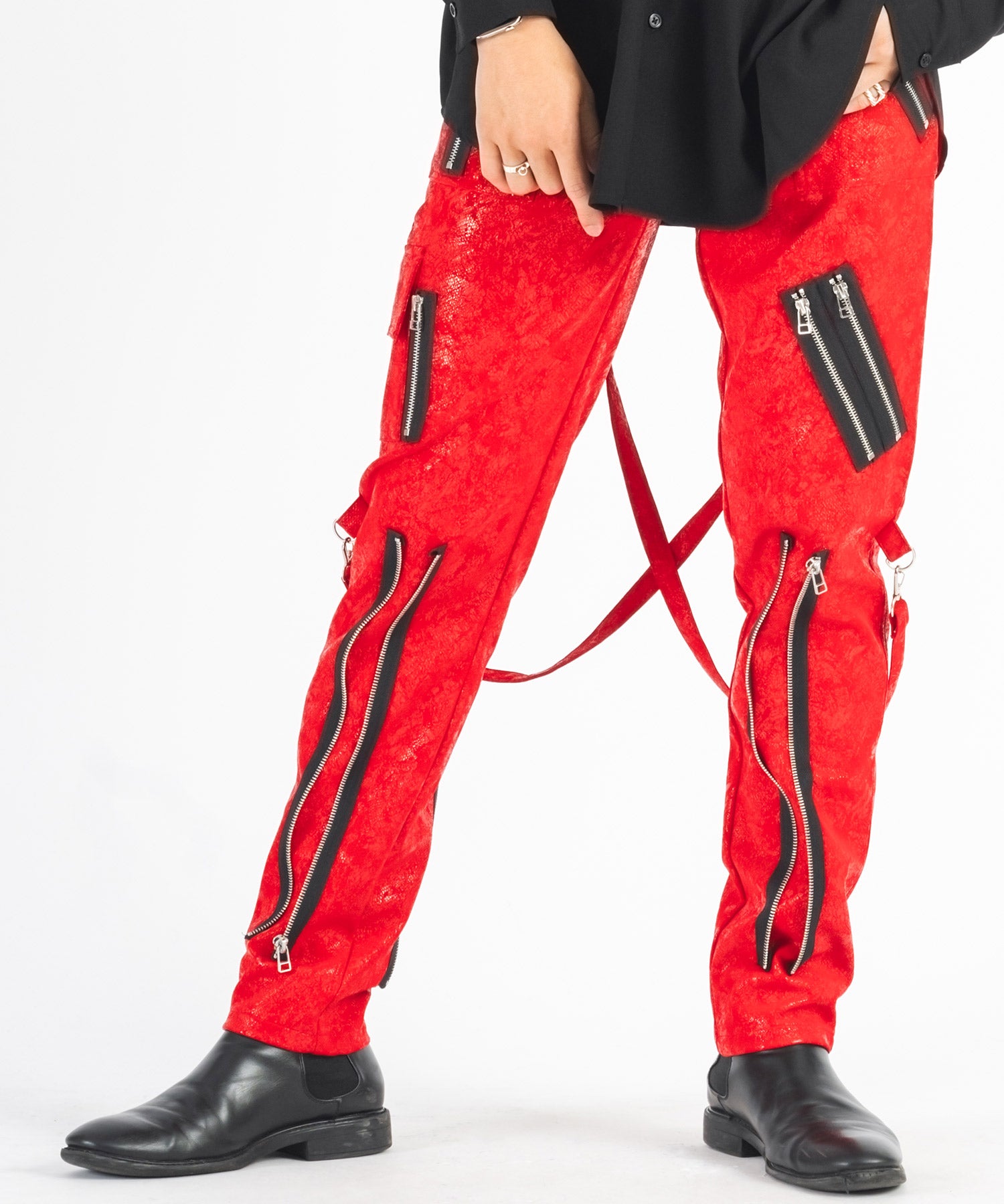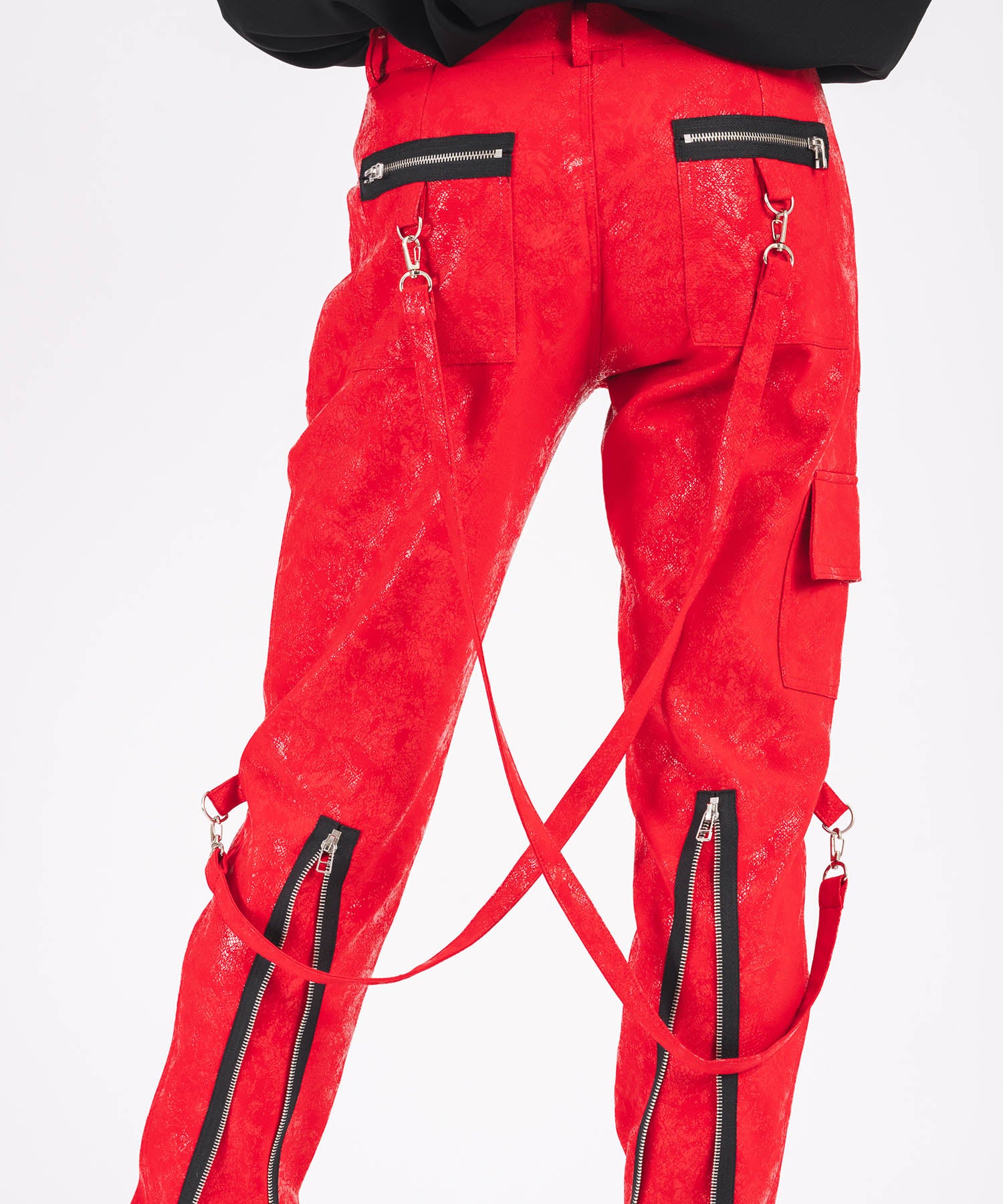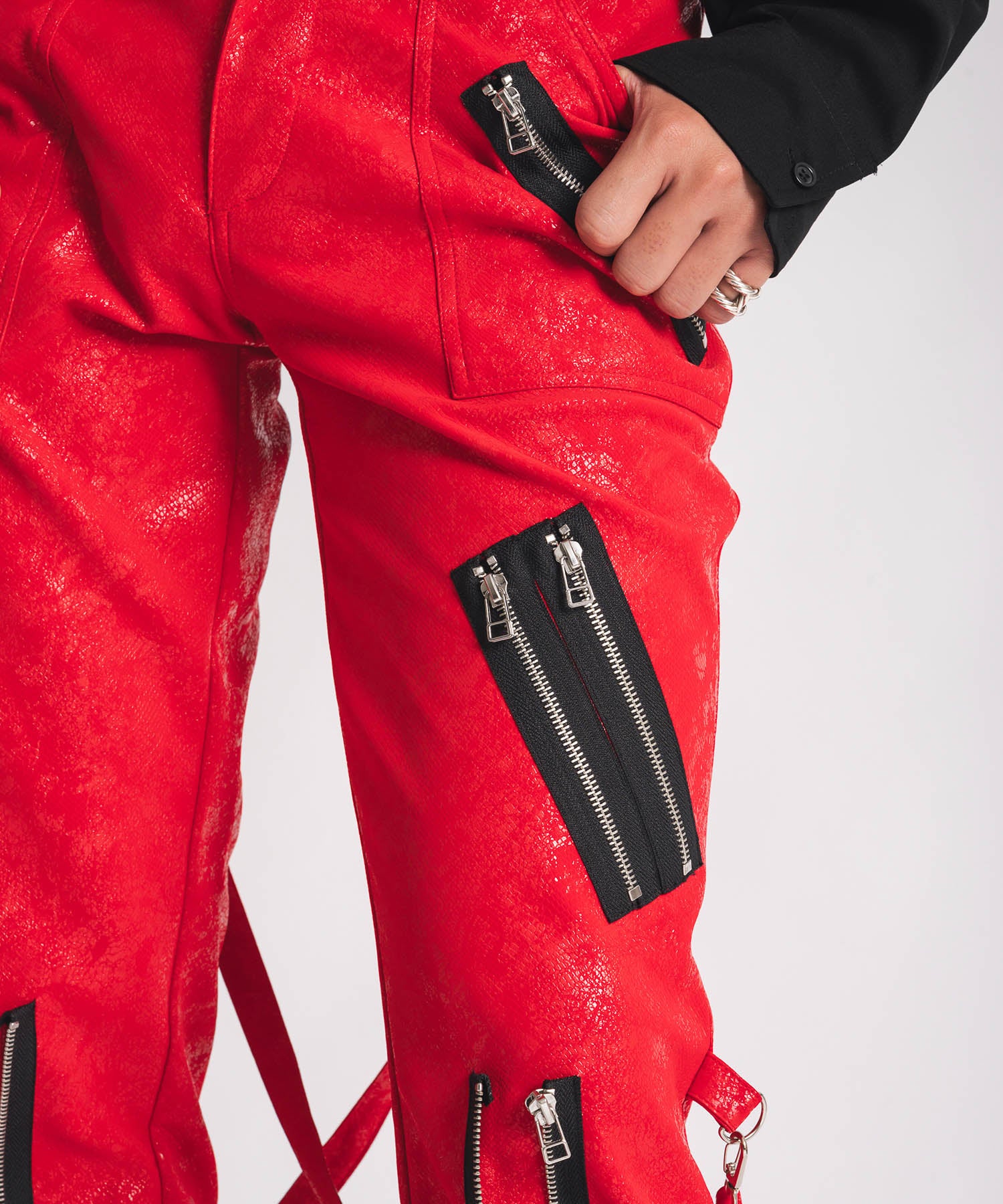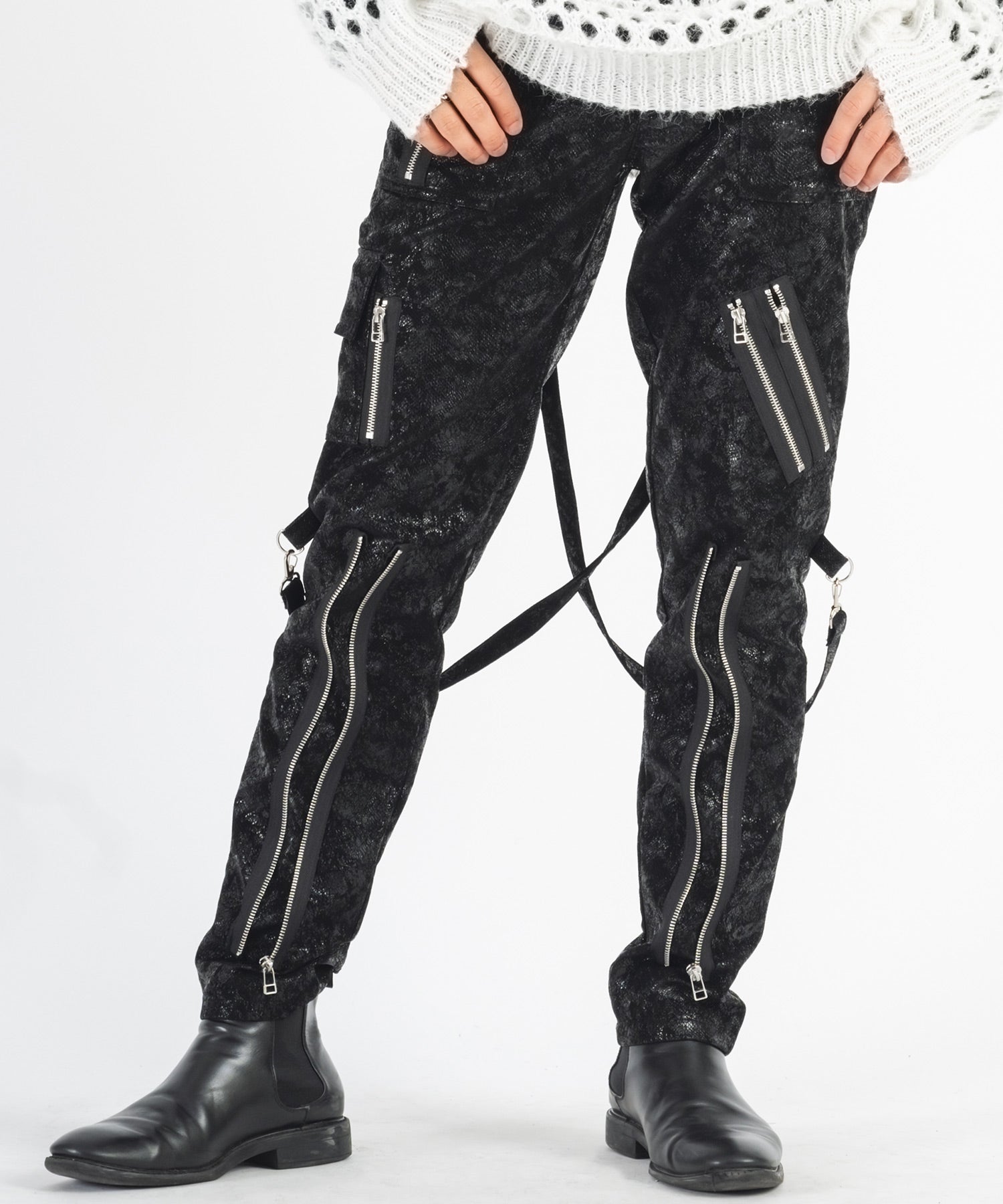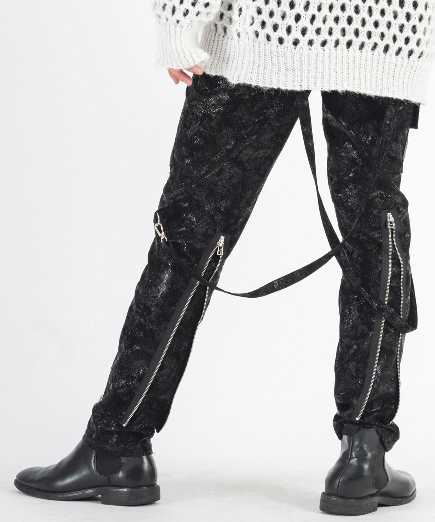 レザー調の素材とマッチしたタイトシルエットのボンテージパンツです。