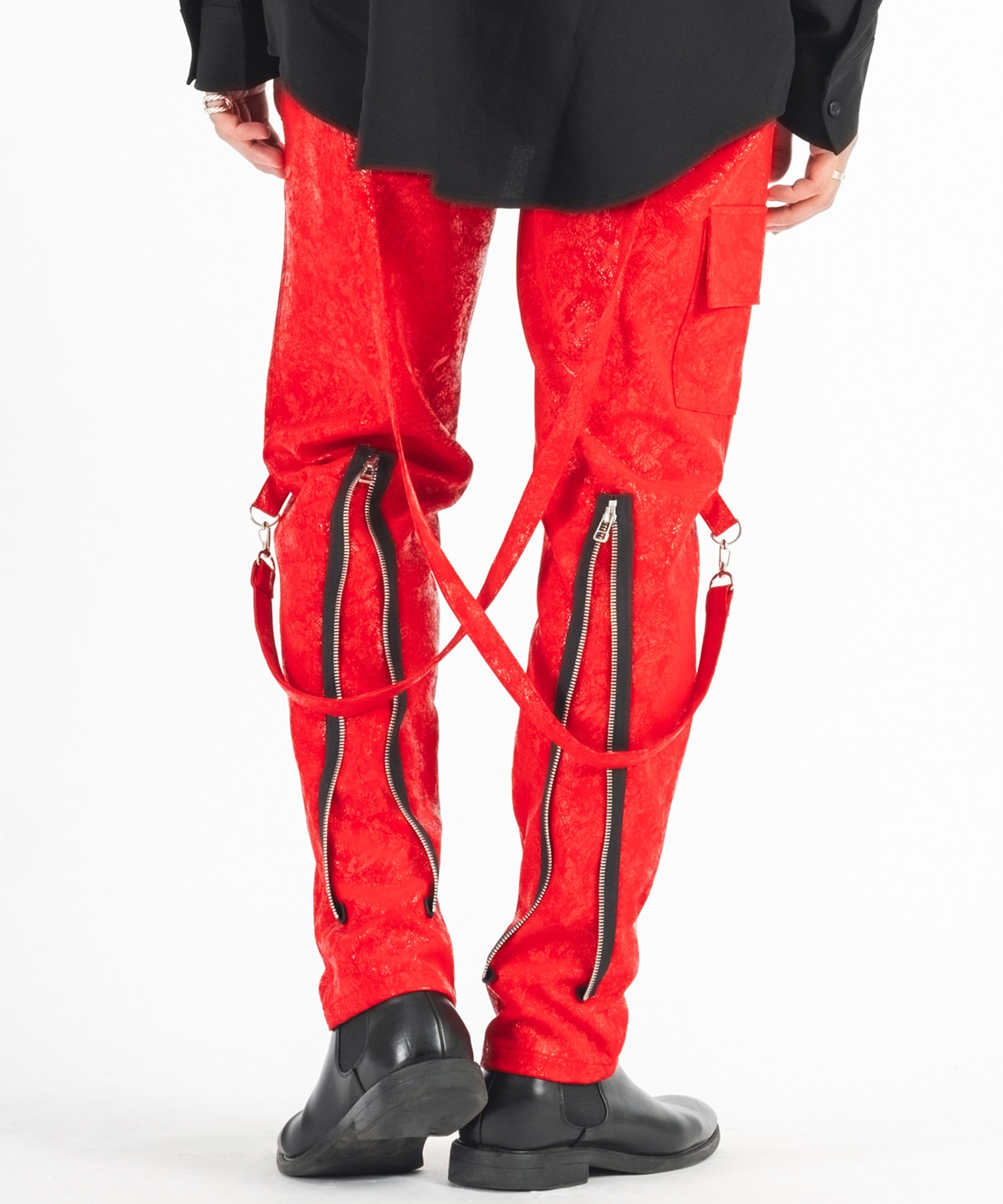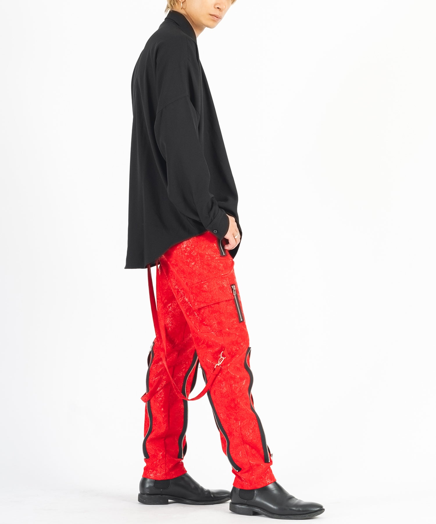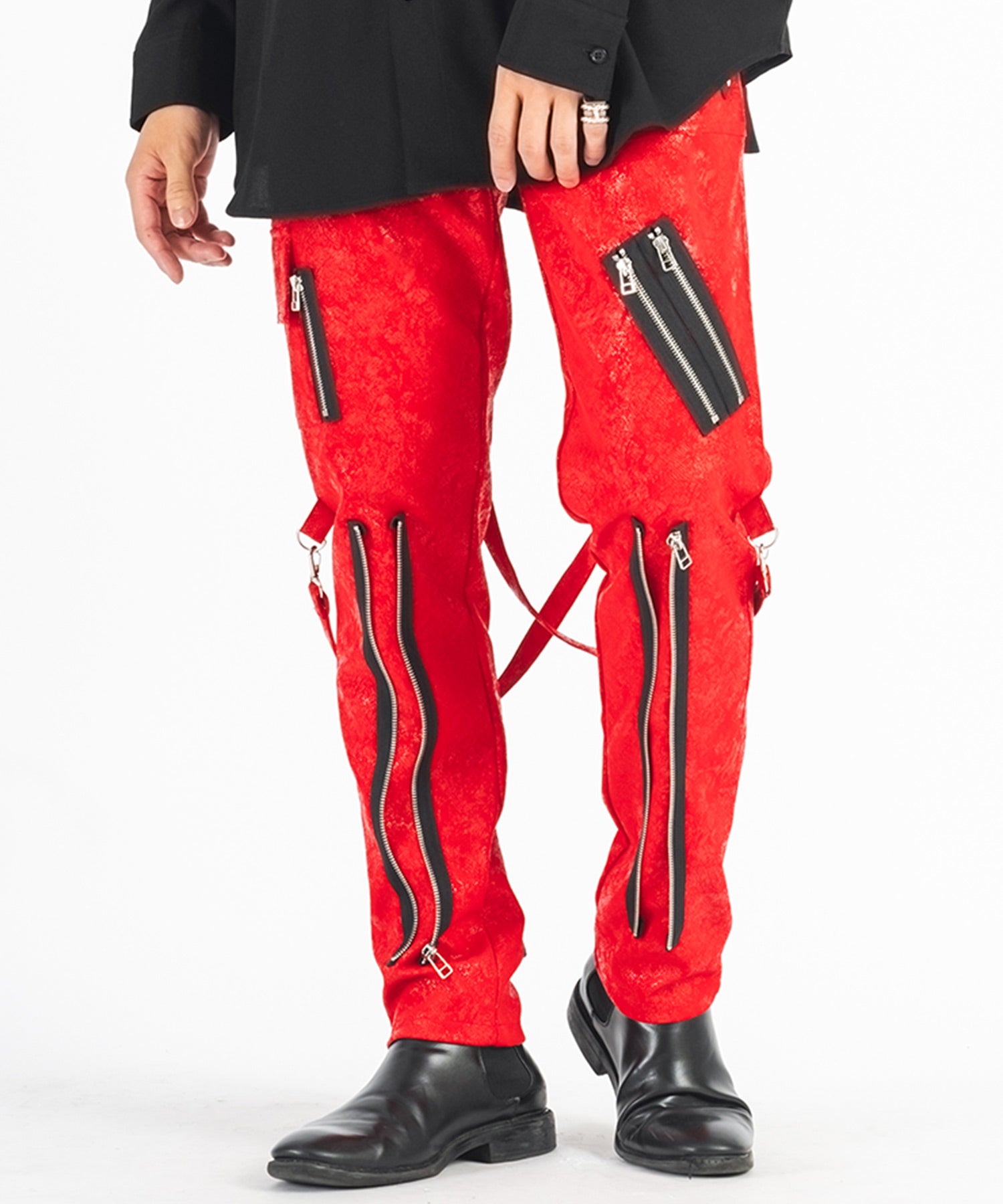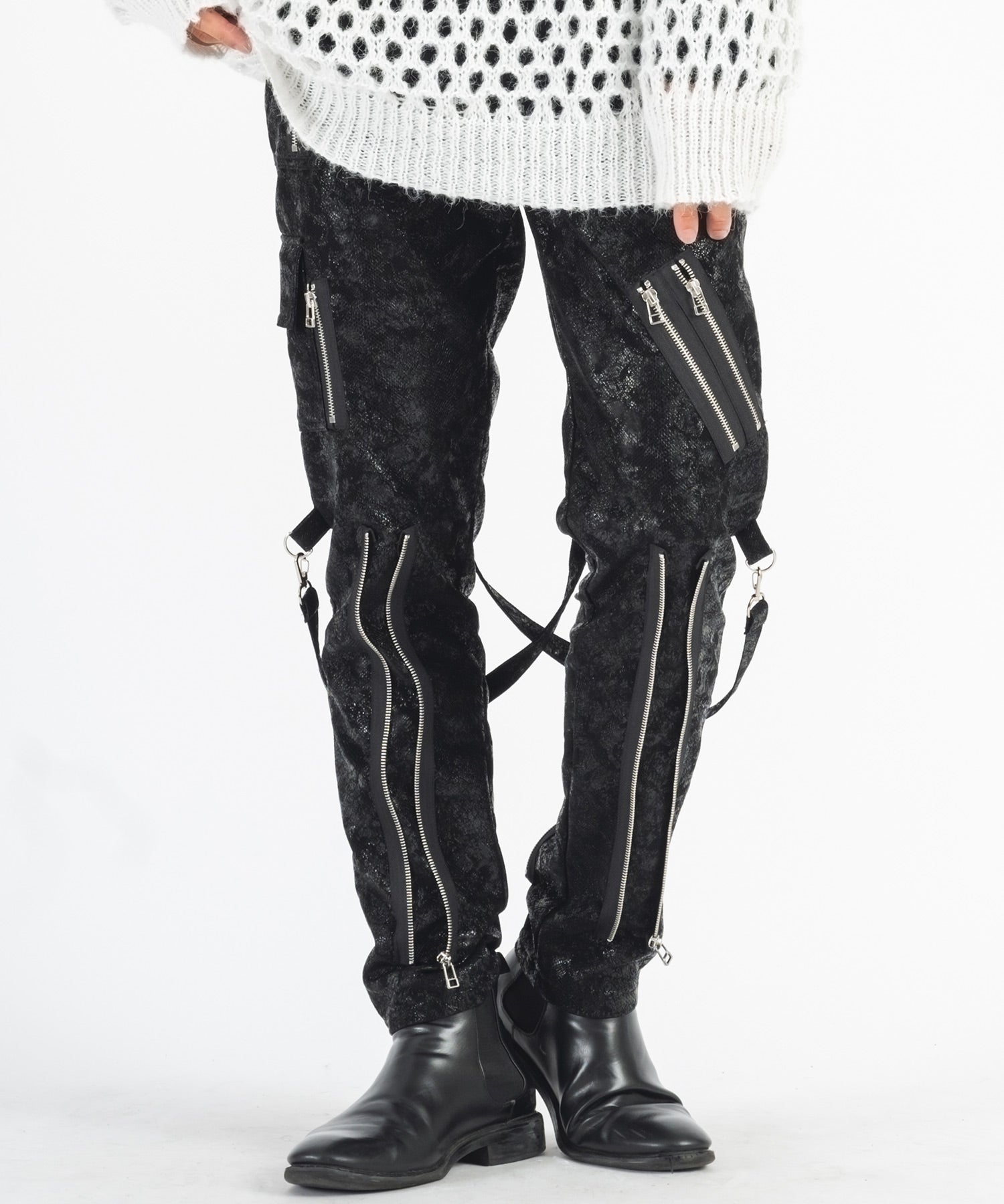レザー調の素材とマッチしたタイトシルエットのボンテージパンツです。