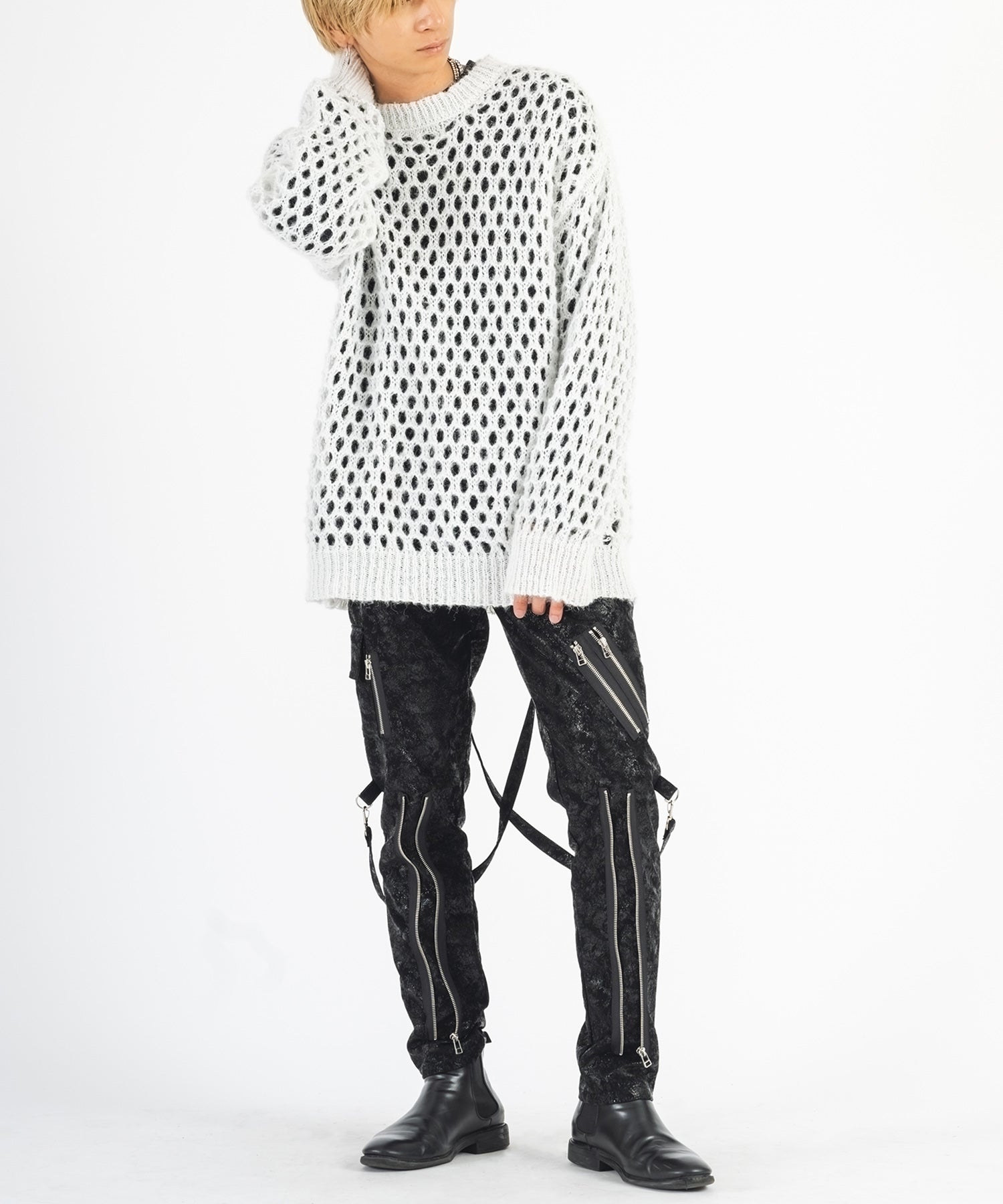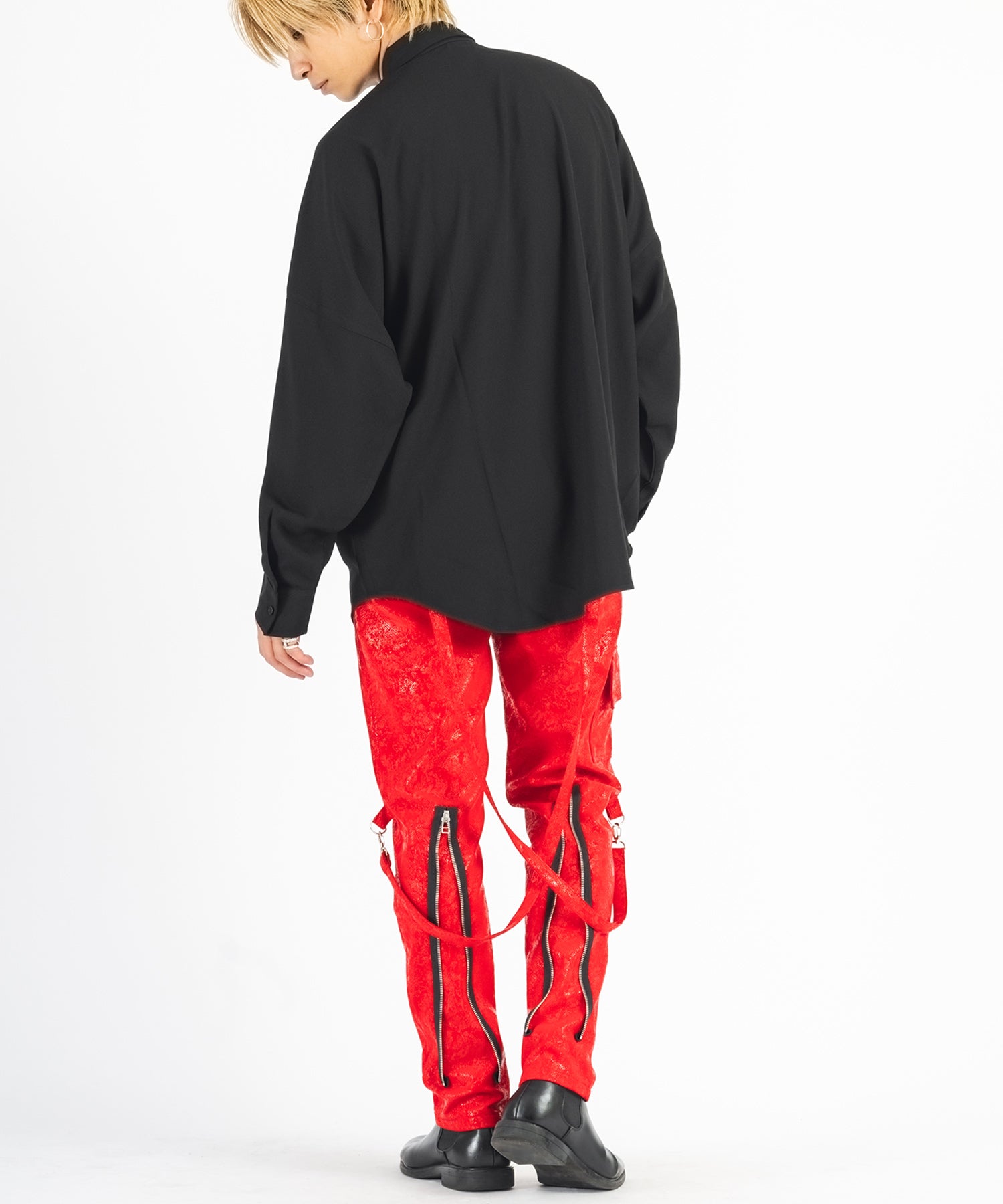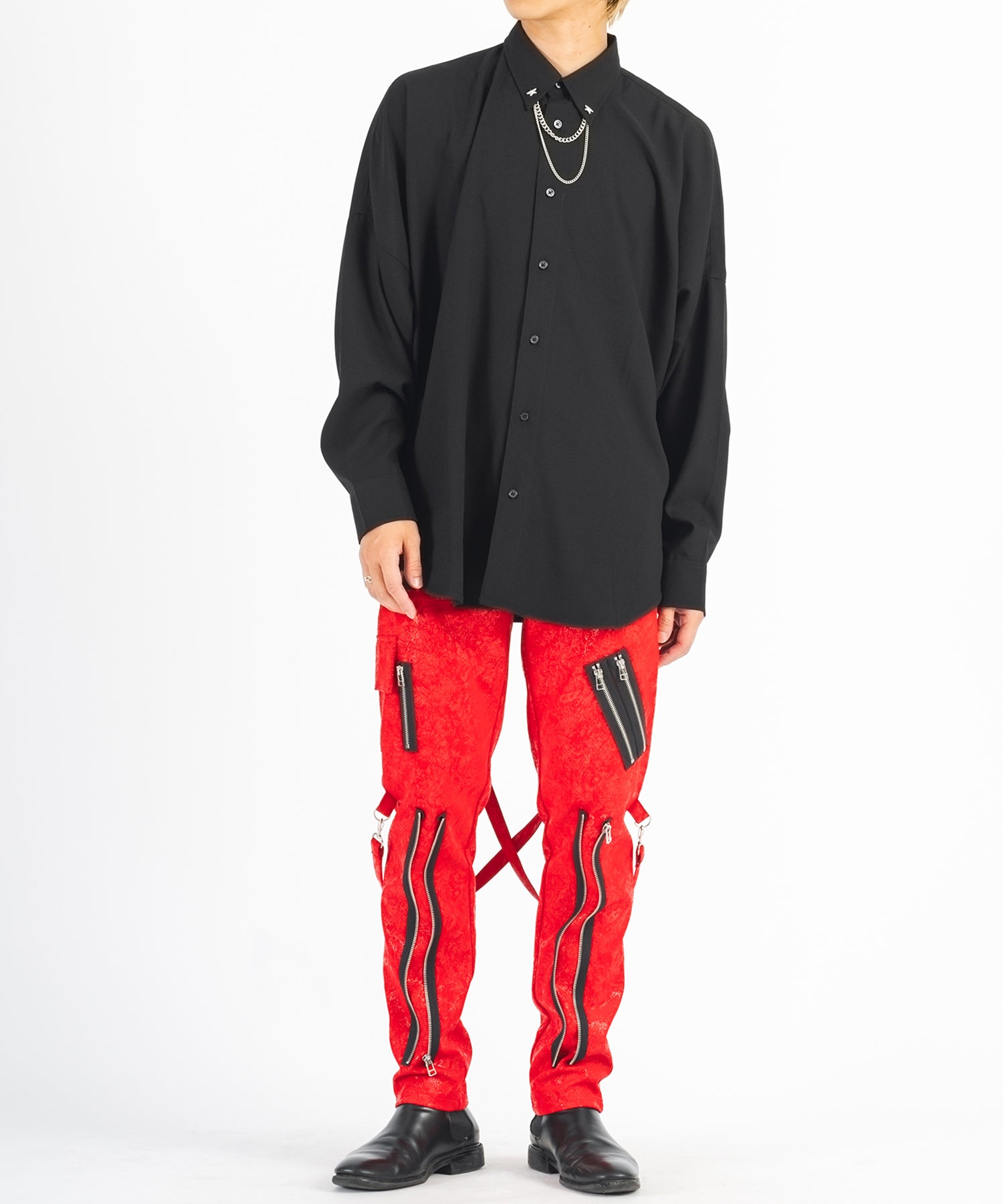 バックに垂れ下がる長いベルトやマルチに配置されたファスナーがボンテージを象徴するデザインです。