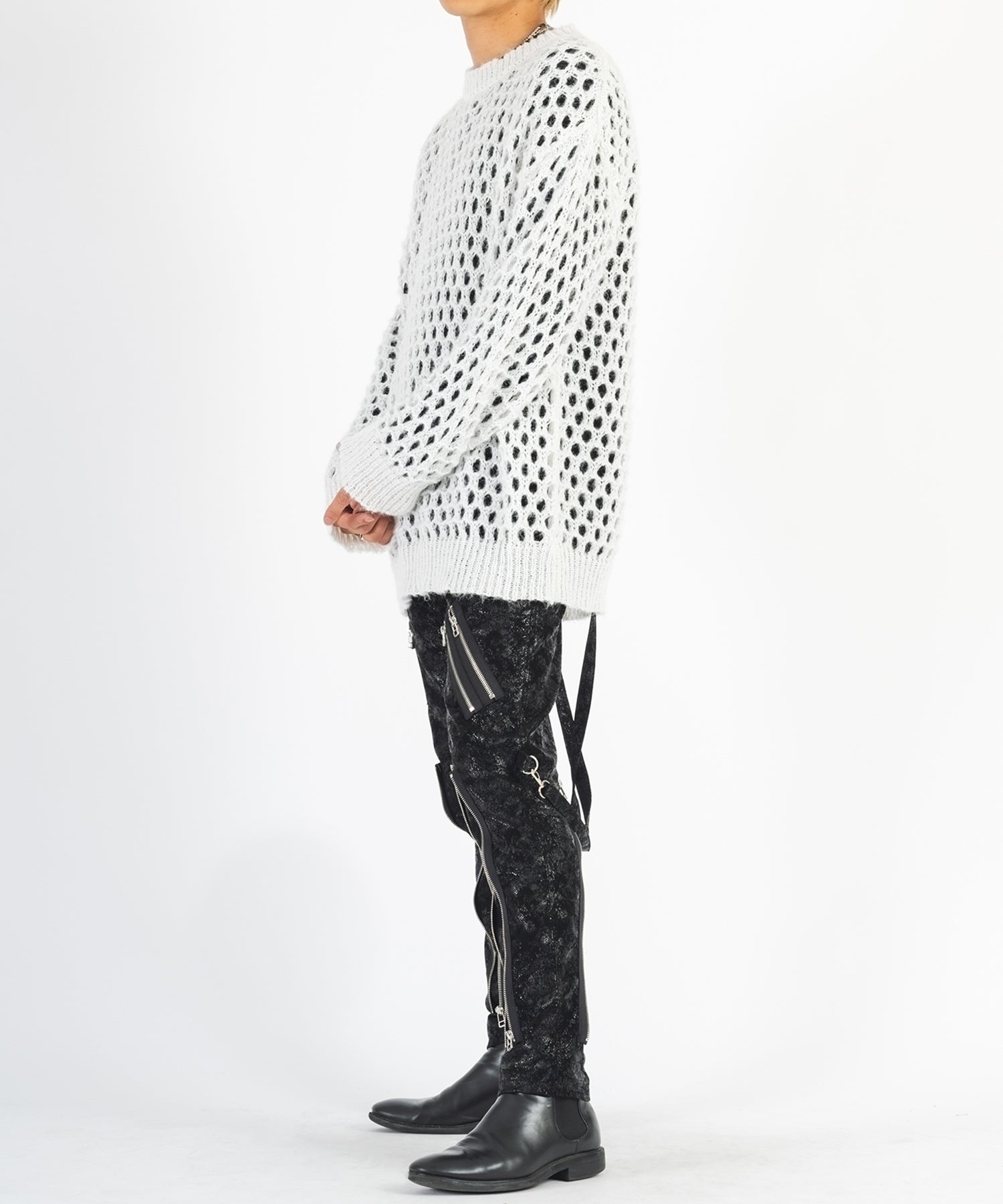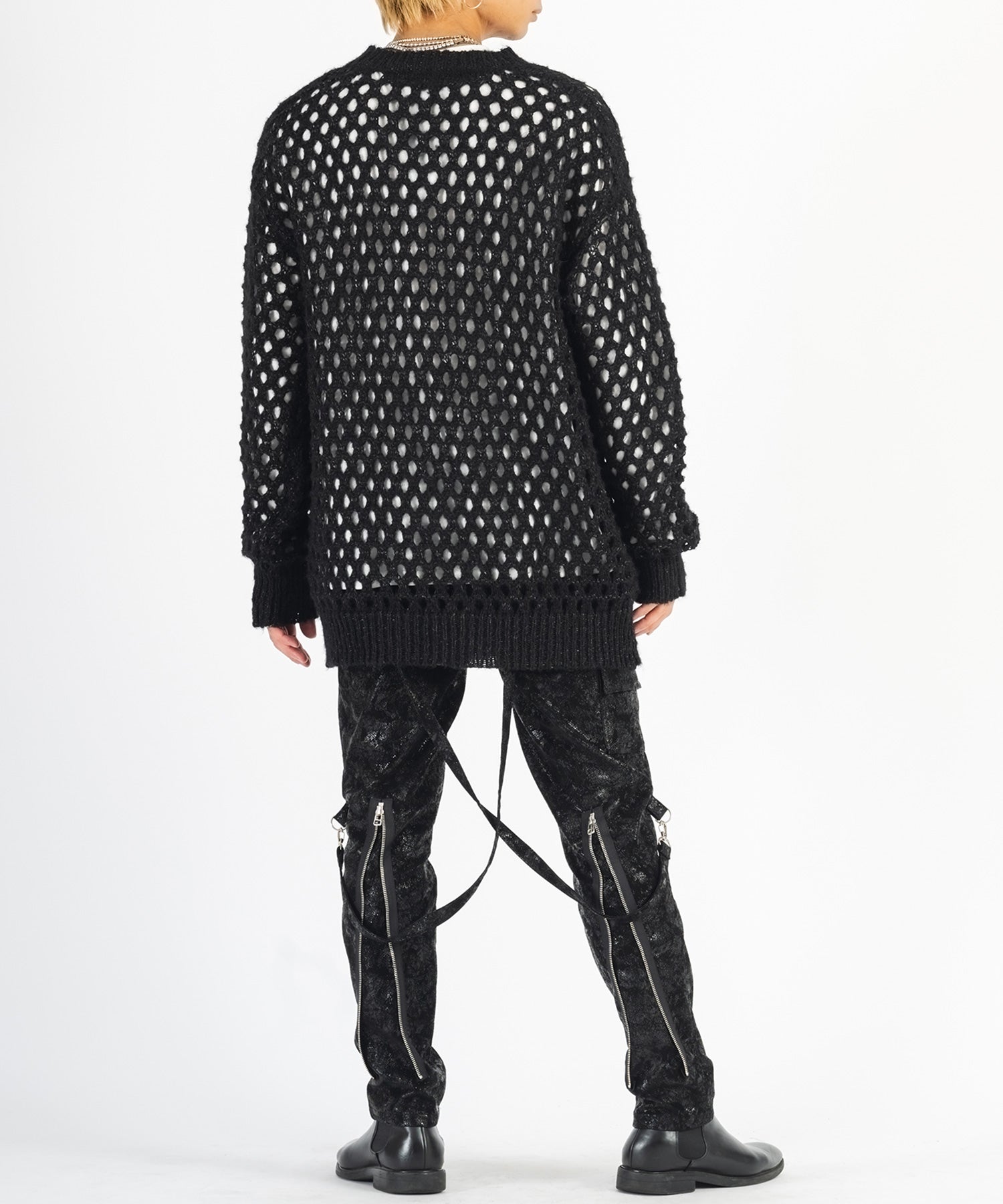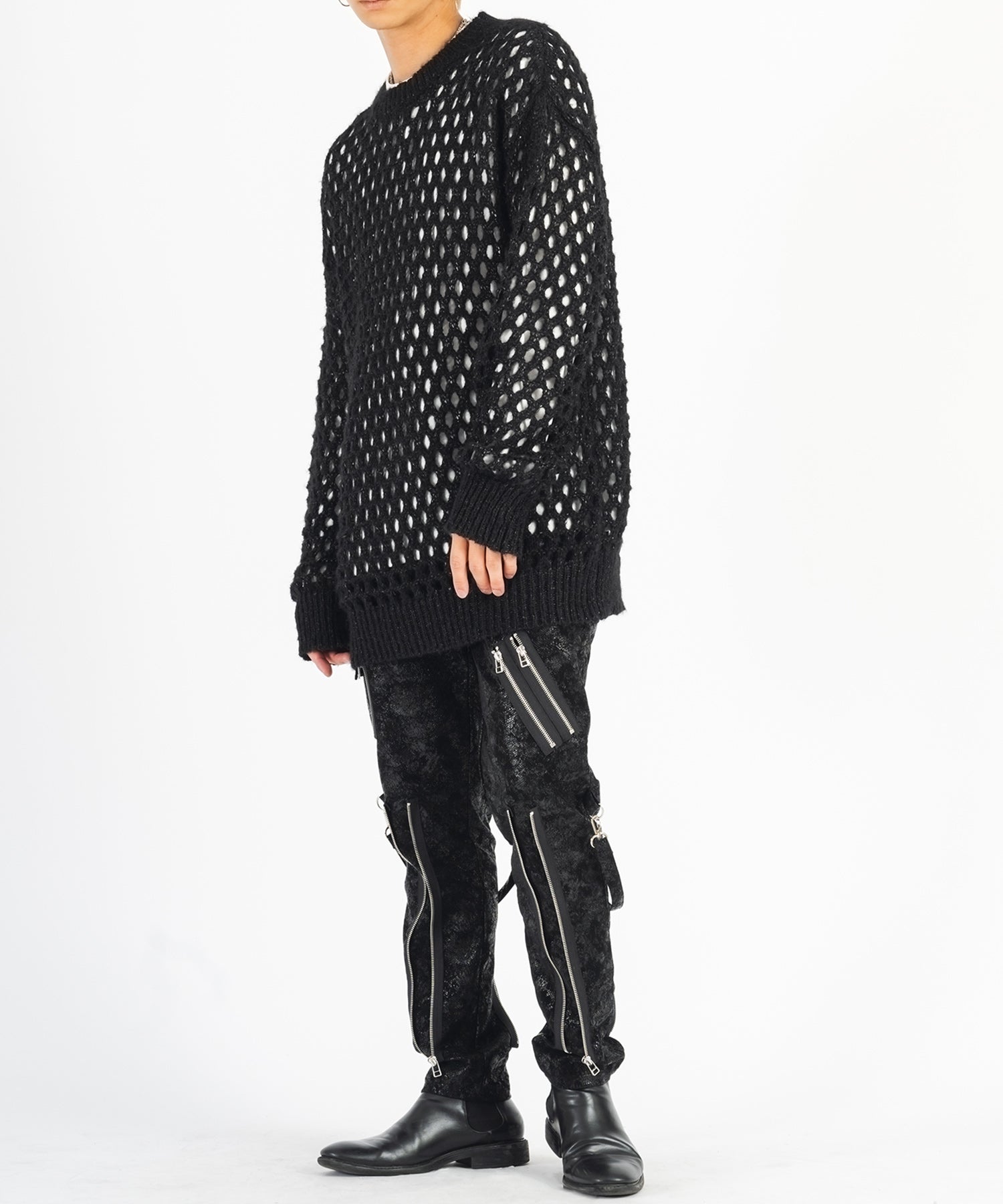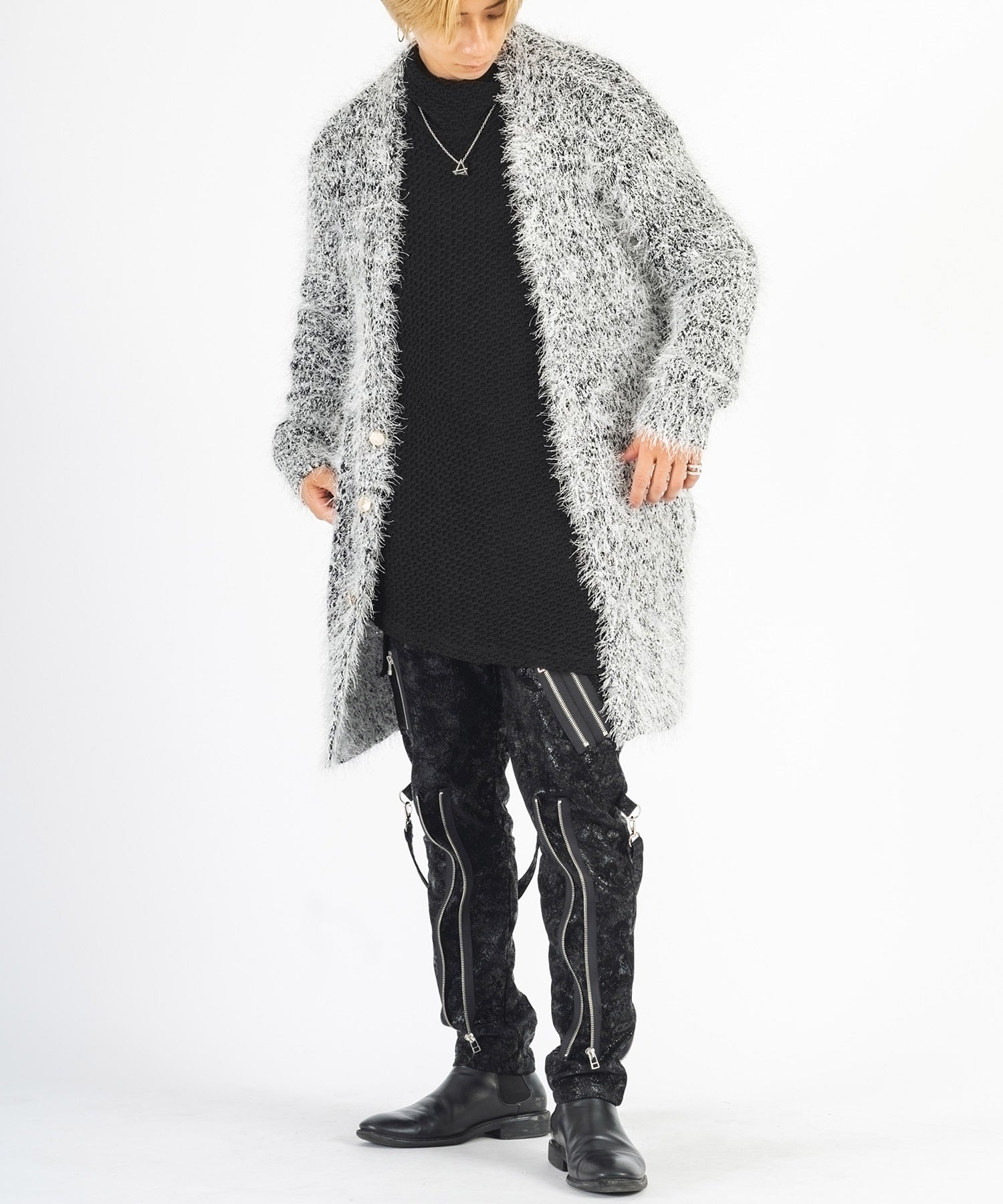 バックに垂れ下がる長いベルトやマルチに配置されたファスナーがボンテージを象徴するデザインです。