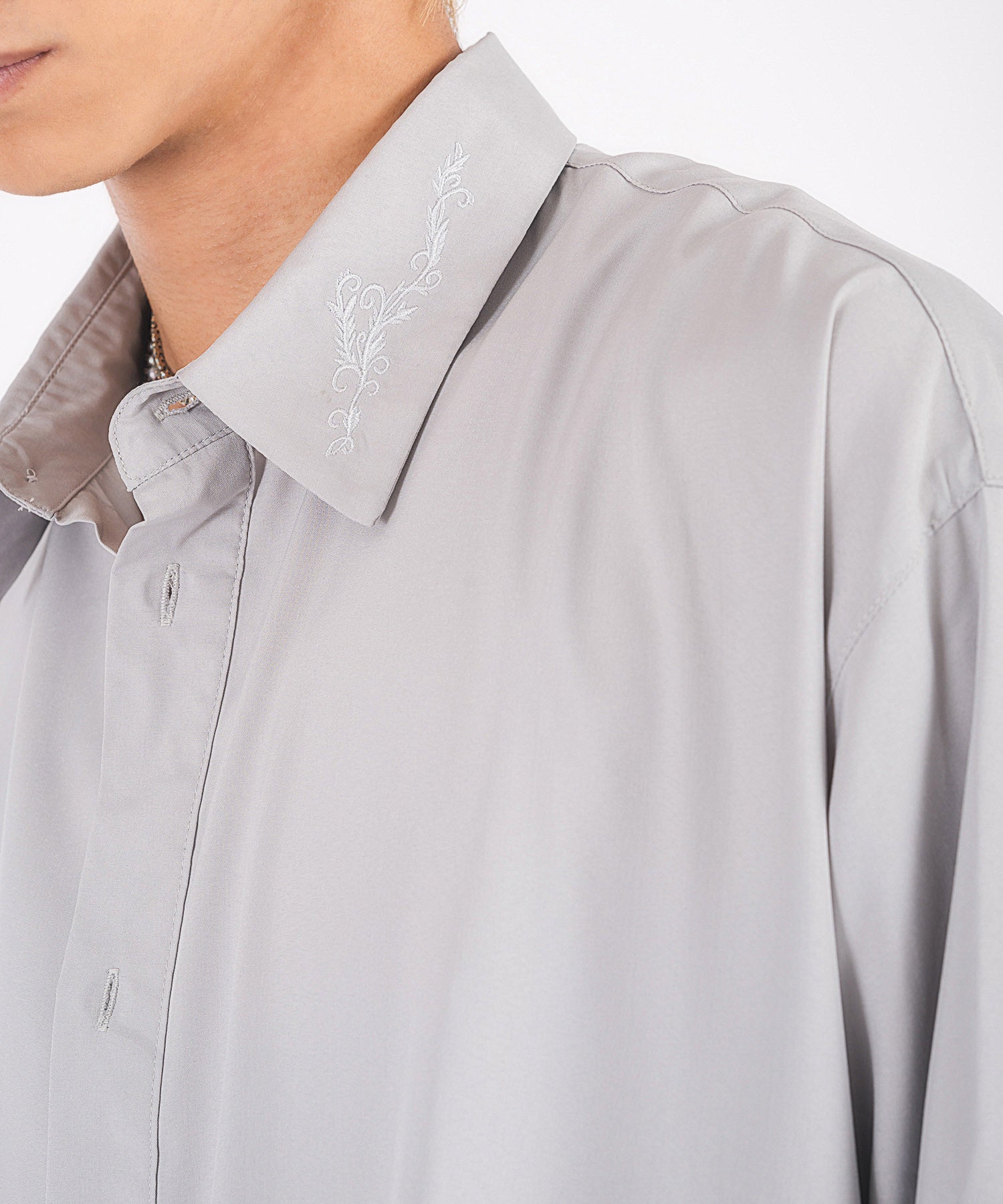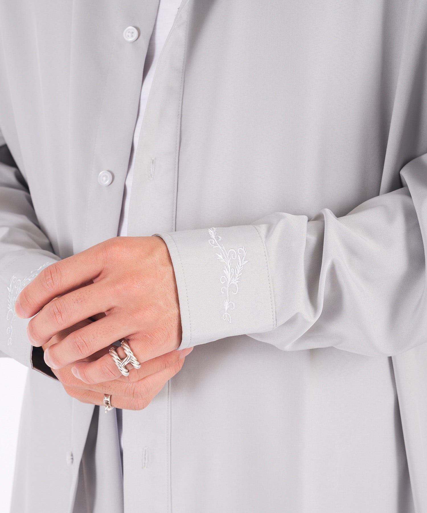 襟と袖カフスに施した刺繍がアクセントになってよりエレガントなムードを醸し出します。背中の深いセンターボックスプリーツがAラインの綺麗なシルエットと着やすいゆとりを実現しています。更にサイドにもスリットを入れることで動きやすく軽やかなシャツらしさも表現しています。