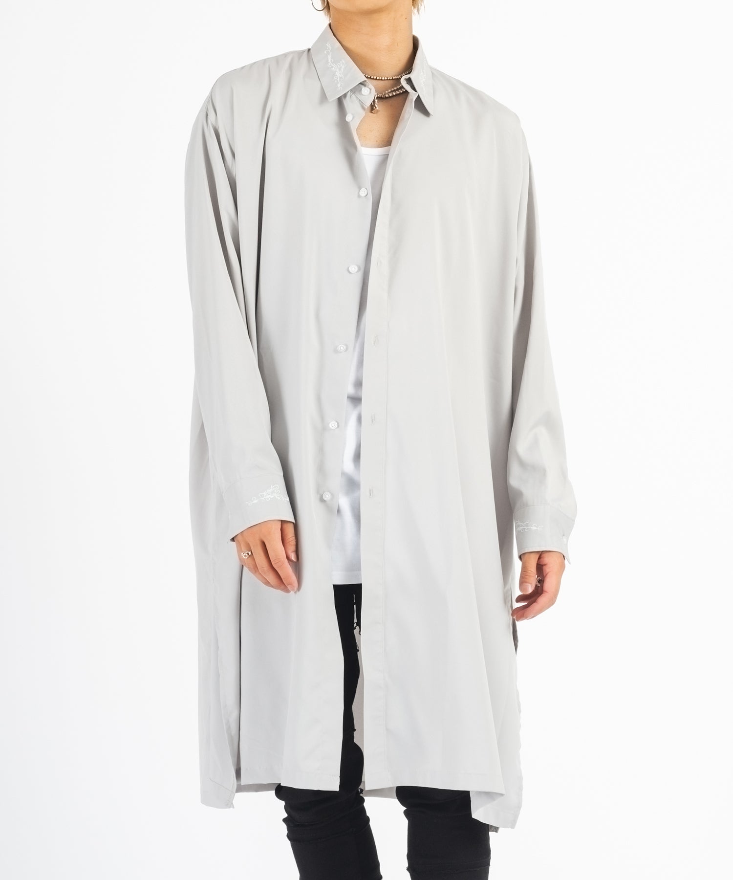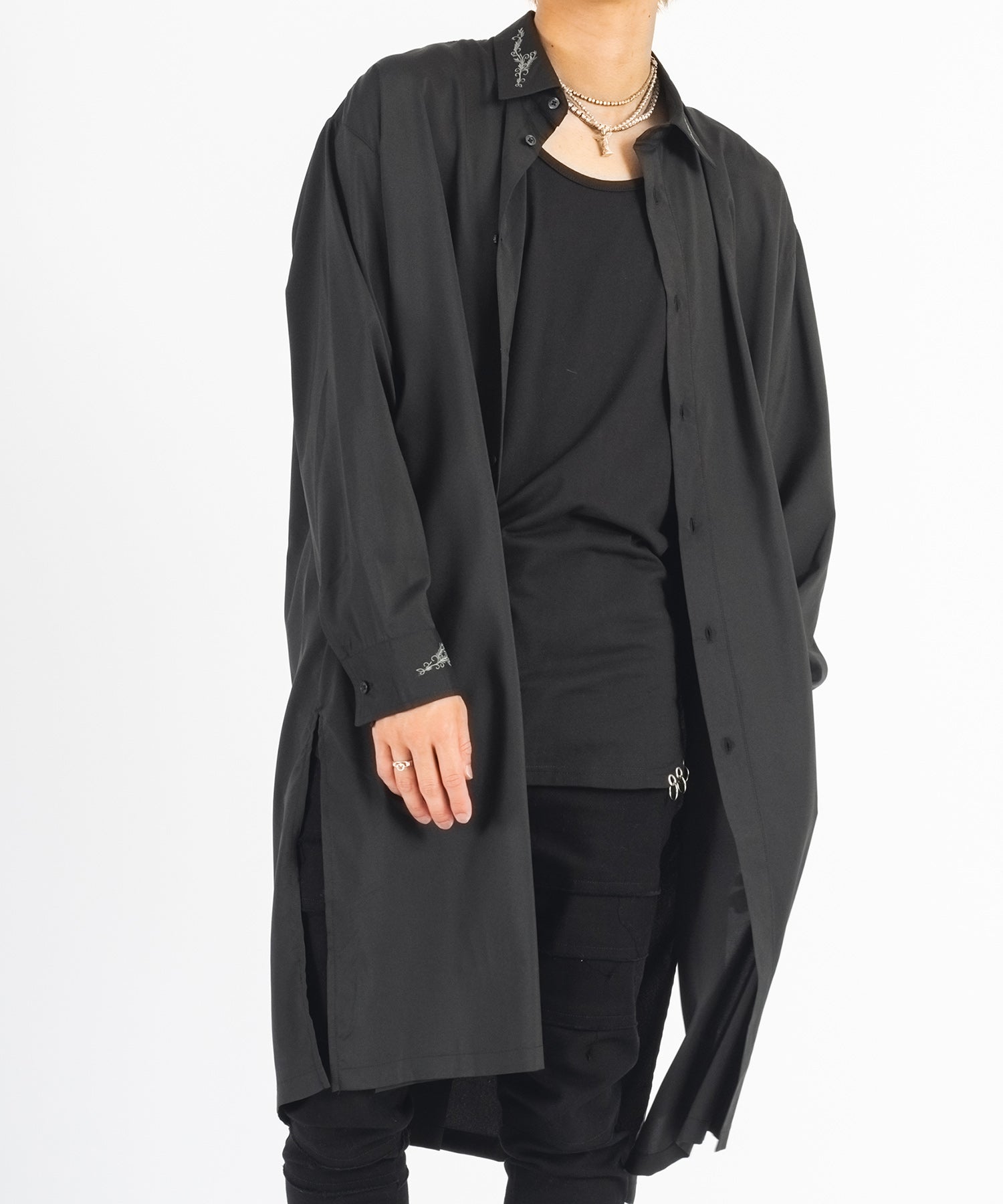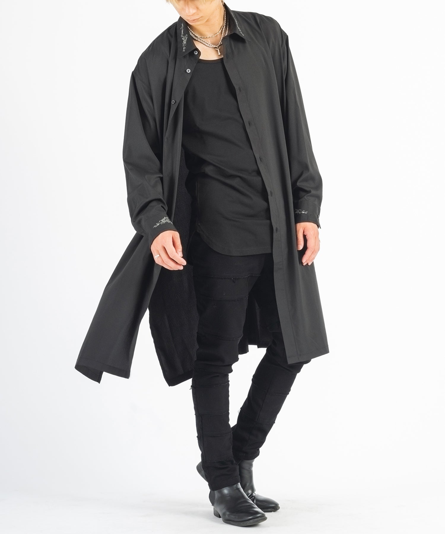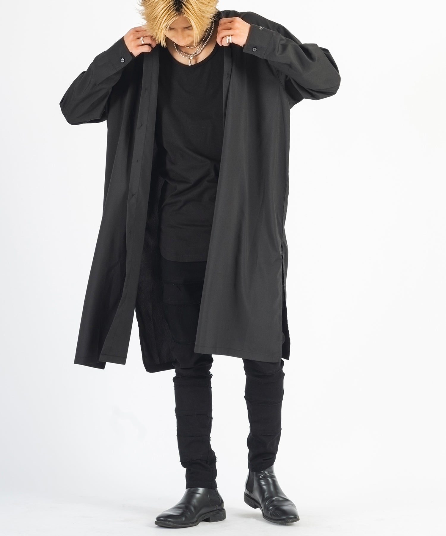 コートの様な膝丈の長さが特徴のロングシャツです。