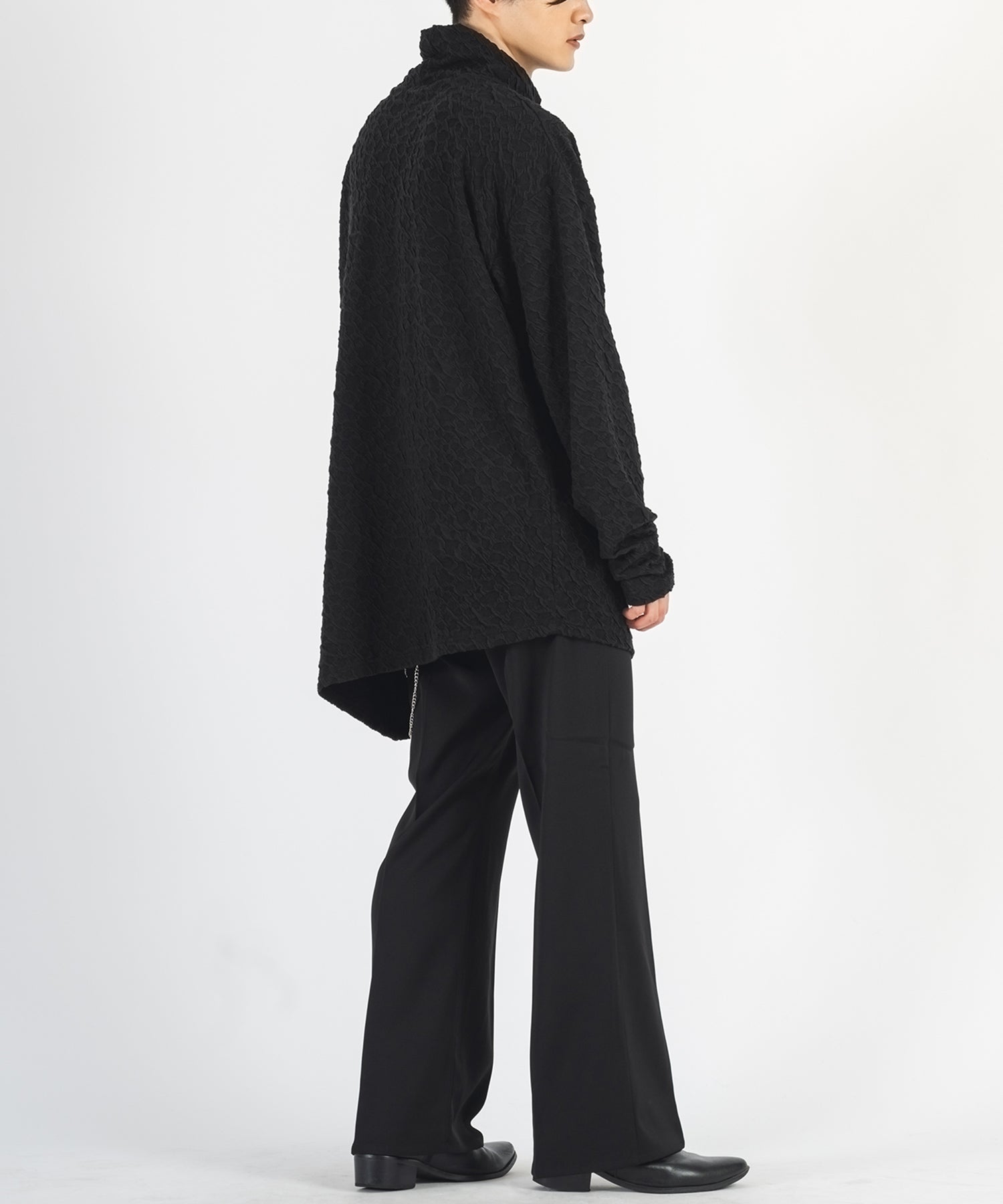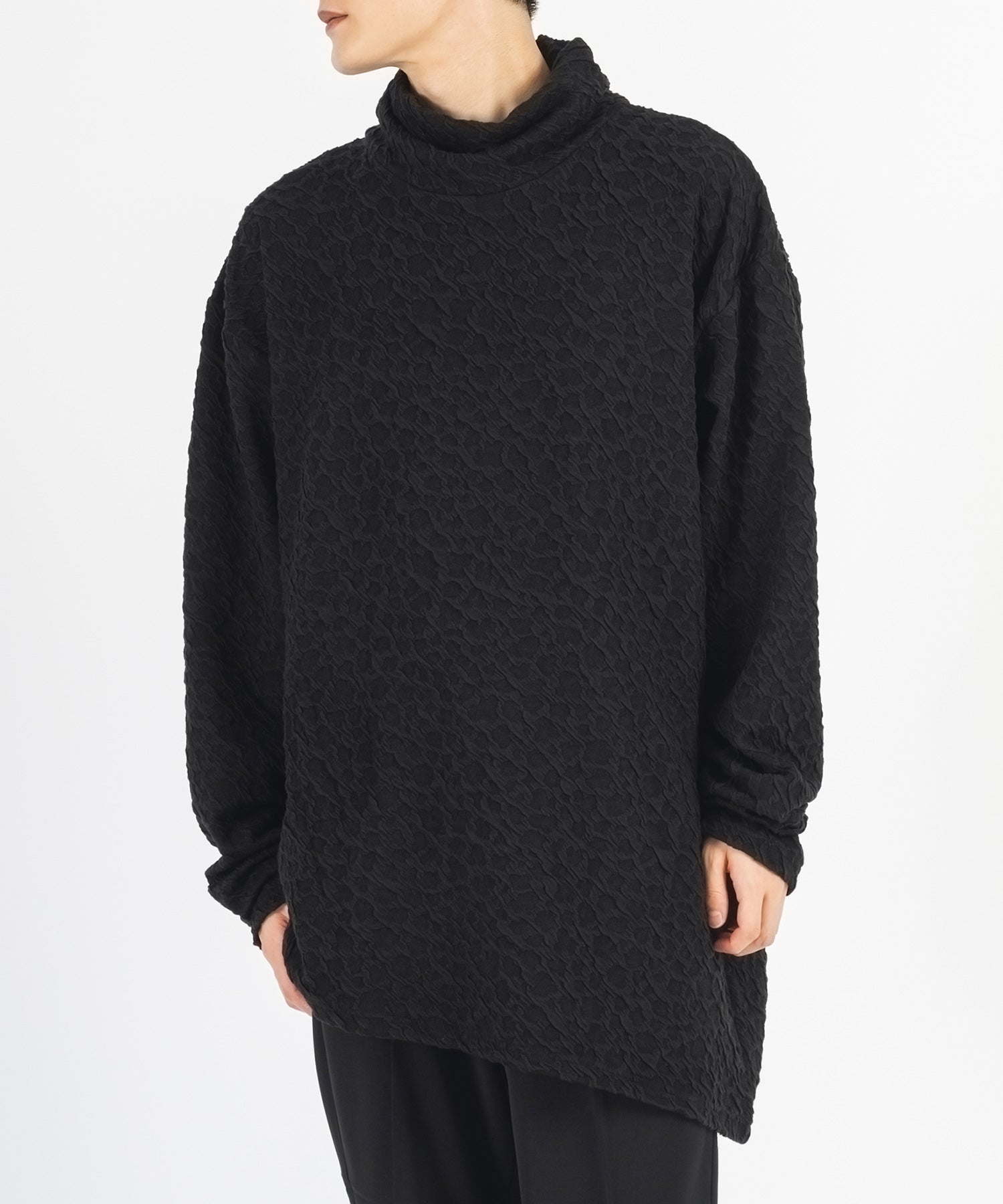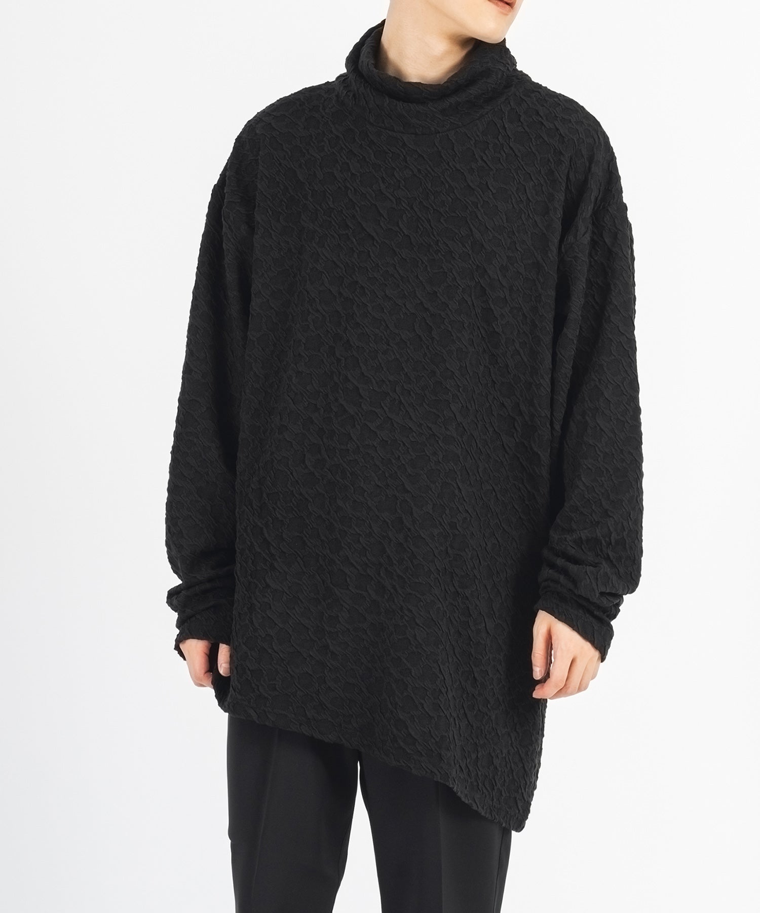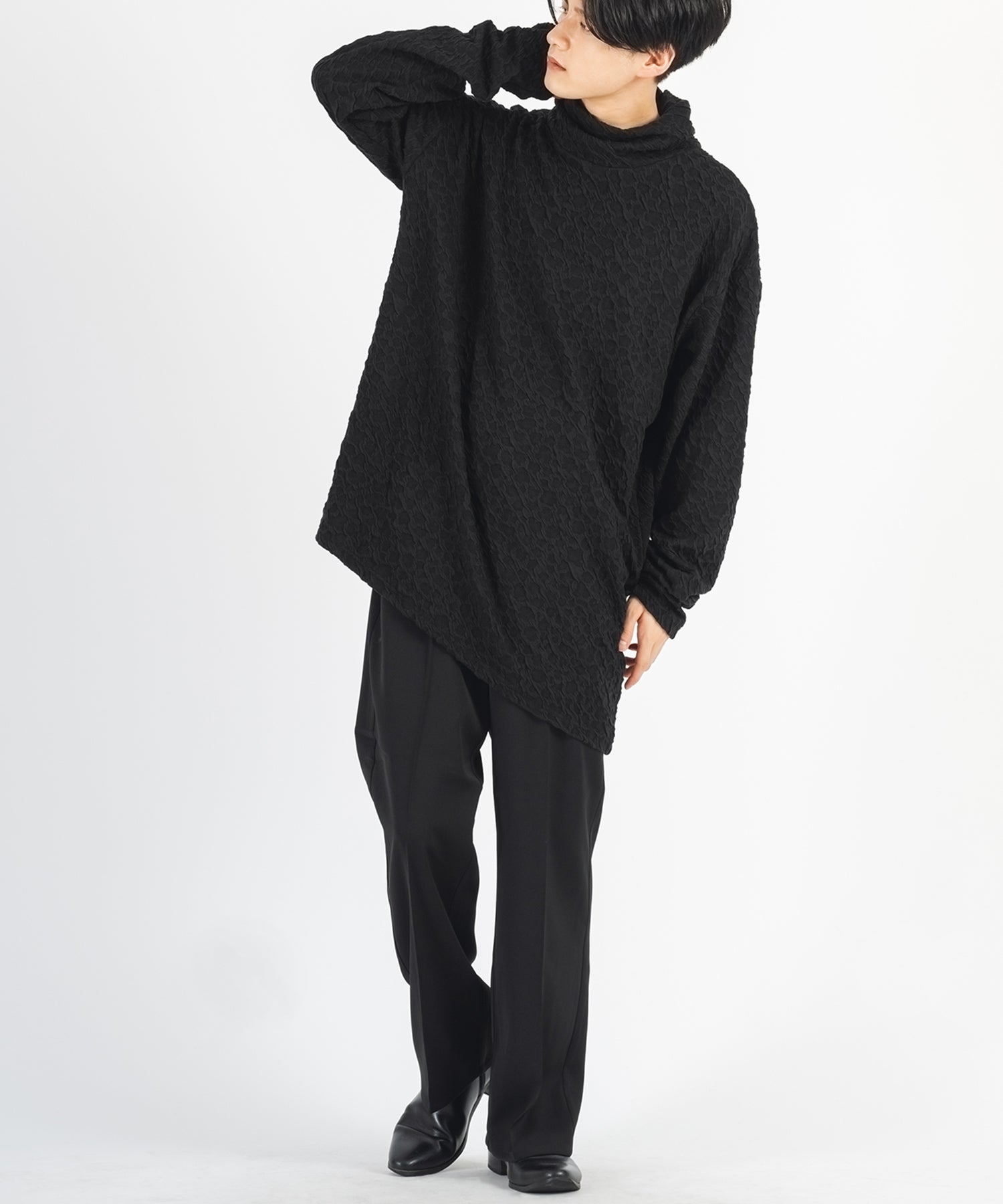緩めに折り返すオフタートルネックがエレガントで柔らかなイメージを表現でき、長めの着丈で左右の長さが違うアシンメトリーなデザインが着こなしを一段とクールにします。