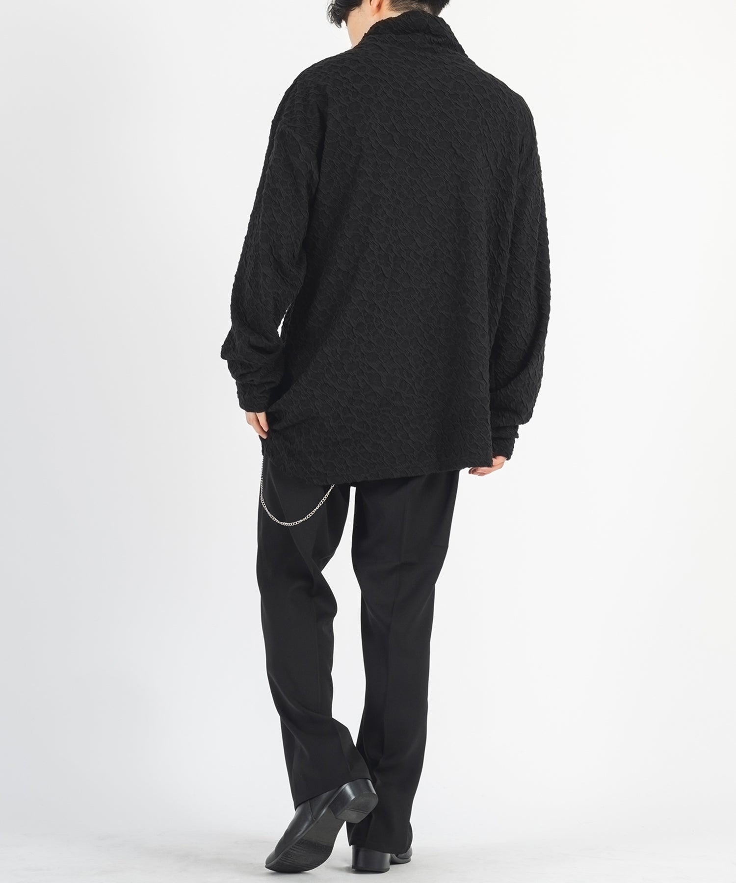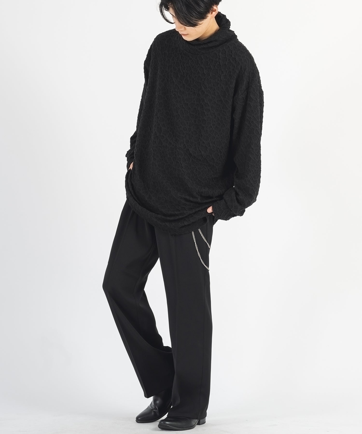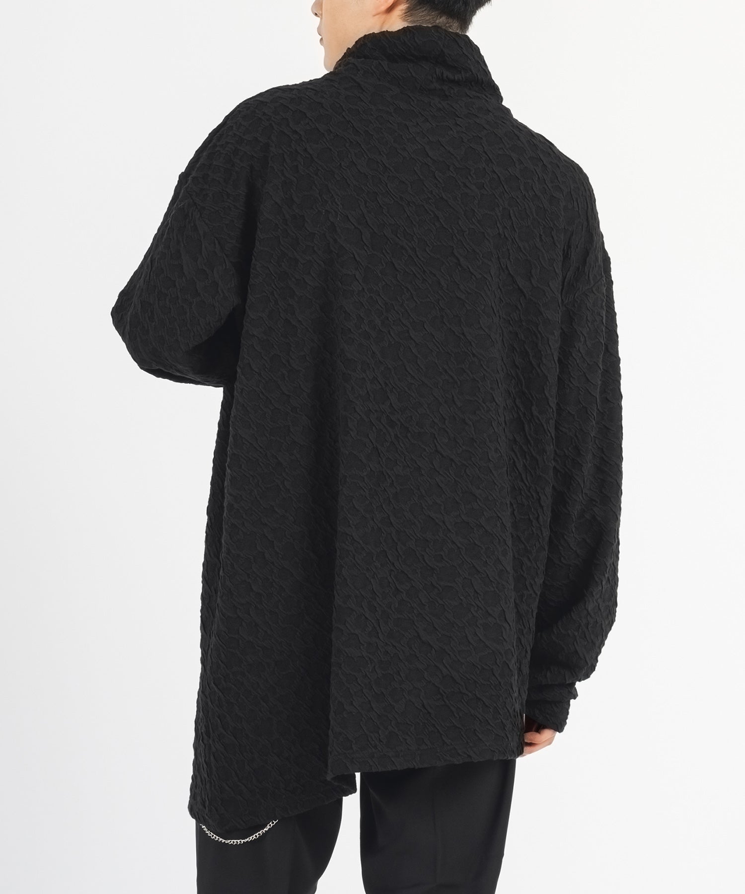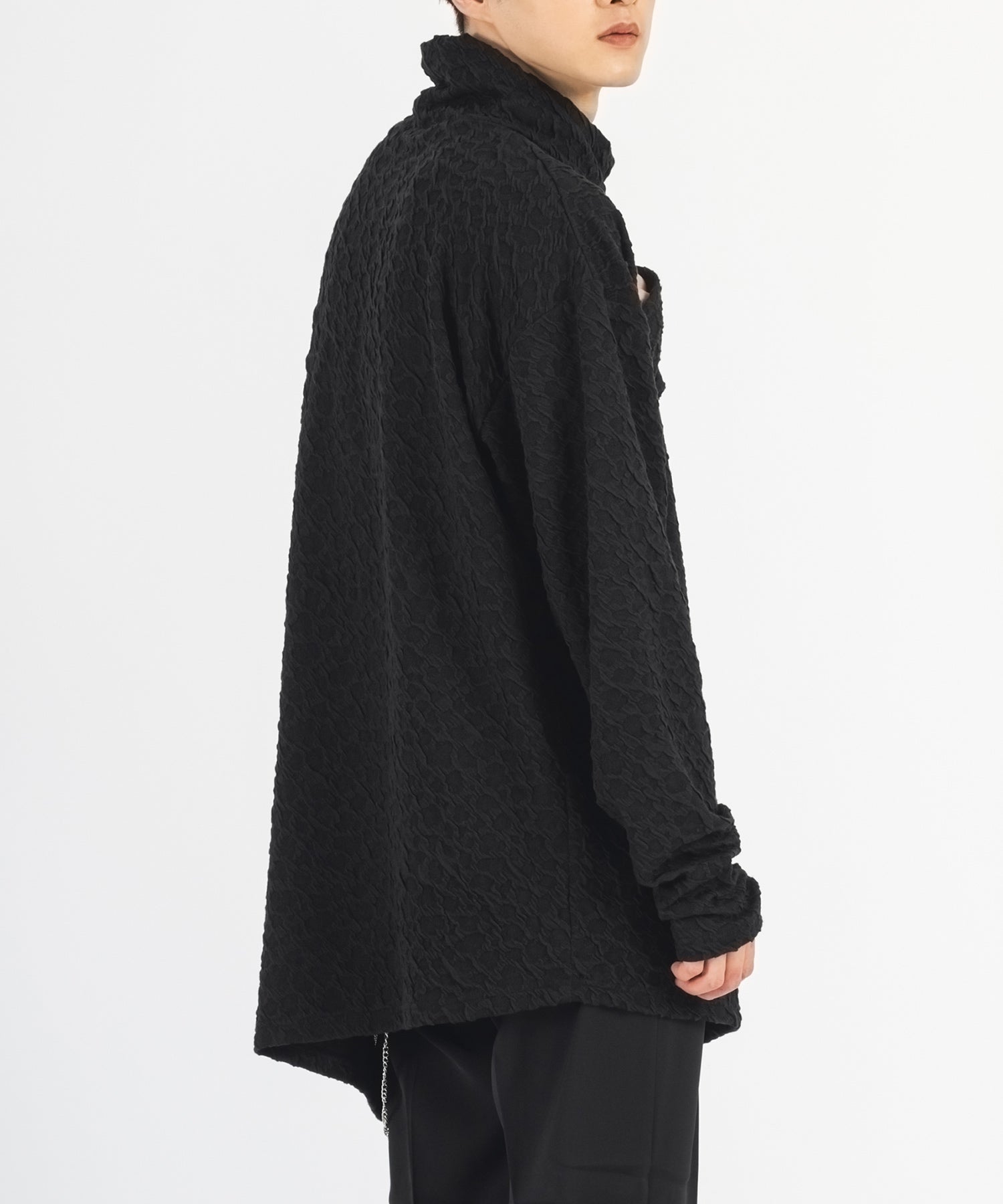 緩めに折り返すオフタートルネックがエレガントで柔らかなイメージを表現でき、長めの着丈で左右の長さが違うアシンメトリーなデザインが着こなしを一段とクールにします。
