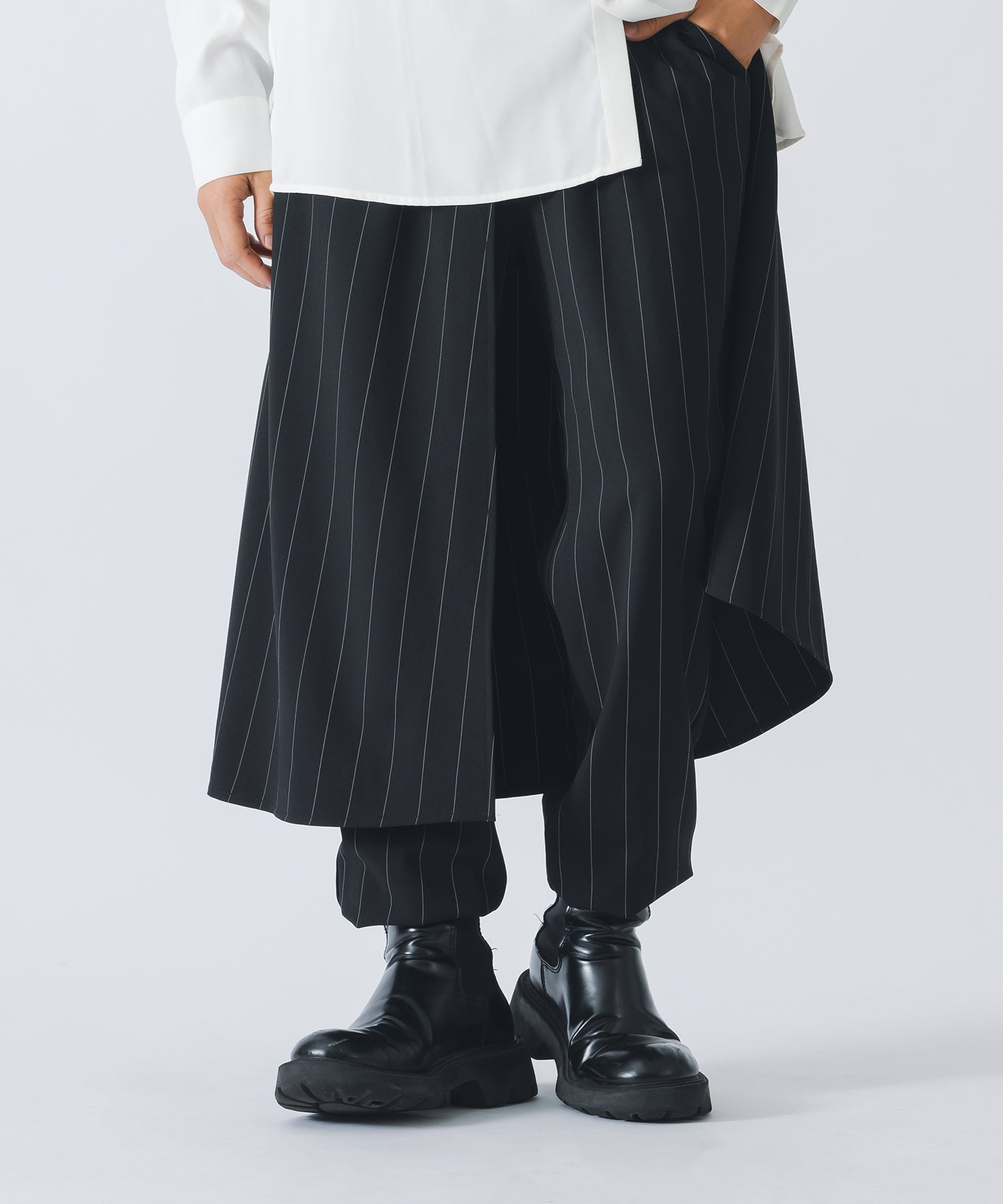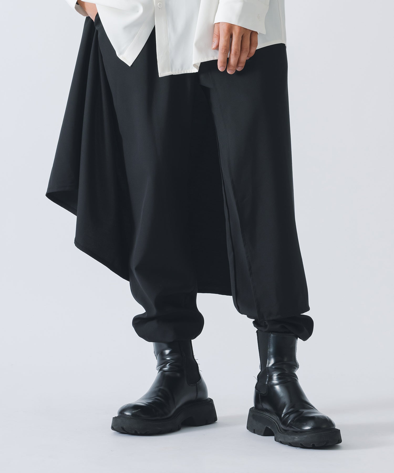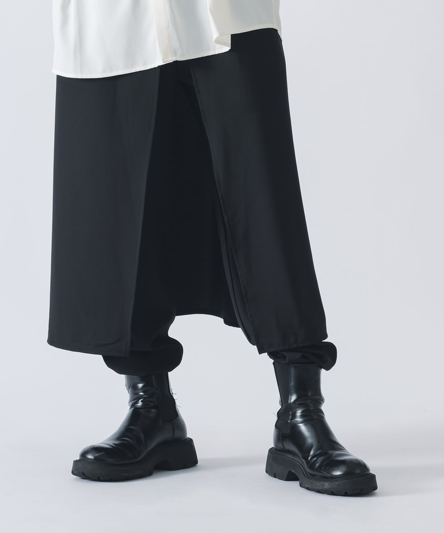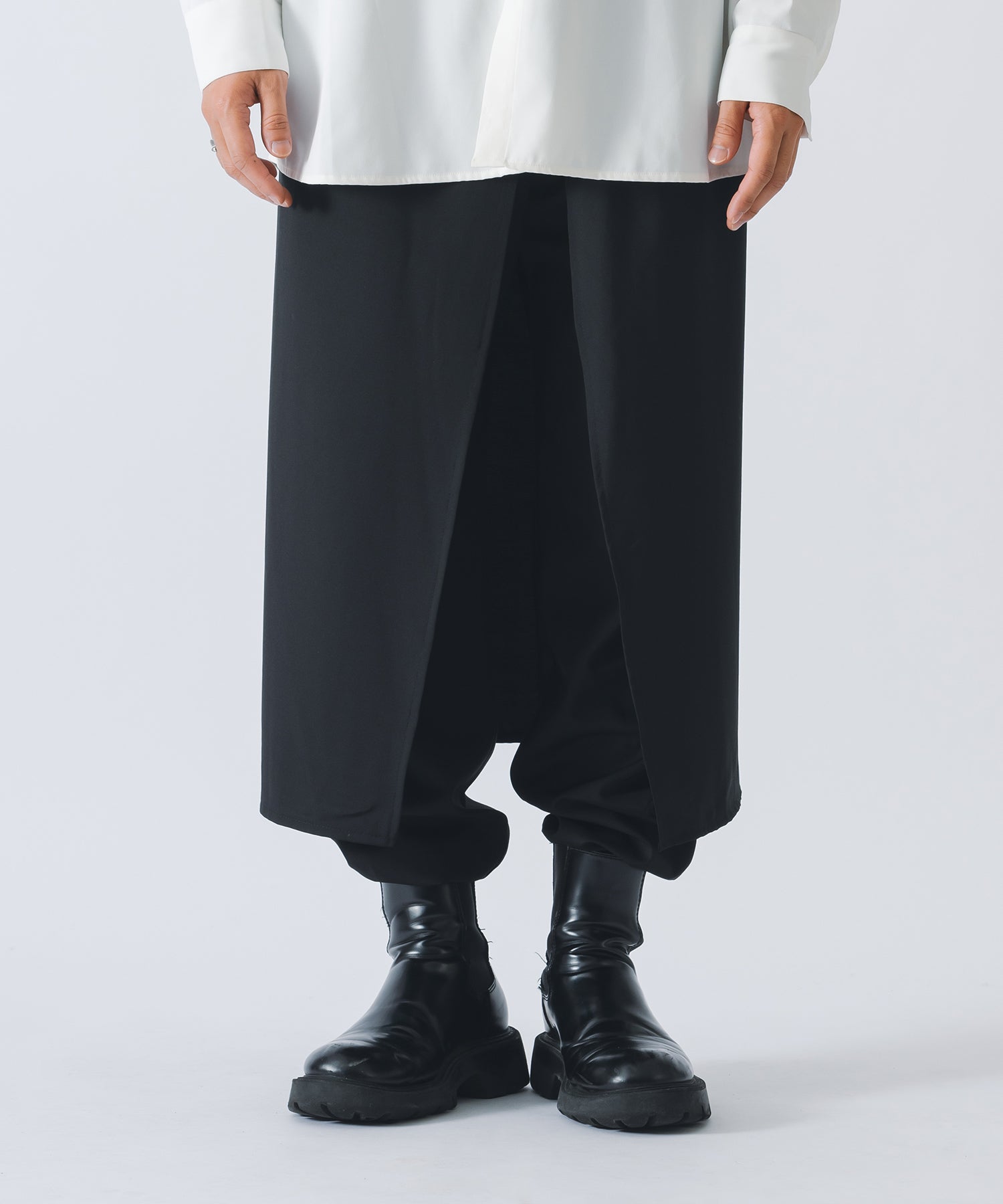 ジョガーパンツの上にラップスカートをレイヤードしたパンツです。