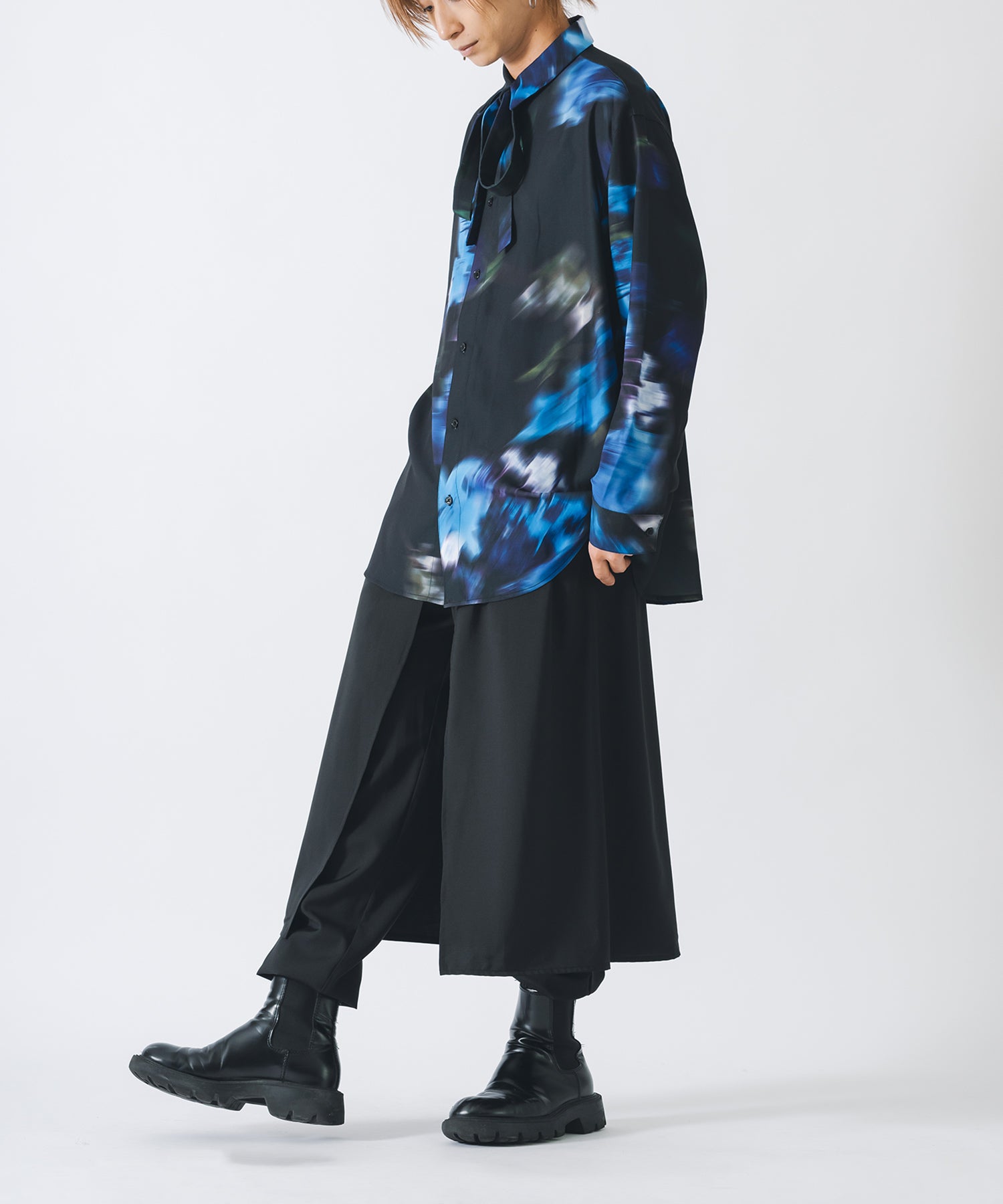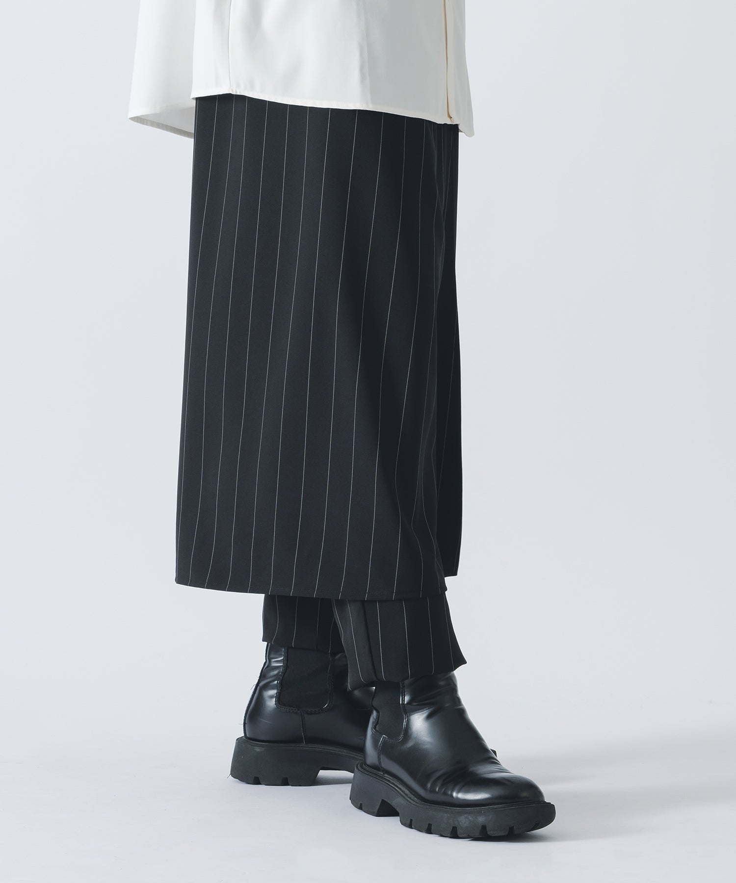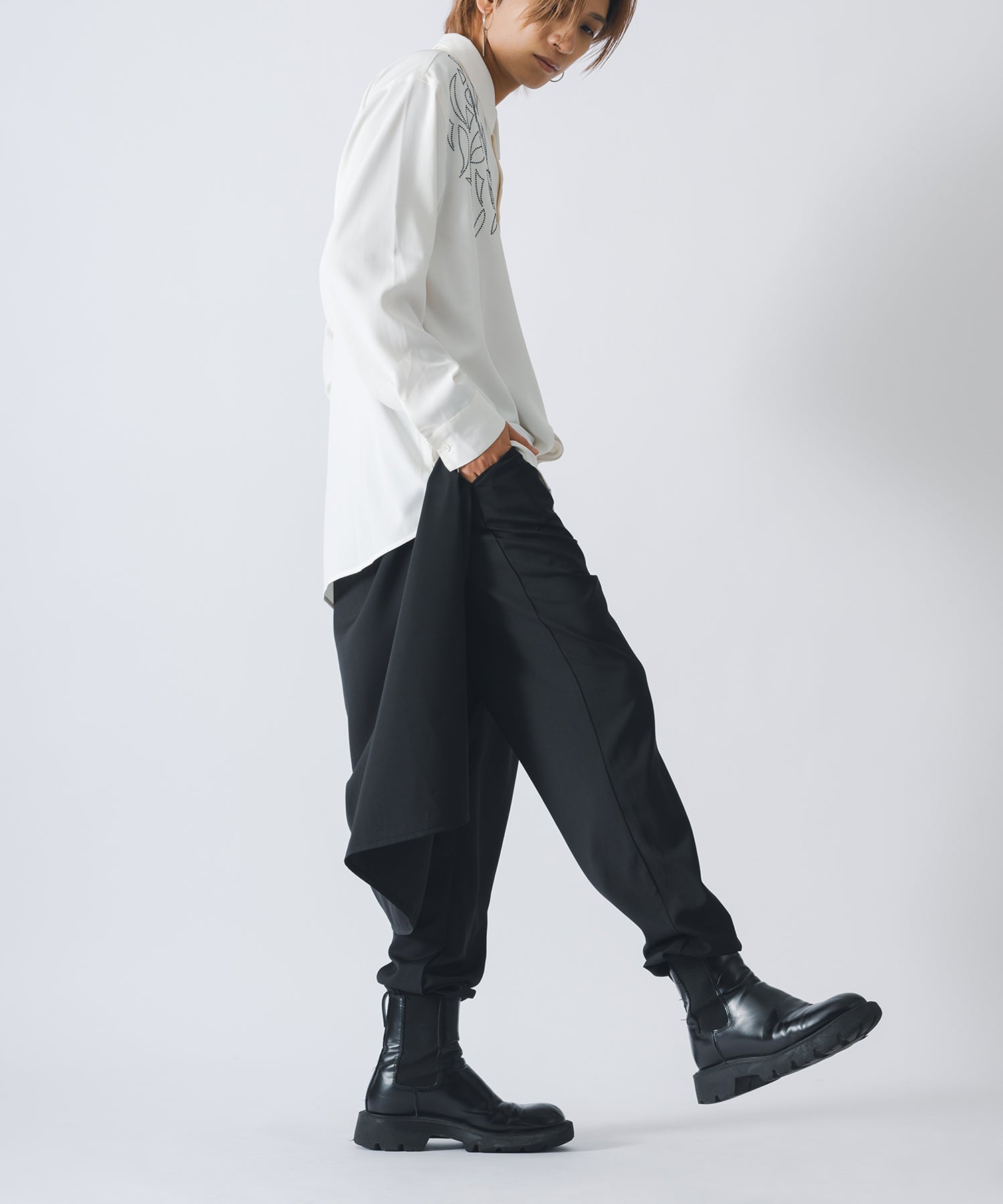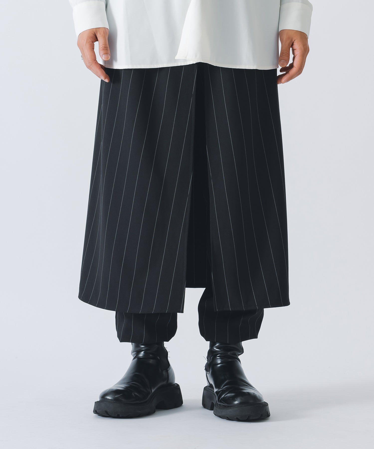 ジョガーパンツの上にラップスカートをレイヤードしたパンツです。