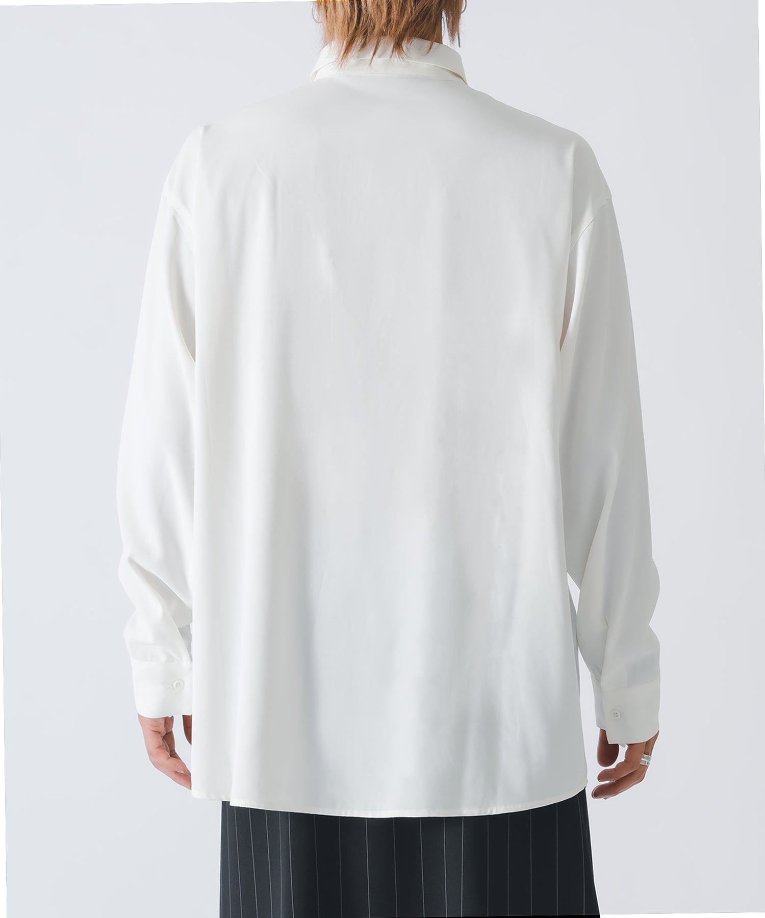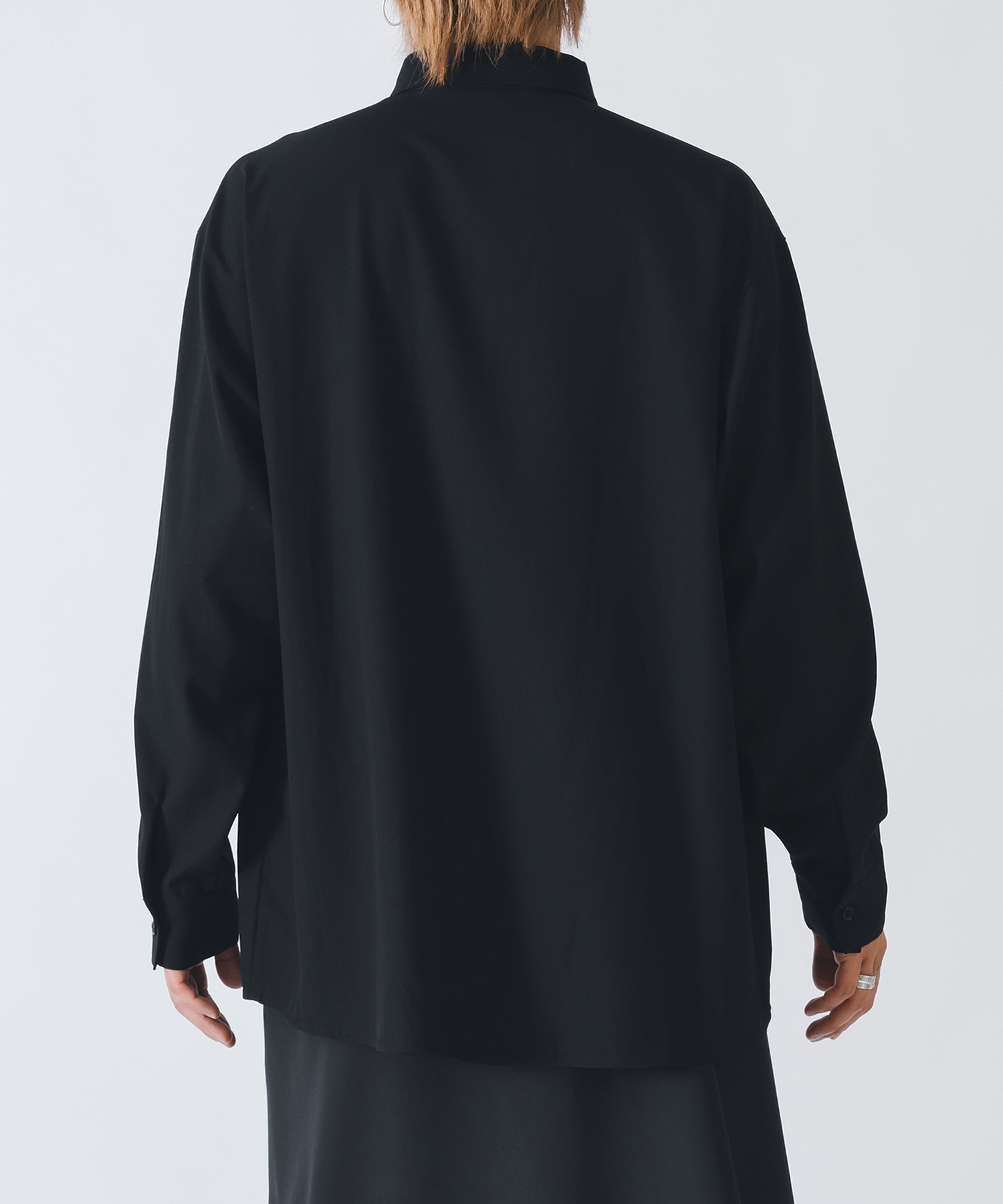 ポリエステル素材を使用しており、それによって生まれる独特のドレープ性がとろみ感、抜け感を演出するとともに肌触りが良くて、シワになりにくくイージーケアです。