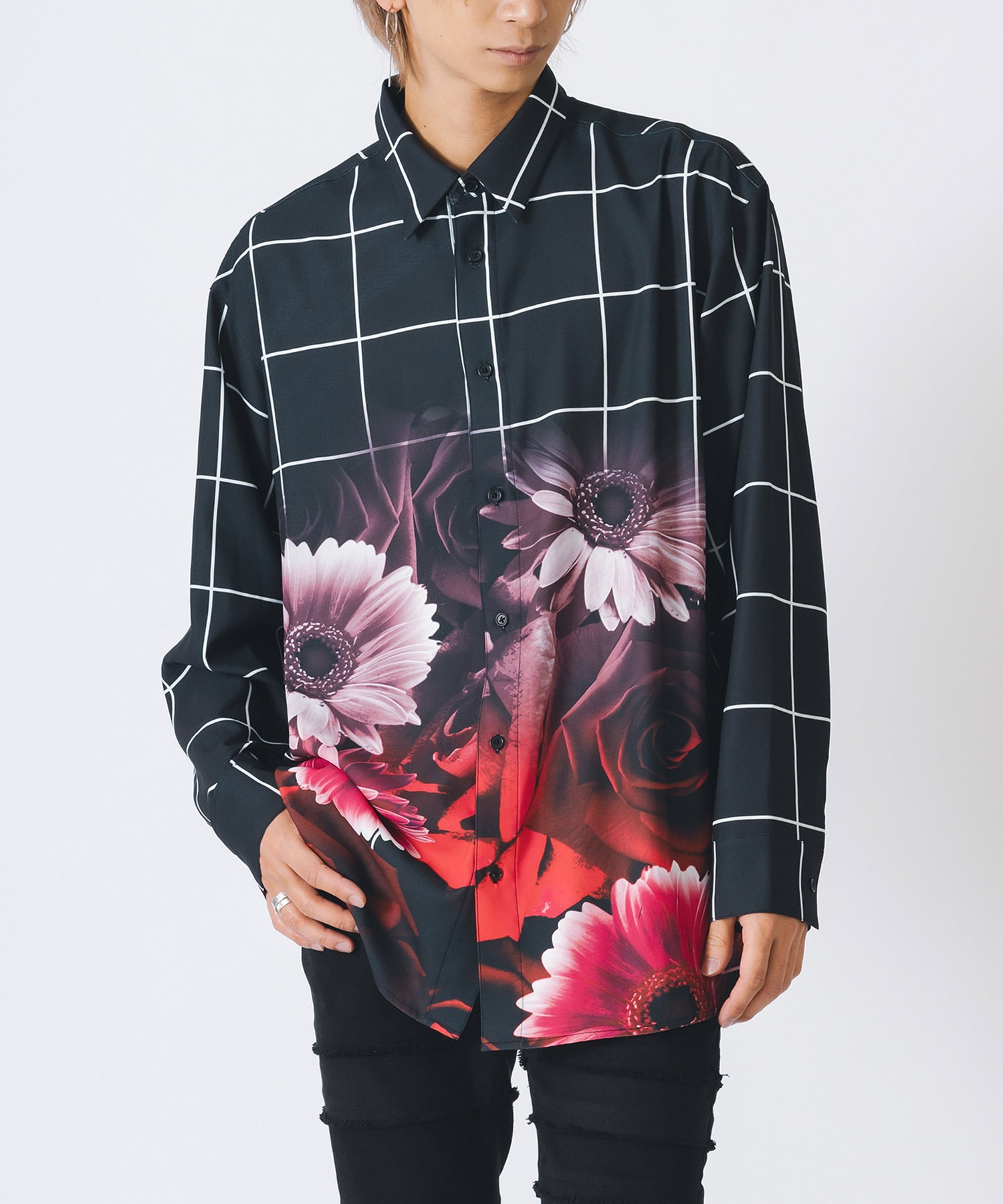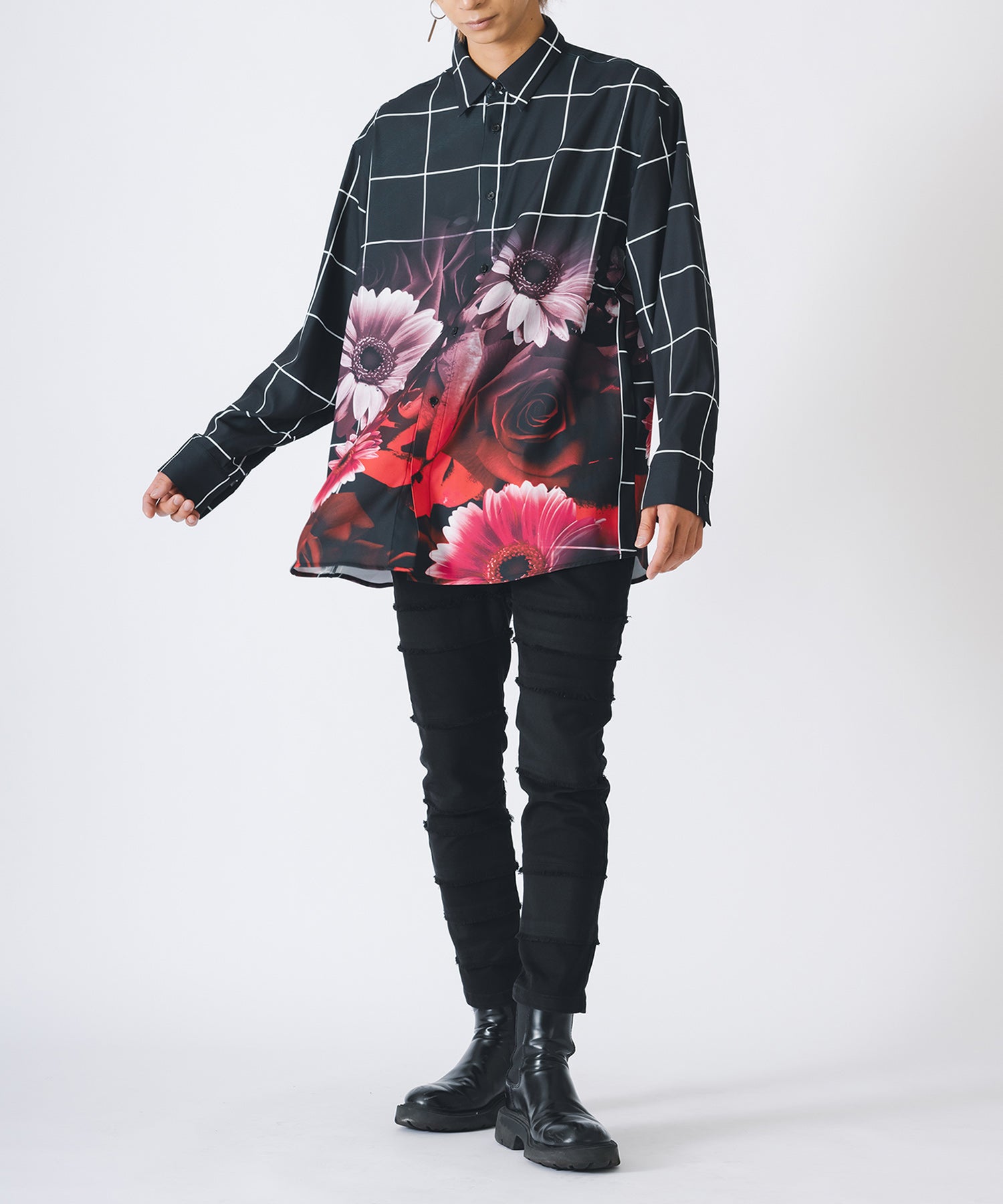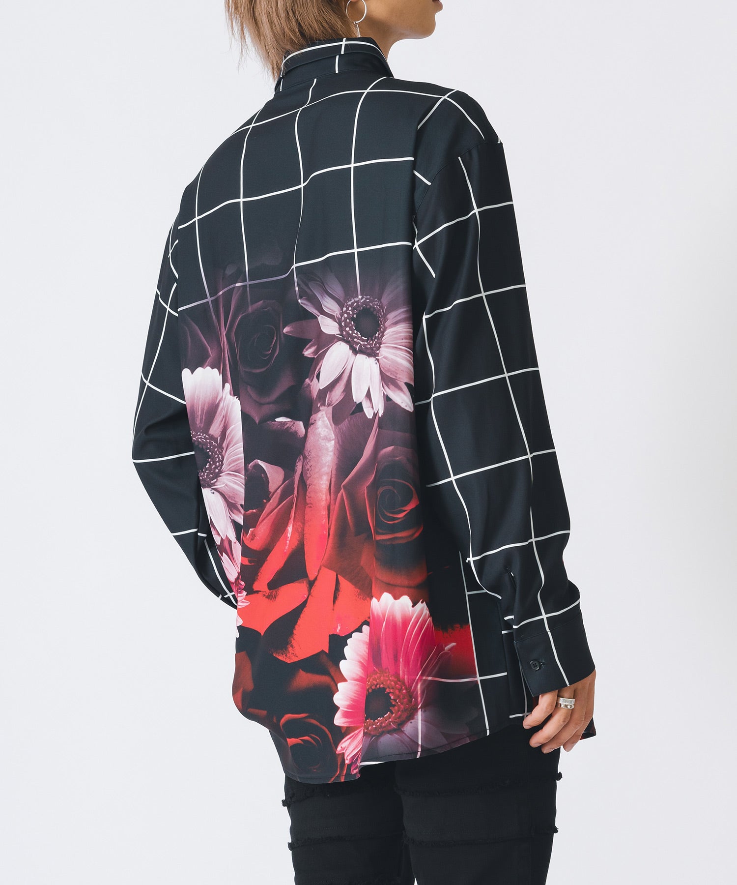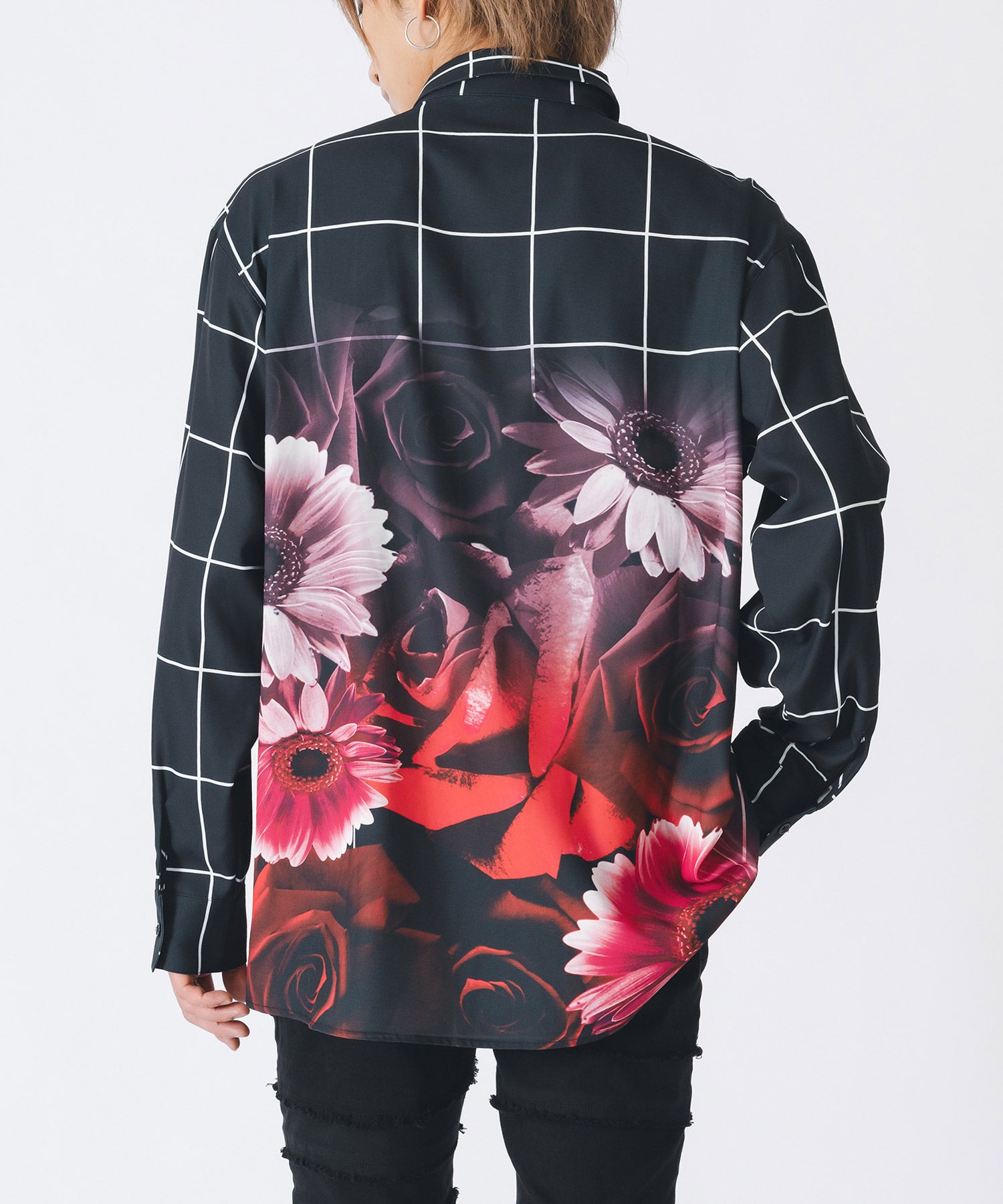 チェック柄にバラのプリントをしたモードなシャツです。