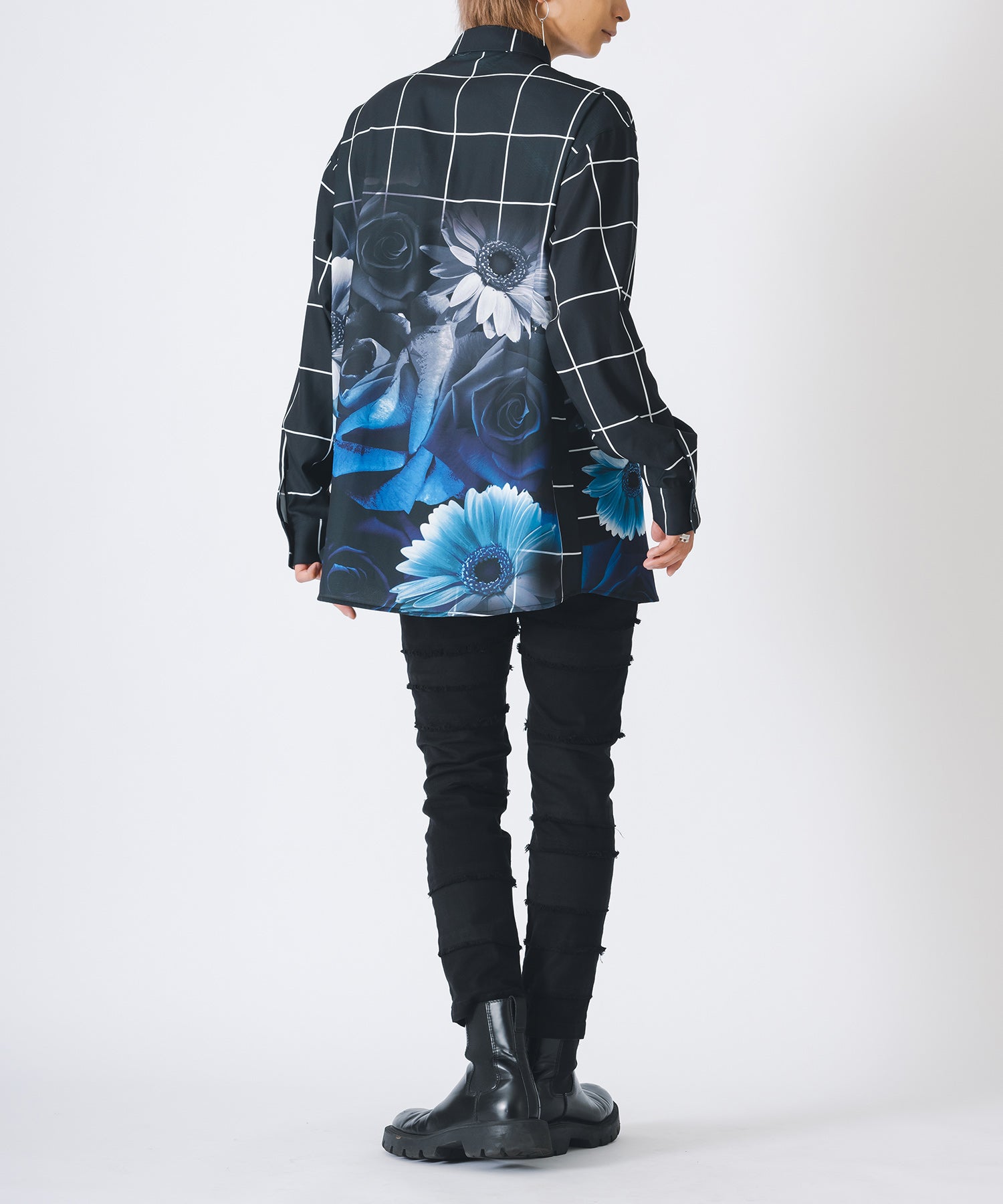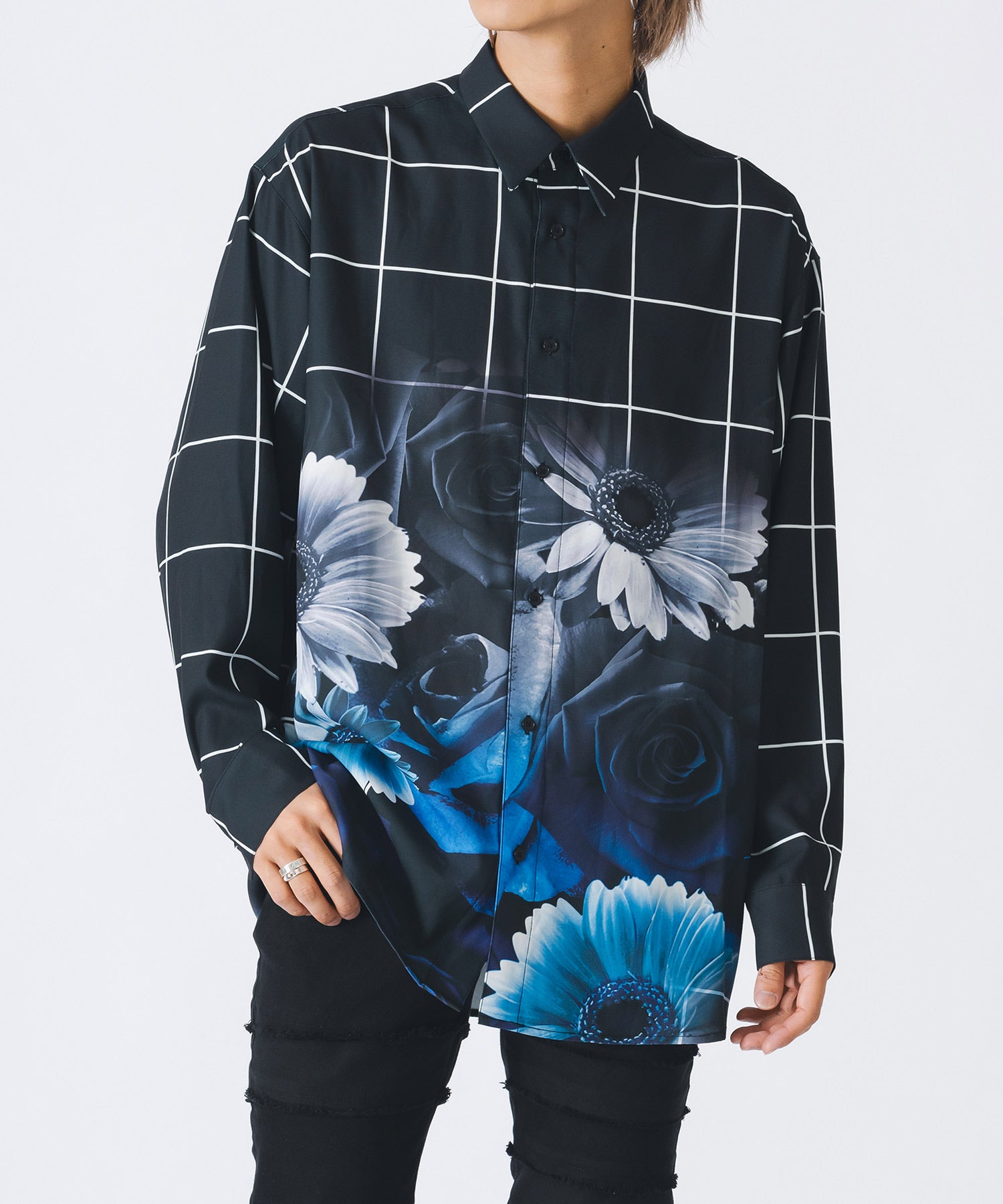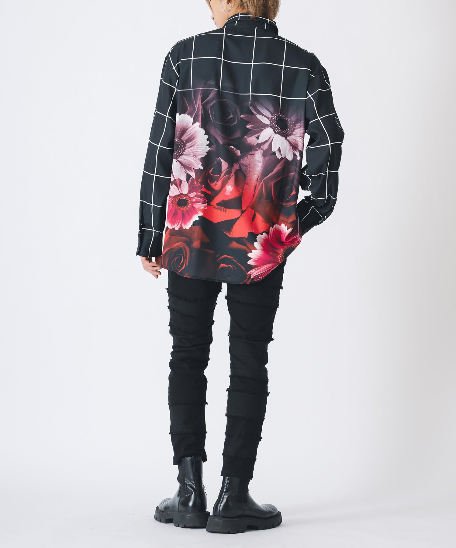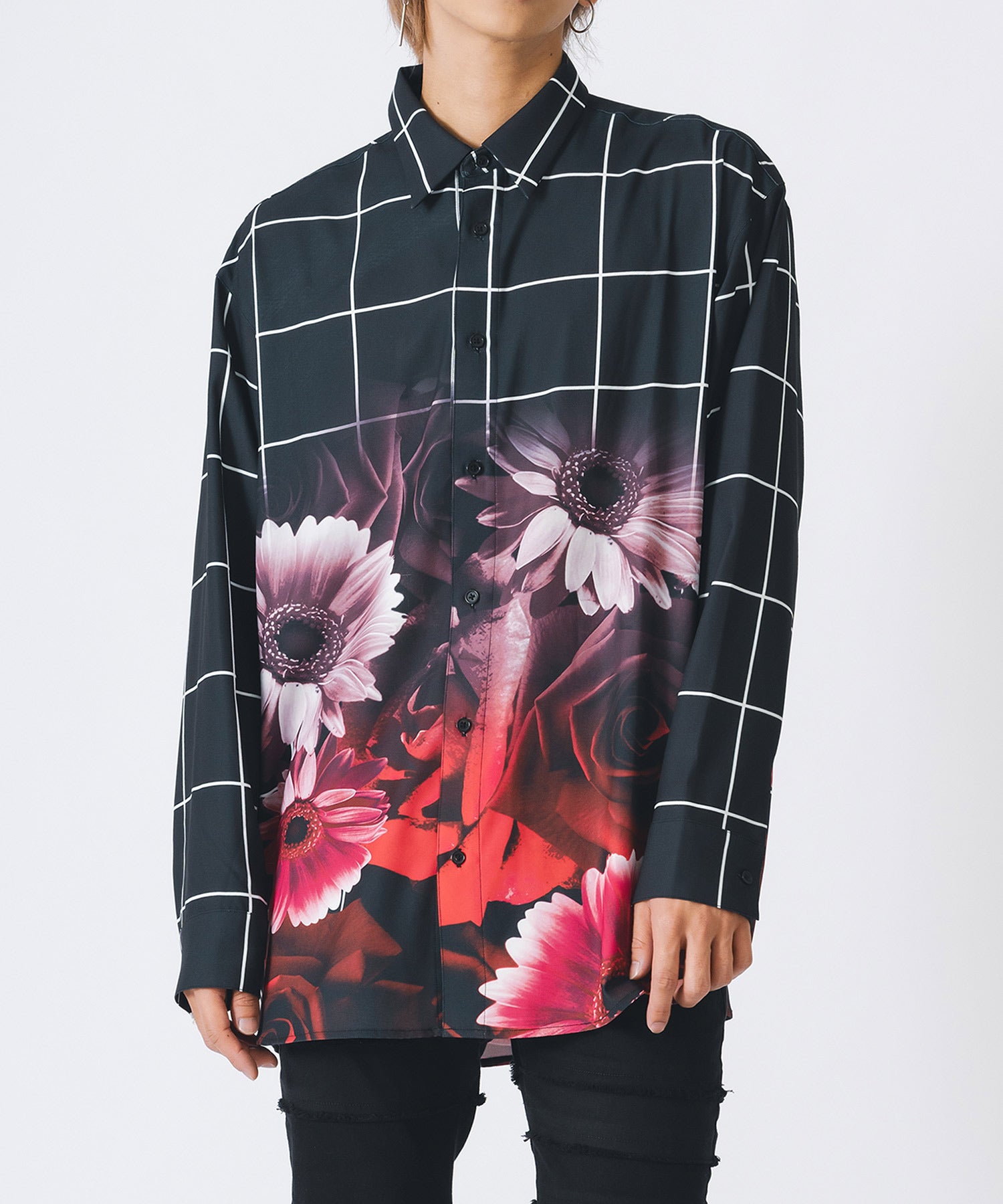 チェック柄にバラのプリントをしたモードなシャツです。