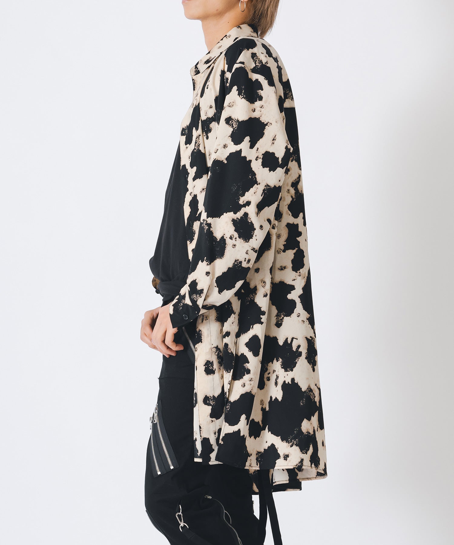 コート感覚で羽織れるムラプリントのロングシャツです。