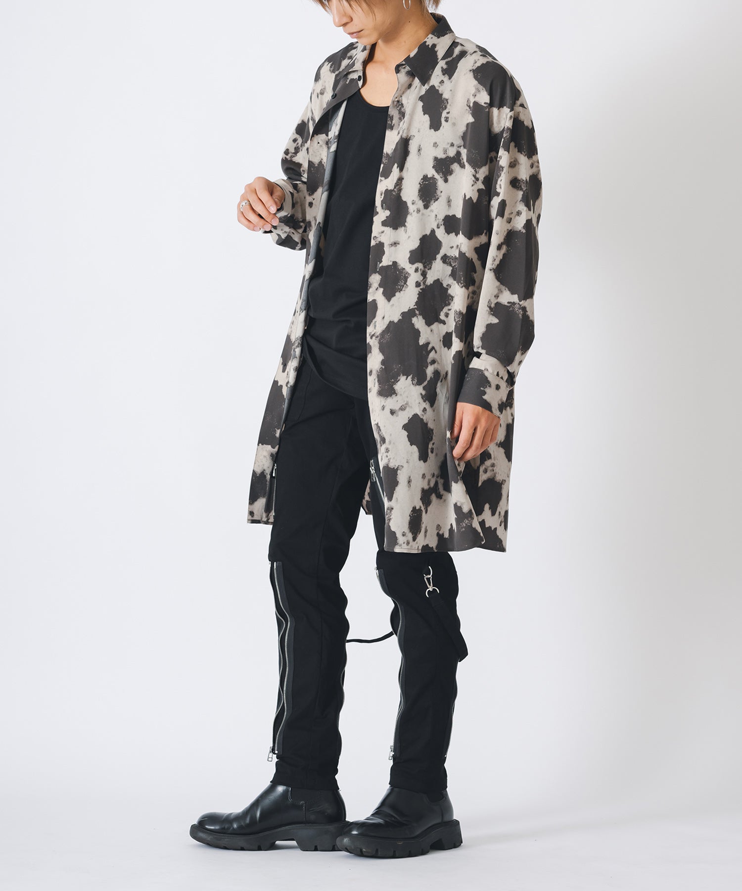 ムラになったプリントがカジュアルさを醸し出すと同時に、長い着丈を間延びさせない効果を高めています。
