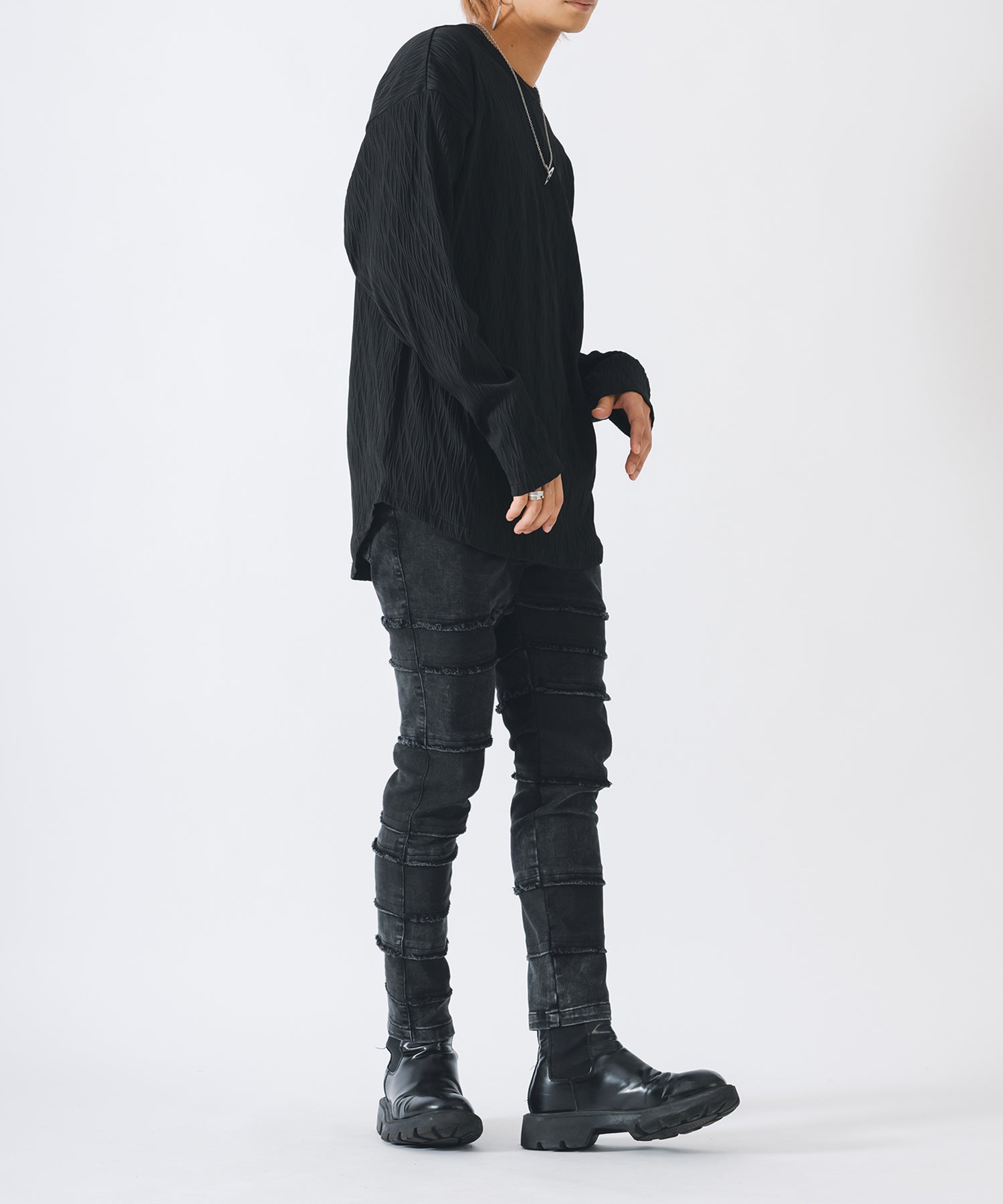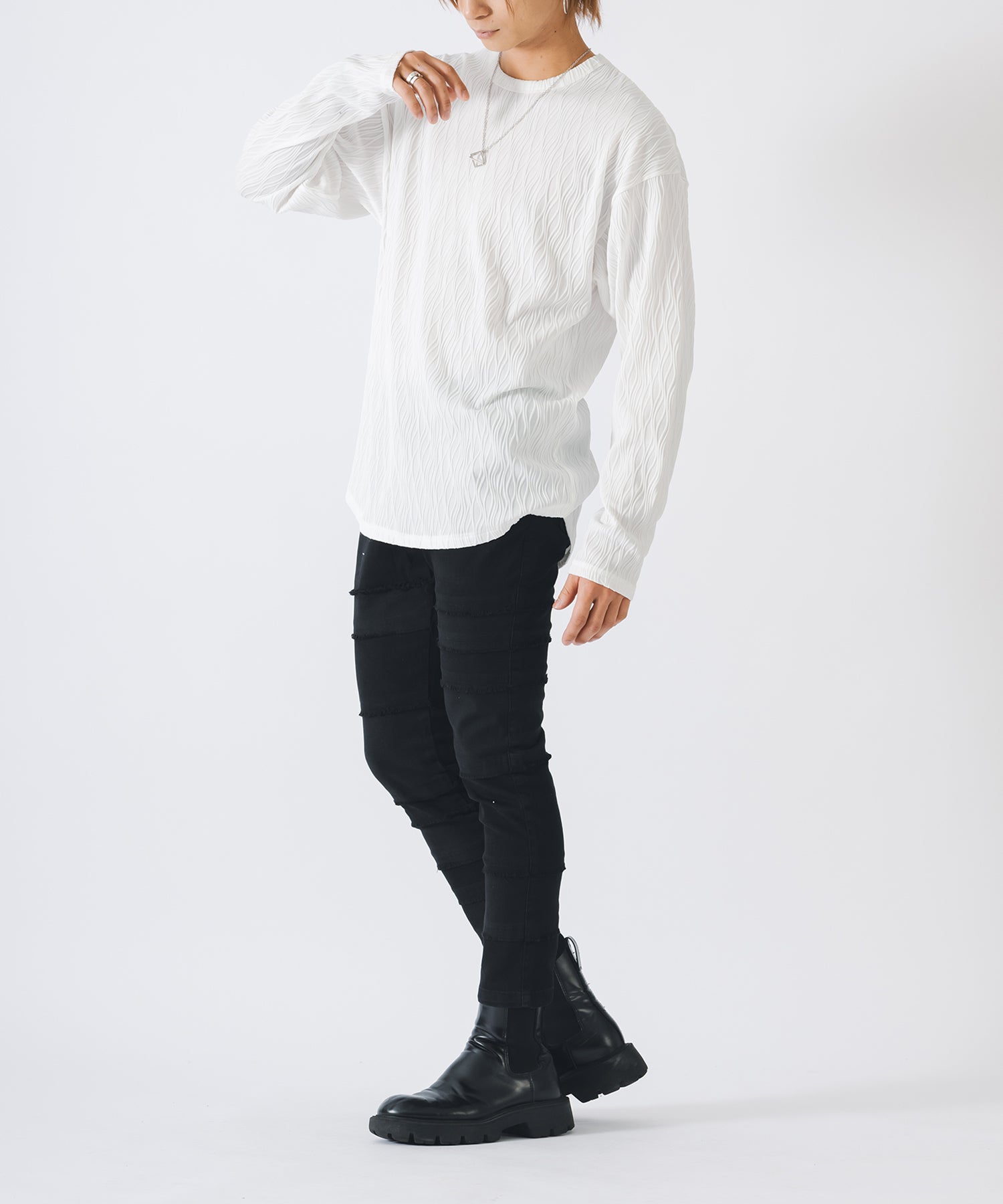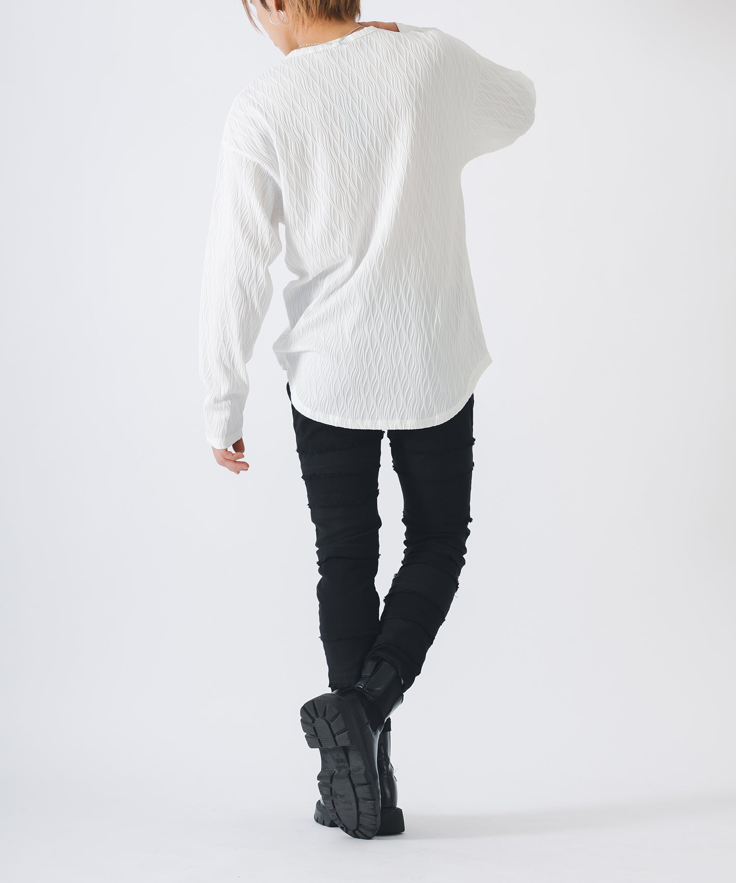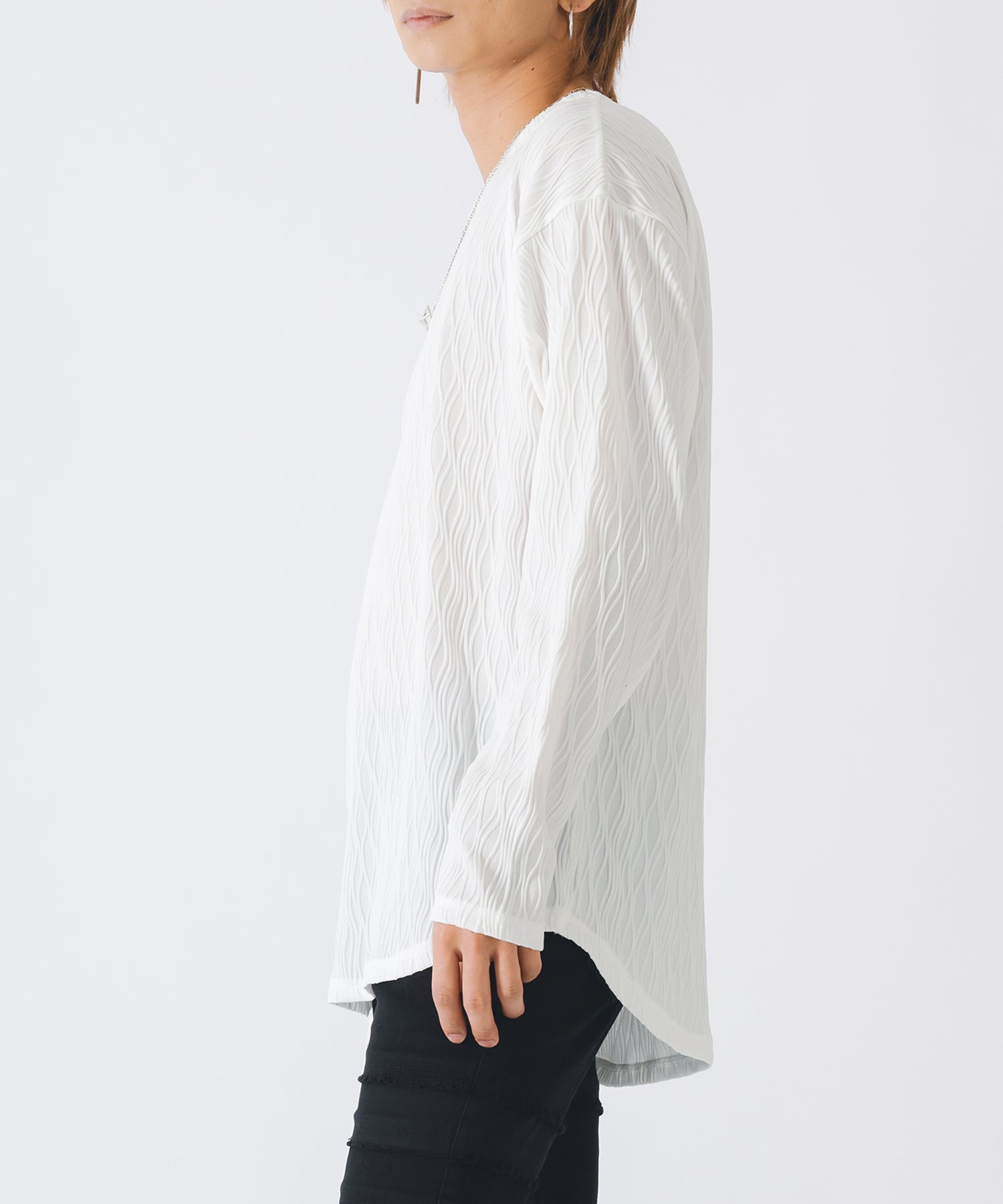 ニットやアウターと重ねた時、さりげなく裾がはみ出てバランスの良いレイヤード感が生まれ着回しやすいですが、一枚で着ても存在感のある表情でシーズン通して活躍できるアイテムです。