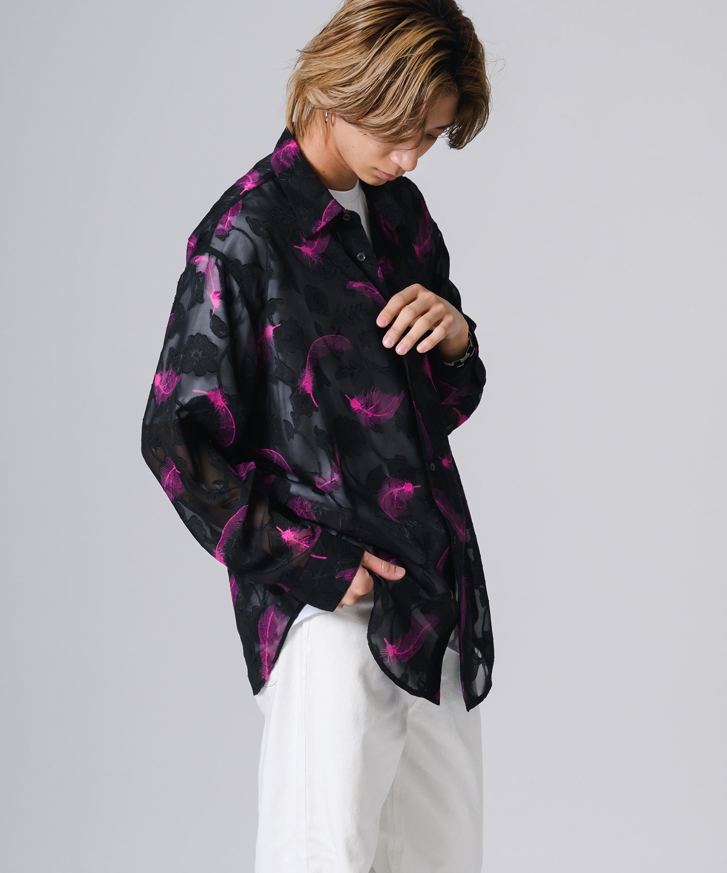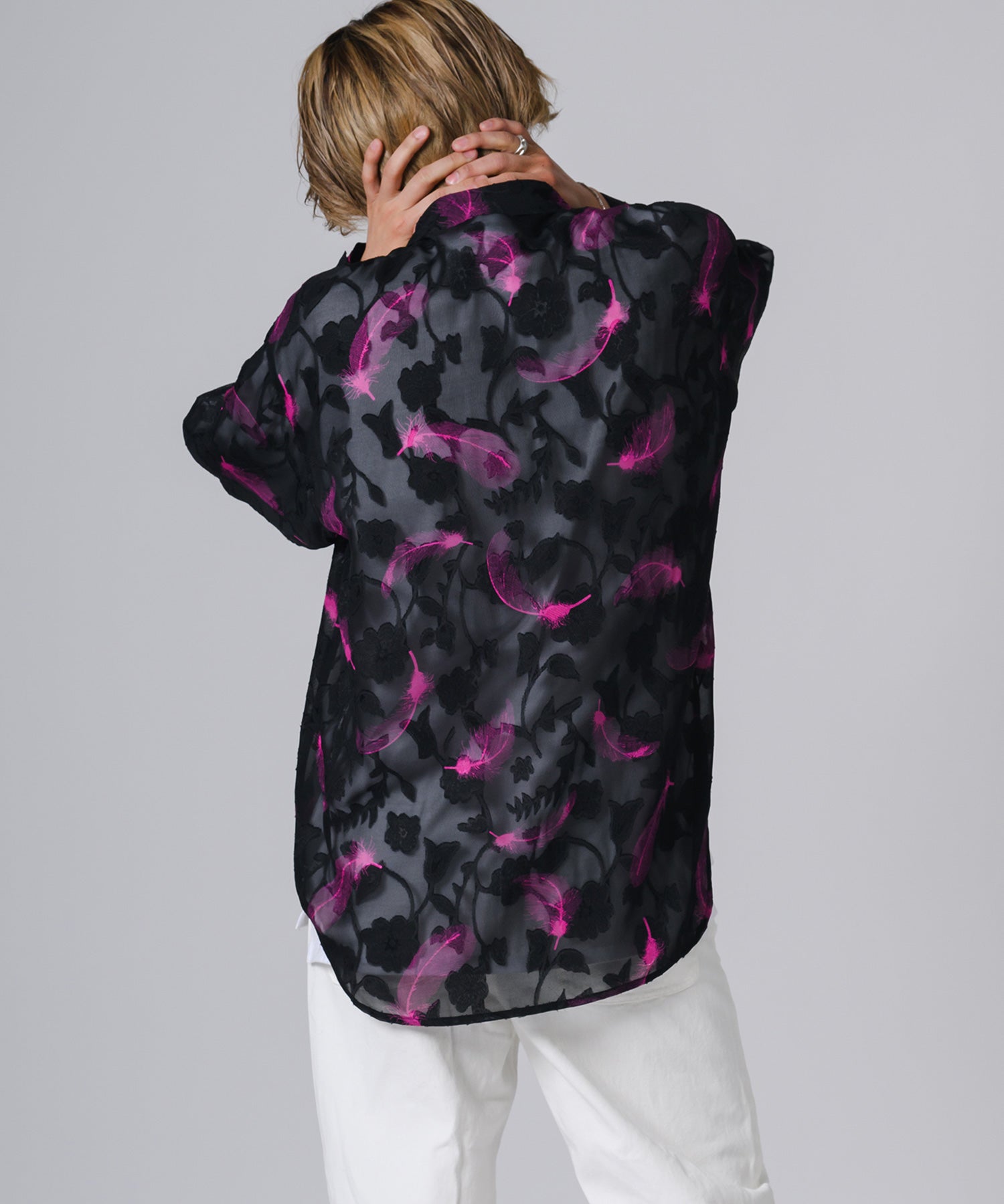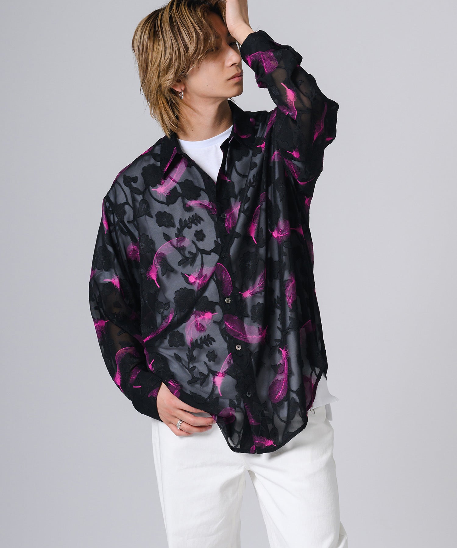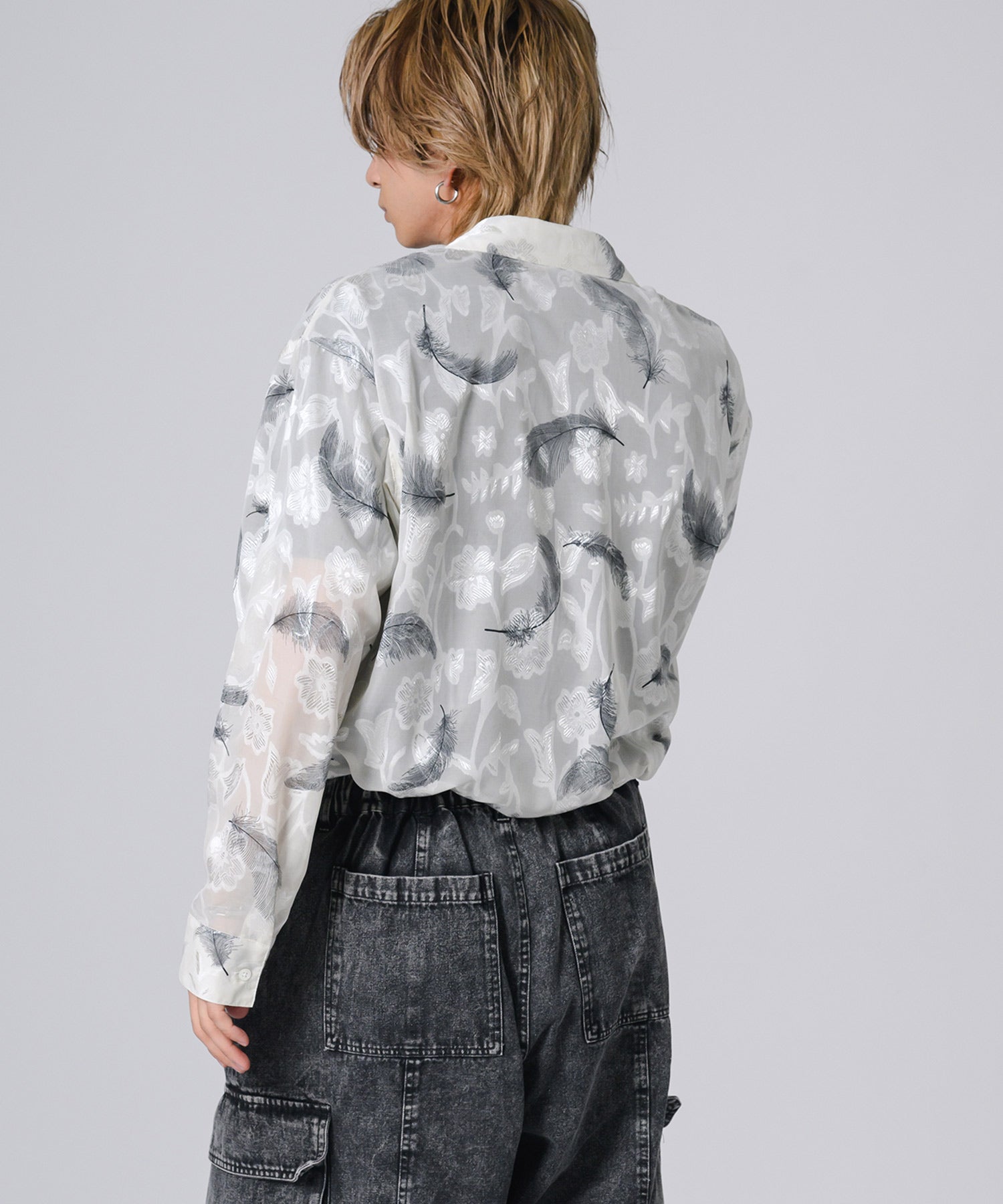 透け感のあるシアー素材の長袖シャツです。