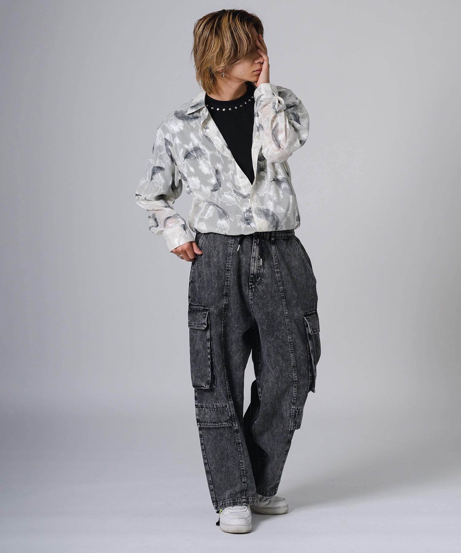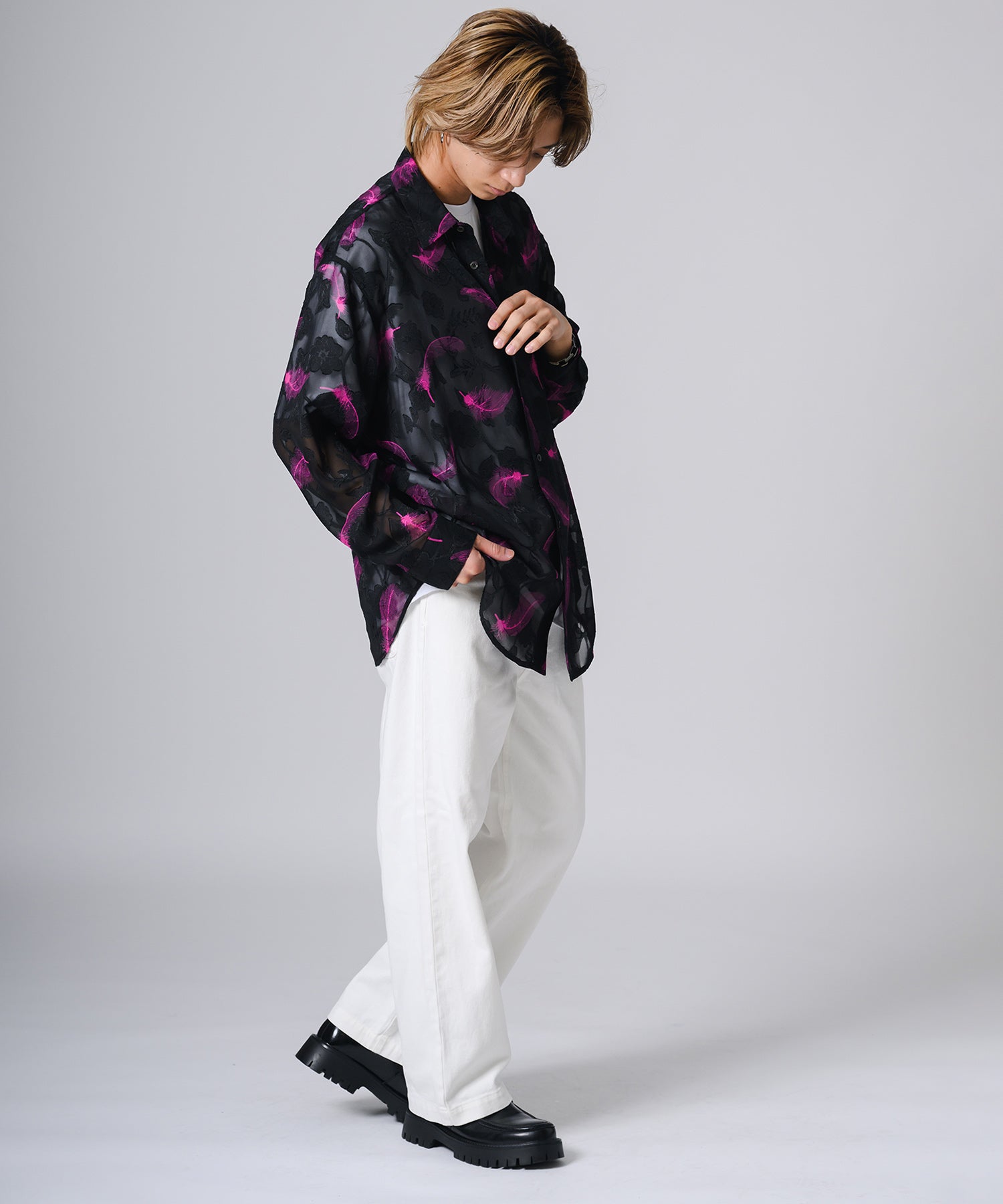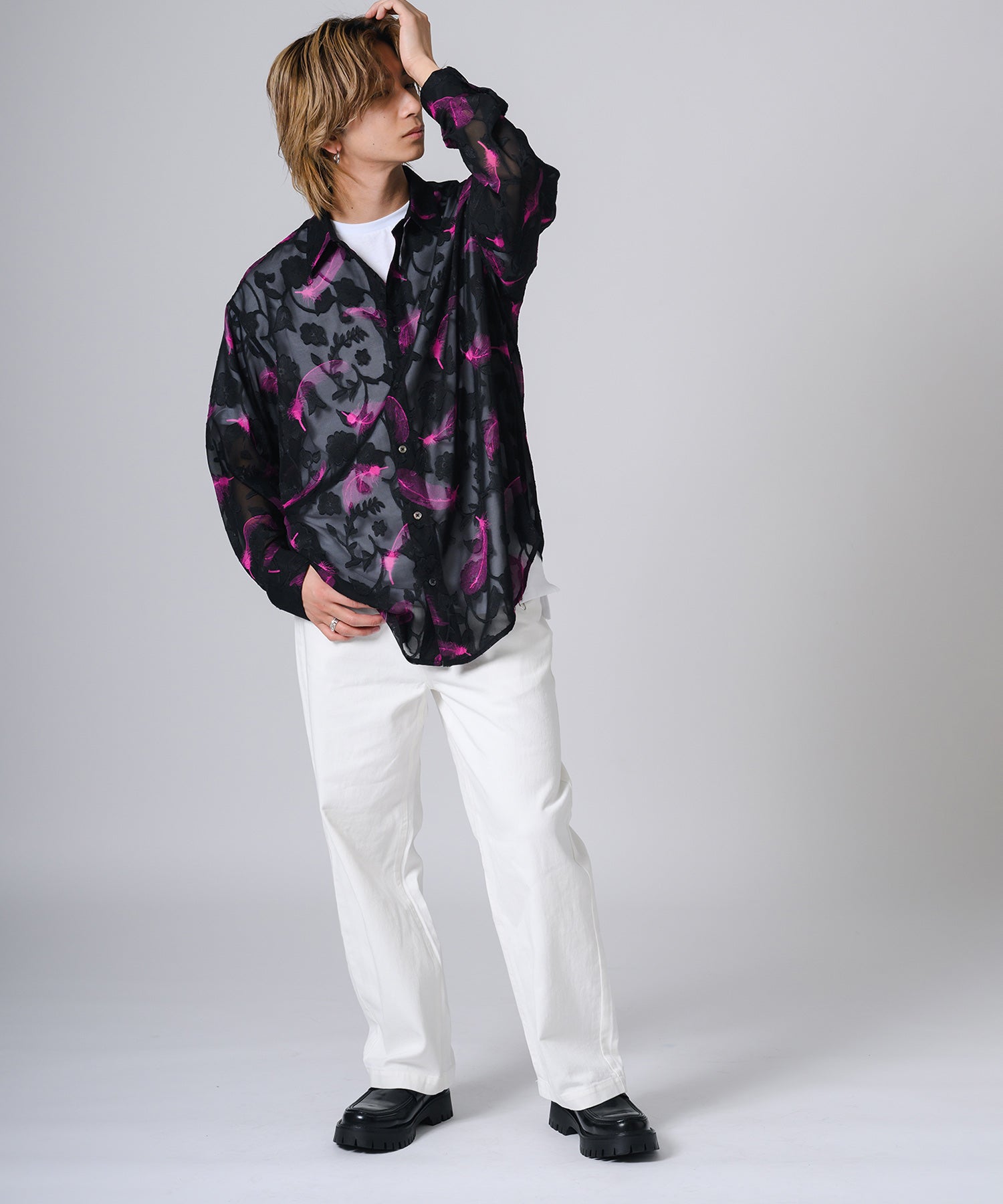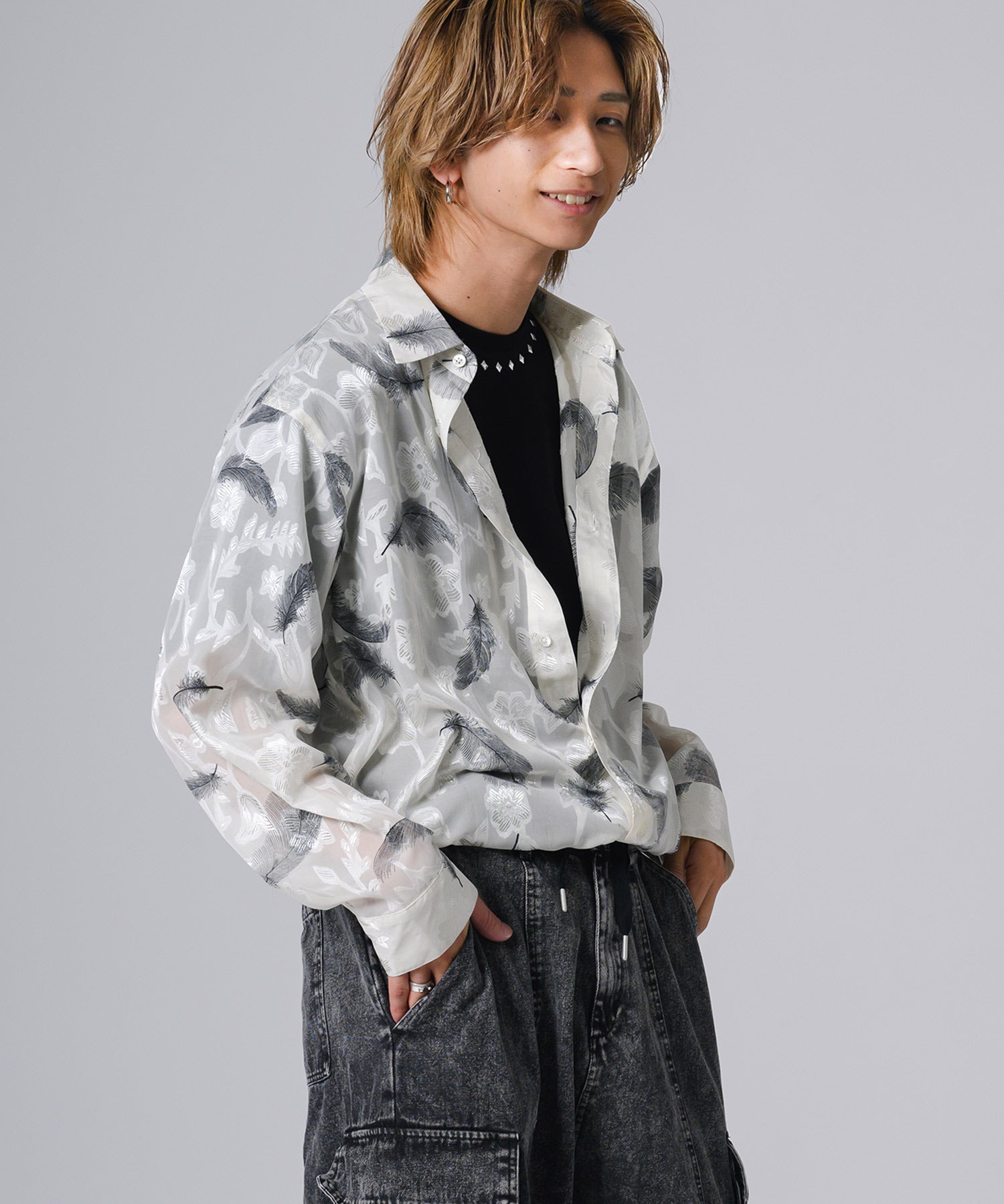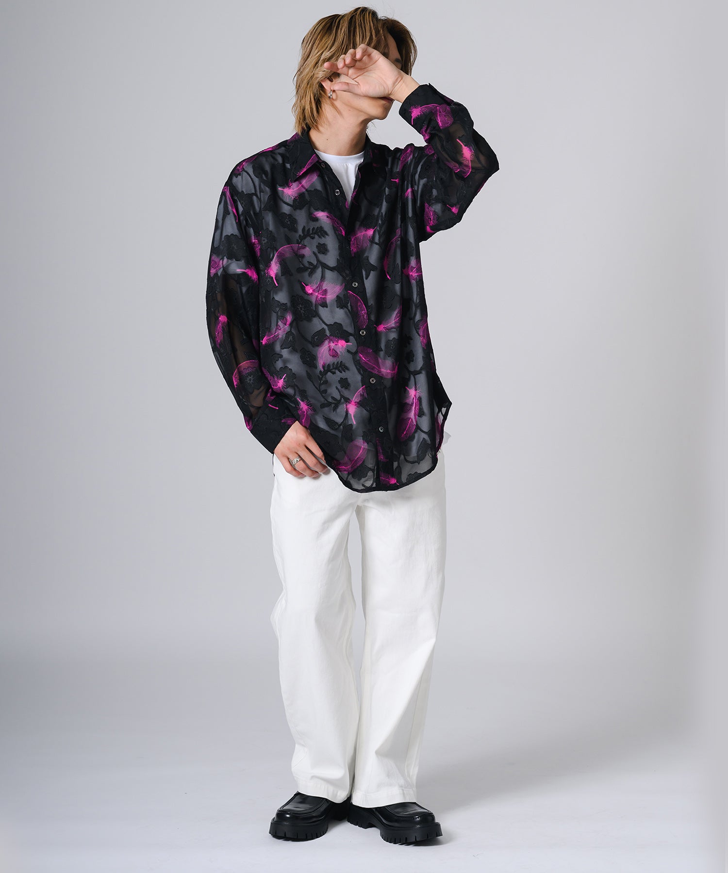 透け感のあるシアー素材の長袖シャツです。