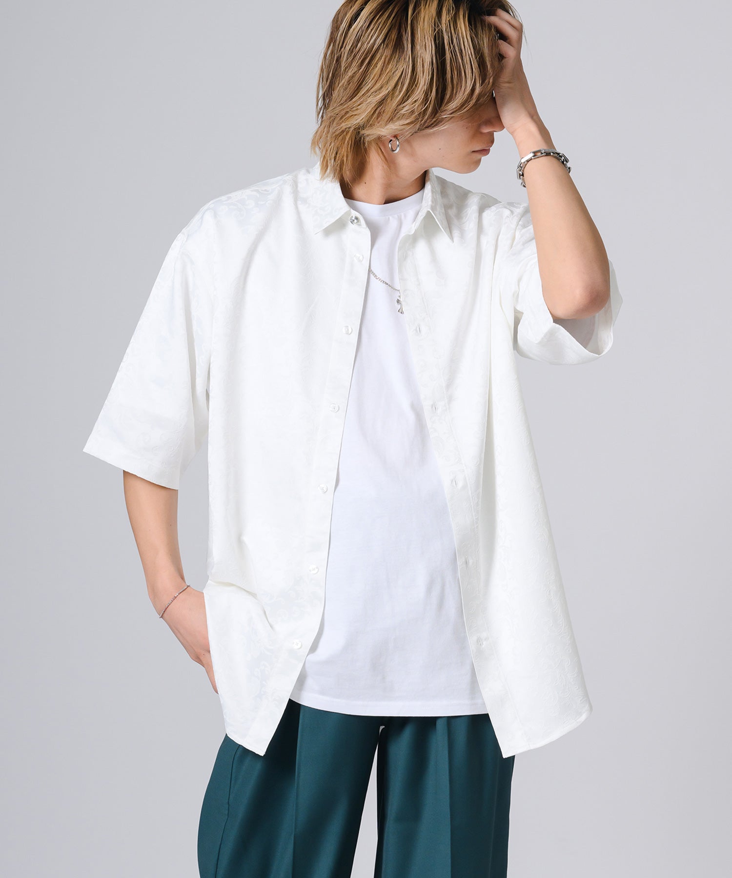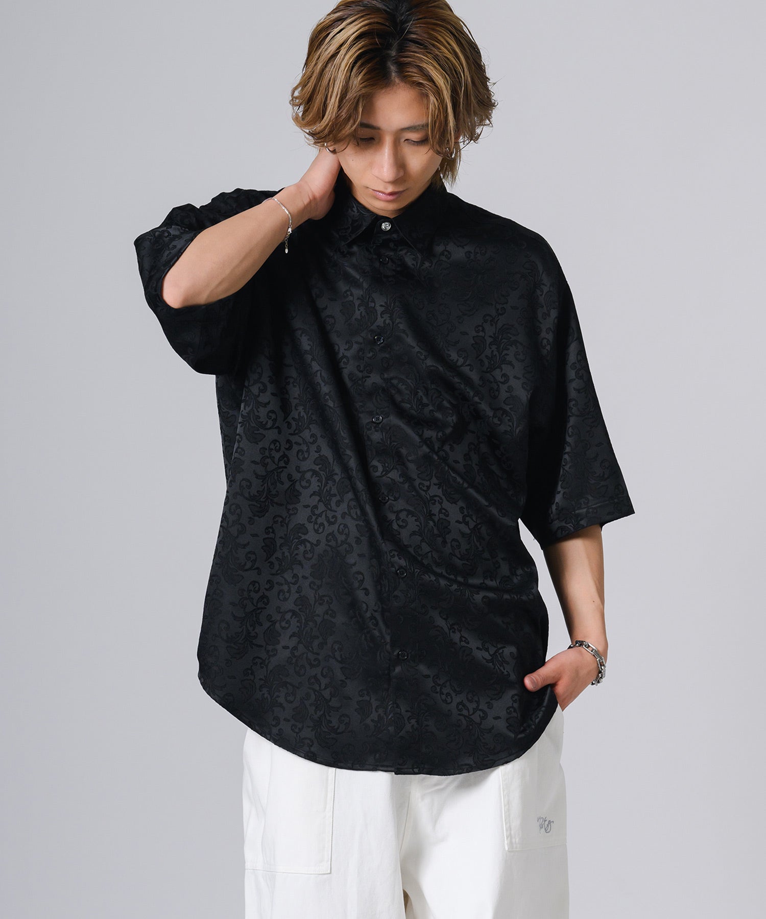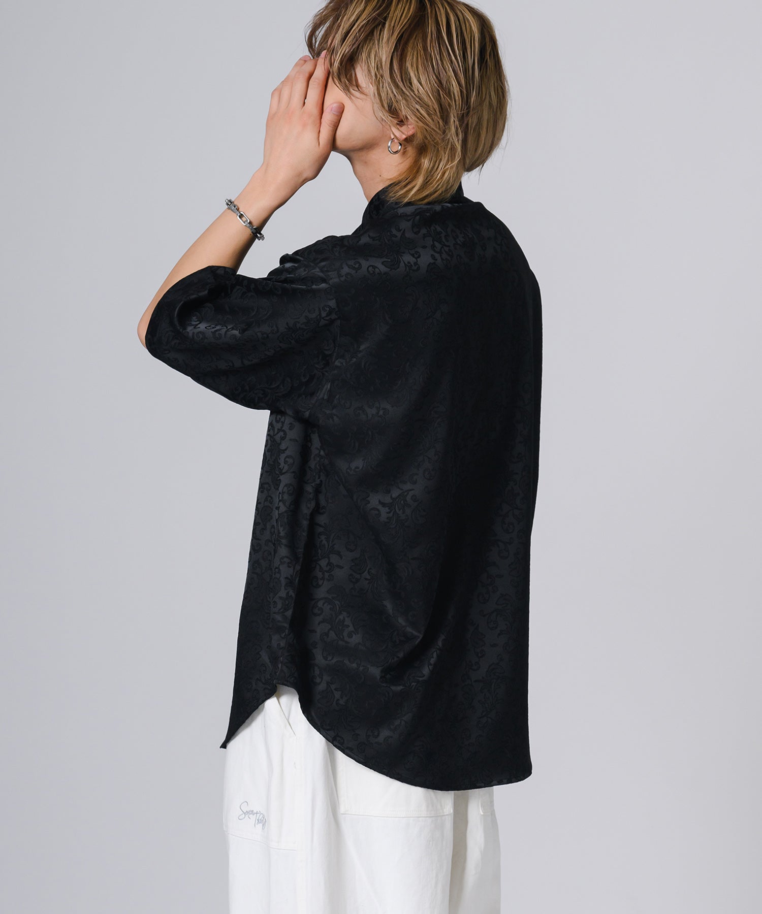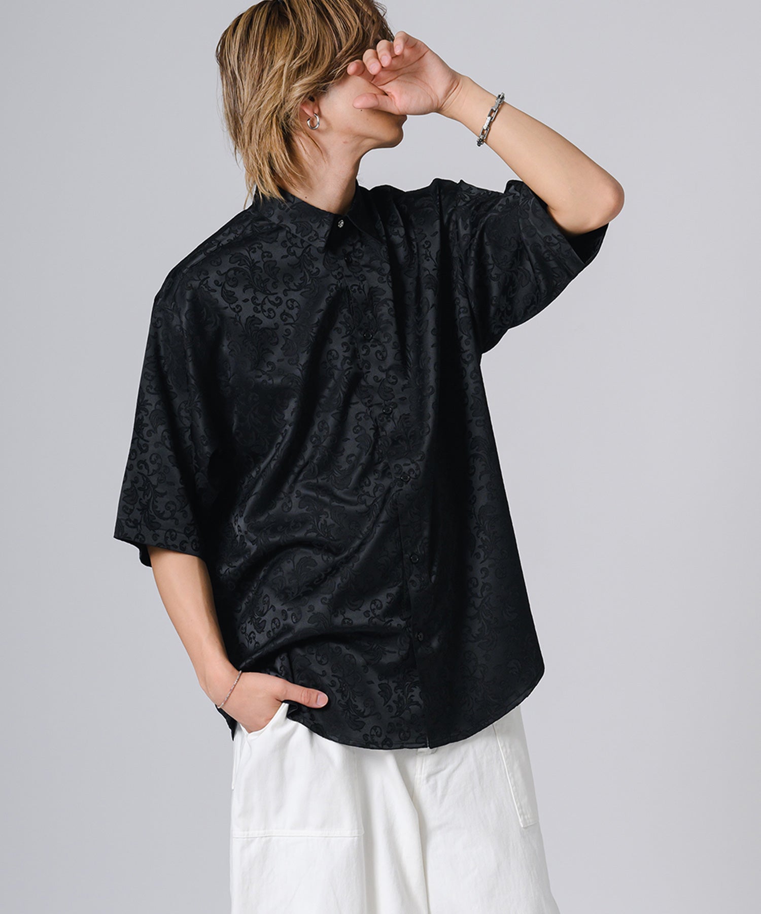 シルキーな光沢感が際立つモノトーンの半袖シャツです。