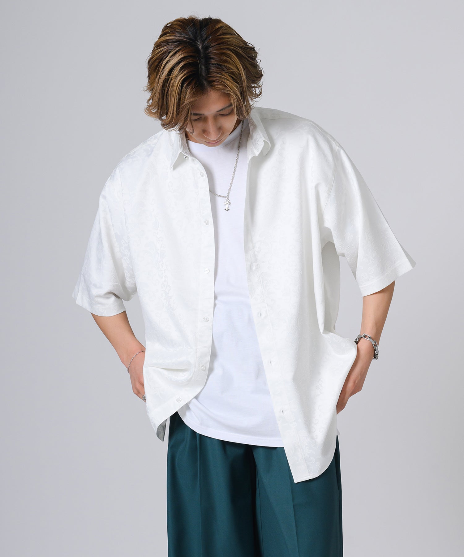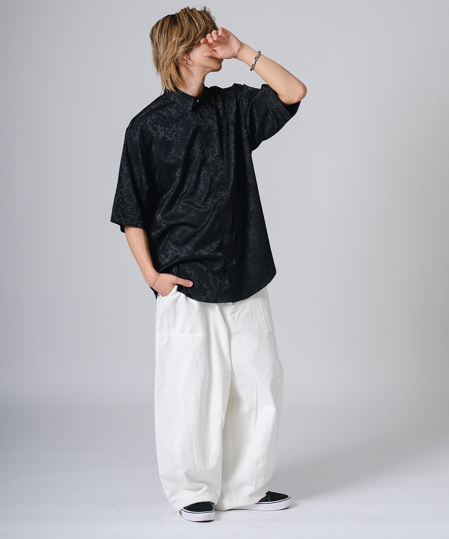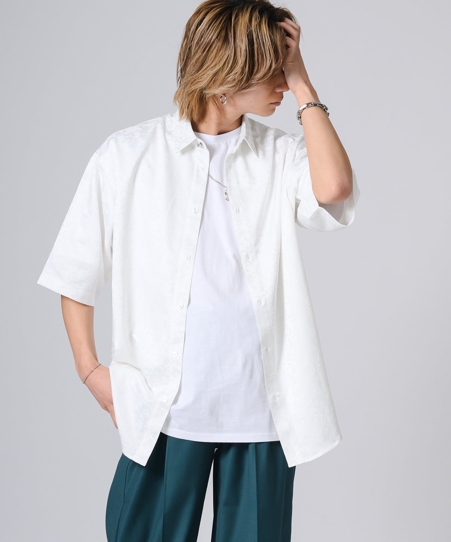 シルキーな光沢感が際立つモノトーンの半袖シャツです。