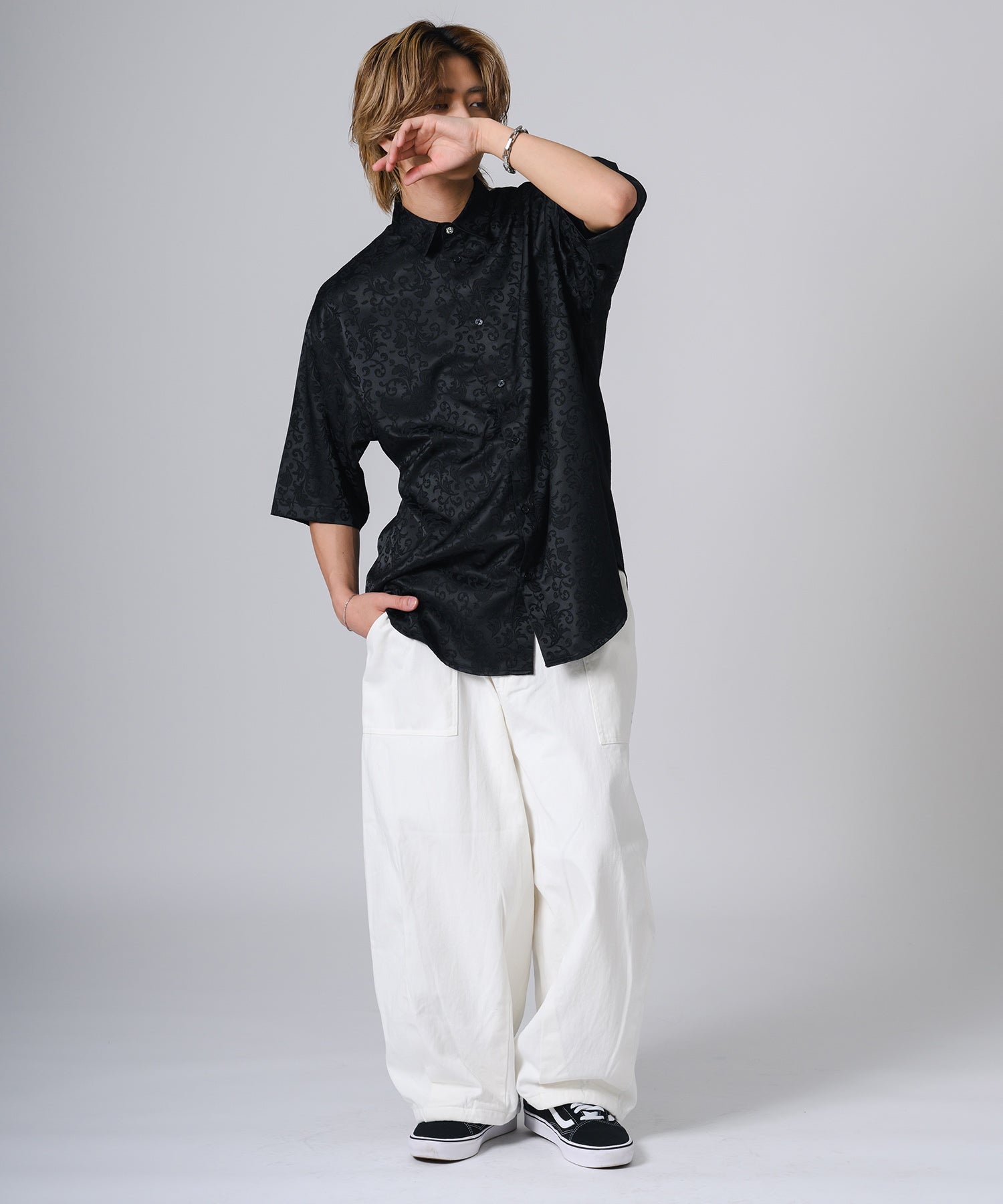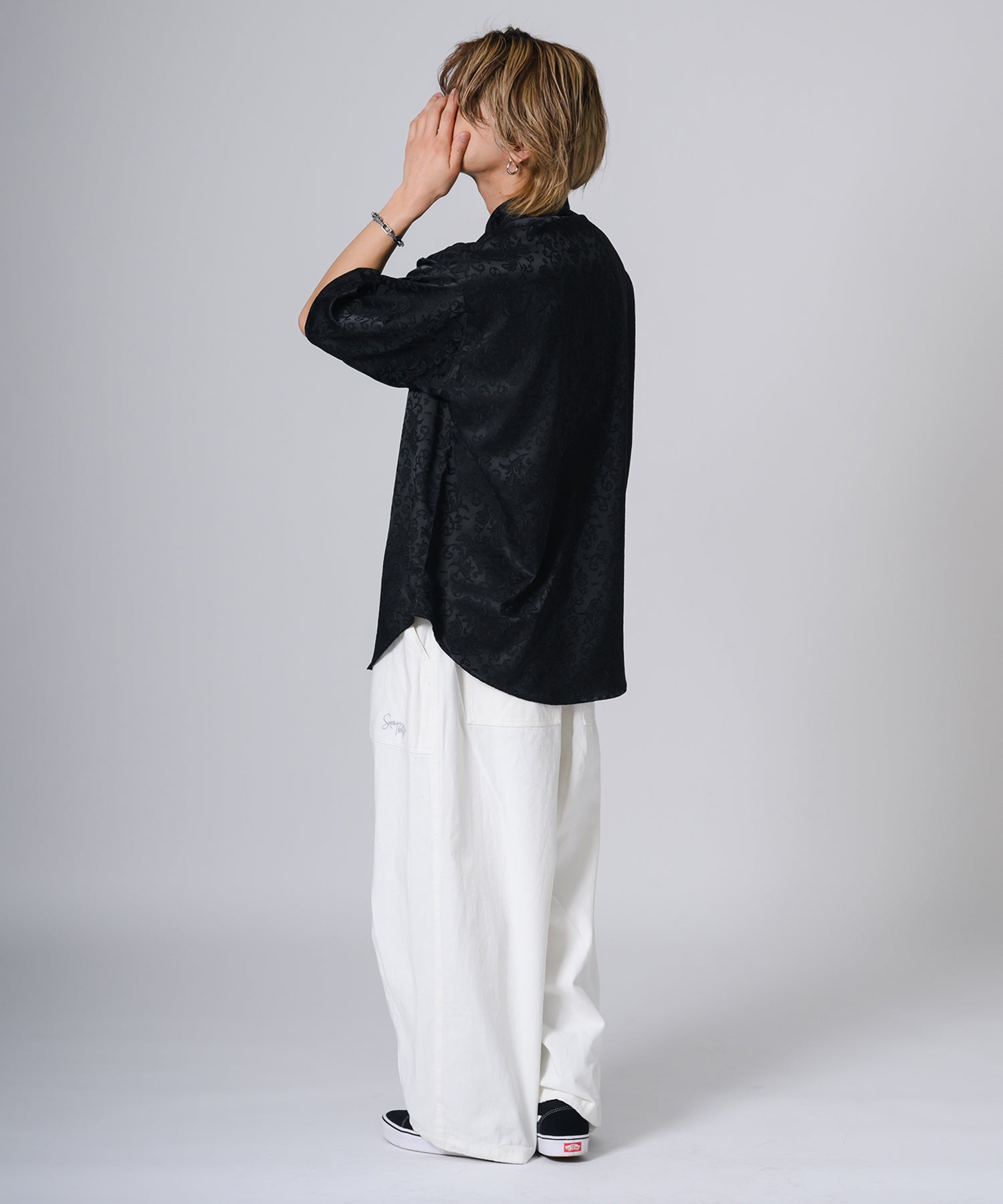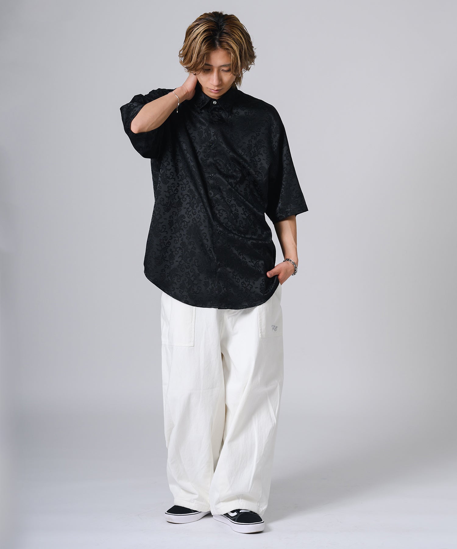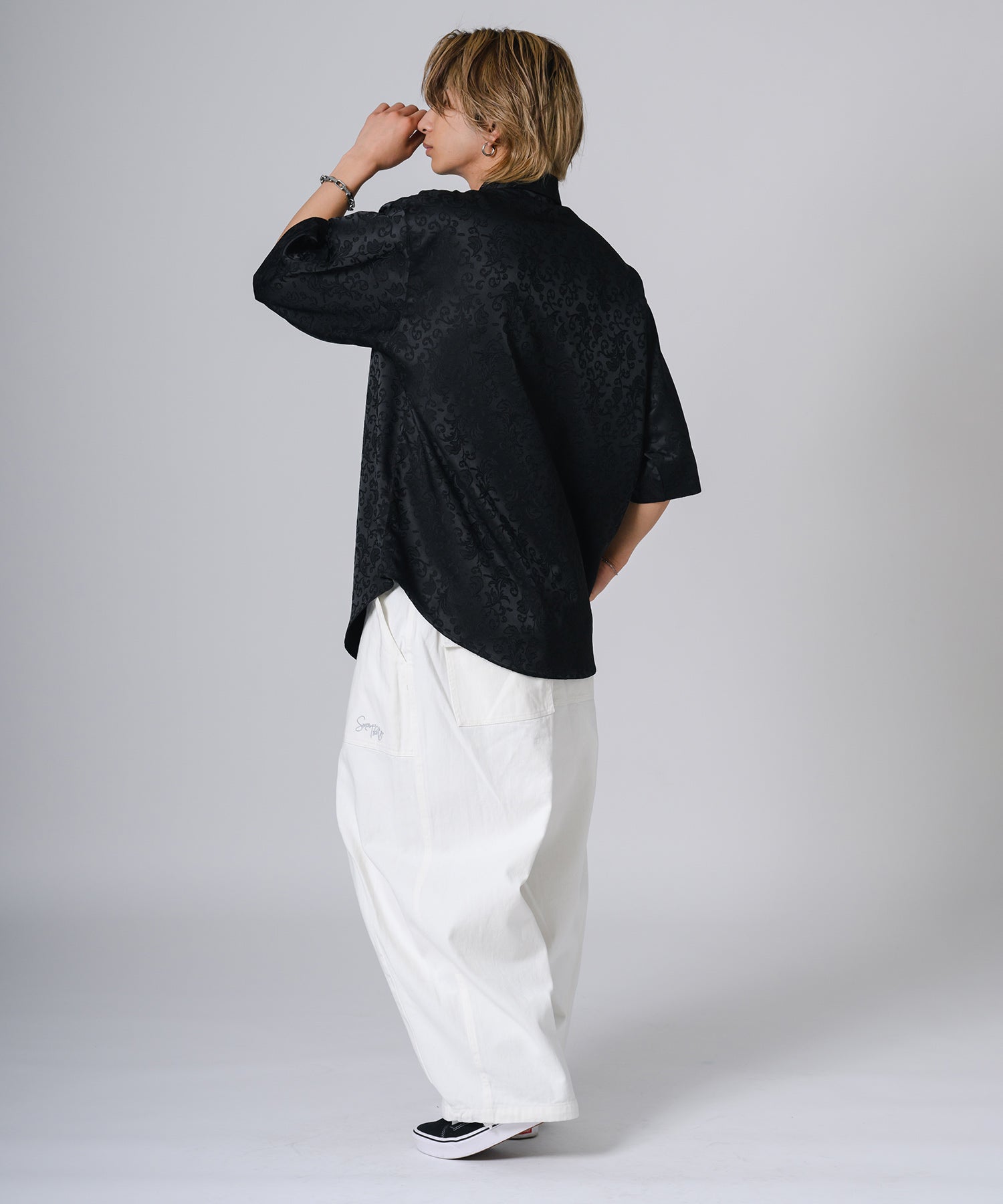 シルキーな光沢感が際立つモノトーンの半袖シャツです。